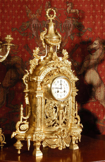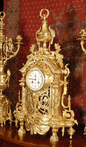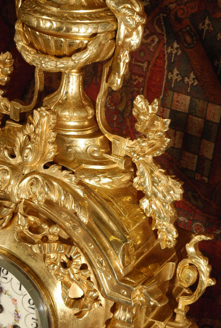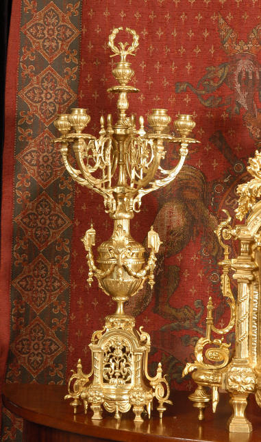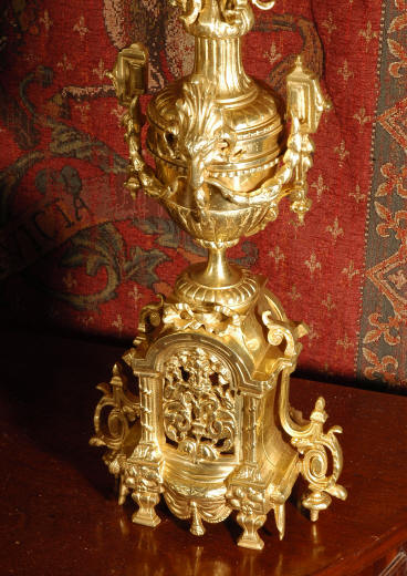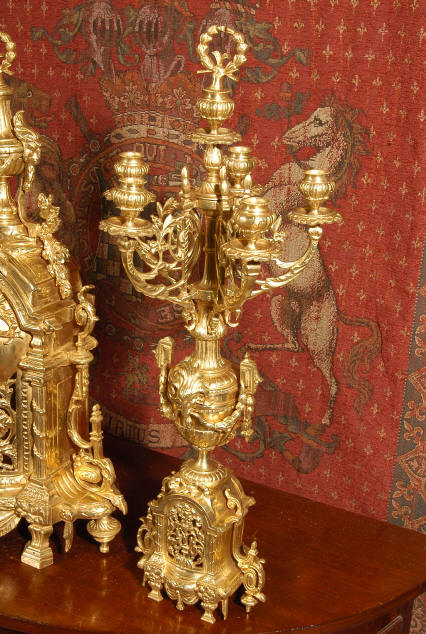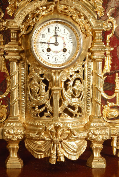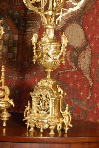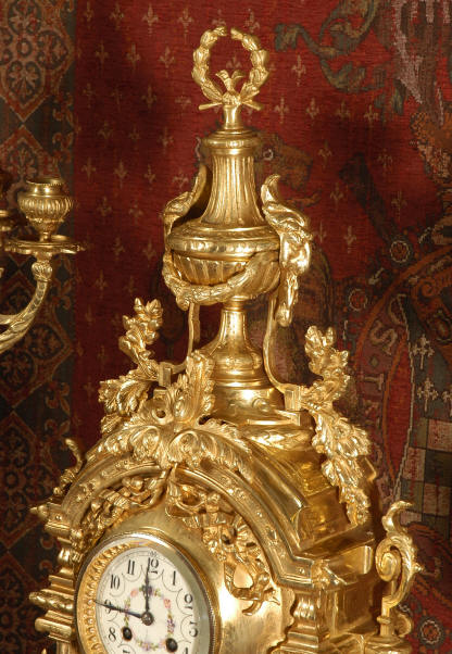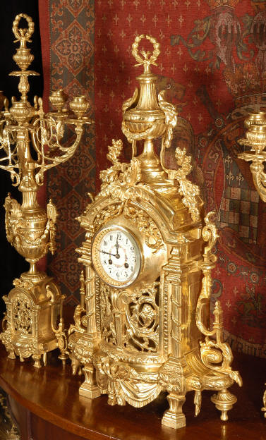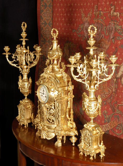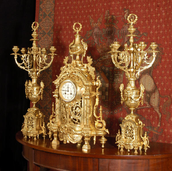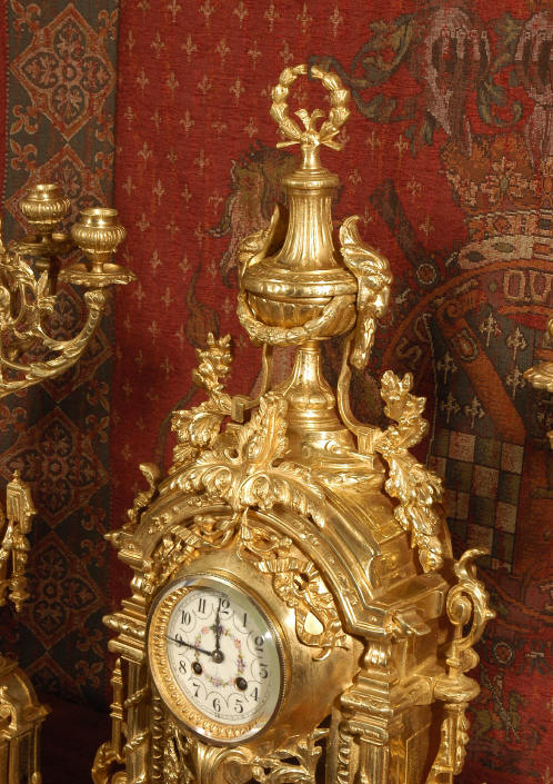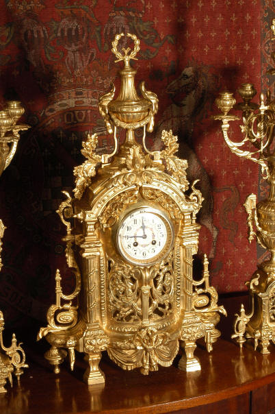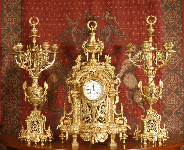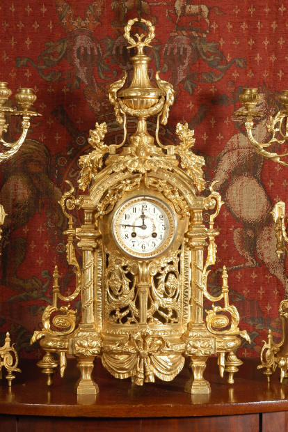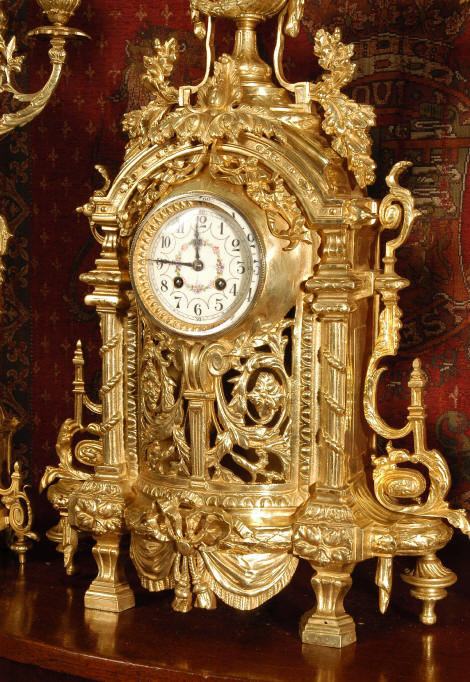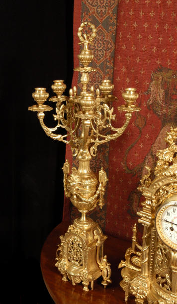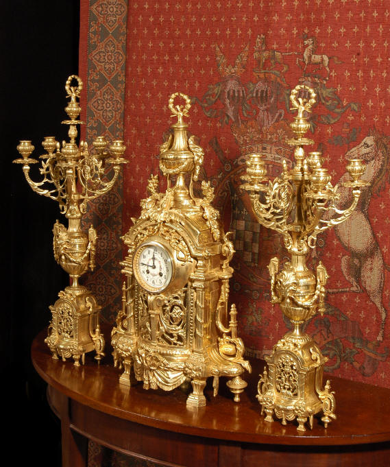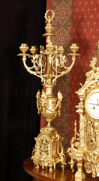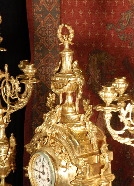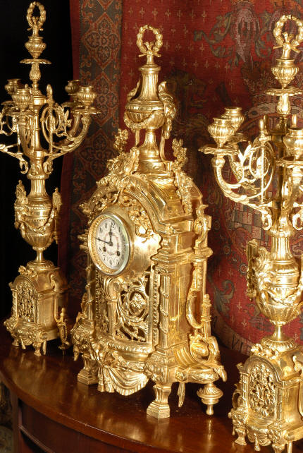 ~ French - Circa 1870 ~ ~~ Excellent condition ~~ A huge (28" in height!) and quite stunning clock and candelabra set. It is classical in style with swirling foliage, floral swags, ribbons and bows. The candelabra each have conforming bases with an urn with 5 branches. It is finely modelled in gilt brass which has the majority of the original gilding remaining. Although large and heavy, the design is lightened by open fret work in both the front of the clock and the candelabra bases. The dial is enamel on copper and is beautifully decorated with floral swags. The French movement is of the highest quality and is by the well known maker Vincenti et Cie, it has the makers mark on the back plate. Our clockmaker has cleaned and serviced the movement - it is in excellent clean and running condition. The pendulum is an old replacement. It runs for 8 days and strikes the hours and halves on a bell. Click the movie below to hear the bell and watch the clock running! Condition of the case is excellent with a beautiful, clean and bright finish, the majority of the original gilding is present with some wear, tarnish and discouloration. The dial is also in excellent condition with no chips and scratches. The clock will be supplied complete with pendulum, bell and a suitable key. Full setting up instructions supplied if required. A truly magnificent clock set! Dimensions of clock: Height 28", Width
