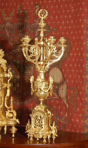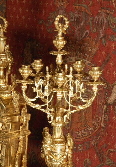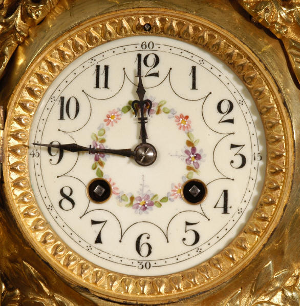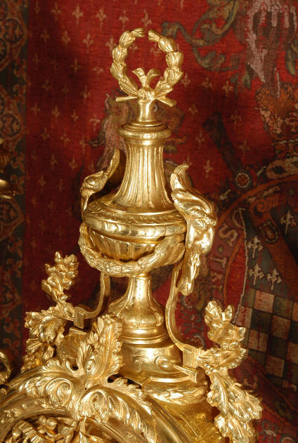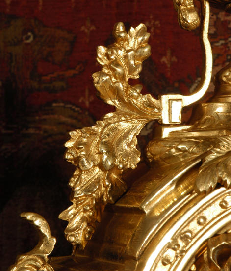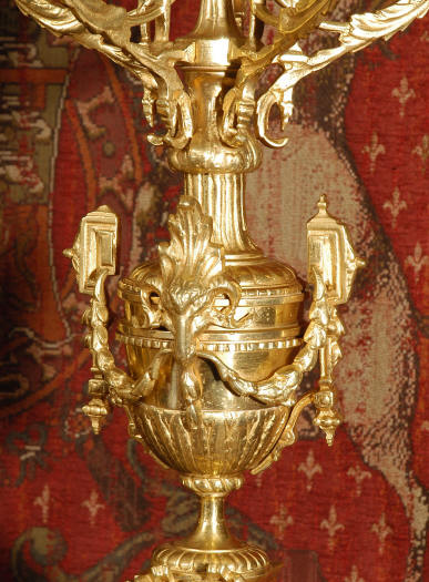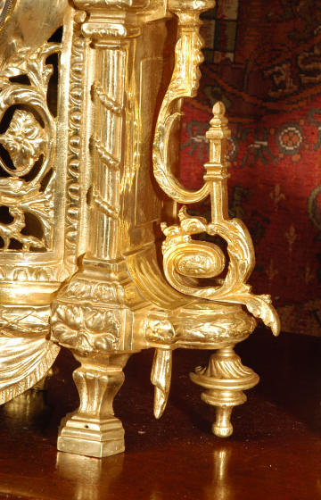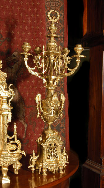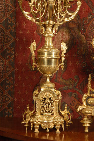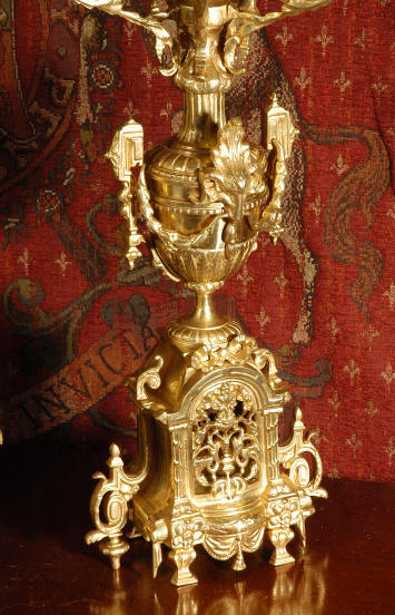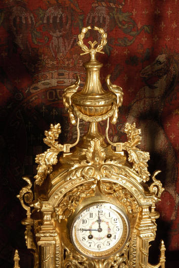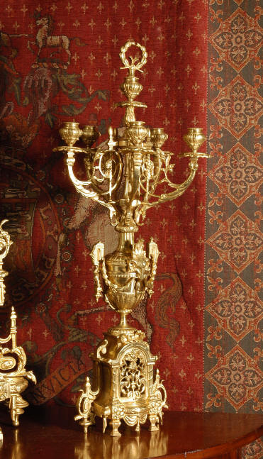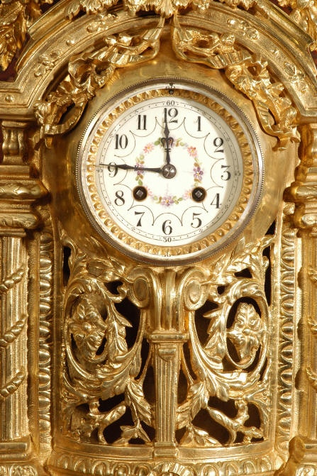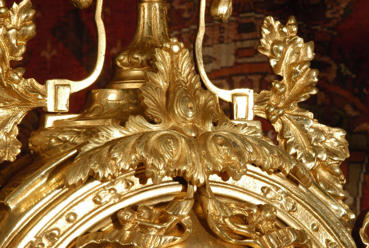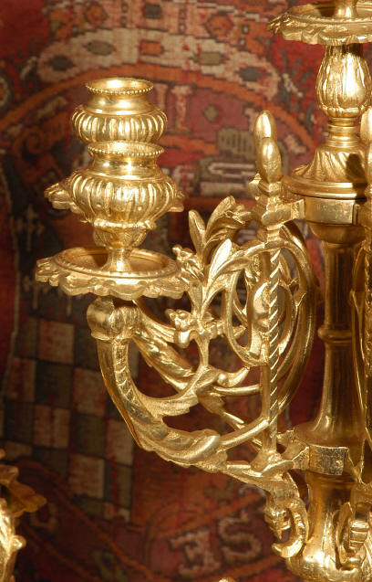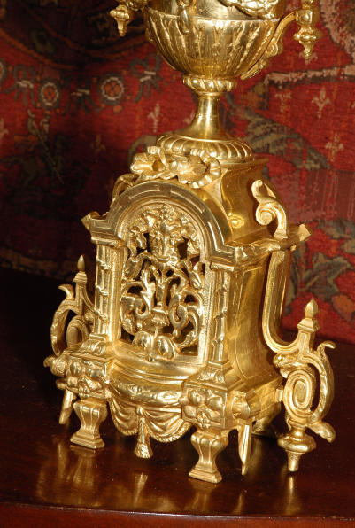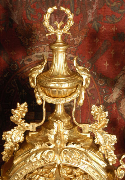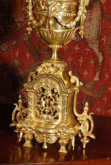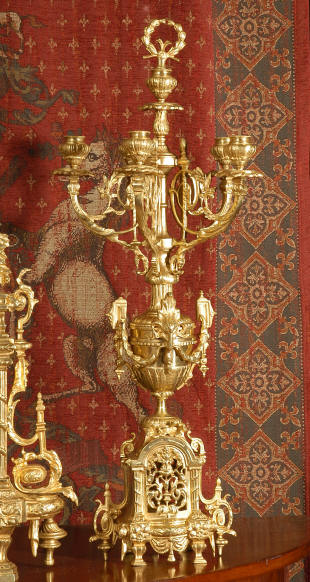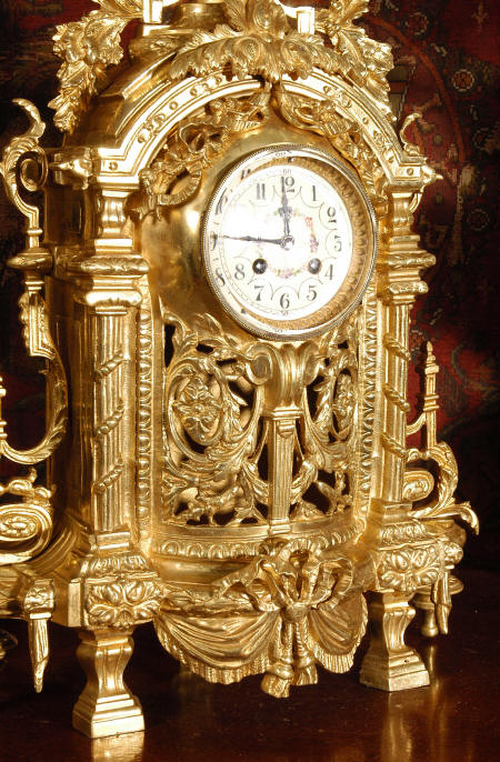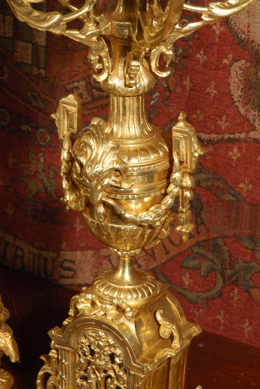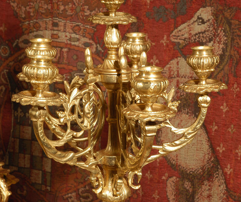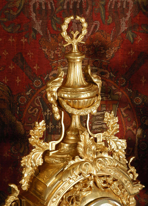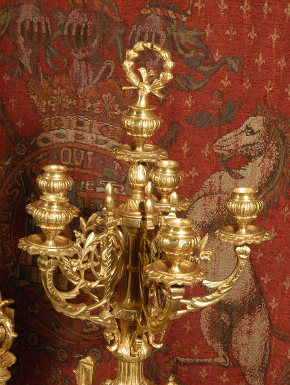 ~ French - Circa 1870 ~ ~~ Excellent condition ~~ A huge (28" in height!) and quite stunning clock and candelabra set. It is classical in style with swirling foliage, floral swags, ribbons and bows. The candelabra each have conforming bases with an urn with 5 branches. It is finely modelled in gilt brass which has the majority of the original gilding remaining. Although large and heavy, the design is lightened by open fret work in both the front of the clock and the candelabra bases. The dial is enamel on copper and is beautifully decorated with floral swags. The French movement is of the highest quality and is by the well known maker Vincenti et Cie, it has the makers mark on the back plate. Our clockmaker has cleaned and serviced the movement - it is in excellent clean and running condition. The pendulum is an old replacement. It runs for 8 days and strikes the hours and halves on a bell. Click the movie below to hear the bell and watch the clock running! Condition of the case is excellent with a beautiful, clean and bright finish, the majority of the original gilding is present with some wear, tarnish and discouloration. The dial is also in excellent condition with no chips and scratches. The clock will be supplied complete with pendulum, bell and a suitable key. Full setting up instructions supplied if required. A truly magnificent clock set! Dimensions of clock: Height 28", Width