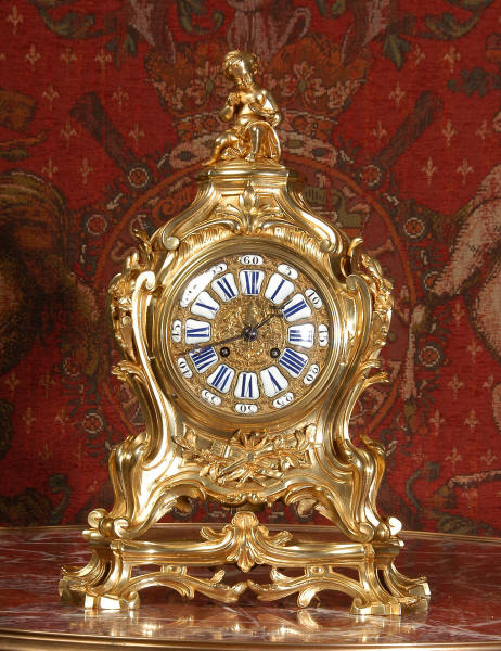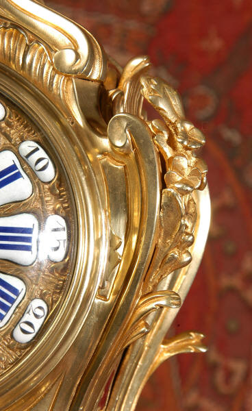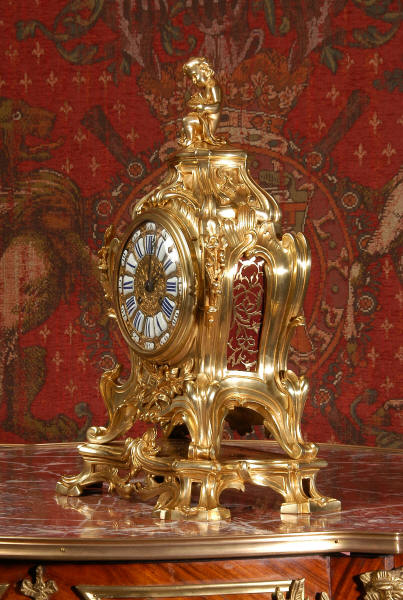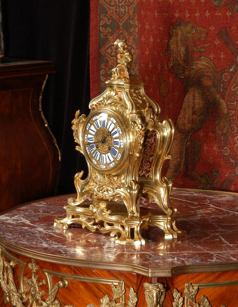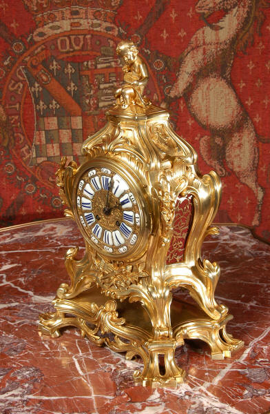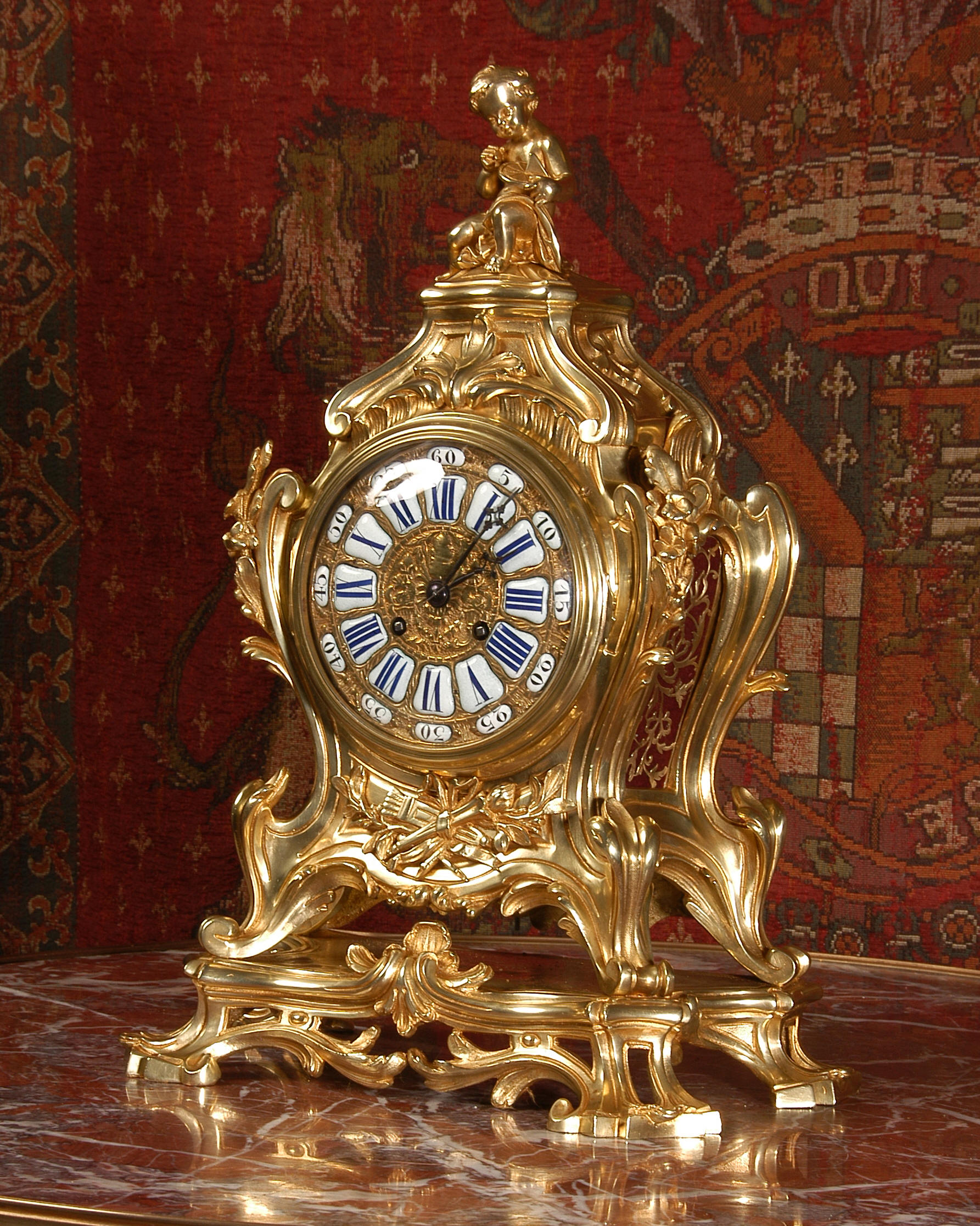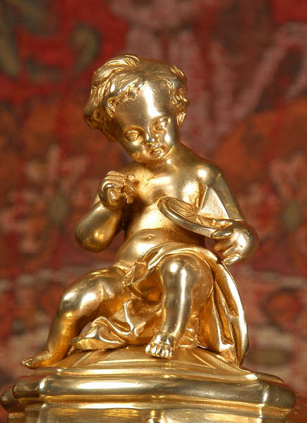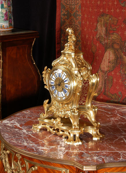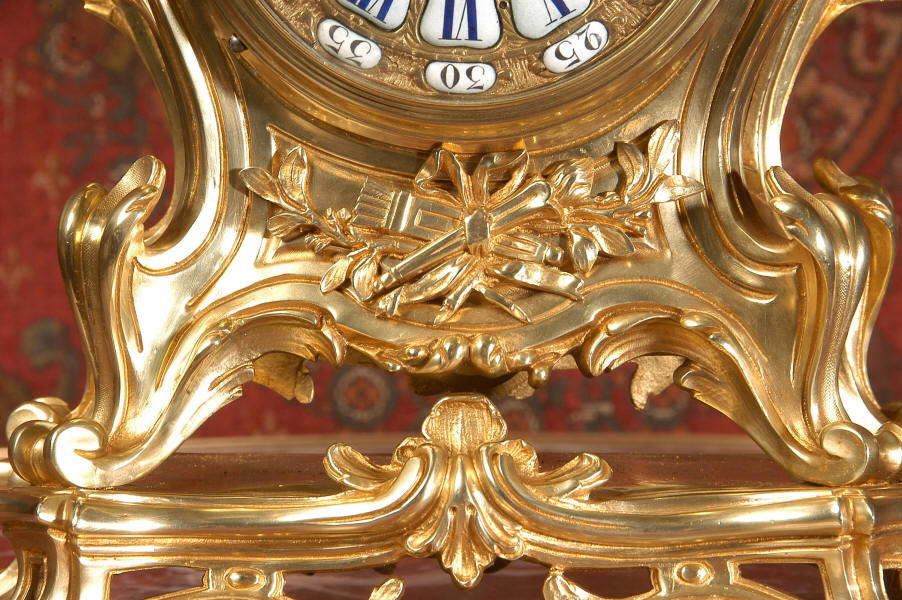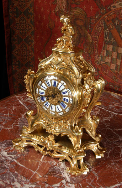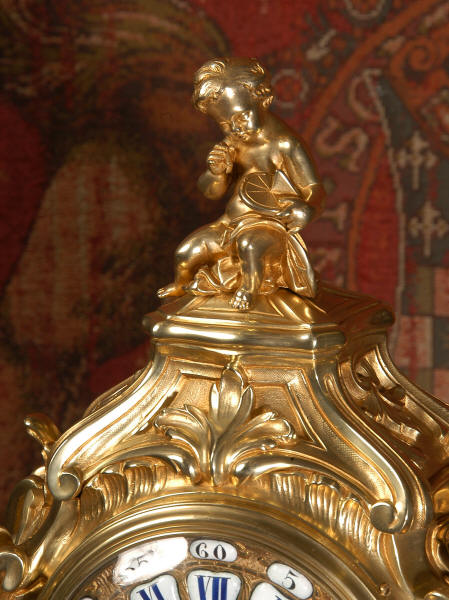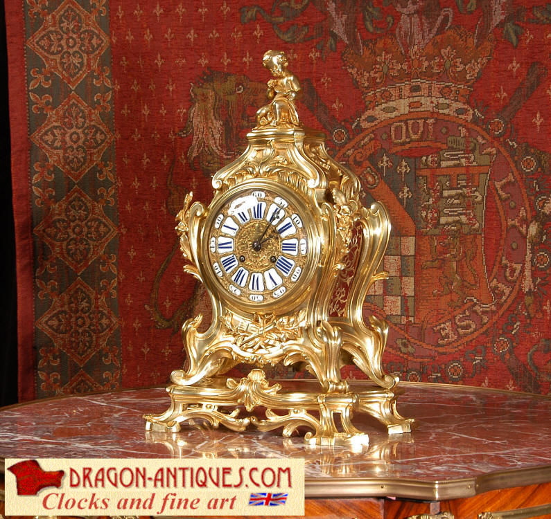 ~ French - Circa 1880 ~ ~~ Excellent condition, fully overhauled & working ~~ A large and stunning original antique French brass table clock in lovely condition. The style is Rococo, waisted keyhole shape with acanthus leaf shoulders, 'C' scroll bracket feet and surmounted by a cherub holding a sundial. It stands on its original integral base. The dial is heavy cast brass with a acanthus bezel fitted with convex glass. 24 individual enamel cartouches are mounted for the hours and the minutes. Fretted and blued steel hands are original. Below the dial is a torché and quiver of arrows. To the sides are delicate and elaborate leafy fretted panels backed with red velvet. The rear door also features a stunning fretted panel, backed with red velvet. The design is beautifully bold and heavily moulded in brass, well chased and finished. It is modelled in the round and so would display very well on a table. The French movement is of very high quality and is in excellent clean and running condition having been fully overhauled by our clockmaker. it has the retailer / clockmakers mark 'A C ' inscribed on the backplate. Pendulum is a replacement. It runs for 8 days on one wind and strikes the hours and halves on a large, sonorous bell. Click the video clip below to hear the bell and watch the clock running! Condition of the case is