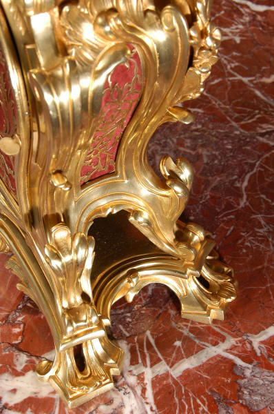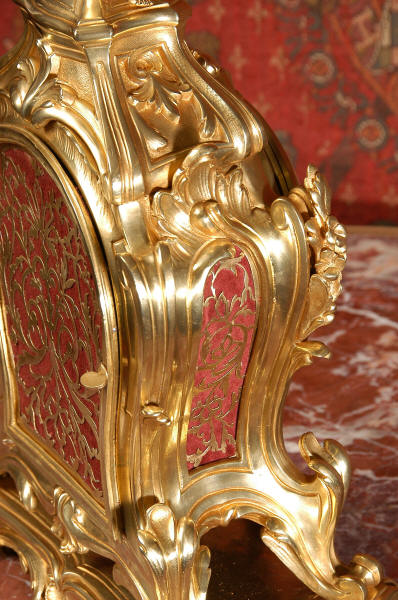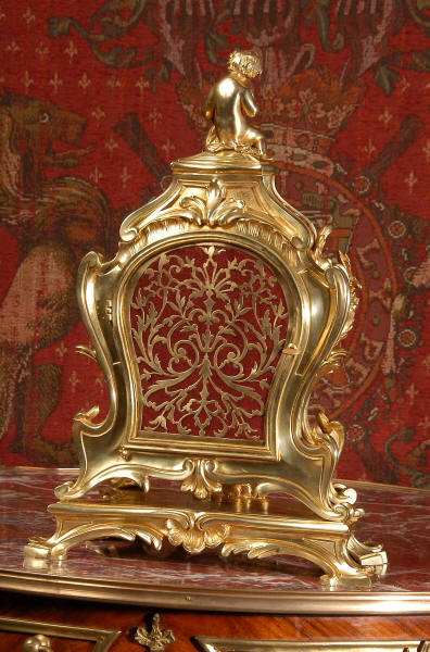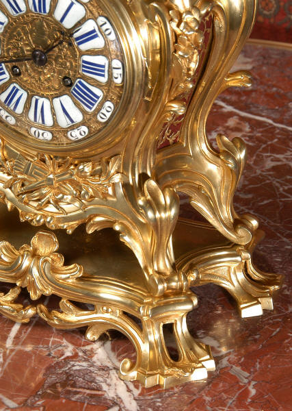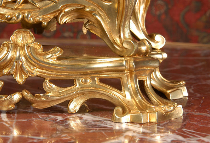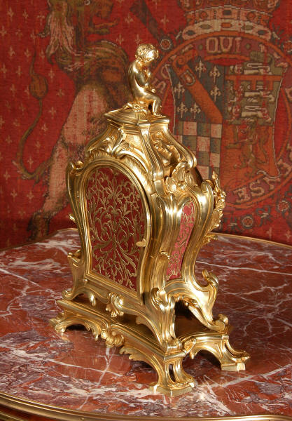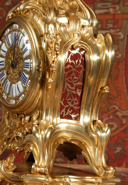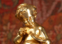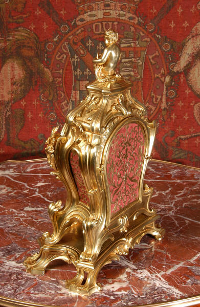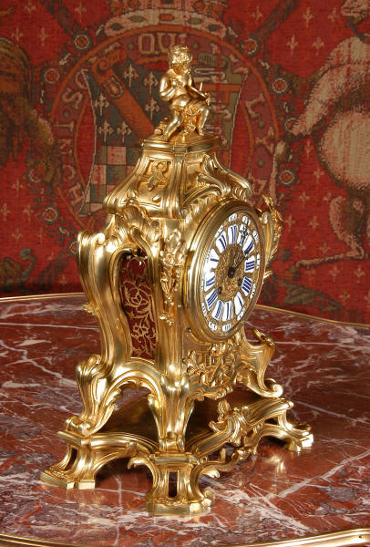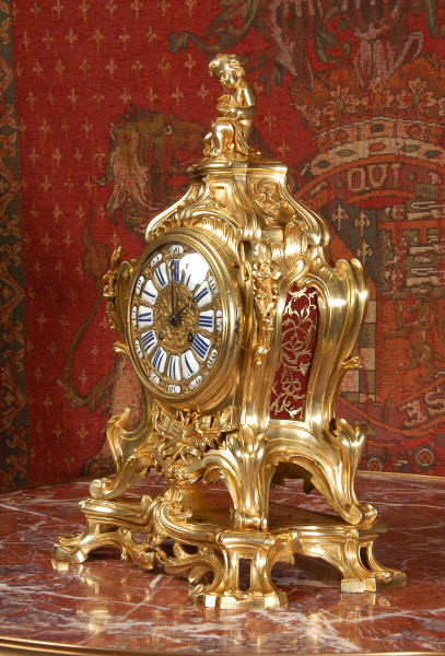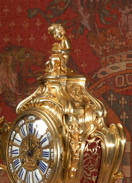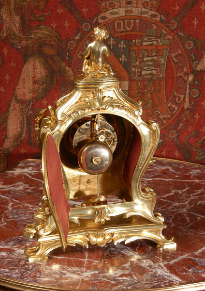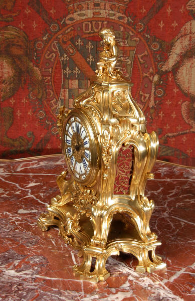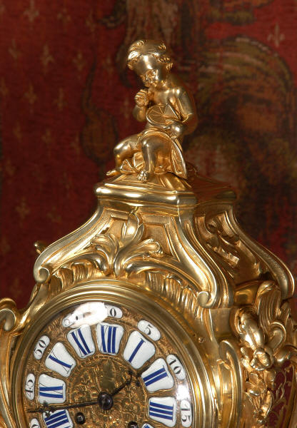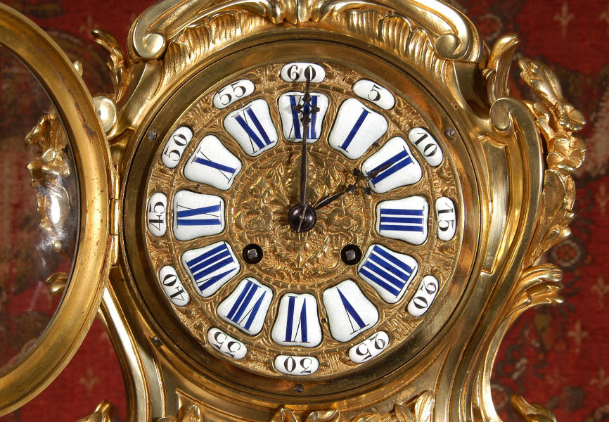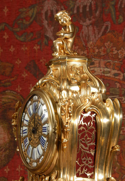 ~ French - Circa 1880 ~ ~~ Excellent condition, fully overhauled & working ~~ A large and stunning original antique French brass table clock in lovely condition. The style is Rococo, waisted keyhole shape with acanthus leaf shoulders, 'C' scroll bracket feet and surmounted by a cherub holding a sundial. It stands on its original integral base. The dial is heavy cast brass with a acanthus bezel fitted with convex glass. 24 individual enamel cartouches are mounted for the hours and the minutes. Fretted and blued steel hands are original. Below the dial is a torché and quiver of arrows. To the sides are delicate and elaborate leafy fretted panels backed with red velvet. The rear door also features a stunning fretted panel, backed with red velvet. The design is beautifully bold and heavily moulded in brass, well chased and finished. It is modelled in the round and so would display very well on a table. The French movement is of very high quality and is in excellent clean and running condition having been fully overhauled by our clockmaker. it has the retailer / clockmakers mark 'A C ' inscribed on the backplate. Pendulum is a replacement. It runs for 8 days on one wind and strikes the hours and halves on a large, sonorous bell. Click the video clip below to hear the bell and watch the clock running! Condition of the case is
