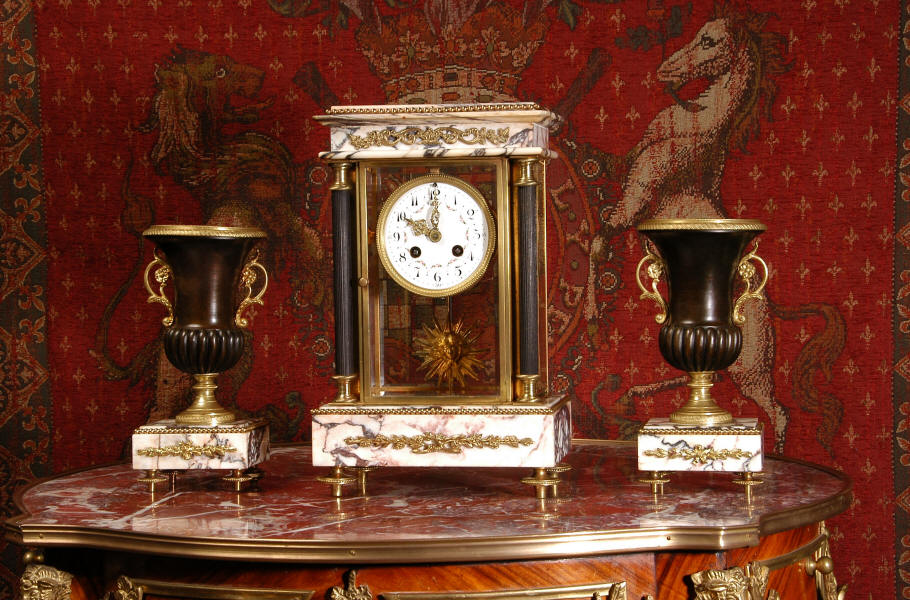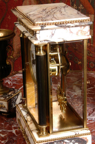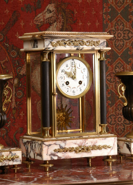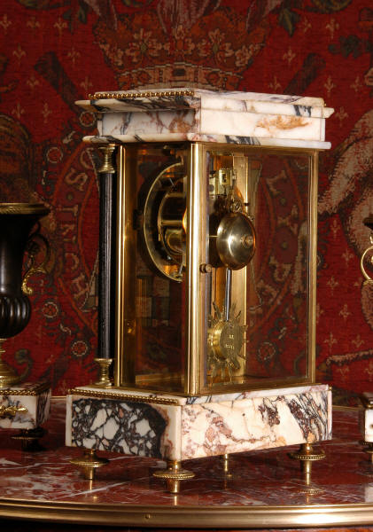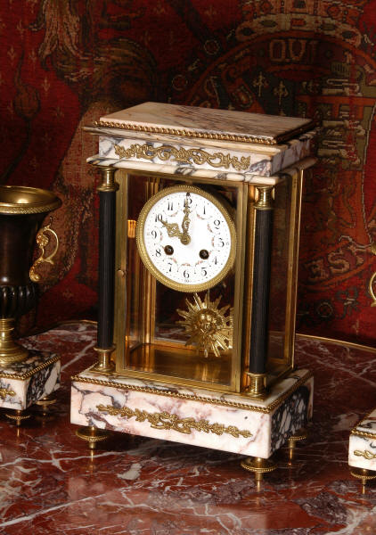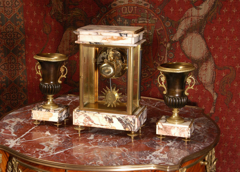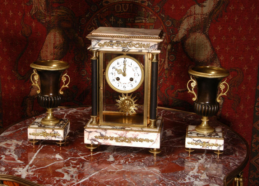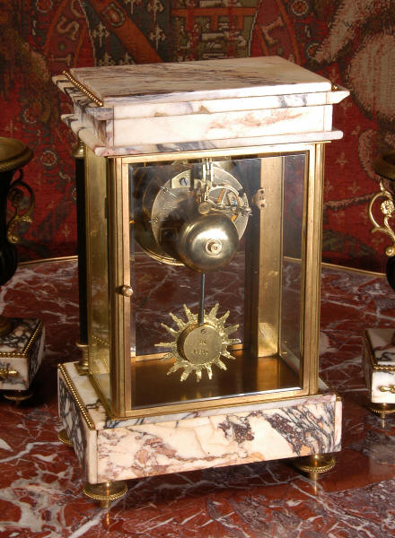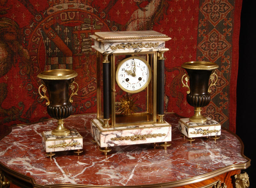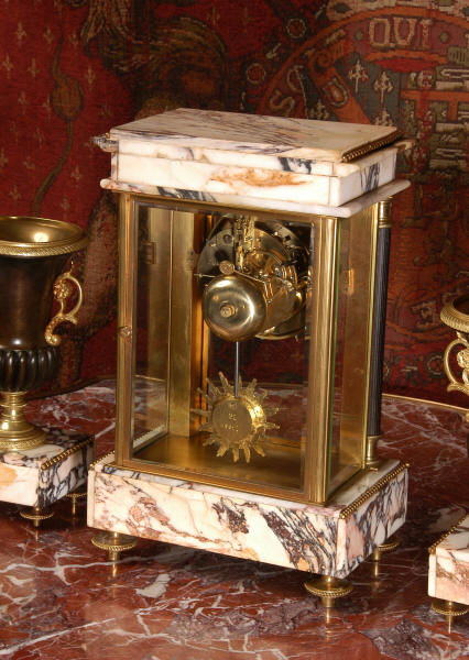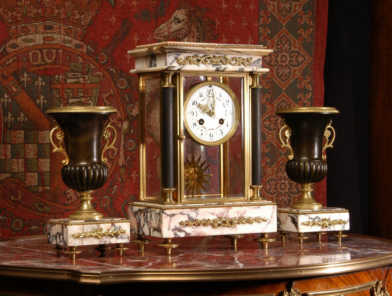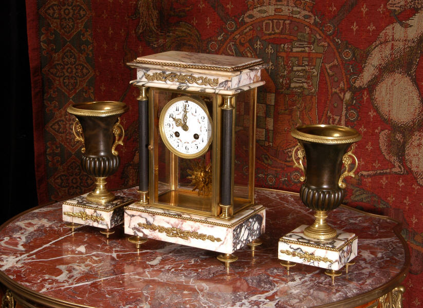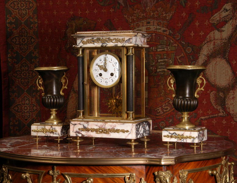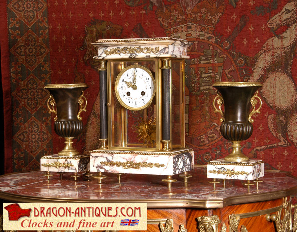 ~ French - Circa 1880 ~ ~~ Excellent condition ~~ A very chic and stunning Japy Freres four glass clock set. Beautifully made in a variegated specimen marble mounted with ormolu (fine gilded bronze/brass) and bronze. The four sides of the clock are glazed with bevelled glass to allow the movement to be seen along with the large sunburst ormolu pendulum swinging. Dial is enamel on copper decorated with delicate floral swags between the numerals and is complete with original finely fretted hands. The clock is accompanied by a matching pair of neoclassical urns mounted on marble bases with ormolu handles. The French movement is of high quality and has the Japy Freres 'Grande Medaille D'Honneur' mark on the backplate It is in excellent clean and running condition having been fully overhauled and polished by our clockmaker. Pendulum is original. It runs for 8 days on one wind and strikes the hours and halves on a bell. Click the video clip below to hear the bell and watch the clock running! Condition of the case is