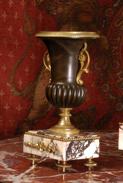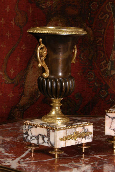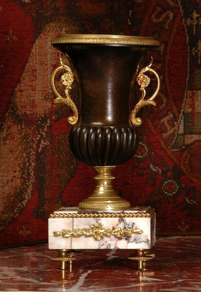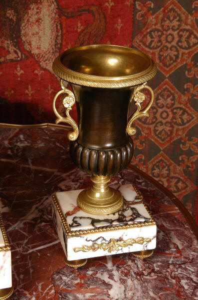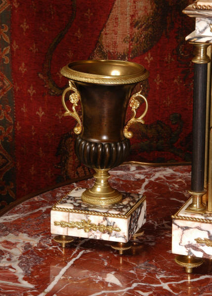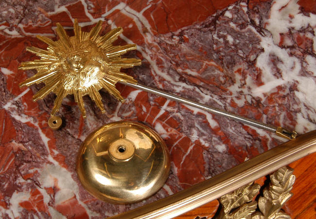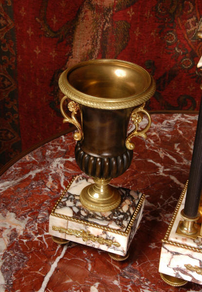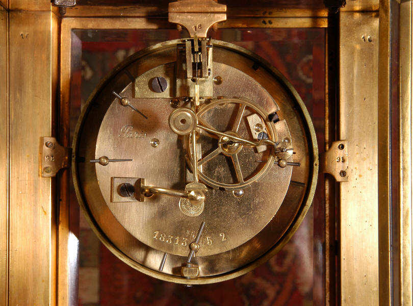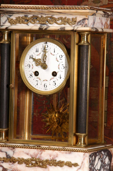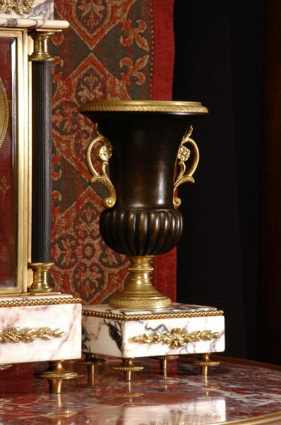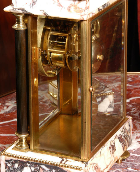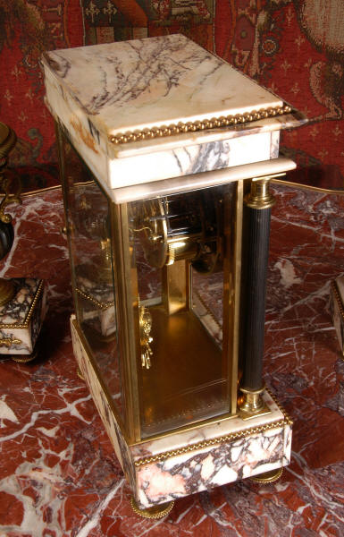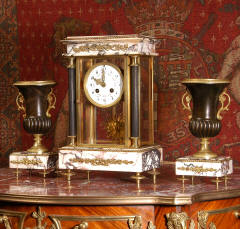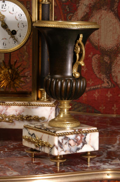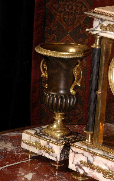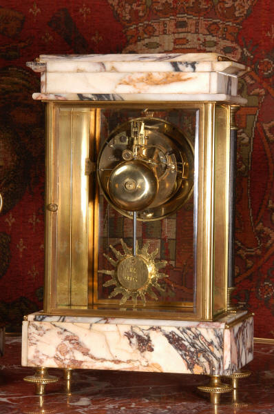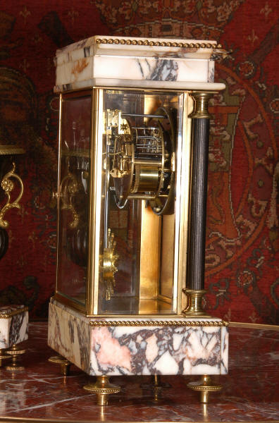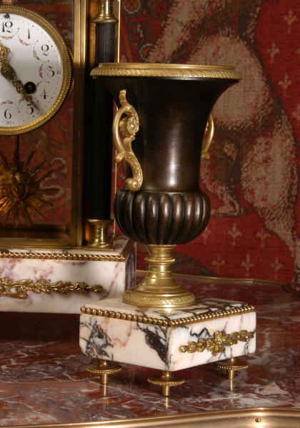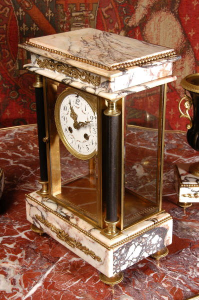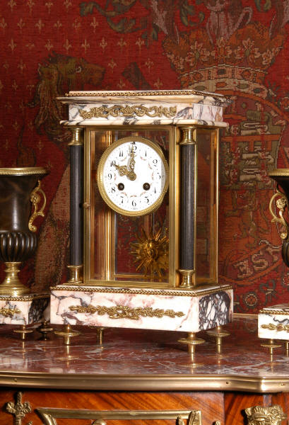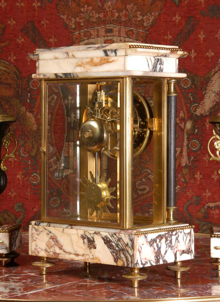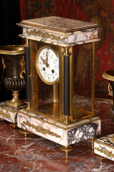 ~ French - Circa 1880 ~ ~~ Excellent condition ~~ A very chic and stunning Japy Freres four glass clock set. Beautifully made in a variegated specimen marble mounted with ormolu (fine gilded bronze/brass) and bronze. The four sides of the clock are glazed with bevelled glass to allow the movement to be seen along with the large sunburst ormolu pendulum swinging. Dial is enamel on copper decorated with delicate floral swags between the numerals and is complete with original finely fretted hands. The clock is accompanied by a matching pair of neoclassical urns mounted on marble bases with ormolu handles. The French movement is of high quality and has the Japy Freres 'Grande Medaille D'Honneur' mark on the backplate It is in excellent clean and running condition having been fully overhauled and polished by our clockmaker. Pendulum is original. It runs for 8 days on one wind and strikes the hours and halves on a bell. Click the video clip below to hear the bell and watch the clock running! Condition of the case is