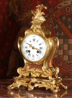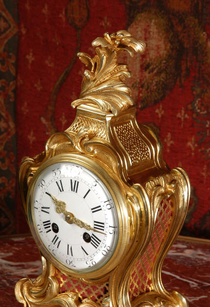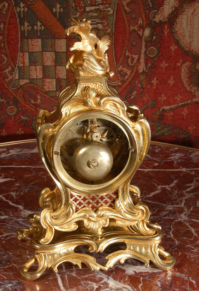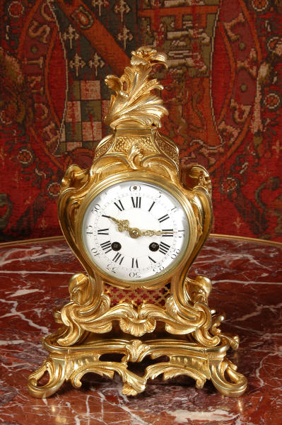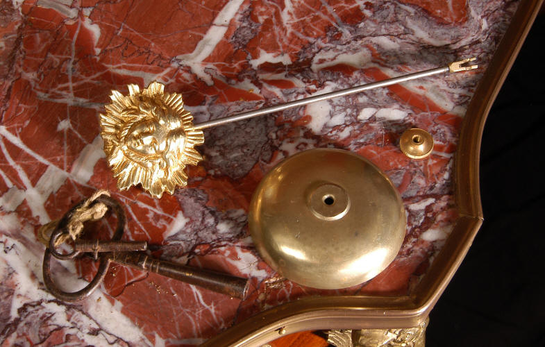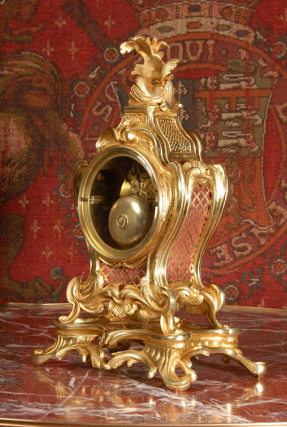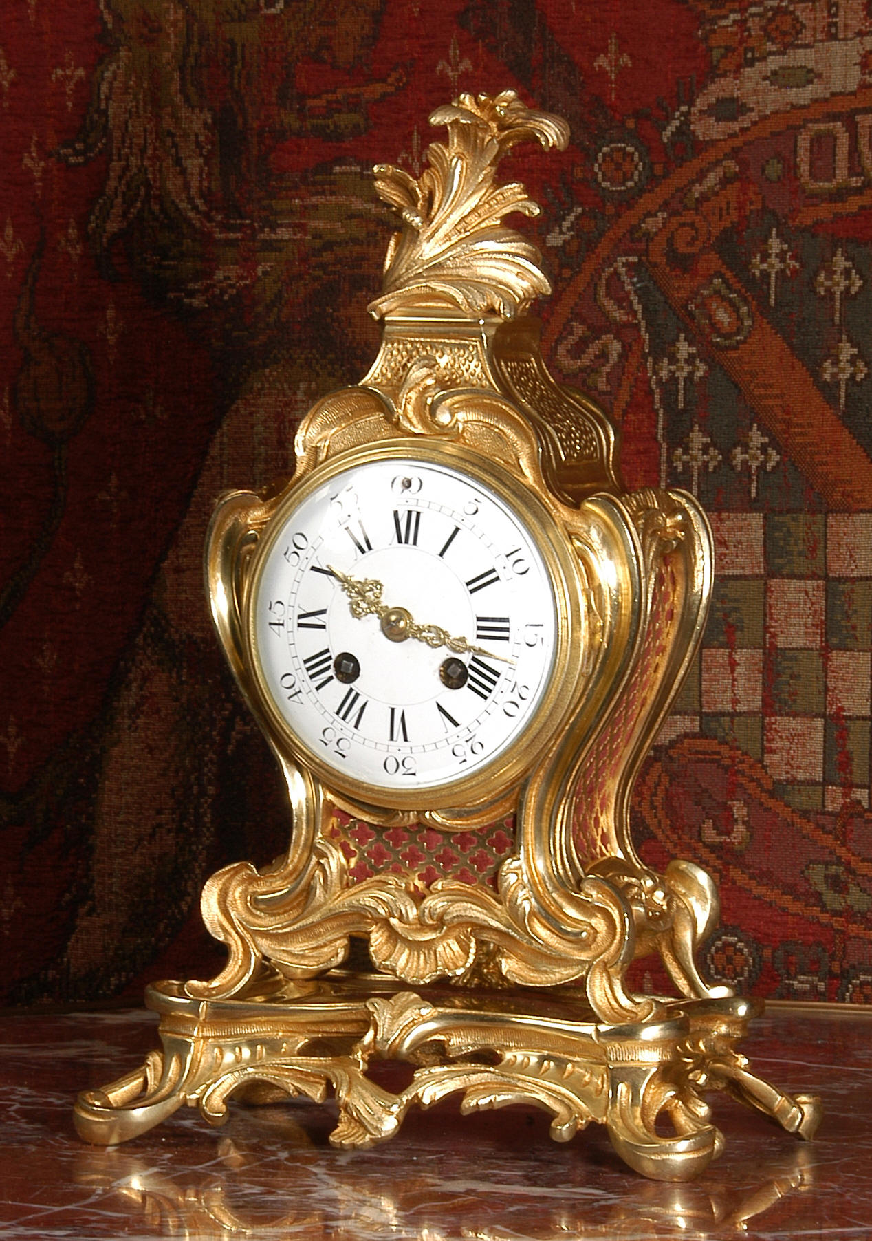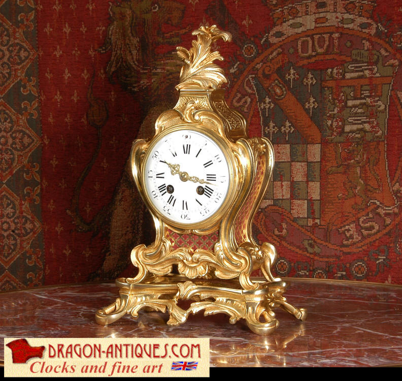 ~ French - Circa 1875 ~ ~~ Excellent condition ~~ Stunning antique French gilt brass boudoir clock. The style is Rococo, waisted keyhole shape with acanthus leaf shoulders, 'C' scroll feet and surmounted by a flamboyant finial. It stands on its original integral base. Curved fretted panels backed with red velvet are inserted into the sides, with smaller ones to the front and rear. The pendulum is also gilded brass and is modelled as the sun god. The reflection of the pendulum swinging can be seen in the polished base of the the clock. The design is beautifully bold and heavily moulded in gilded brass, well chased and finished. It is modelled in the round and the rear door is also glazed to allow the movement to be seen. The clock would display very well on a table. Dial is a beautiful enamel on copper, it is complete with its original delicately fretted brass hands and convex glass. The French movement is of excellent quality and is in clean and fully working condition having been fully overhauled in our workshop. It is complete with original gilt brass pendulum. It also comes complete with two antique iron keys, quite possibly original as we found them hanging inside the case by the string still attached to them. One for winding and one for the Brocot adjustable suspension (winding hole for this is just above the 12 o'clock). It runs for 8 days on one wind and strikes the hours and halves on a bell, click the video below to see and hear the movement! The finish of the gilded brass is excellent, bright