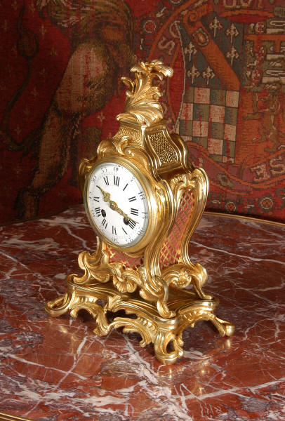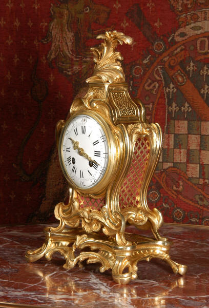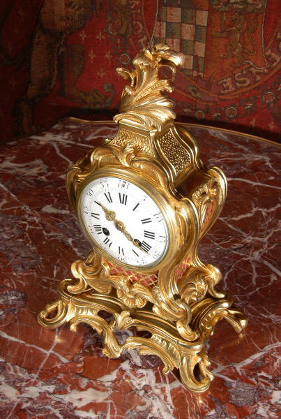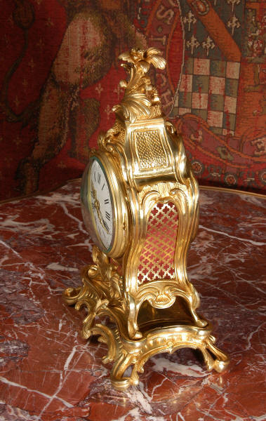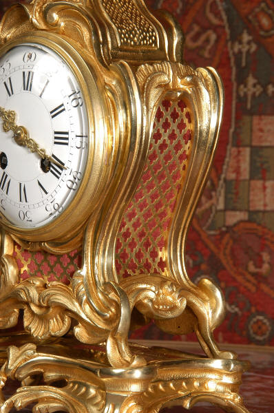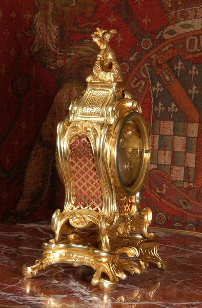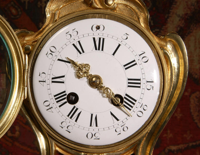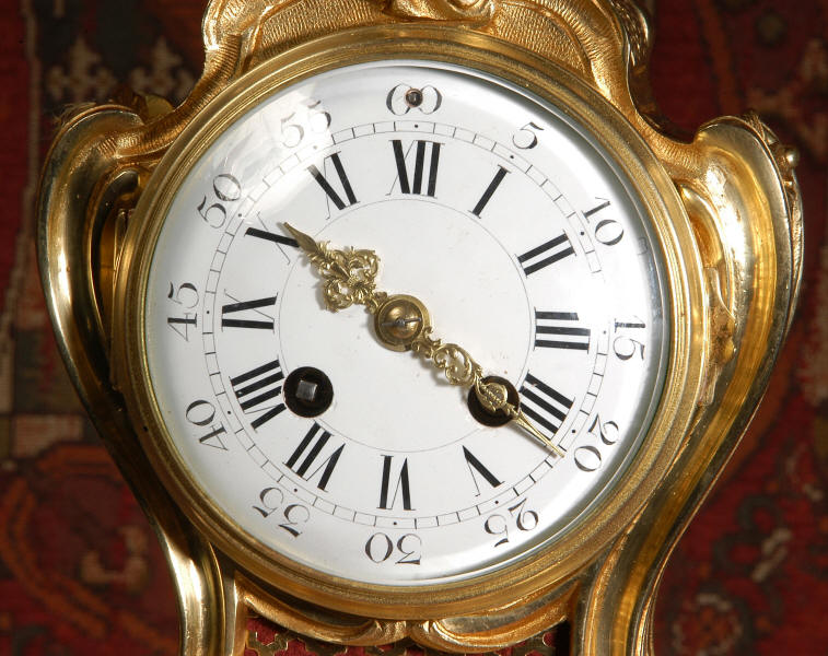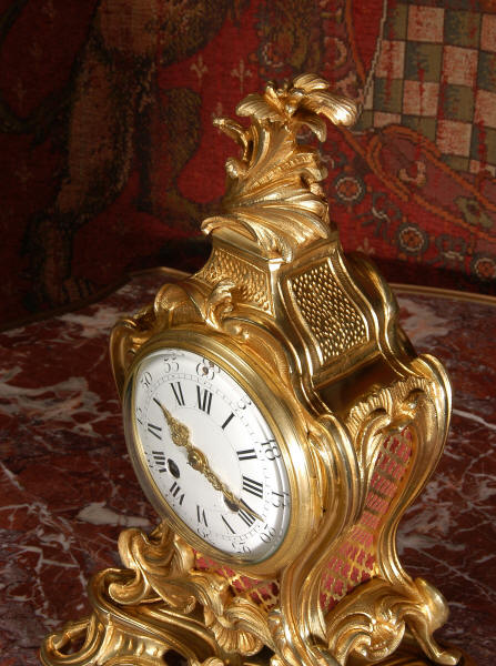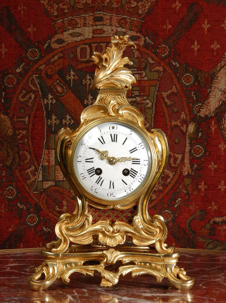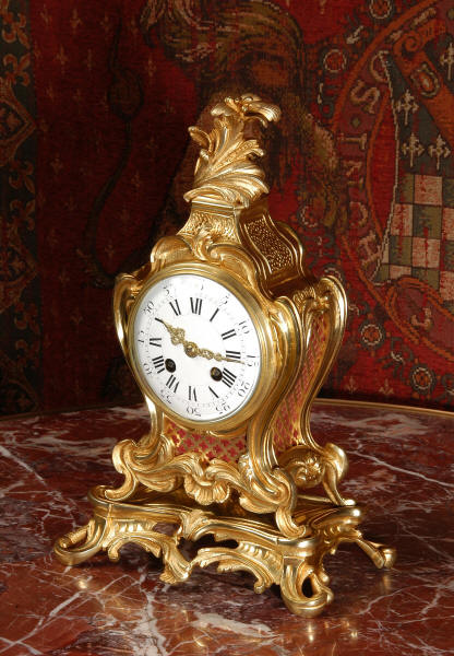 ~ French - Circa 1875 ~ ~~ Excellent condition ~~ Stunning antique French gilt brass boudoir clock. The style is Rococo, waisted keyhole shape with acanthus leaf shoulders, 'C' scroll feet and surmounted by a flamboyant finial. It stands on its original integral base. Curved fretted panels backed with red velvet are inserted into the sides, with smaller ones to the front and rear. The pendulum is also gilded brass and is modelled as the sun god. The reflection of the pendulum swinging can be seen in the polished base of the the clock. The design is beautifully bold and heavily moulded in gilded brass, well chased and finished. It is modelled in the round and the rear door is also glazed to allow the movement to be seen. The clock would display very well on a table. Dial is a beautiful enamel on copper, it is complete with its original delicately fretted brass hands and convex glass. The French movement is of excellent quality and is in clean and fully working condition having been fully overhauled in our workshop. It is complete with original gilt brass pendulum. It also comes complete with two antique iron keys, quite possibly original as we found them hanging inside the case by the string still attached to them. One for winding and one for the Brocot adjustable suspension (winding hole for this is just above the 12 o'clock). It runs for 8 days on one wind and strikes the hours and halves on a bell, click the video below to see and hear the movement! The finish of the gilded brass is excellent, bright