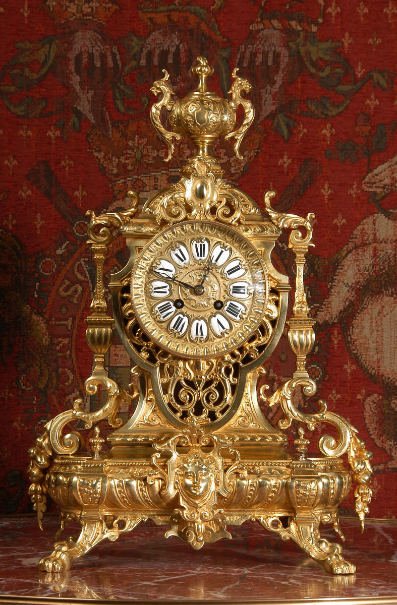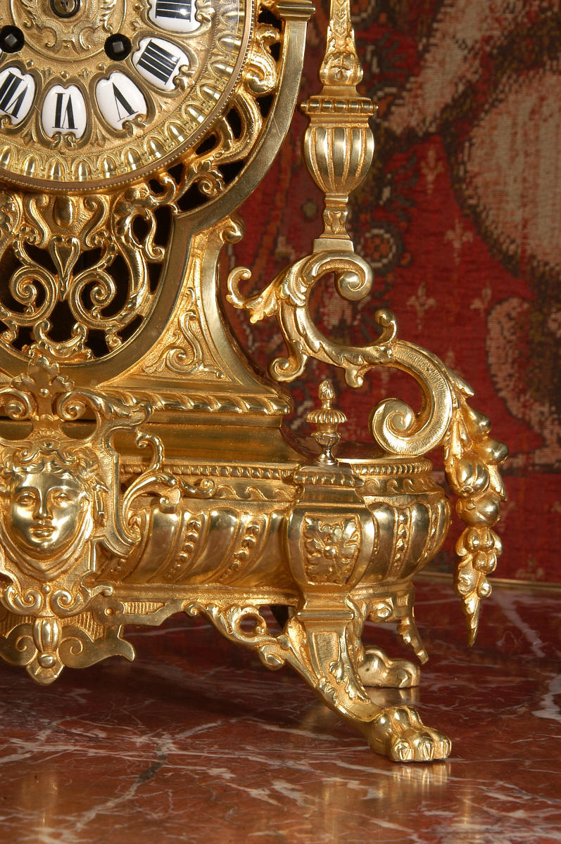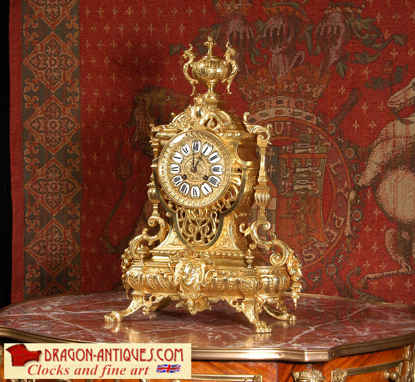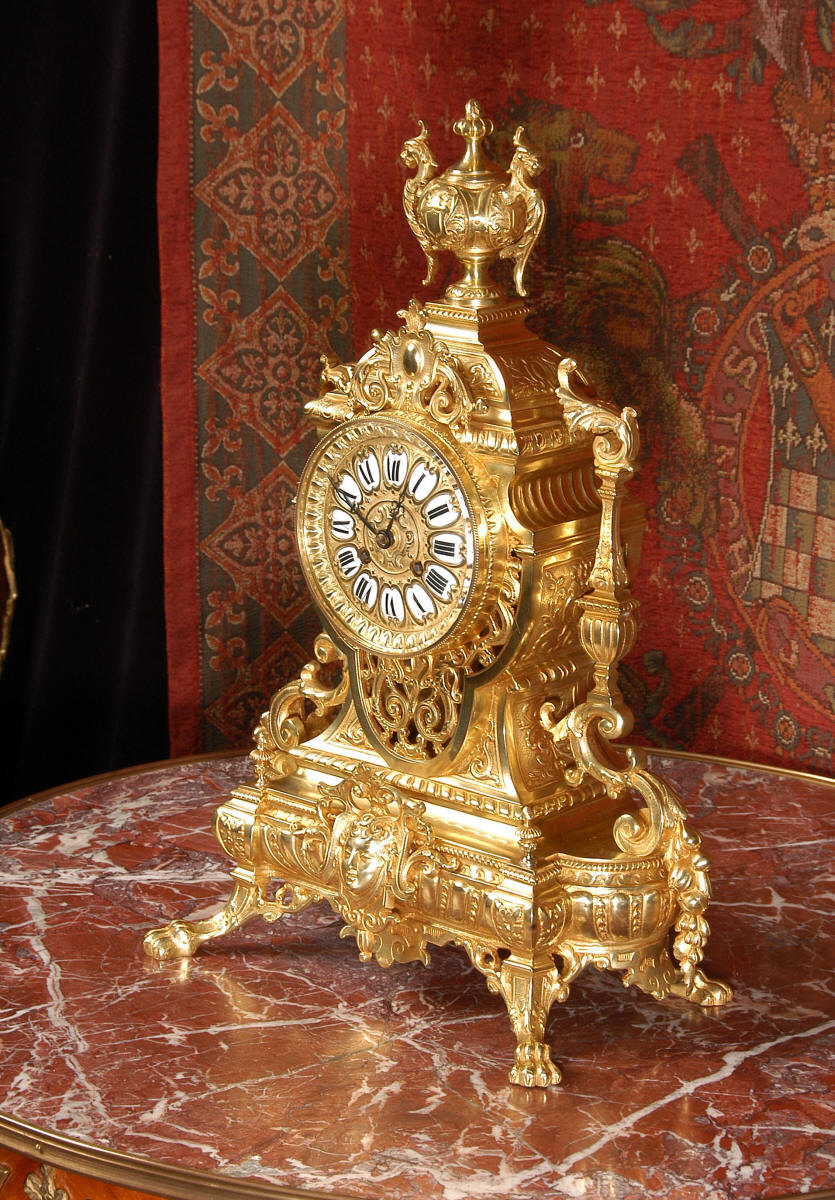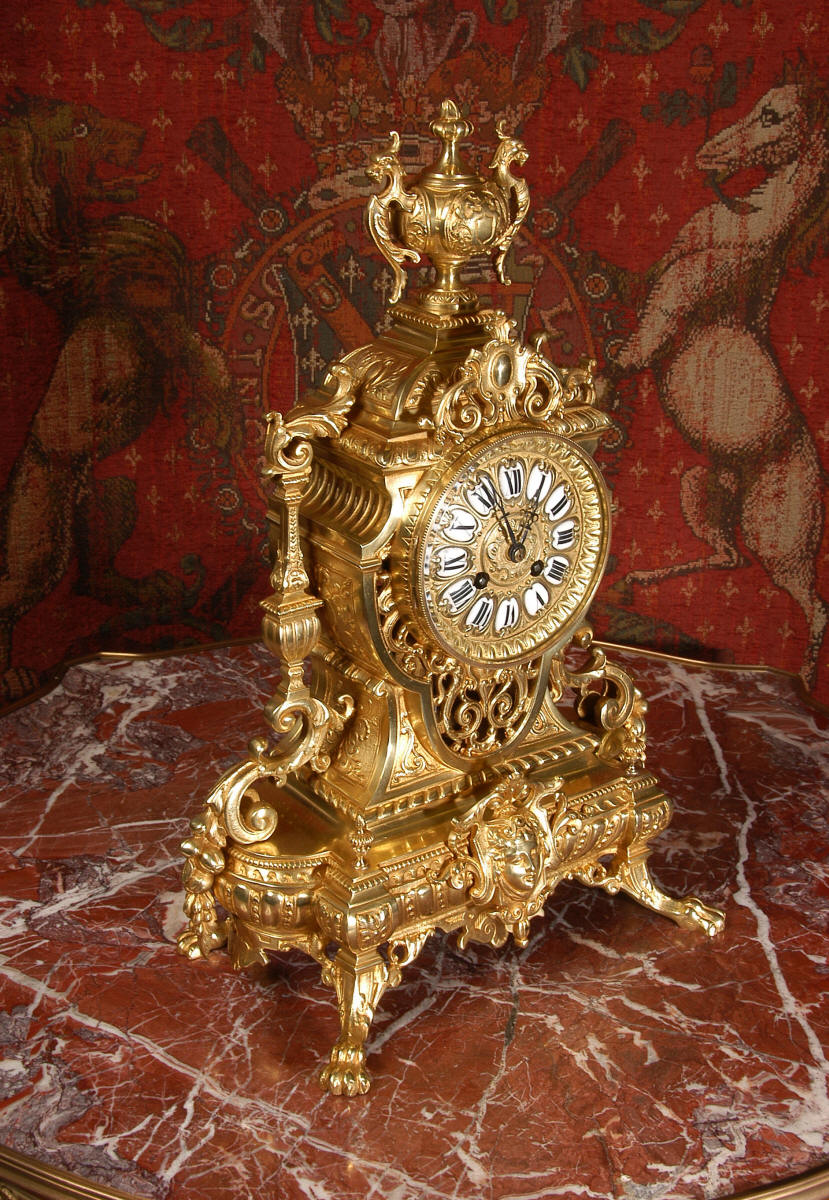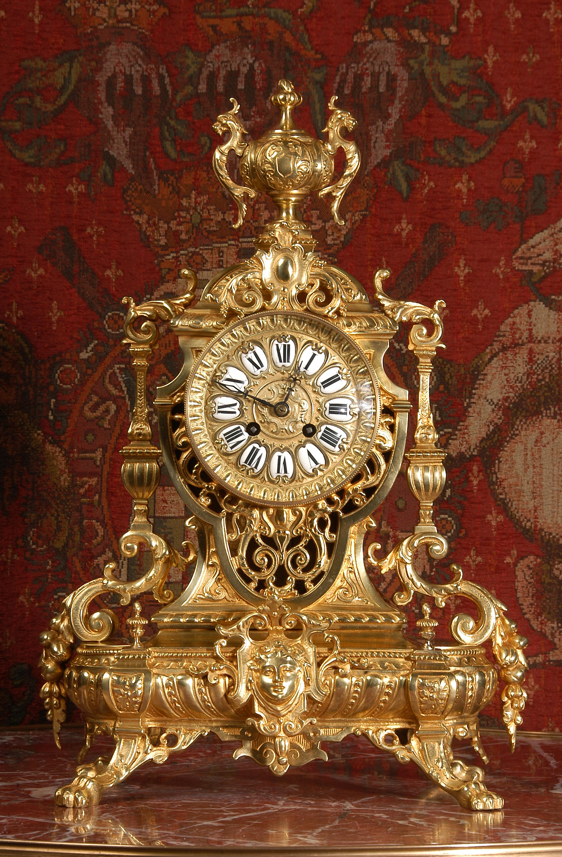 ~ French - Circa 1870 ~ ~~ Excellent condition, fully working ~~ A large and stunning original antique French gilt brass table clock. It is Baroque in style, an elaborate waisted shape with an intricately fretted front allowing the pendulum to be seen swinging within the case. To the front is a goddess mask, to the sides are pillars formed of scrolling foliage and fruit and to the top is a handled urn with mythical creatures. It stands on large hairy paw feet. It is of excellent quality with a lovely clean and bright original gild.