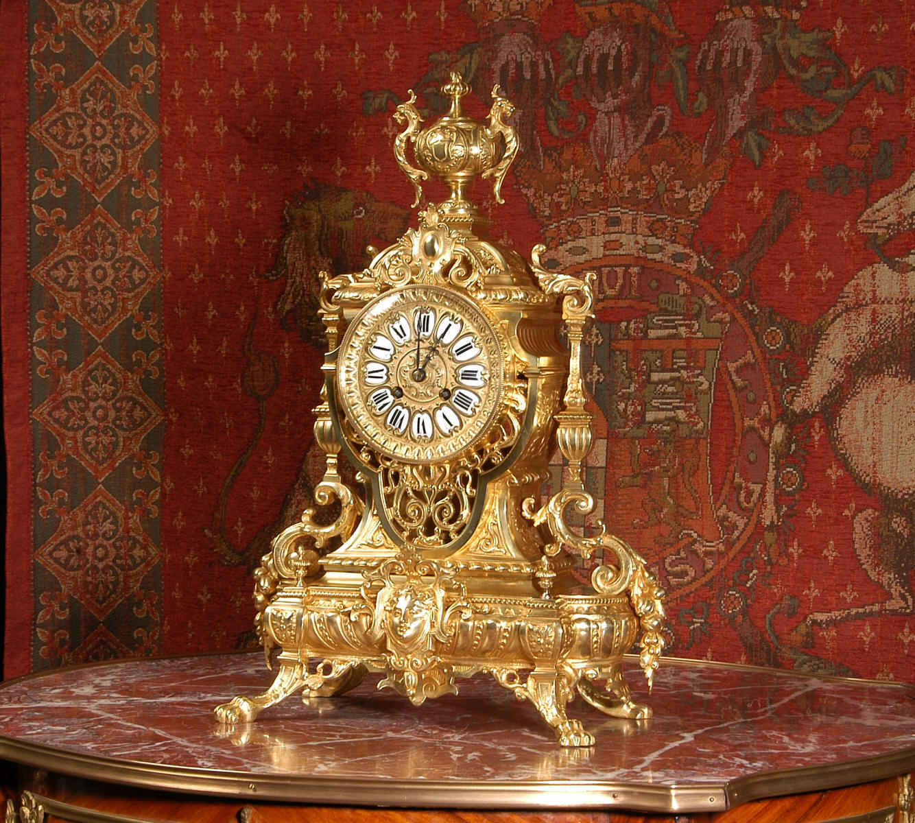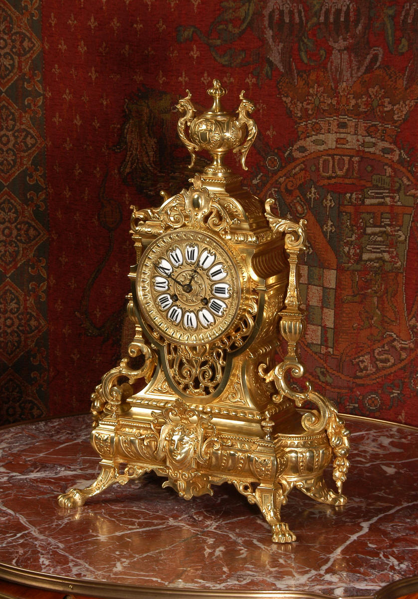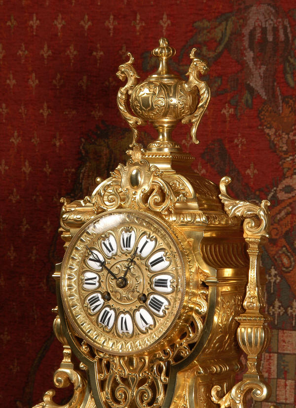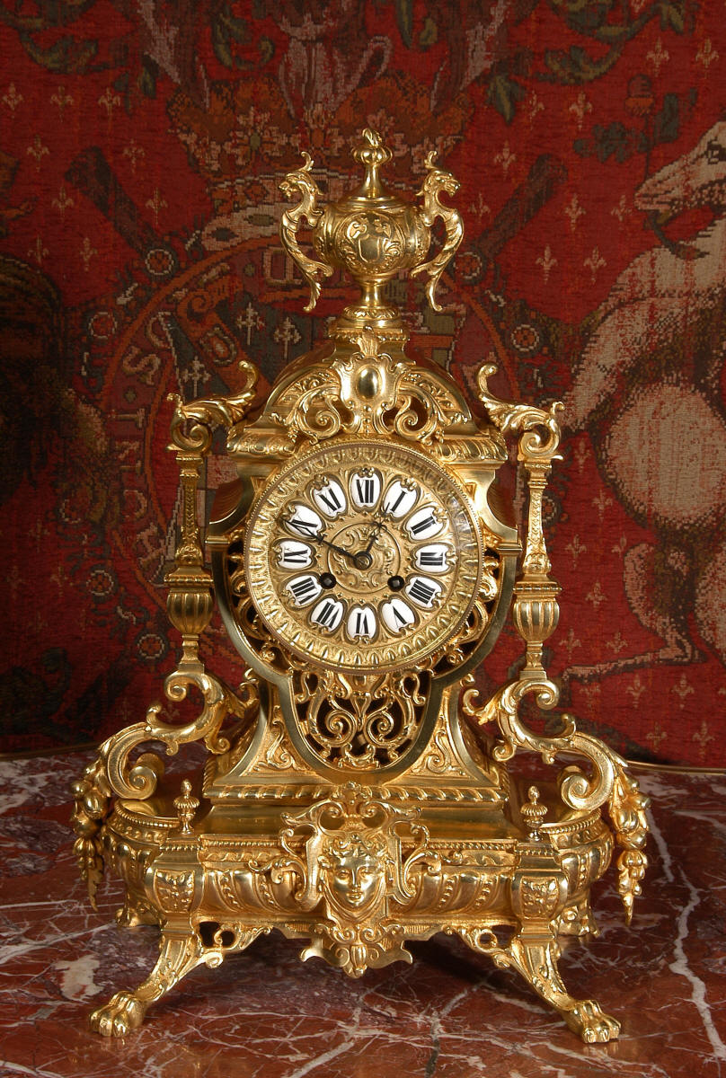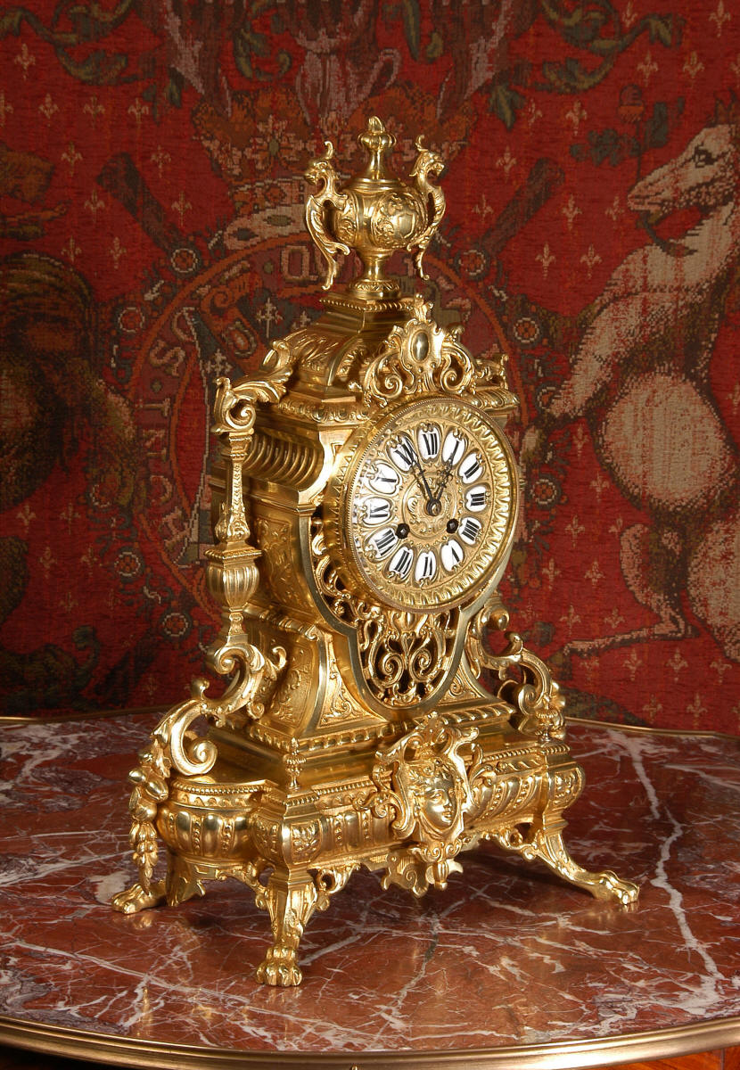 ~ French - Circa 1870 ~ ~~ Excellent condition, fully working ~~ A large and stunning original antique French gilt brass table clock. It is Baroque in style, an elaborate waisted shape with an intricately fretted front allowing the pendulum to be seen swinging within the case. To the front is a goddess mask, to the sides are pillars formed of scrolling foliage and fruit and to the top is a handled urn with mythical creatures. It stands on large hairy paw feet. It is of excellent quality with a lovely clean and bright original gild.