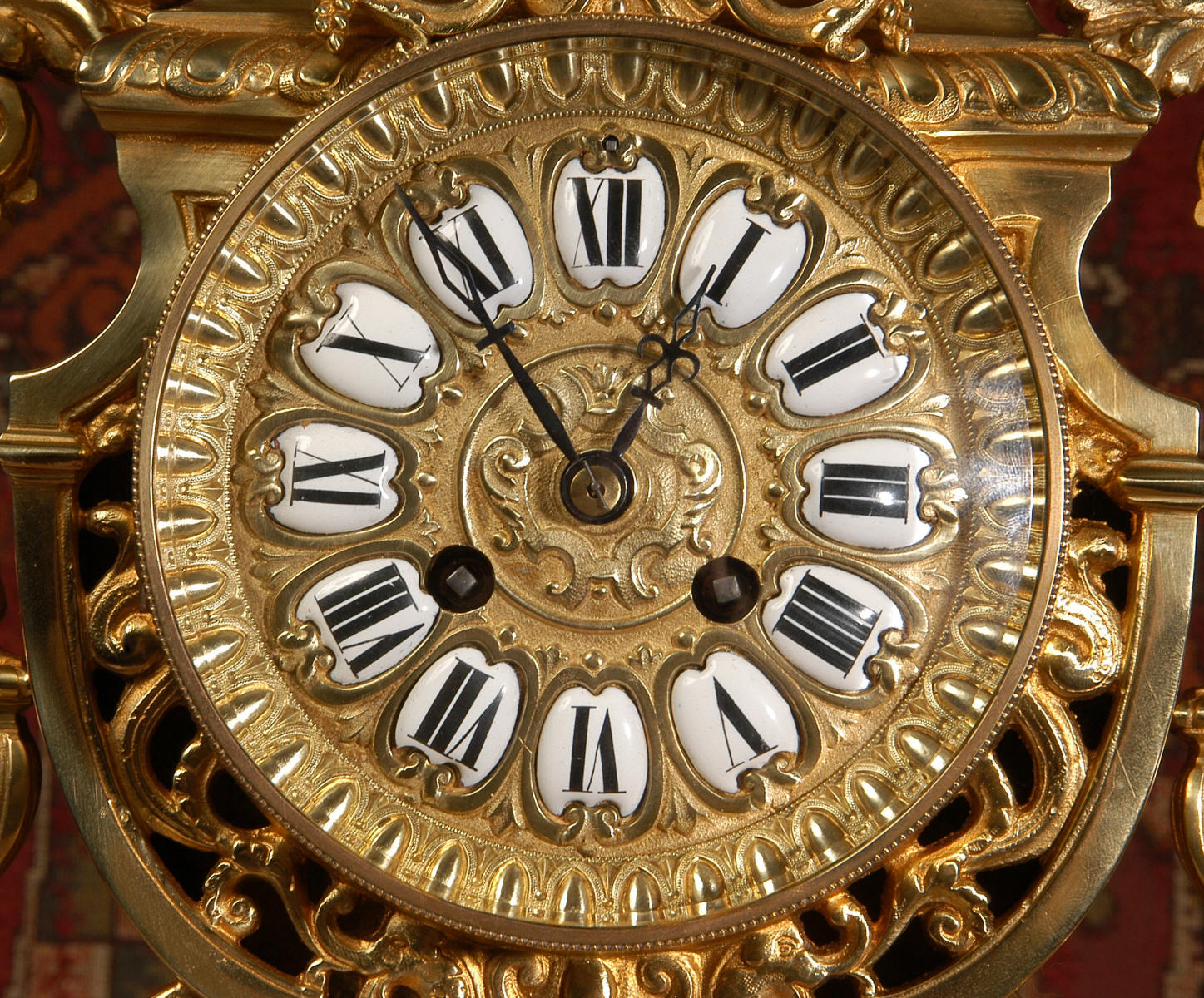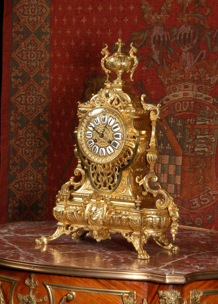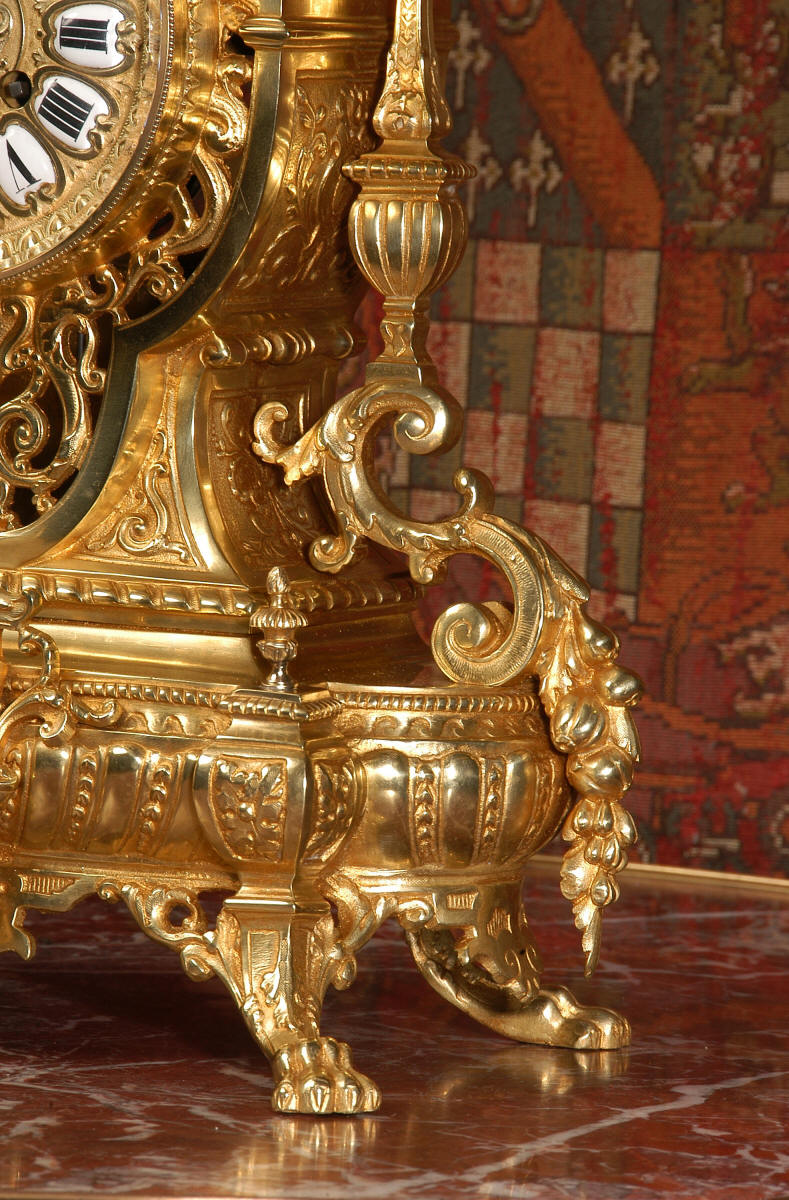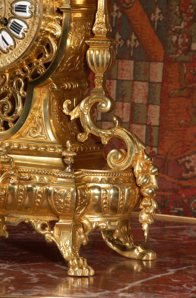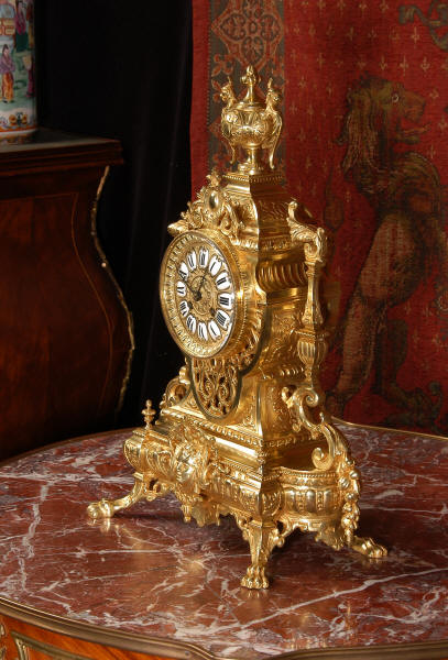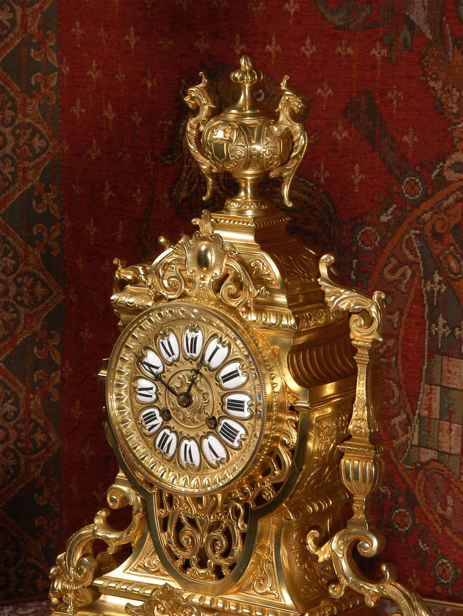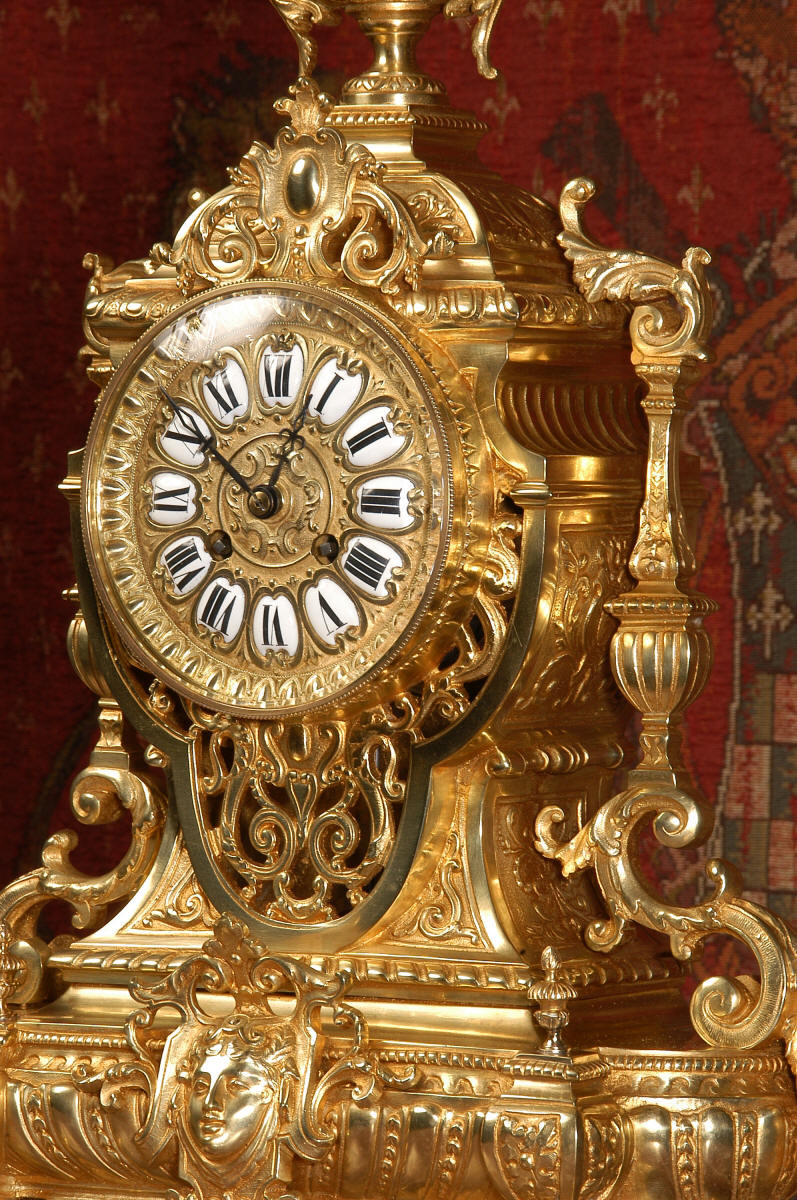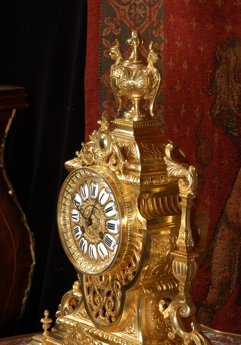 ~ French - Circa 1870 ~ ~~ Excellent condition, fully working ~~ A large and stunning original antique French gilt brass table clock. It is Baroque in style, an elaborate waisted shape with an intricately fretted front allowing the pendulum to be seen swinging within the case. To the front is a goddess mask, to the sides are pillars formed of scrolling foliage and fruit and to the top is a handled urn with mythical creatures. It stands on large hairy paw feet. It is of excellent quality with a lovely clean and bright original gild.