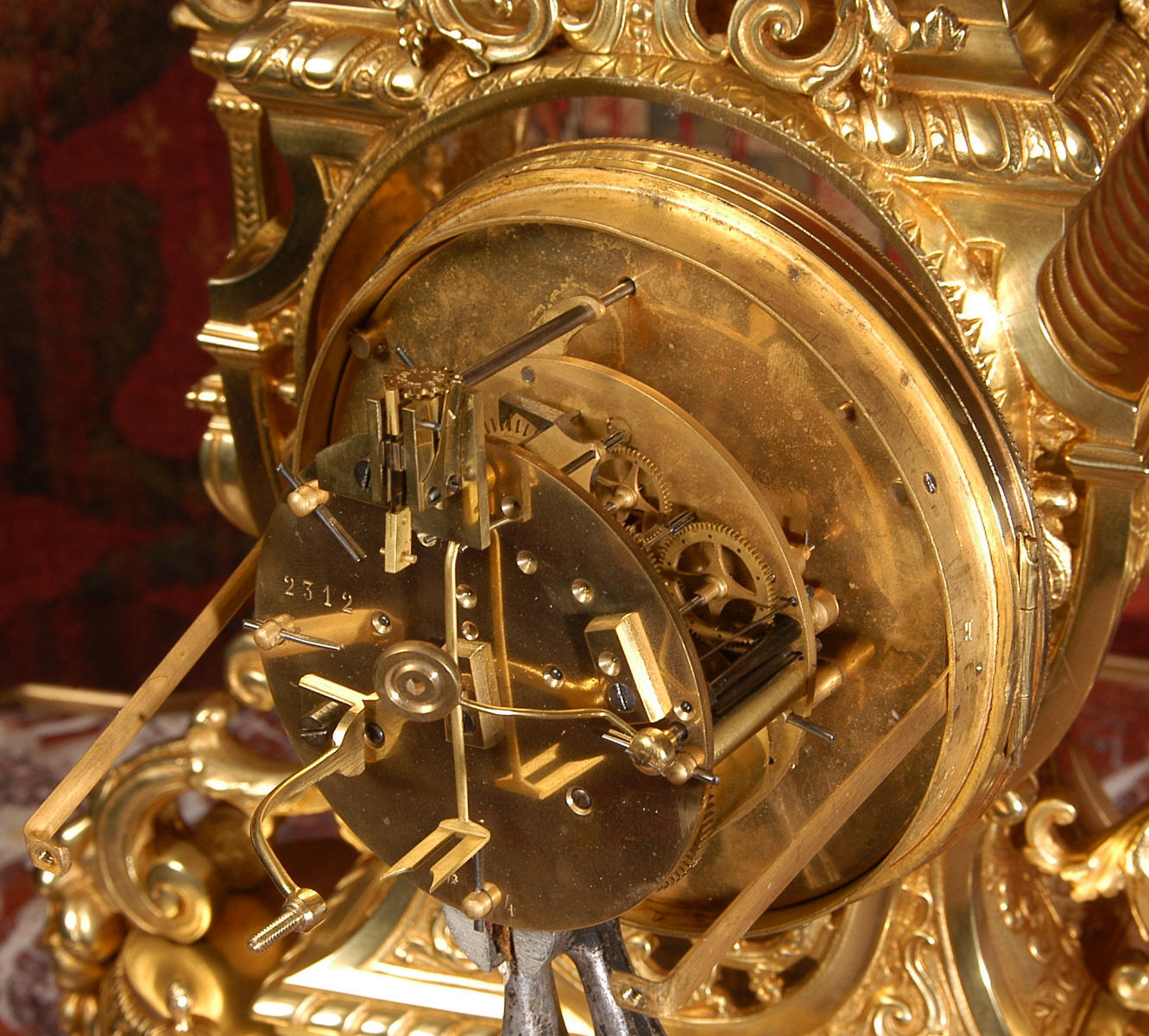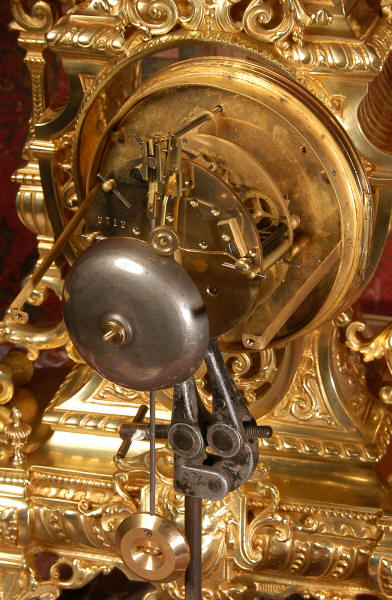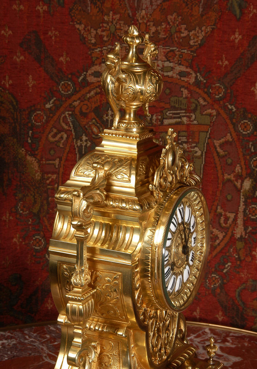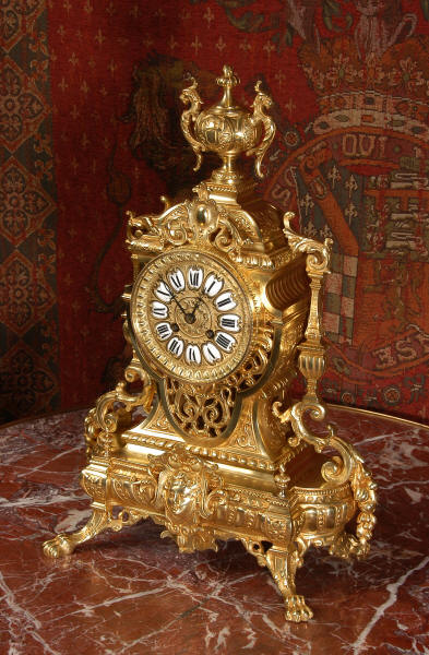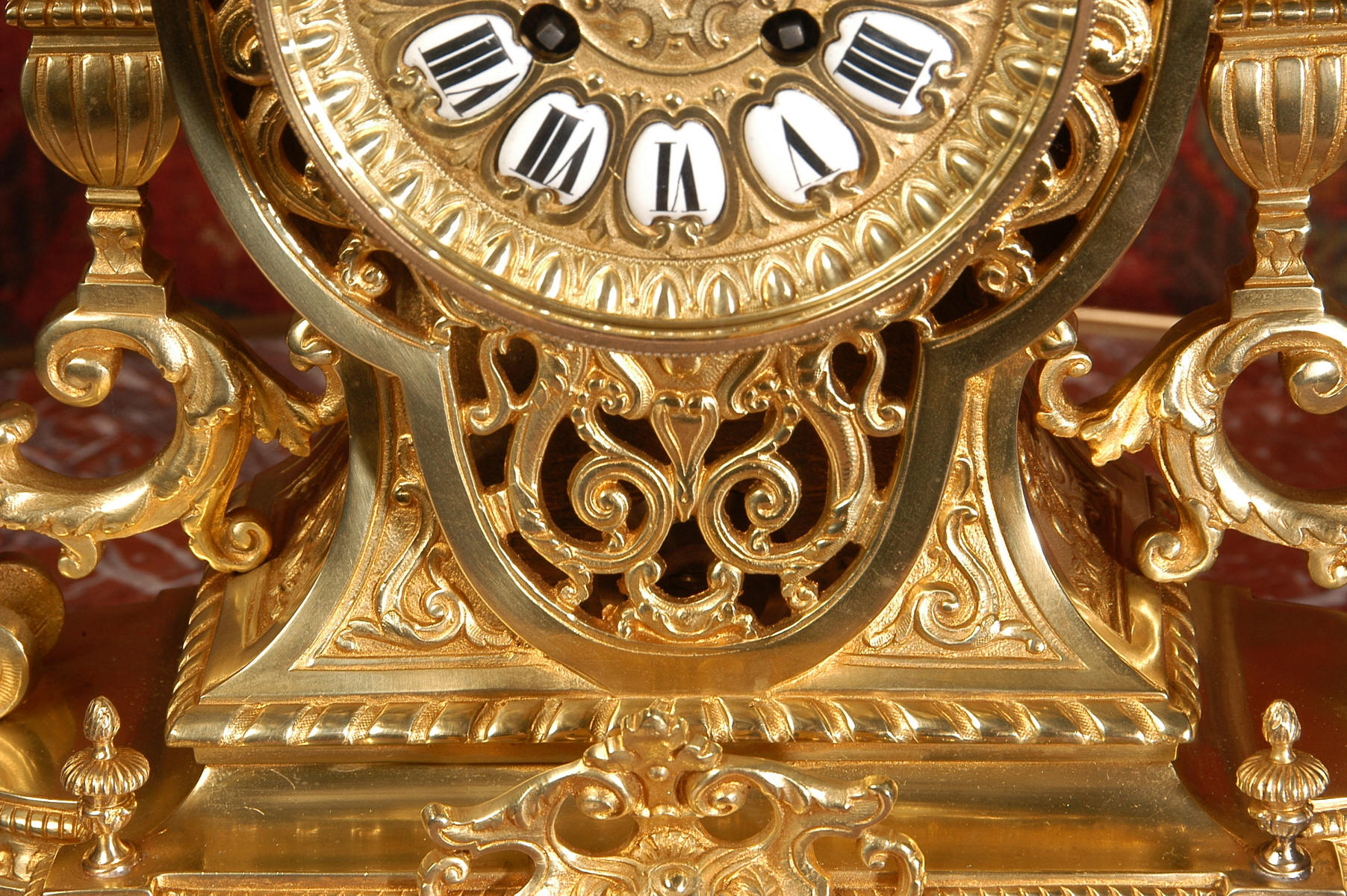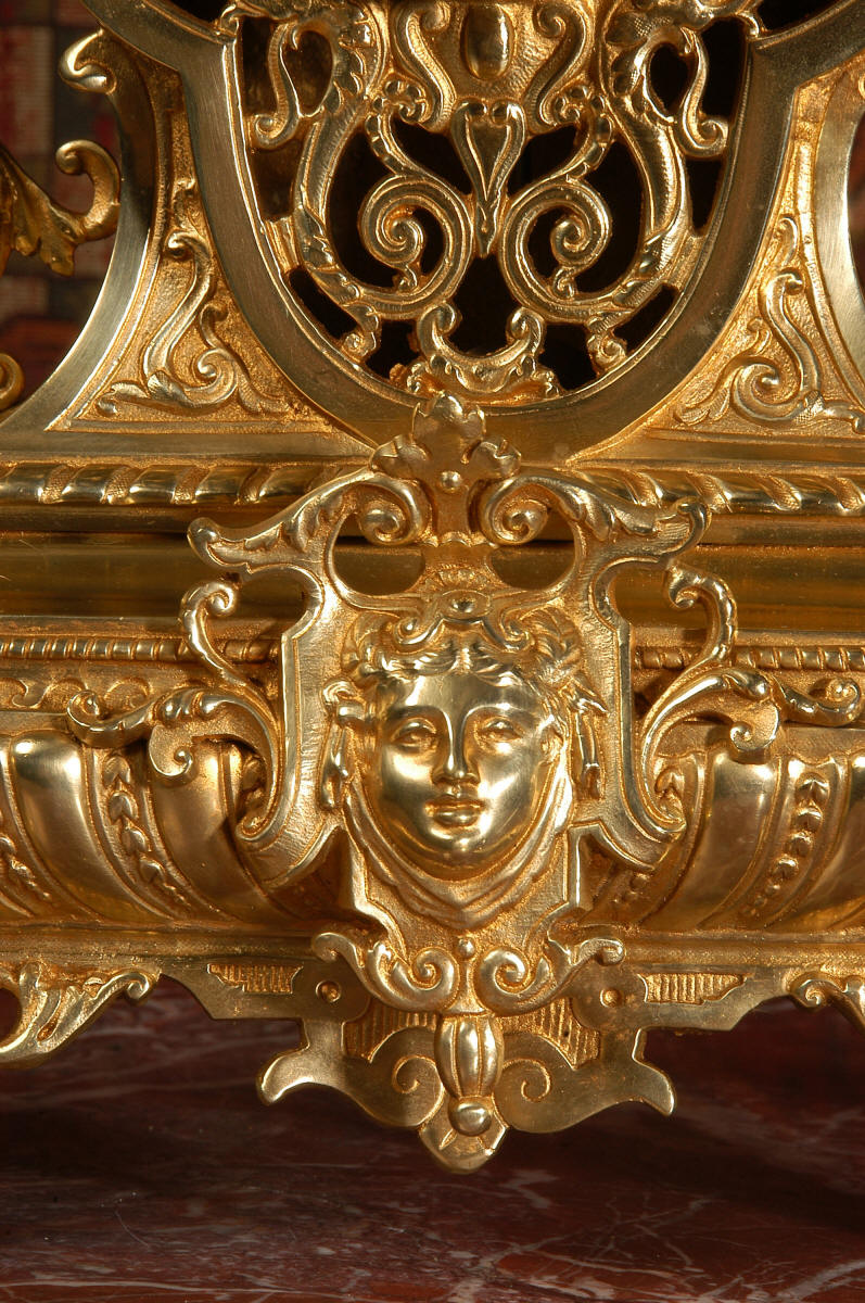 ~ French - Circa 1870 ~ ~~ Excellent condition, fully working ~~ A large and stunning original antique French gilt brass table clock. It is Baroque in style, an elaborate waisted shape with an intricately fretted front allowing the pendulum to be seen swinging within the case. To the front is a goddess mask, to the sides are pillars formed of scrolling foliage and fruit and to the top is a handled urn with mythical creatures. It stands on large hairy paw feet. It is of excellent quality with a lovely clean and bright original gild.
