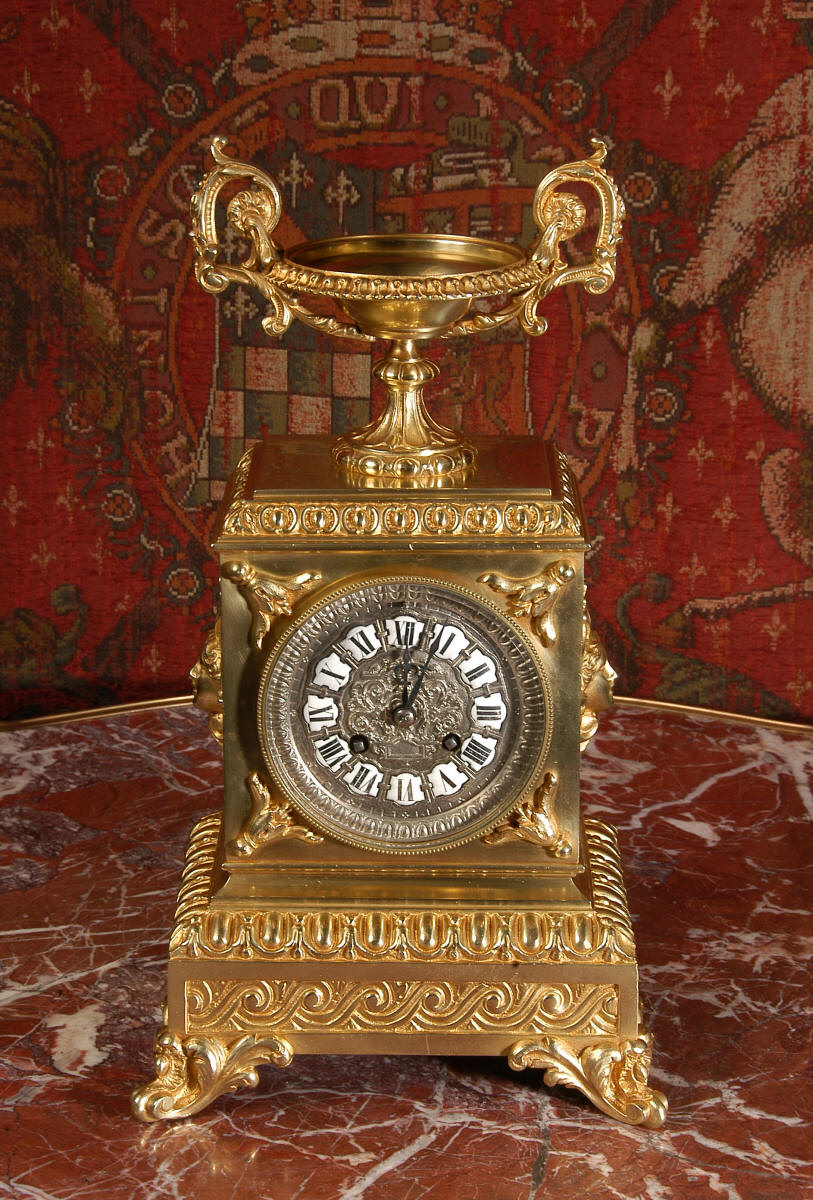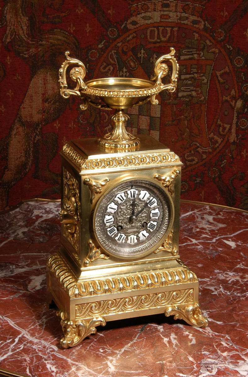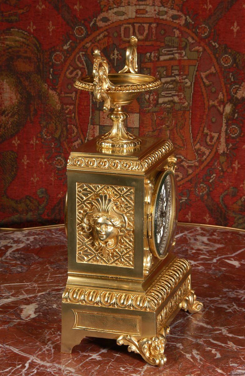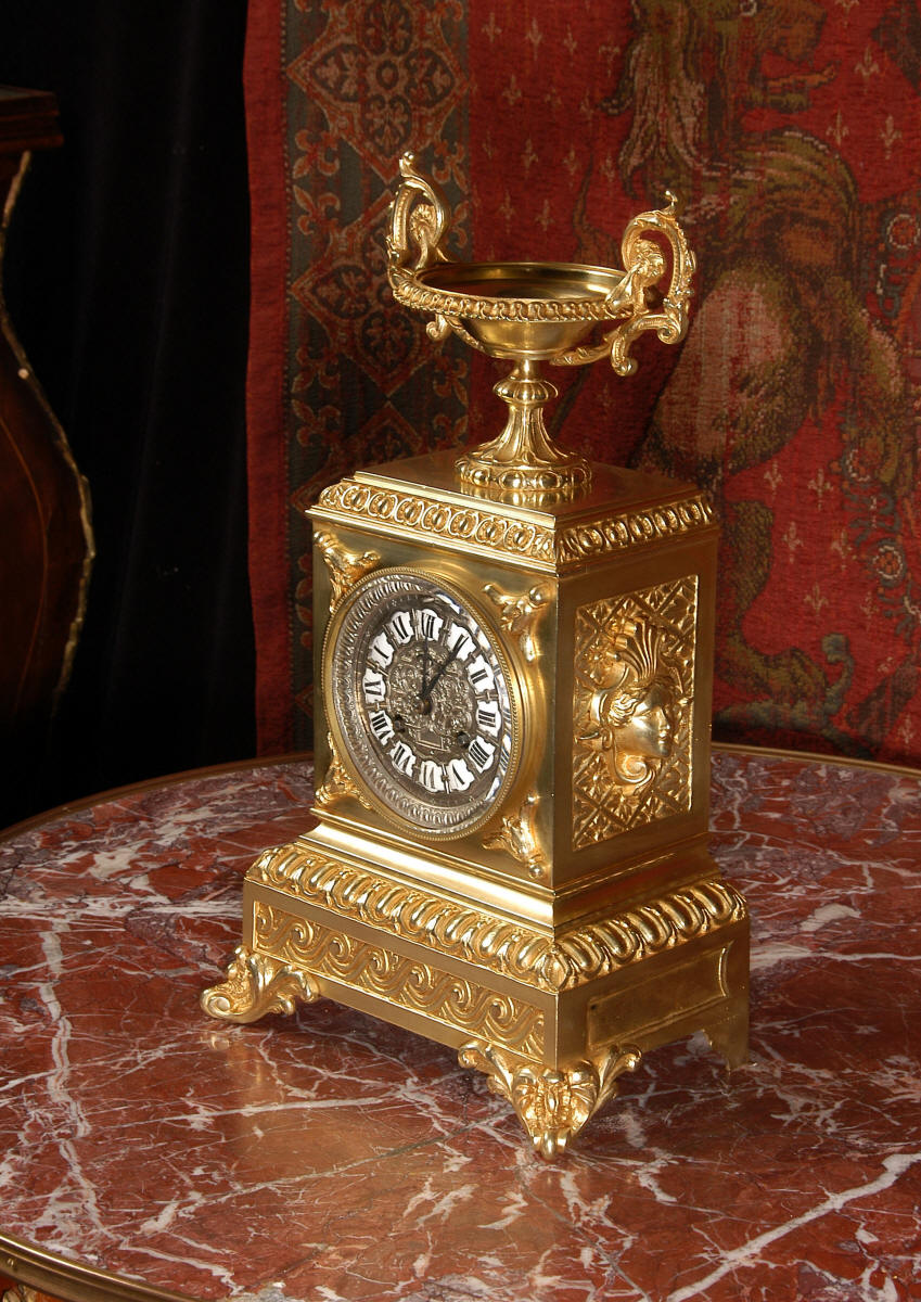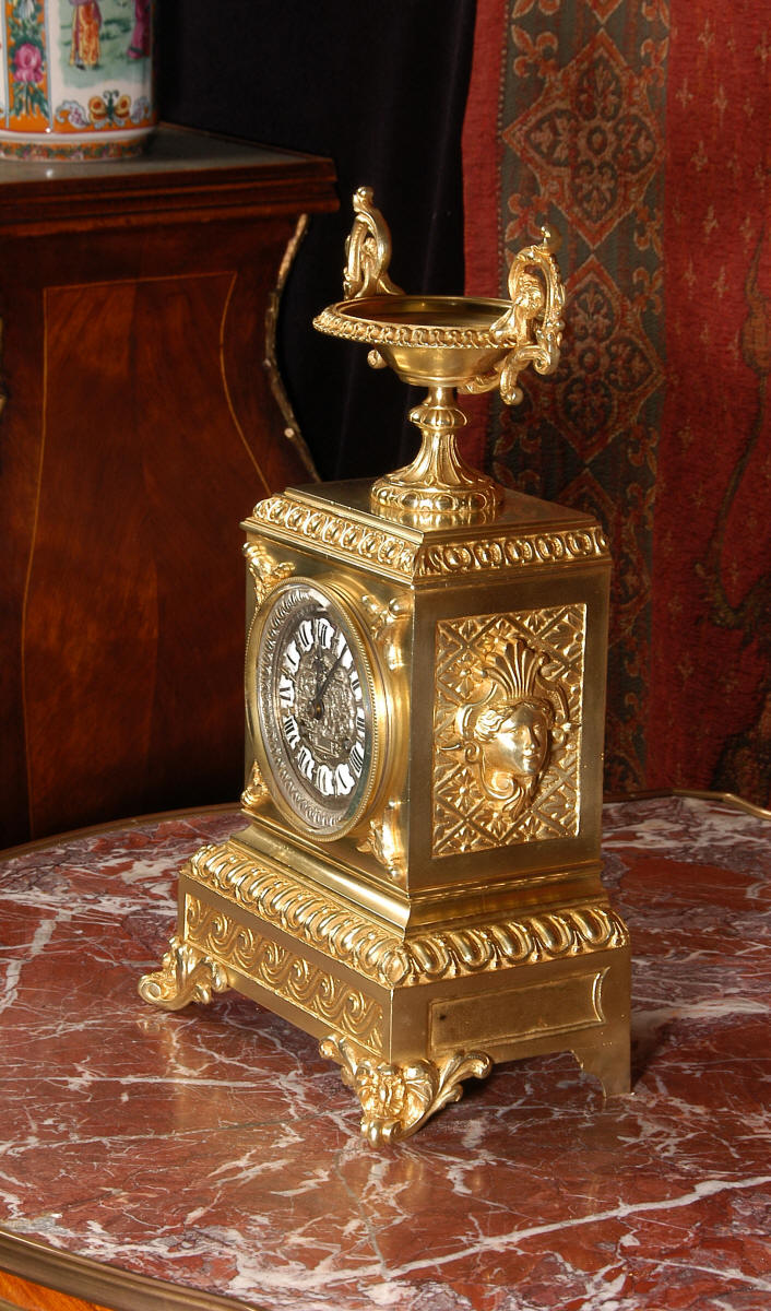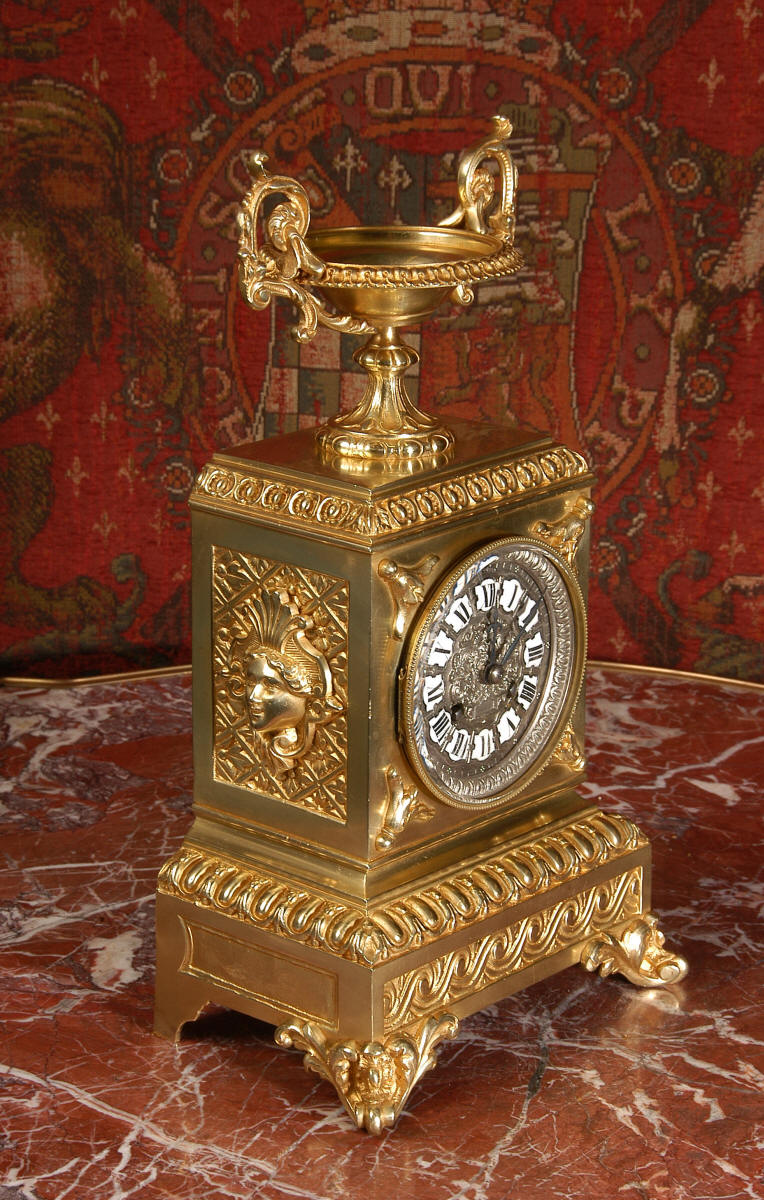 ~ French - Circa 1890 ~ ~~ Excellent condition, fully overhauled ~~ A stunning brass table or bracket clock. Classical in style, with ornate goddess masks and and a large handled urn to the top. The case has incised decoration and sits on substantial acanthus scroll feet. It is restrained and chic in style, well modelled with a good finish. The dial is unusual, silvered brass mounted with 12 individual enamel cartouche numbers. It is complete with original blued steel hands and convex glass. Please scroll down for more pictures