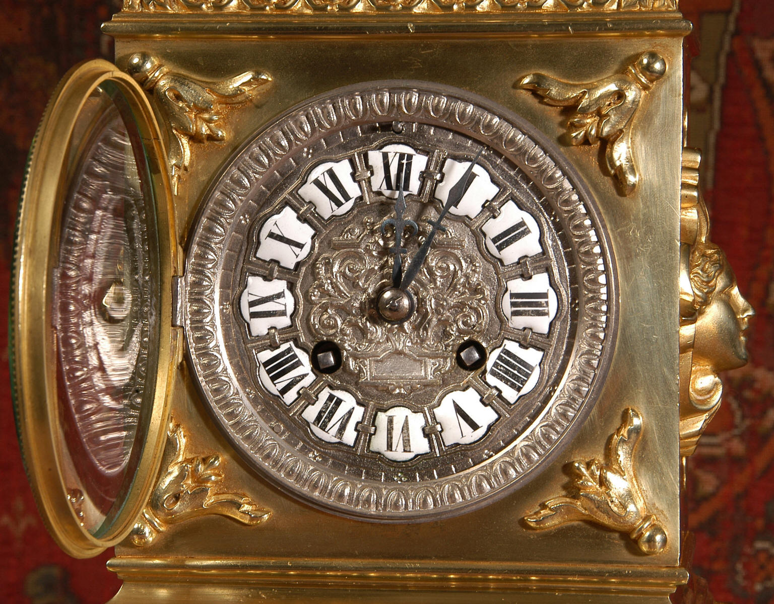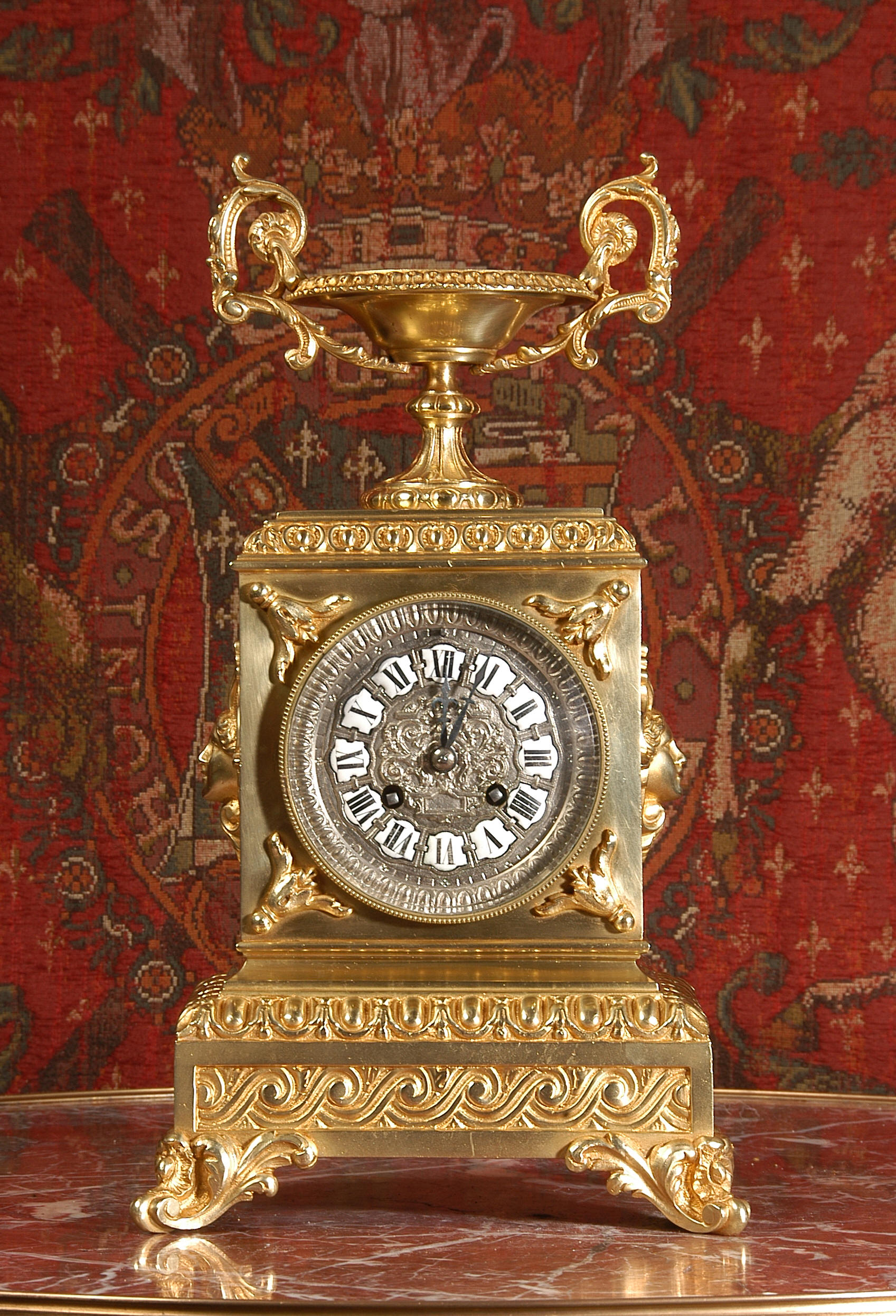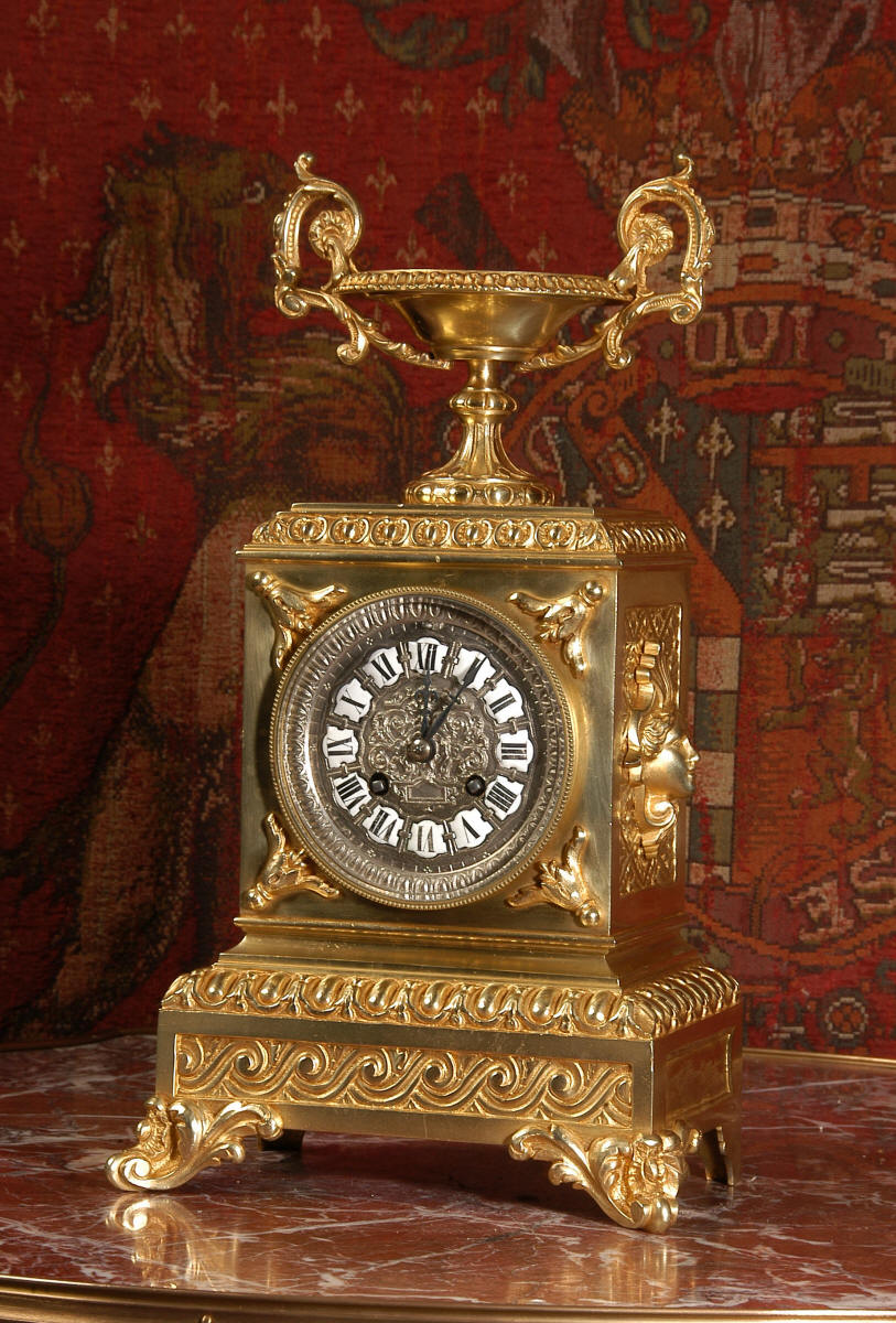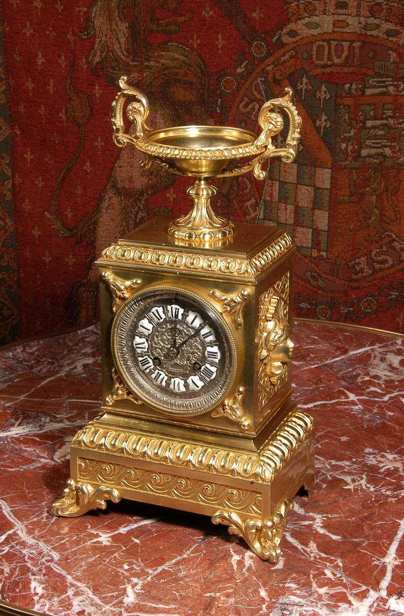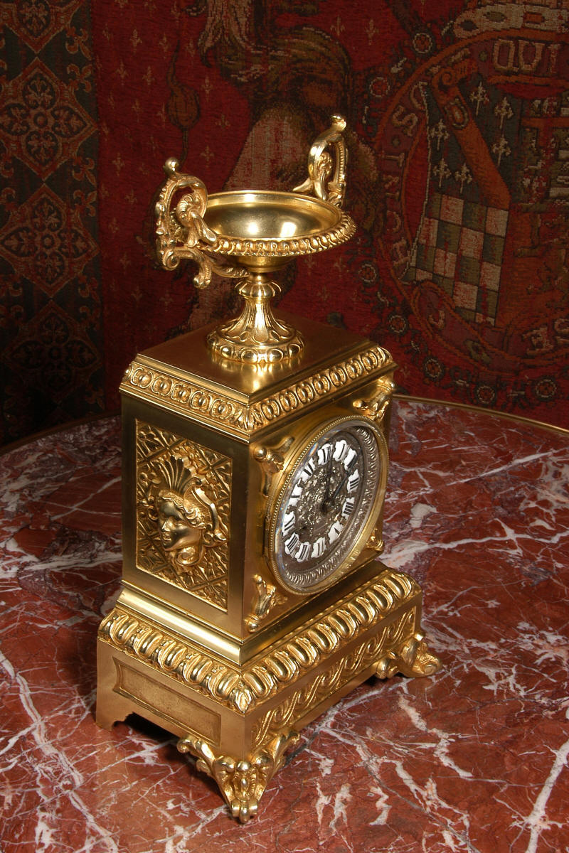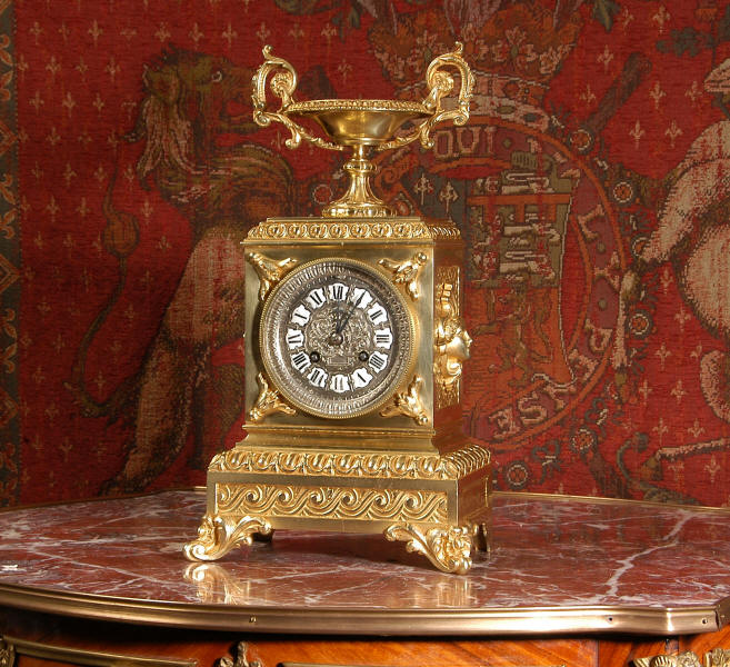 ~ French - Circa 1890 ~ ~~ Excellent condition, fully overhauled ~~ A stunning brass table or bracket clock. Classical in style, with ornate goddess masks and and a large handled urn to the top. The case has incised decoration and sits on substantial acanthus scroll feet. It is restrained and chic in style, well modelled with a good finish. The dial is unusual, silvered brass mounted with 12 individual enamel cartouche numbers. It is complete with original blued steel hands and convex glass. Please scroll down for more pictures