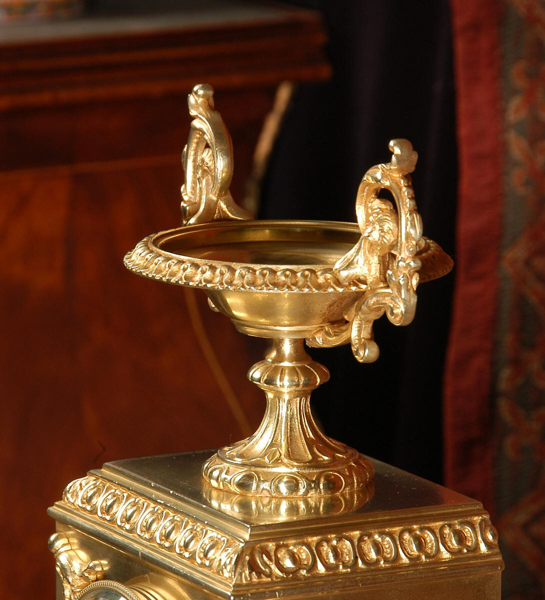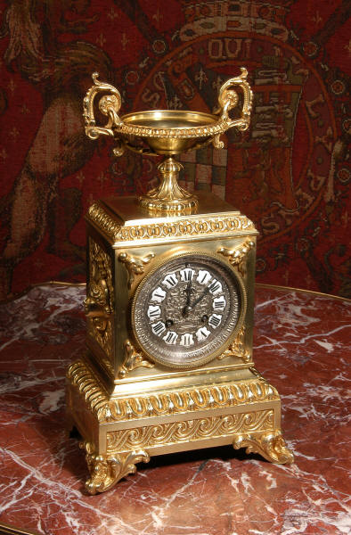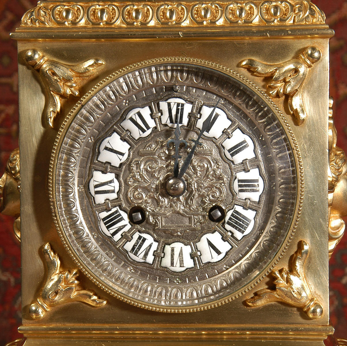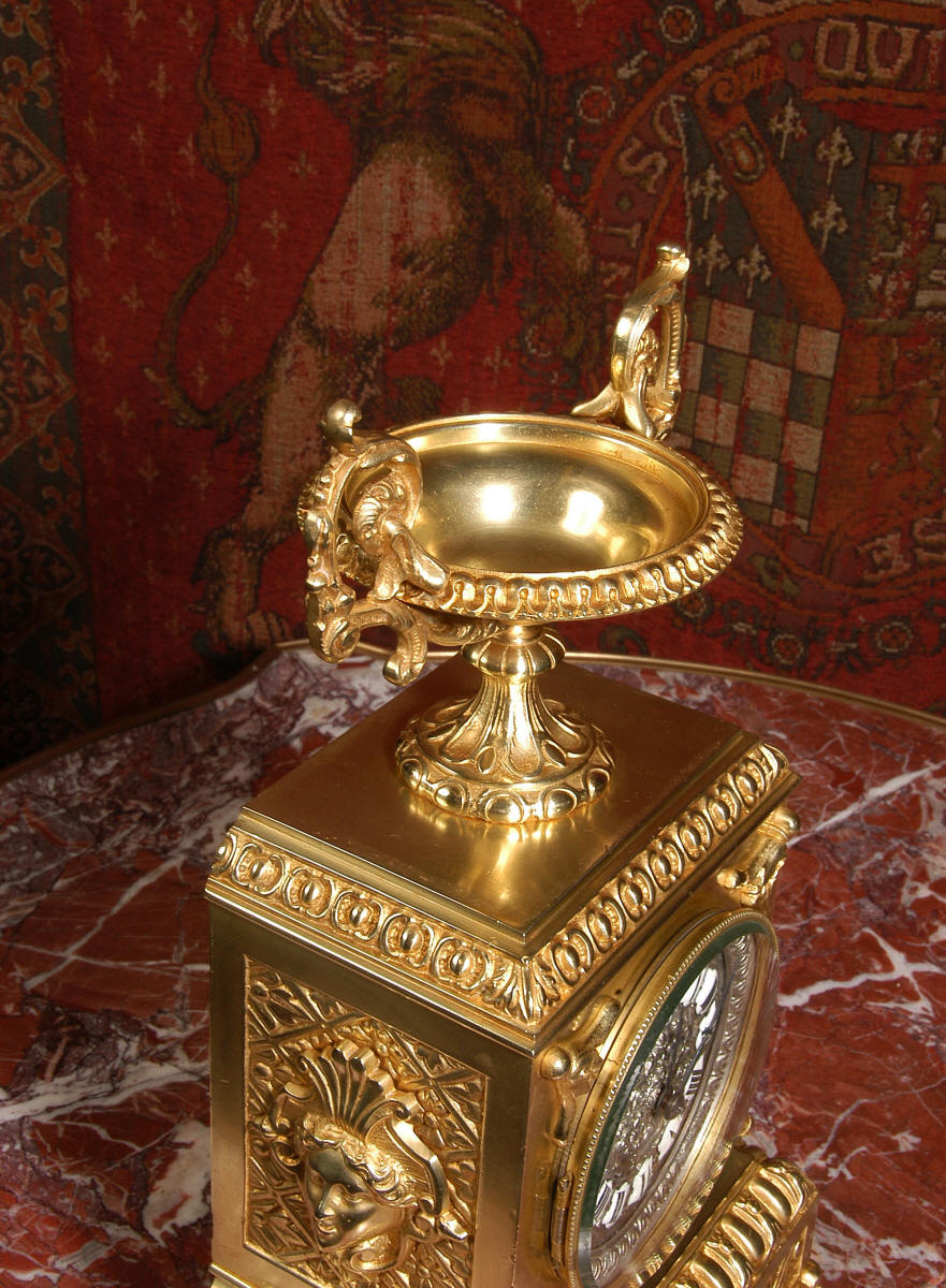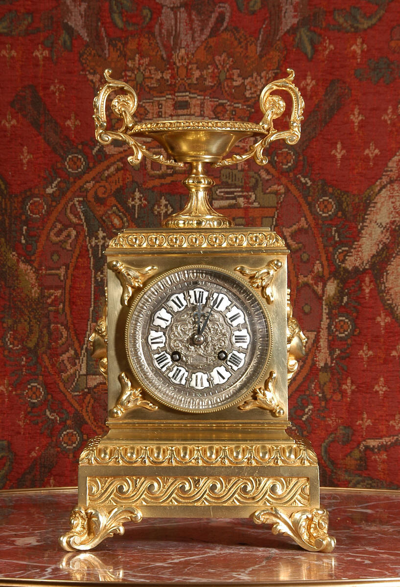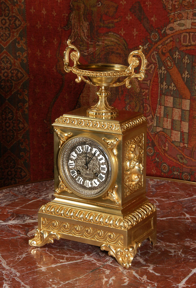 ~ French - Circa 1890 ~ ~~ Excellent condition, fully overhauled ~~ A stunning brass table or bracket clock. Classical in style, with ornate goddess masks and and a large handled urn to the top. The case has incised decoration and sits on substantial acanthus scroll feet. It is restrained and chic in style, well modelled with a good finish. The dial is unusual, silvered brass mounted with 12 individual enamel cartouche numbers. It is complete with original blued steel hands and convex glass. Please scroll down for more pictures
