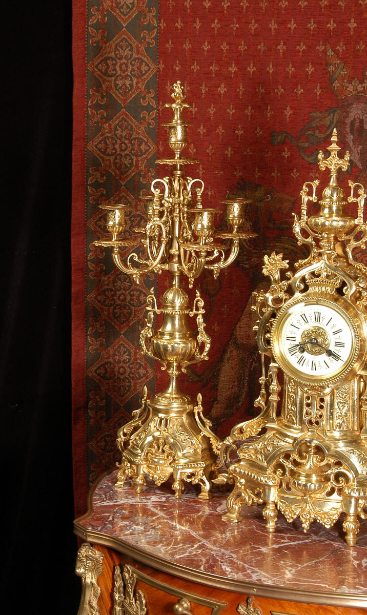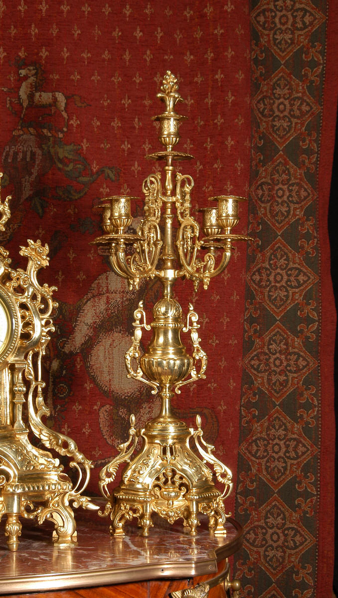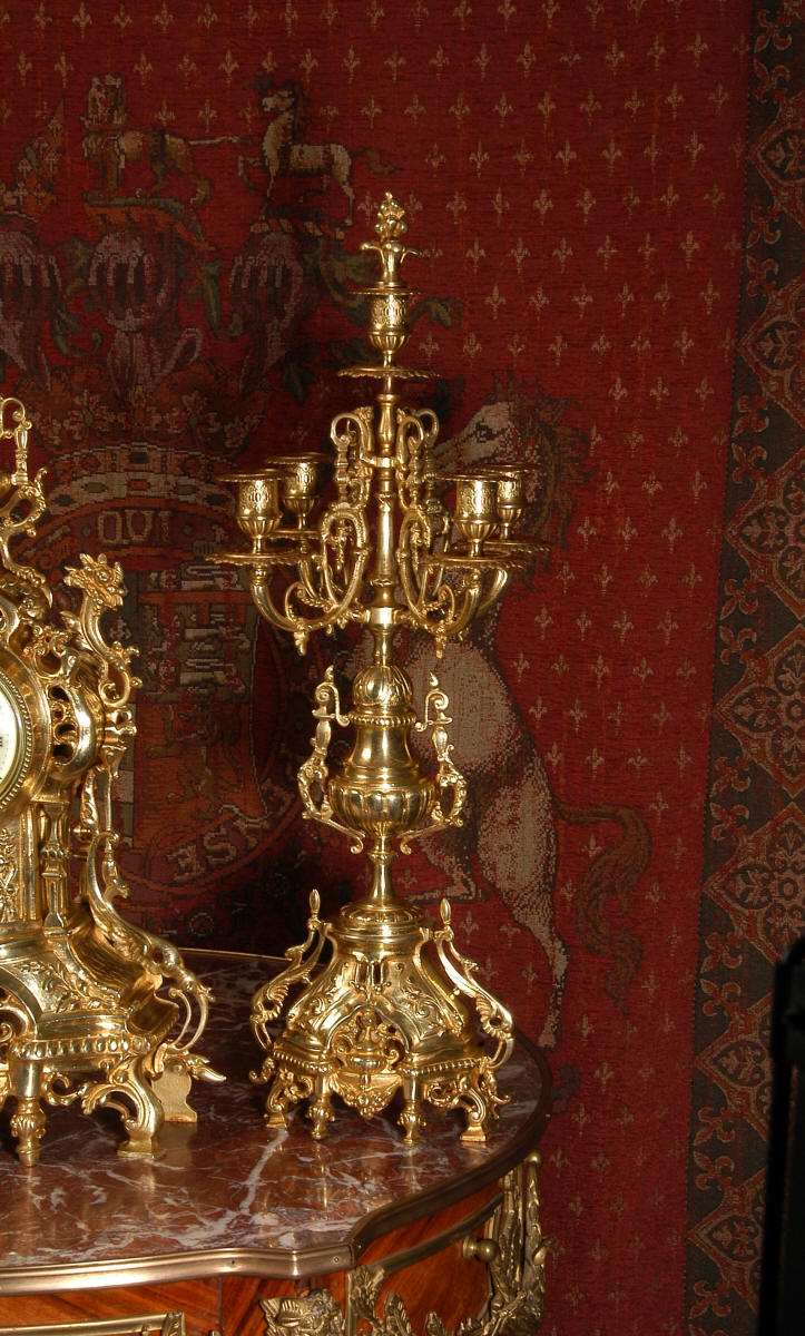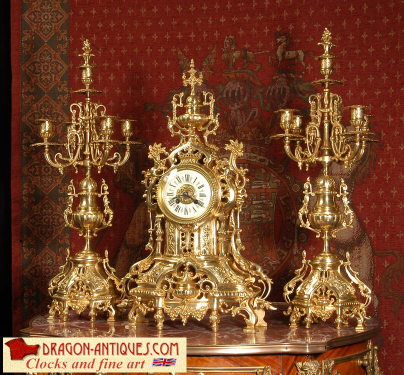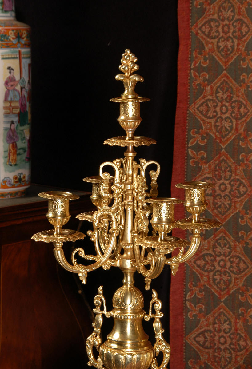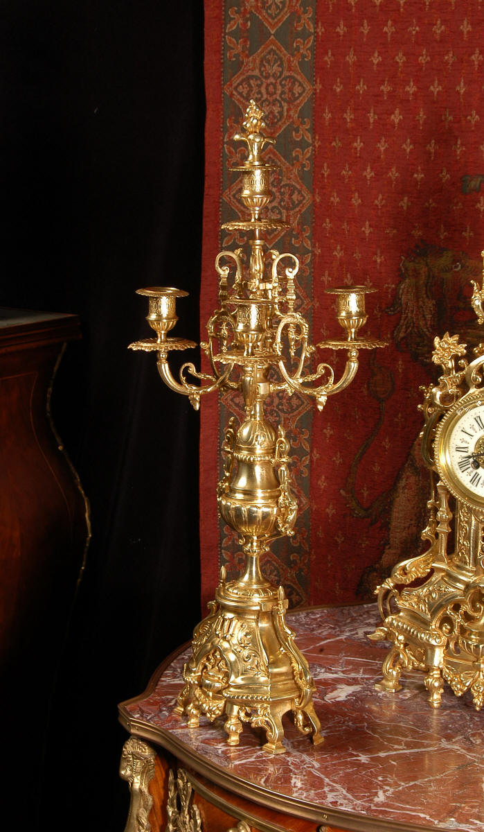 Dial is enamel on copper with a brass centre and is complete with the original blued steel hands. The Paris retailer's mark is on the dial. Hobnail bezel is glazed with convex, bevelled glass. Candelabra are modelled all around and the back of the clock is decorated; the set looks great viewed from all sides and could be displayed on a table in the centre a room. The French movement is of excellent quality and has the retailers mark on the movement backplate. It runs for 8 days, striking the hours and halves on a bell. We have replaced the missing pendulum with one faithful to the original design. Our clockmaker has fully overhauled the movement, fitted two fresh springs and test run it until satisfied of trouble free running; it is in excellent clean and running condition. The video clip below show the clock running and striking! CCondition of the case is very good with a bright and clean finish, there is some minor wear and some tarnish in places; the set displays very well as you can see in the pictures below. The dial is in excellent condition with no major chips or scratches, just some very light chips around the winding holes and a couple of faint hairlines. The candelabra arms are very slightly distorted Complete with pendulum, bell and a suitable key. Full setting up instructions supplied if required.
