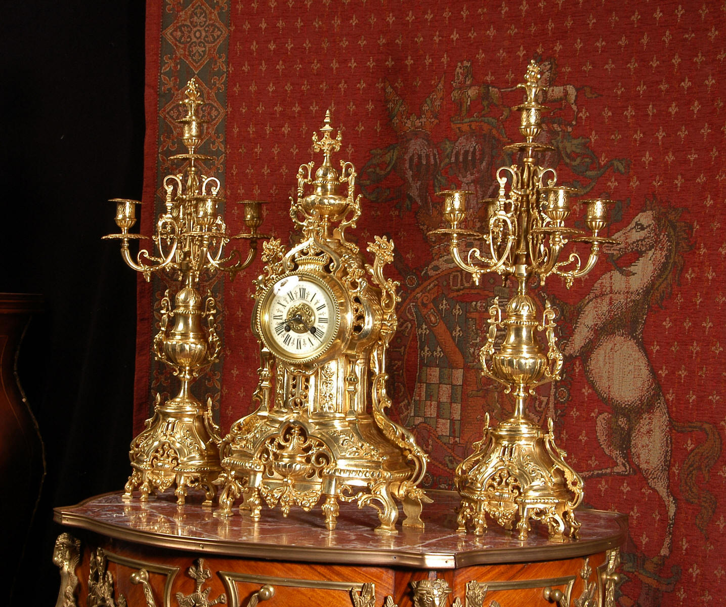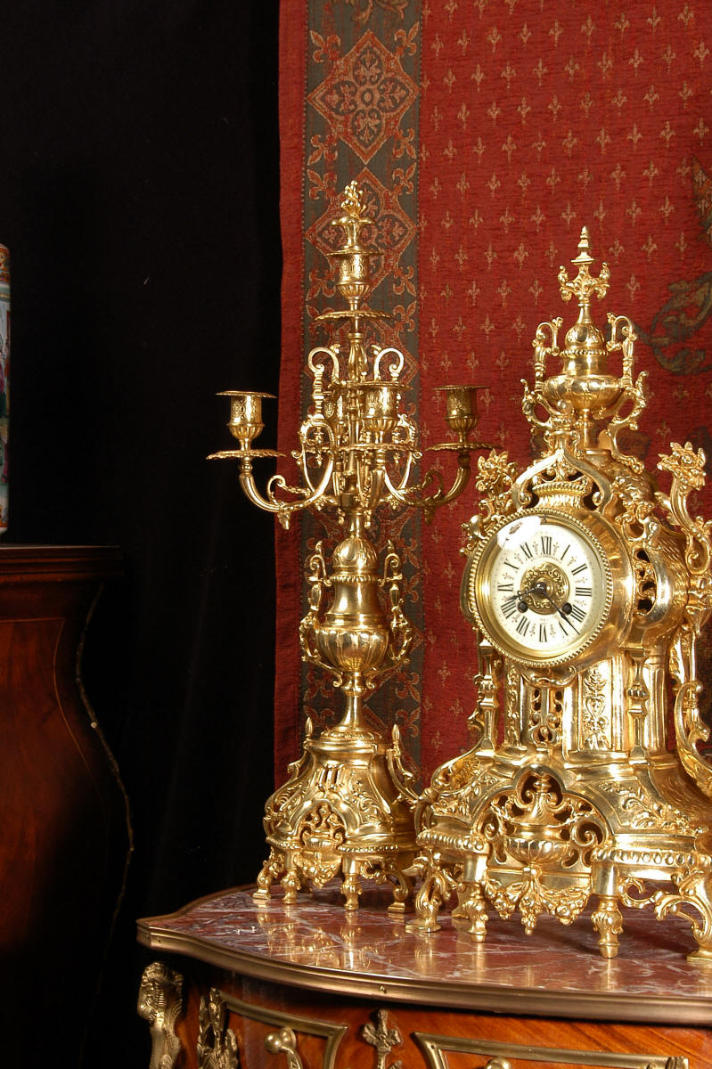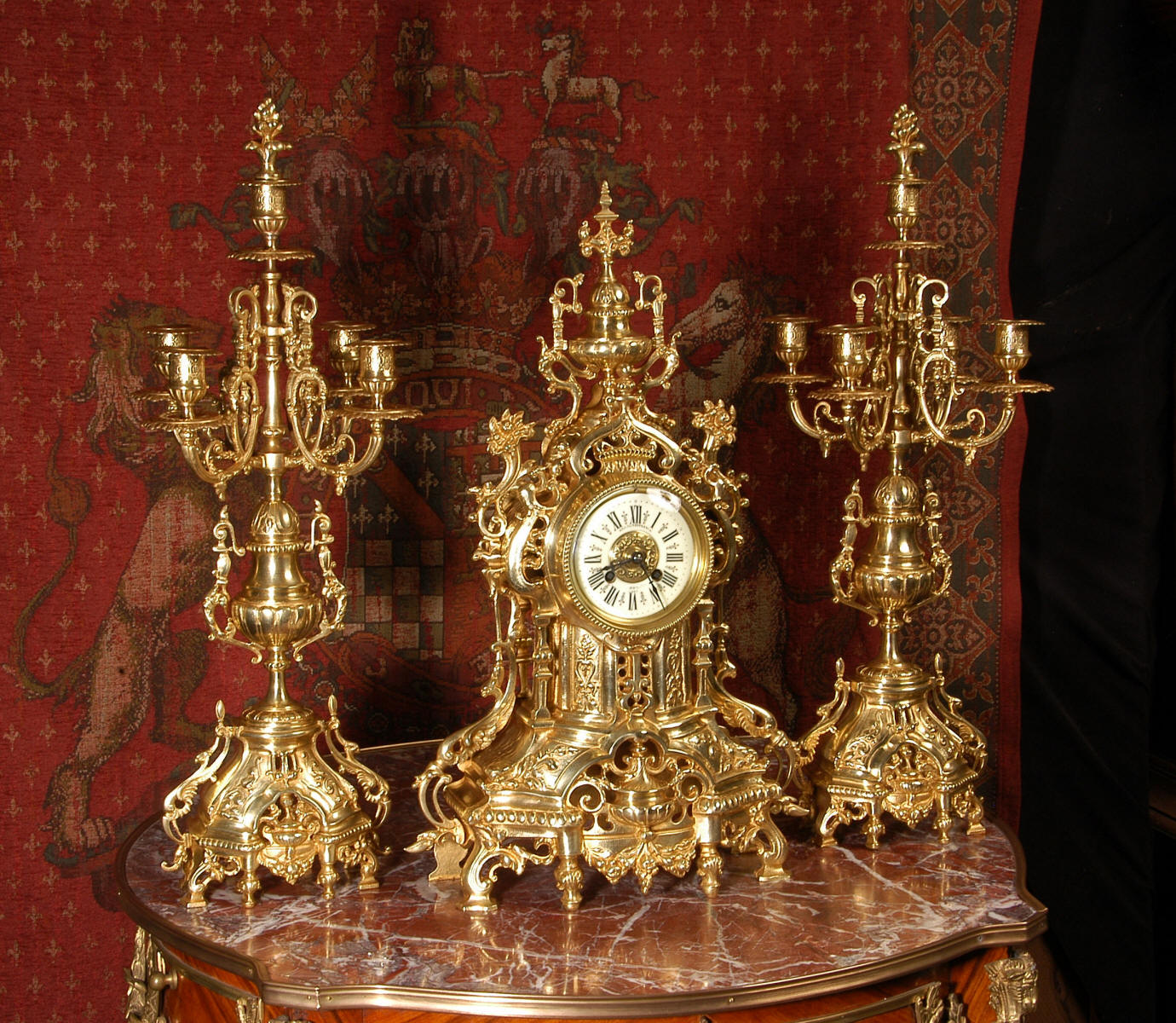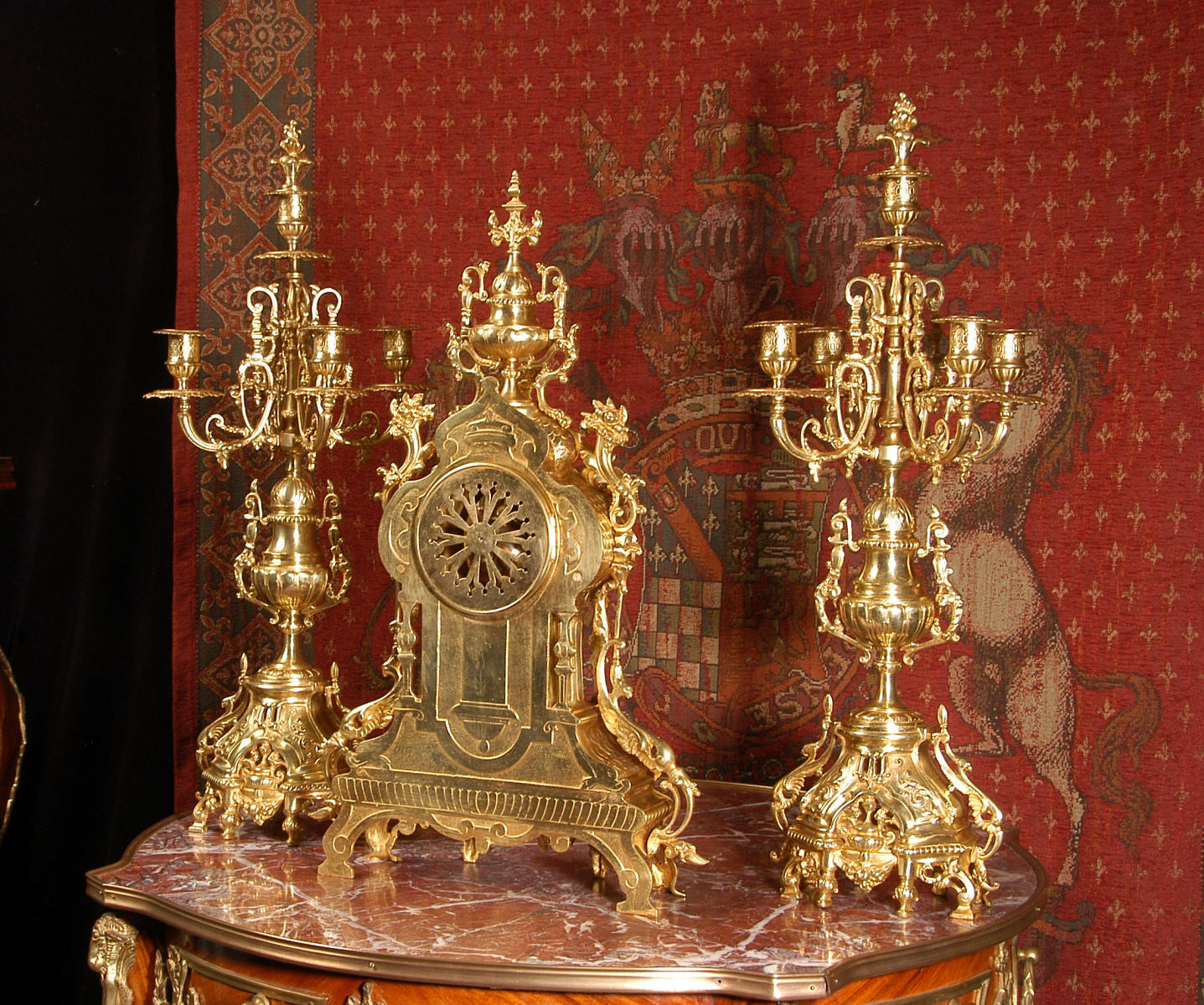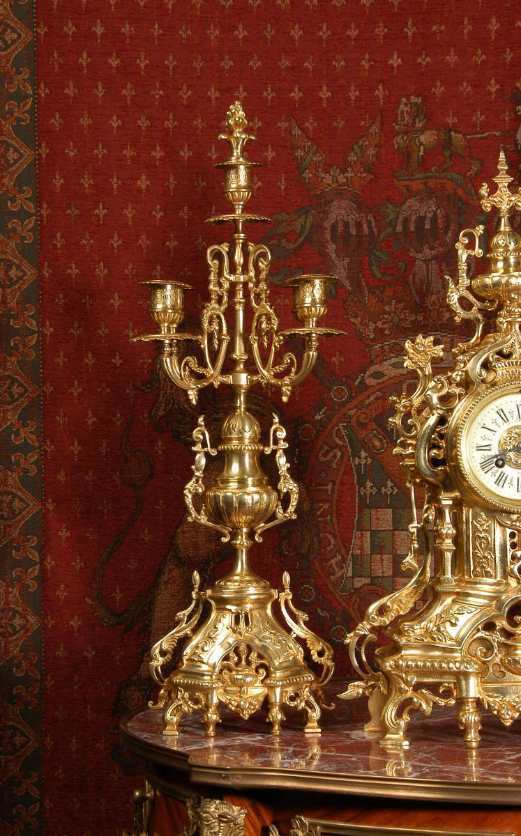 Dial is enamel on copper with a brass centre and is complete with the original blued steel hands. The Paris retailer's mark is on the dial. Hobnail bezel is glazed with convex, bevelled glass. Candelabra are modelled all around and the back of the clock is decorated; the set looks great viewed from all sides and could be displayed on a table in the centre a room. The French movement is of excellent quality and has the retailers mark on the movement backplate. It runs for 8 days, striking the hours and halves on a bell. We have replaced the missing pendulum with one faithful to the original design. Our clockmaker has fully overhauled the movement, fitted two fresh springs and test run it until satisfied of trouble free running; it is in excellent clean and running condition. The video clip below show the clock running and striking! CCondition of the case is very good with a bright and clean finish, there is some minor wear and some tarnish in places; the set displays very well as you can see in the pictures below. The dial is in excellent condition with no major chips or scratches, just some very light chips around the winding holes and a couple of faint hairlines. The candelabra arms are very slightly distorted Complete with pendulum, bell and a suitable key. Full setting up instructions supplied if required.
