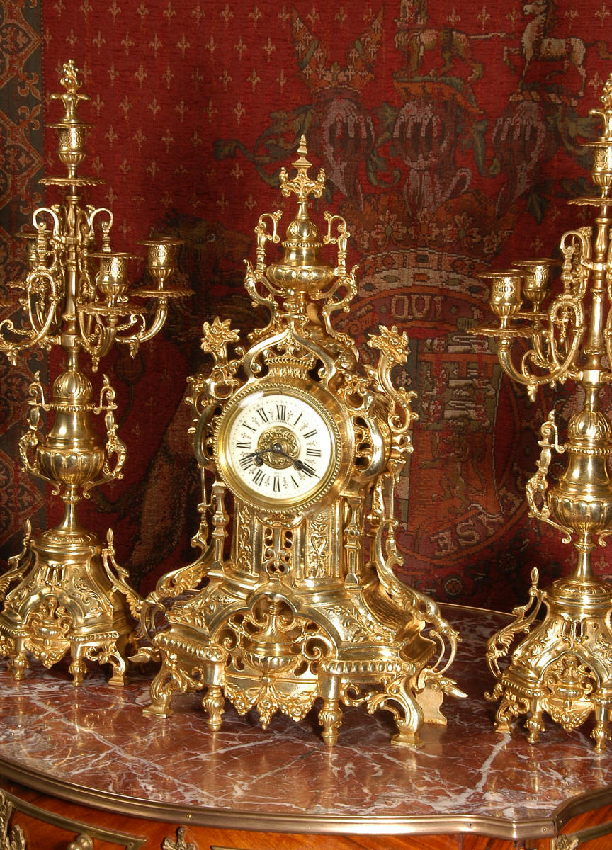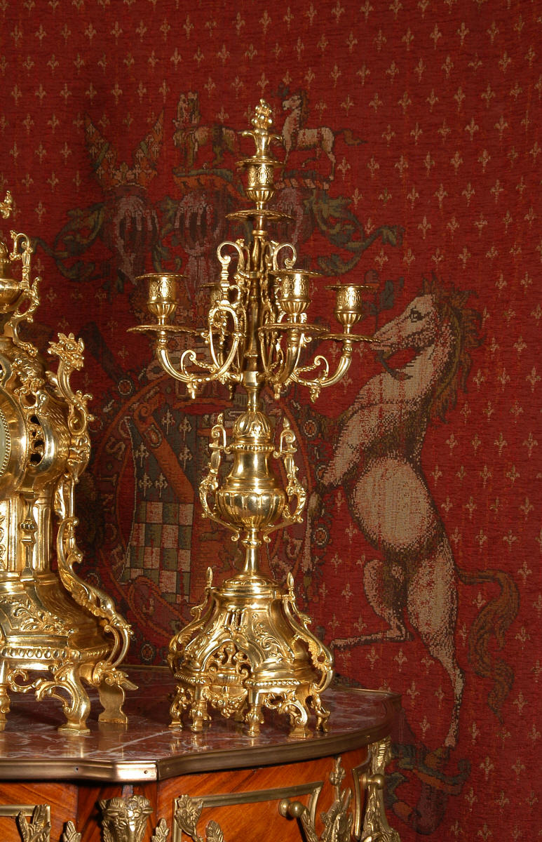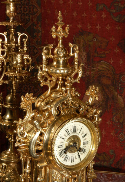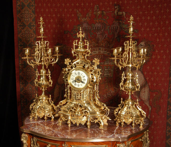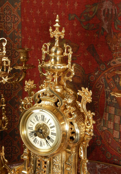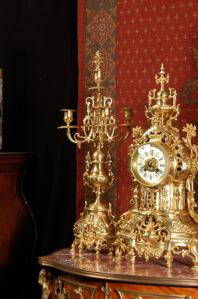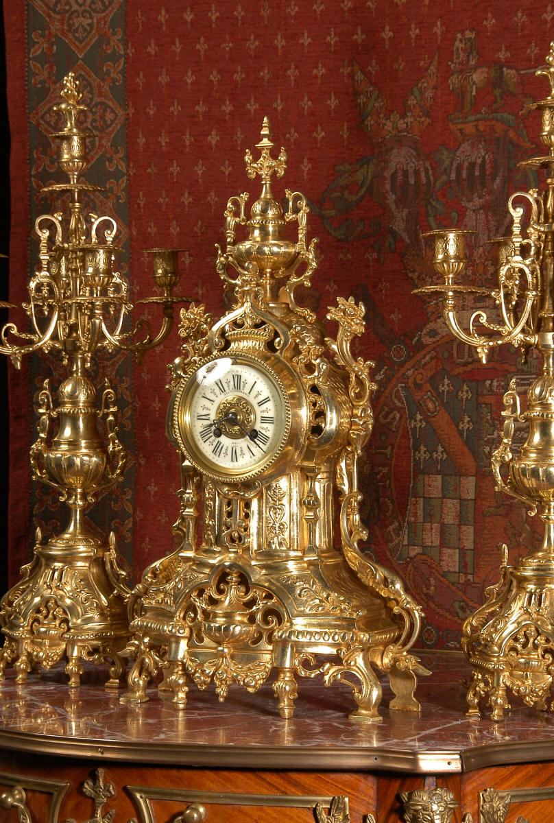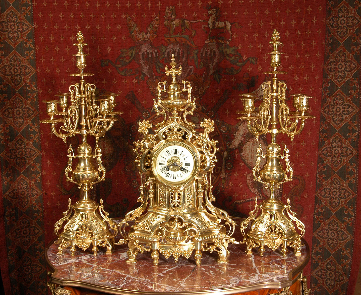 Dial is enamel on copper with a brass centre and is complete with the original blued steel hands. The Paris retailer's mark is on the dial. Hobnail bezel is glazed with convex, bevelled glass. Candelabra are modelled all around and the back of the clock is decorated; the set looks great viewed from all sides and could be displayed on a table in the centre a room. The French movement is of excellent quality and has the retailers mark on the movement backplate. It runs for 8 days, striking the hours and halves on a bell. We have replaced the missing pendulum with one faithful to the original design. Our clockmaker has fully overhauled the movement, fitted two fresh springs and test run it until satisfied of trouble free running; it is in excellent clean and running condition. The video clip below show the clock running and striking! CCondition of the case is very good with a bright and clean finish, there is some minor wear and some tarnish in places; the set displays very well as you can see in the pictures below. The dial is in excellent condition with no major chips or scratches, just some very light chips around the winding holes and a couple of faint hairlines. The candelabra arms are very slightly distorted Complete with pendulum, bell and a suitable key. Full setting up instructions supplied if required.