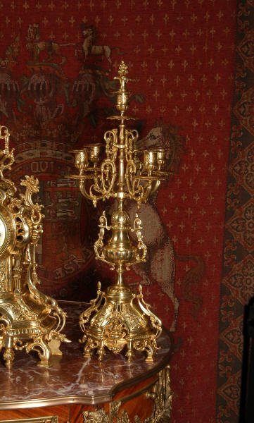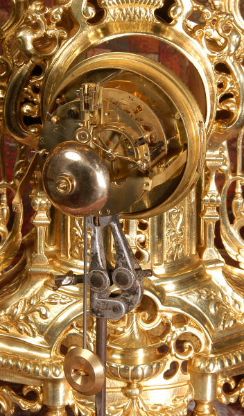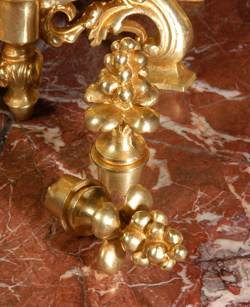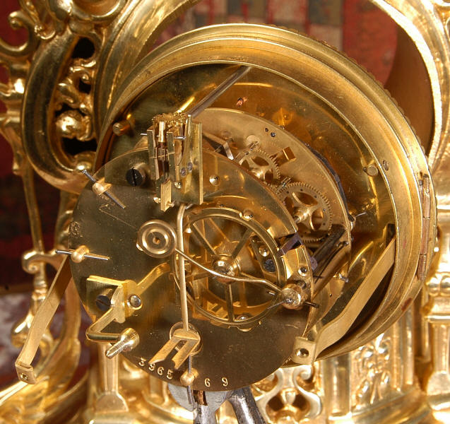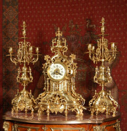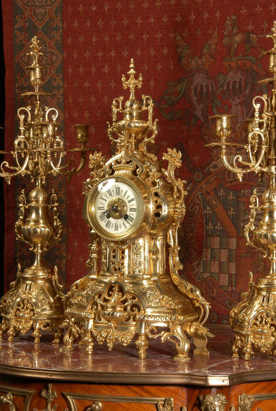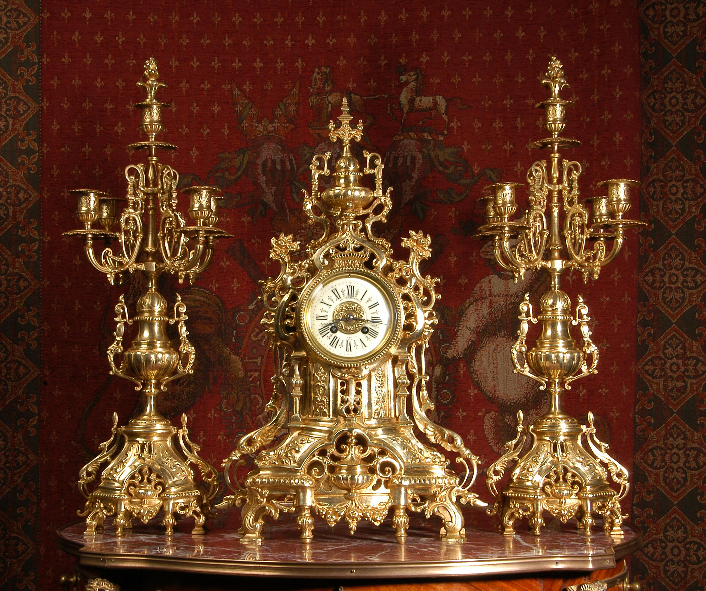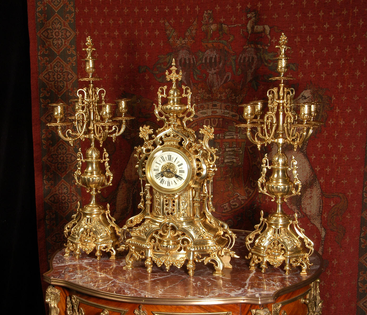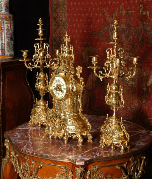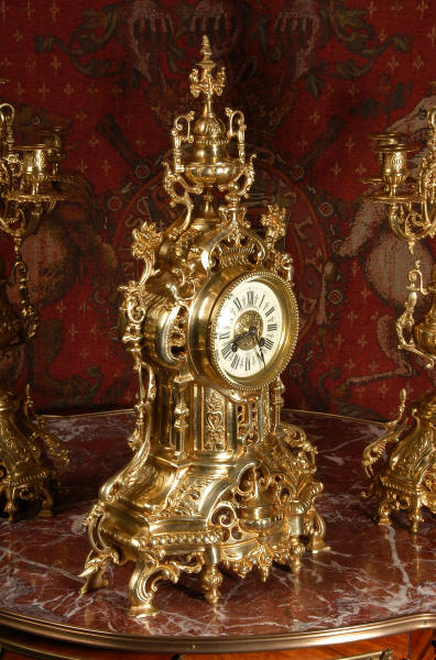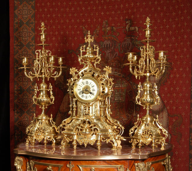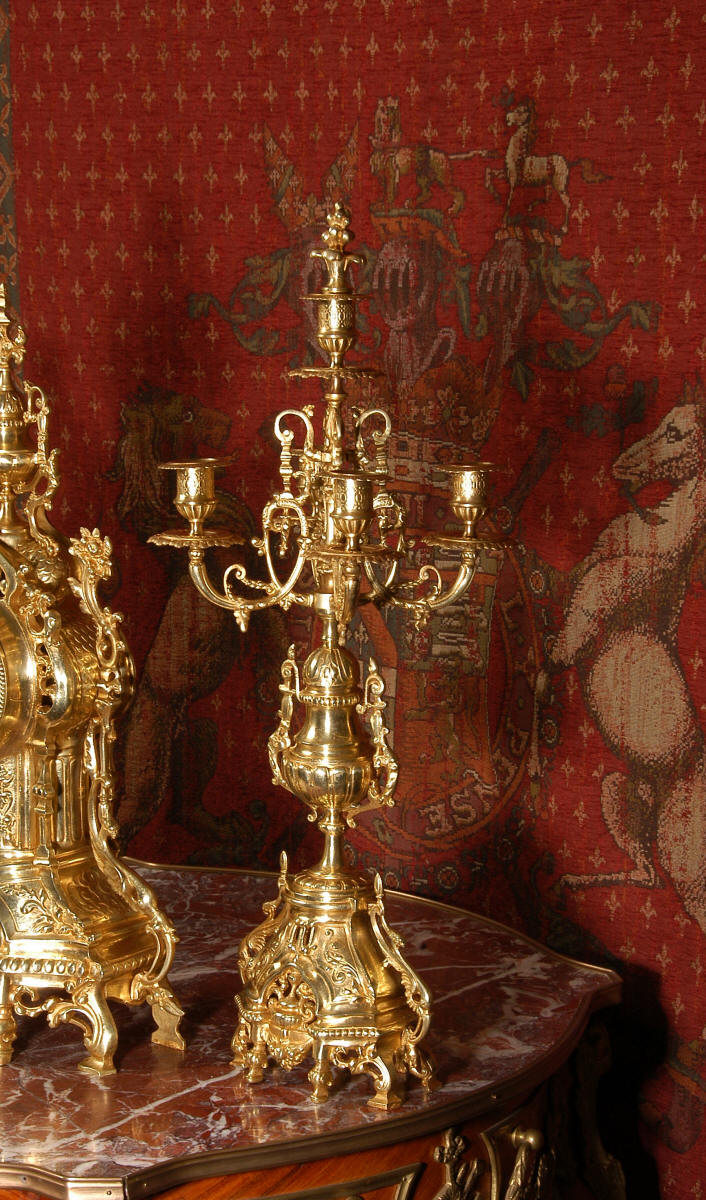 Dial is enamel on copper with a brass centre and is complete with the original blued steel hands. The Paris retailer's mark is on the dial. Hobnail bezel is glazed with convex, bevelled glass. Candelabra are modelled all around and the back of the clock is decorated; the set looks great viewed from all sides and could be displayed on a table in the centre a room. The French movement is of excellent quality and has the retailers mark on the movement backplate. It runs for 8 days, striking the hours and halves on a bell. We have replaced the missing pendulum with one faithful to the original design. Our clockmaker has fully overhauled the movement, fitted two fresh springs and test run it until satisfied of trouble free running; it is in excellent clean and running condition. The video clip below show the clock running and striking! CCondition of the case is very good with a bright and clean finish, there is some minor wear and some tarnish in places; the set displays very well as you can see in the pictures below. The dial is in excellent condition with no major chips or scratches, just some very light chips around the winding holes and a couple of faint hairlines. The candelabra arms are very slightly distorted Complete with pendulum, bell and a suitable key. Full setting up instructions supplied if required.
