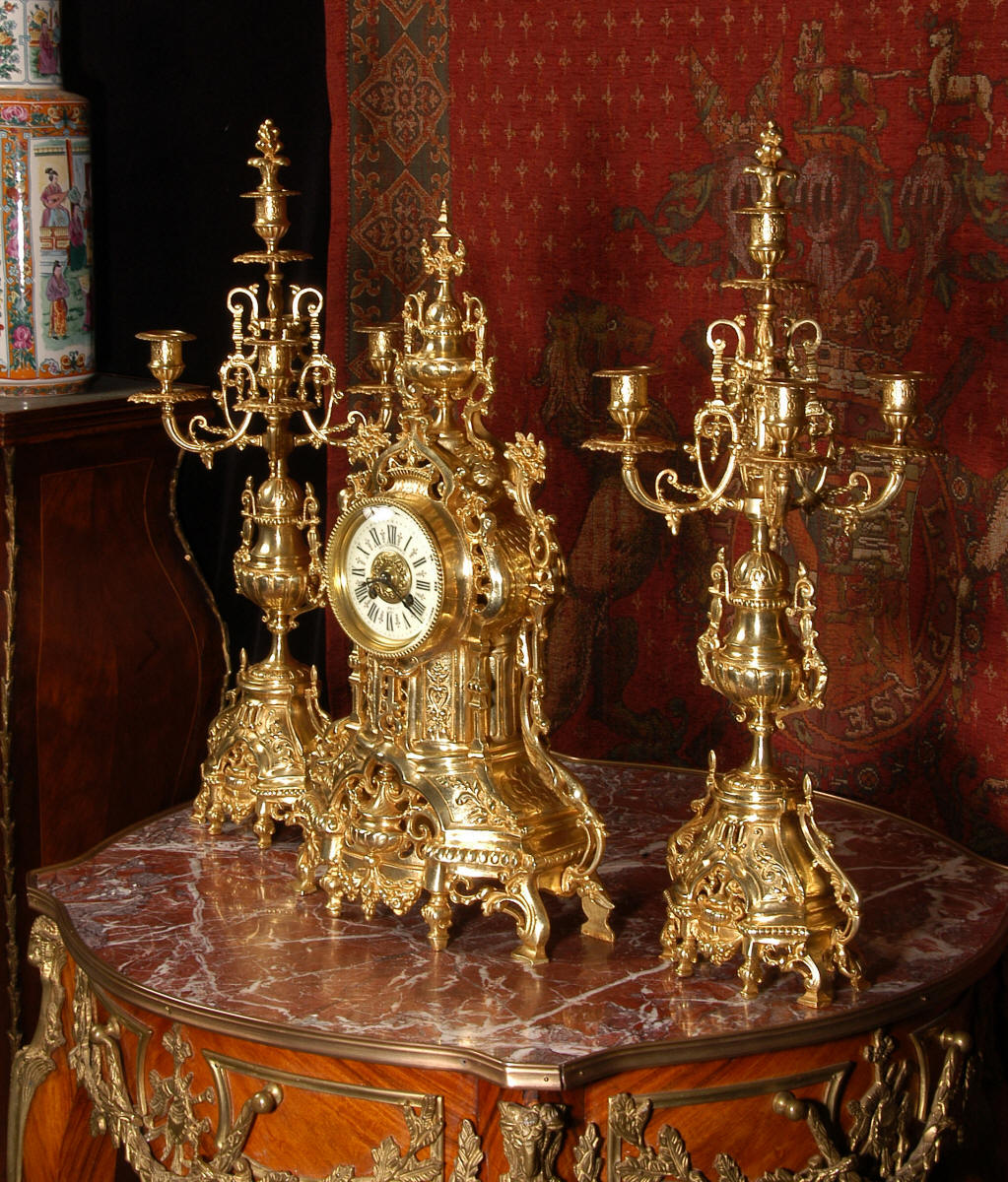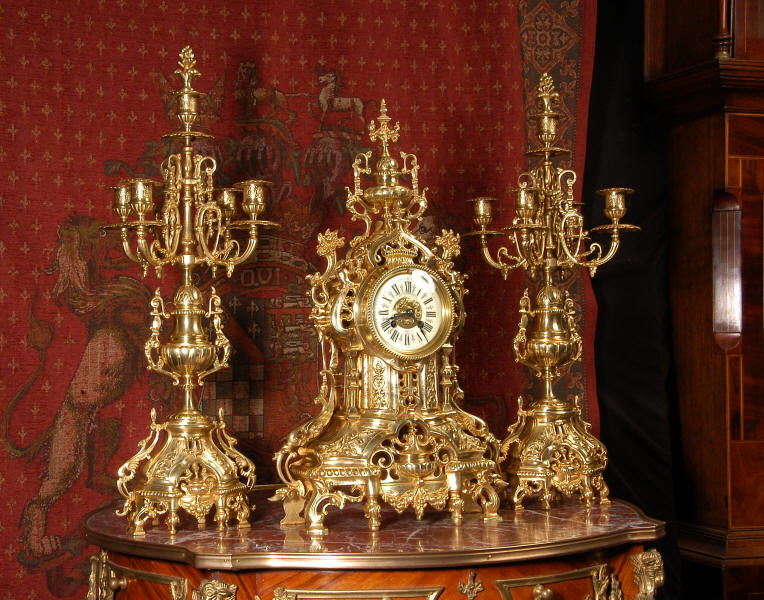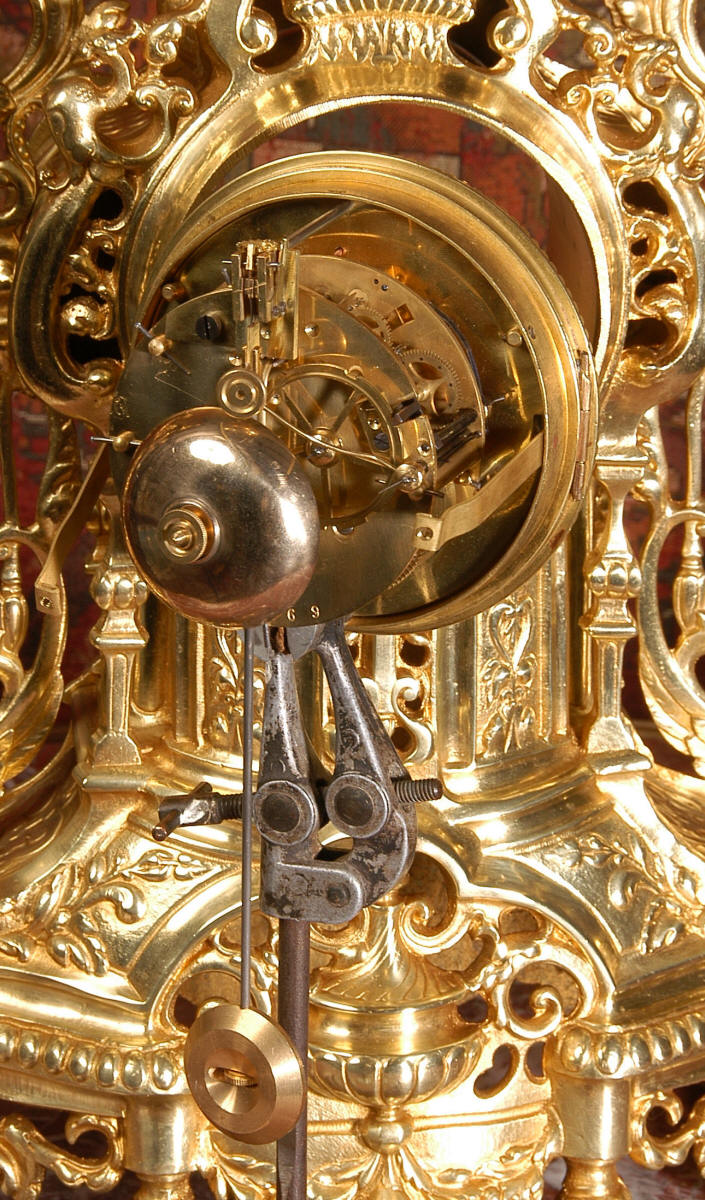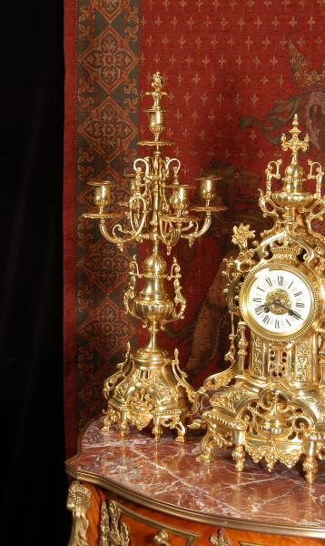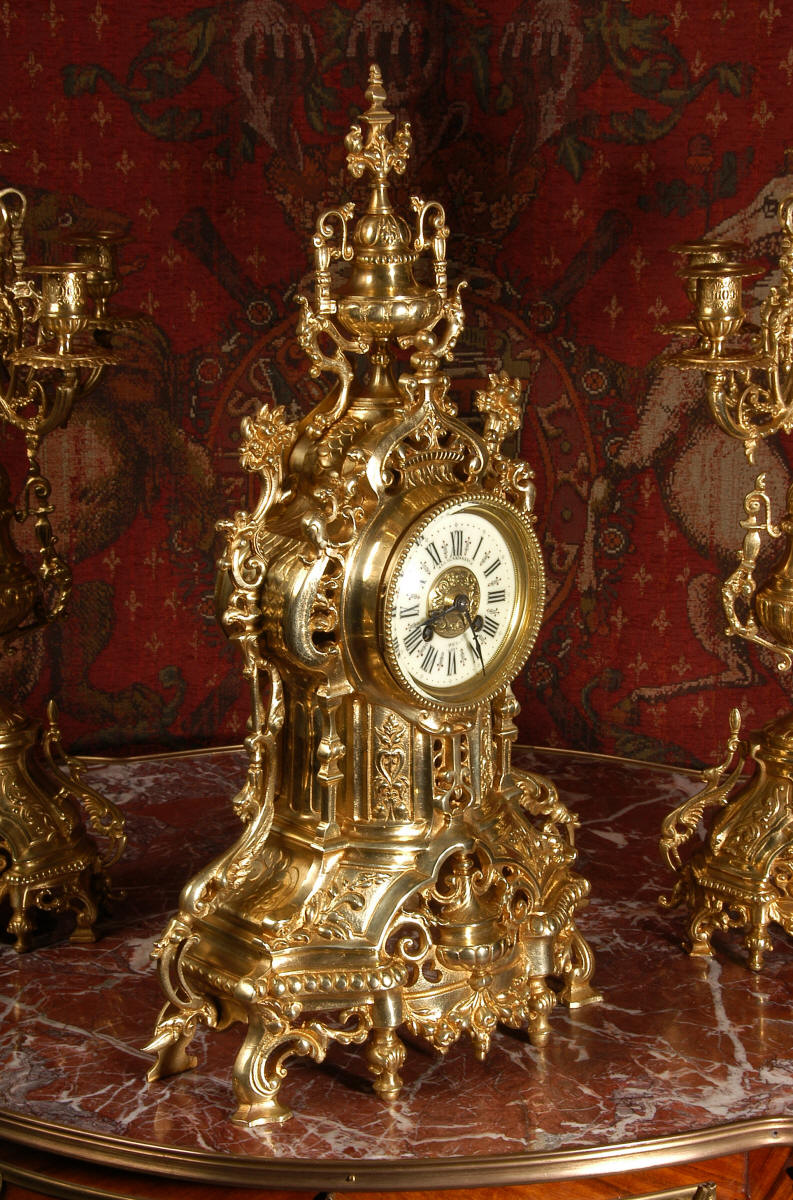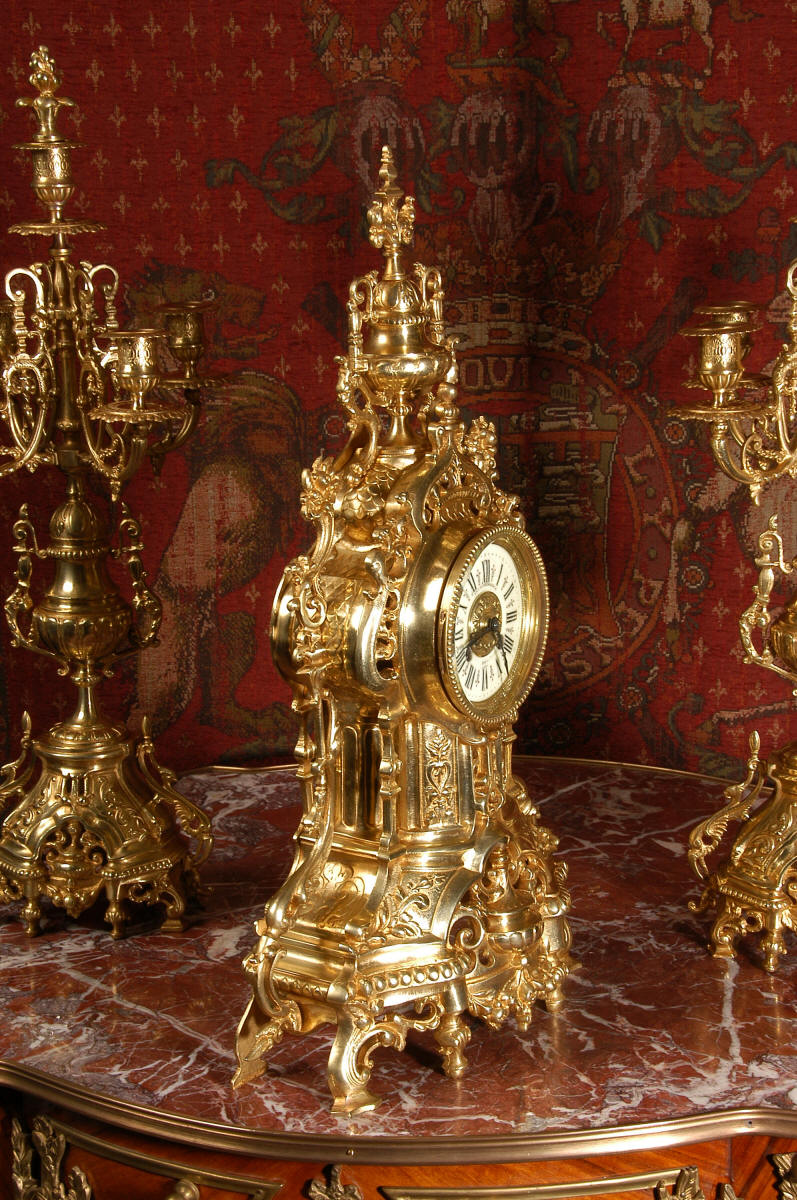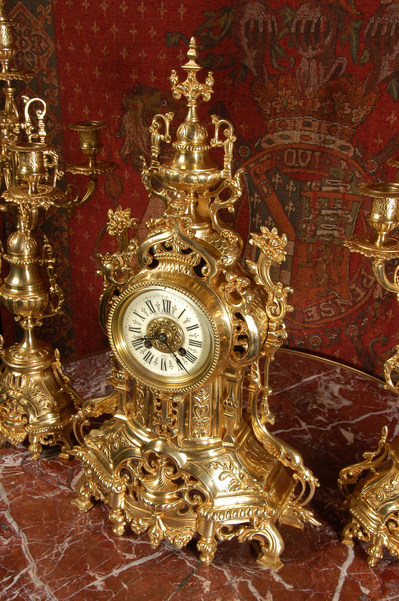 ~ French - Circa 1880 ~ ~~ bright and clean gilding, fully overhauled ~~ A large and well made original antique French clock set with modelling of high quality in gilded brass; beautifully sharp edges and crisp detail. It is in lovely condition, clean and bright gilding with very little wear. The style is French Louis XVI, it is formed as a romantic ruin with flowing foliage around pieced windows, and urns. The front of the clock is fretted to allow the pendulum to be seen swinging within. Candelabra have matching bases with urns above which are mounted the 5 light candelabra, styled as foliage. The set is complete with its pair of snuffers which sit in the central sconces as finials. This is a large heavy and impressive clock set in lovely clean and bright condition.