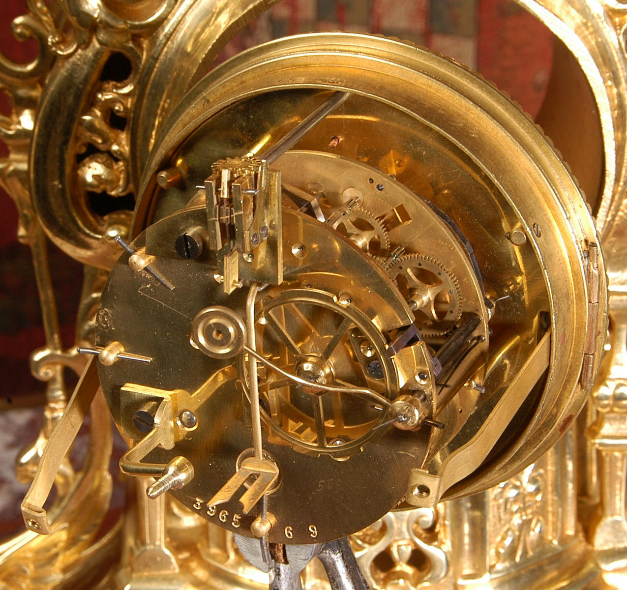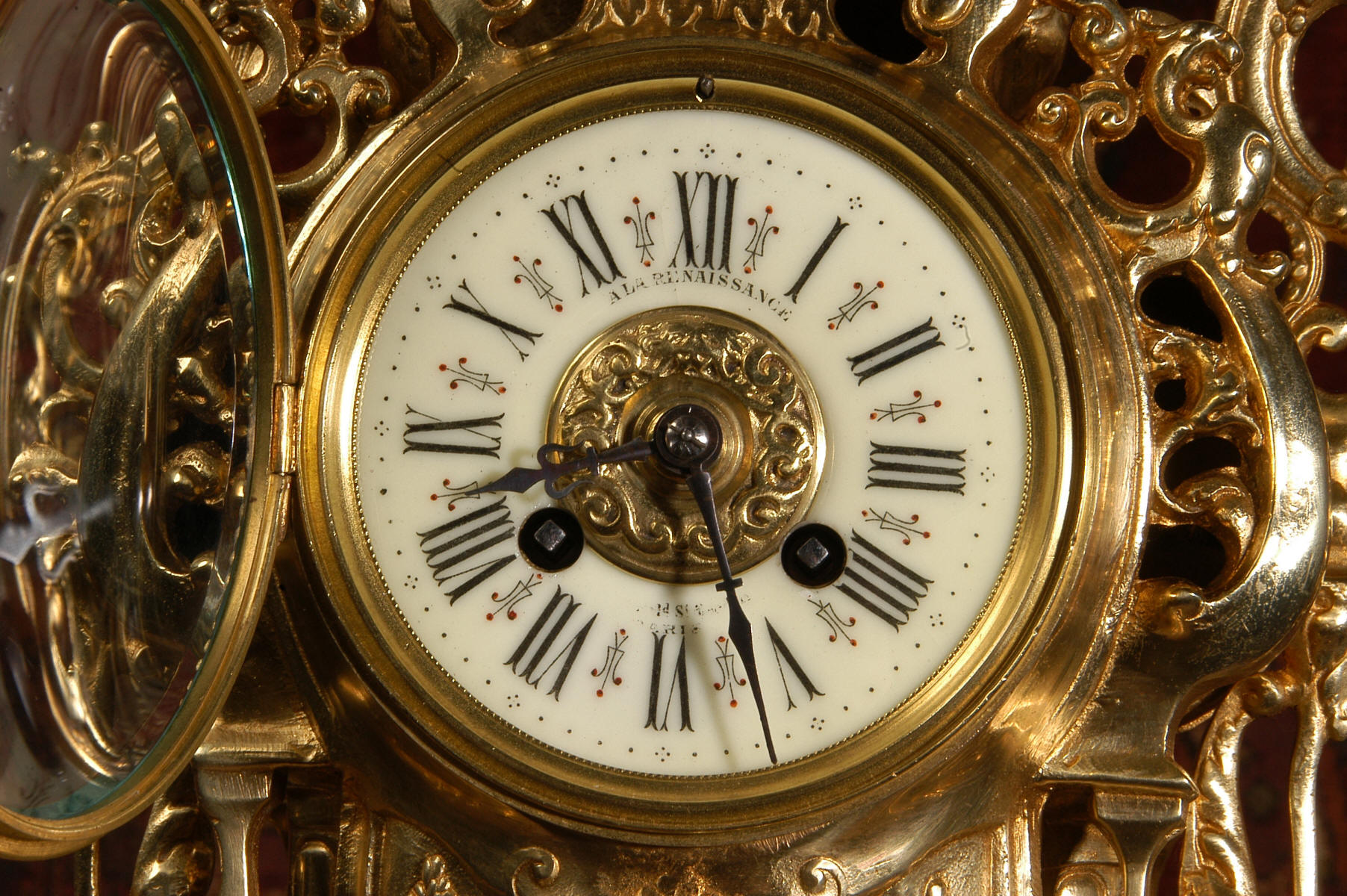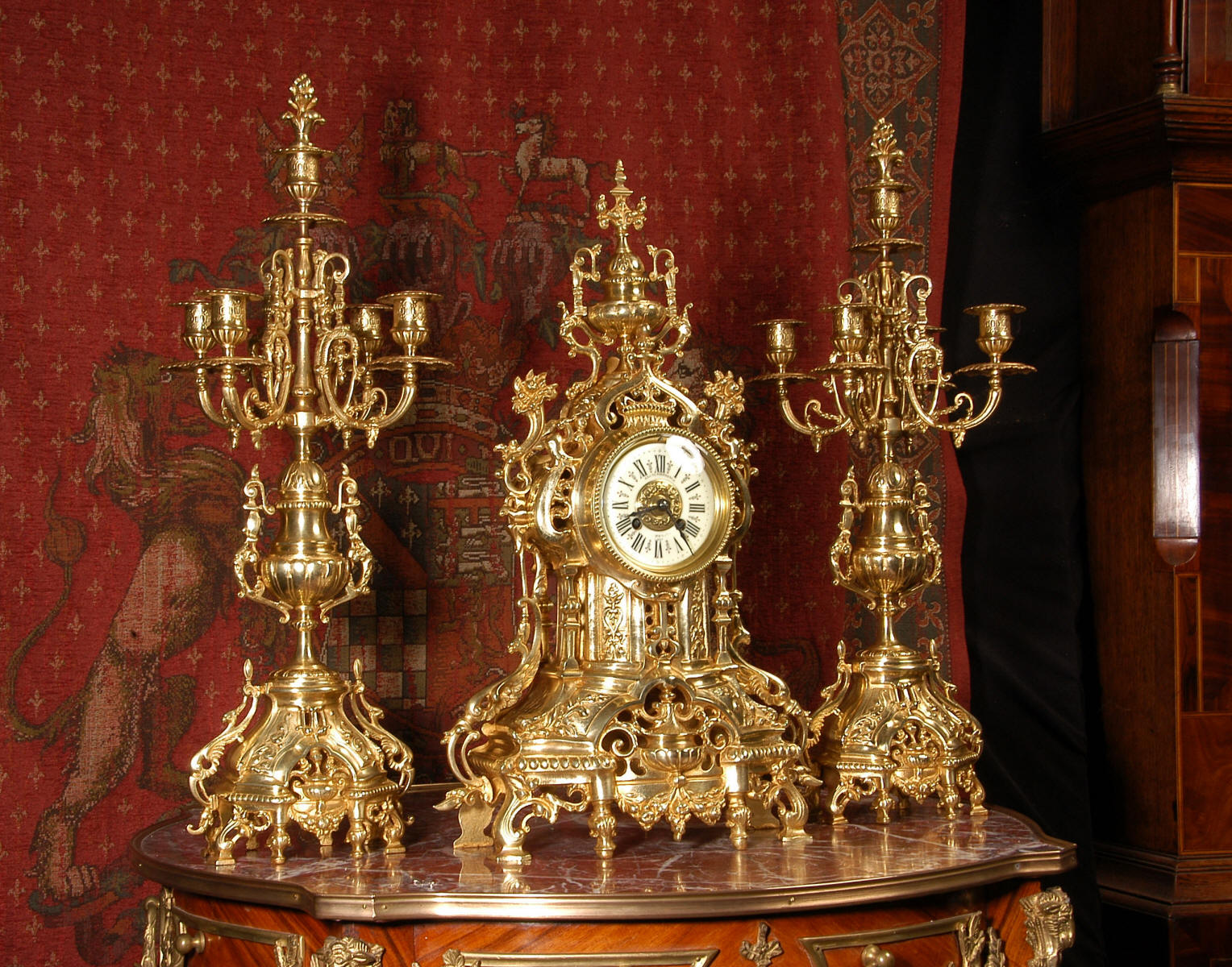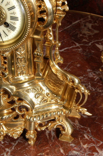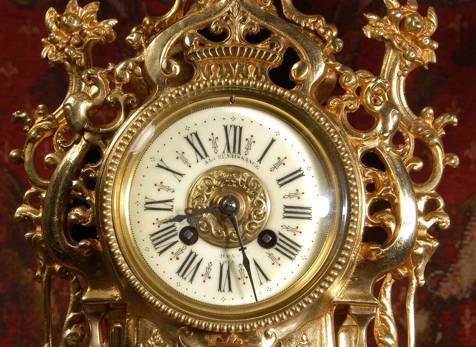 ~ French - Circa 1880 ~ ~~ bright and clean gilding, fully overhauled ~~ A large and well made original antique French clock set with modelling of high quality in gilded brass; beautifully sharp edges and crisp detail. It is in lovely condition, clean and bright gilding with very little wear. The style is French Louis XVI, it is formed as a romantic ruin with flowing foliage around pieced windows, and urns. The front of the clock is fretted to allow the pendulum to be seen swinging within. Candelabra have matching bases with urns above which are mounted the 5 light candelabra, styled as foliage. The set is complete with its pair of snuffers which sit in the central sconces as finials. This is a large heavy and impressive clock set in lovely clean and bright condition.