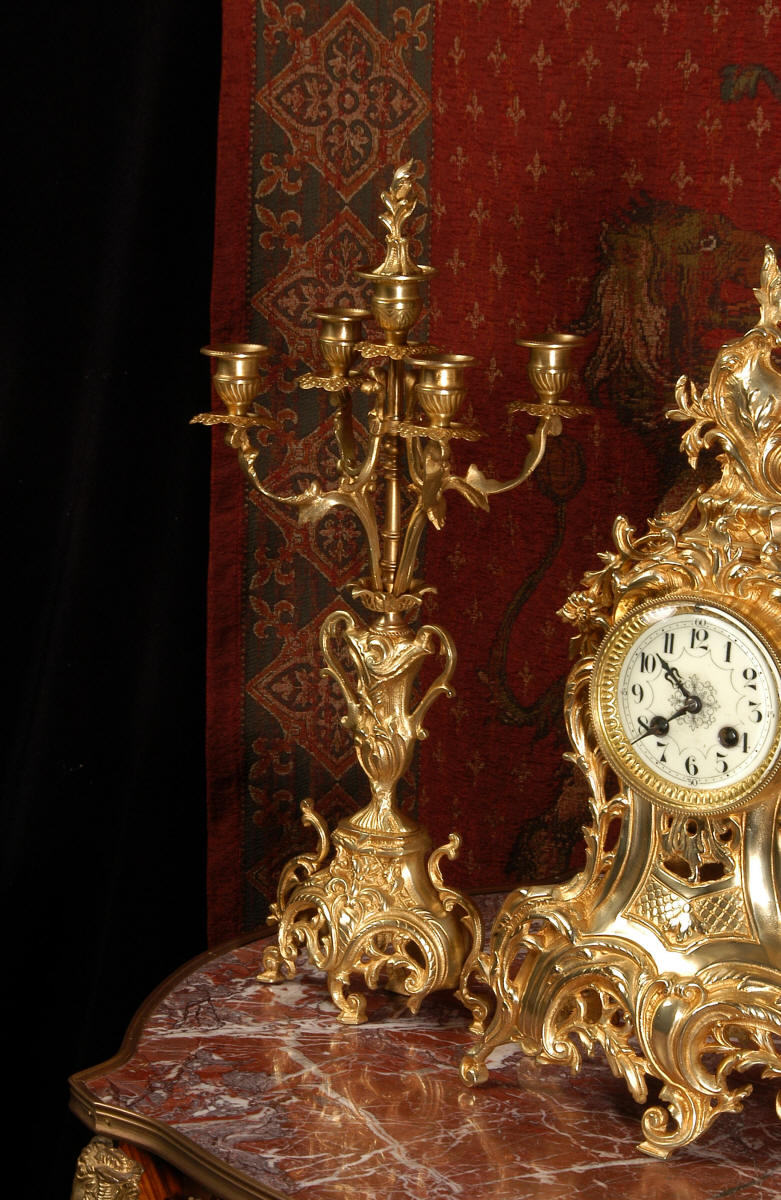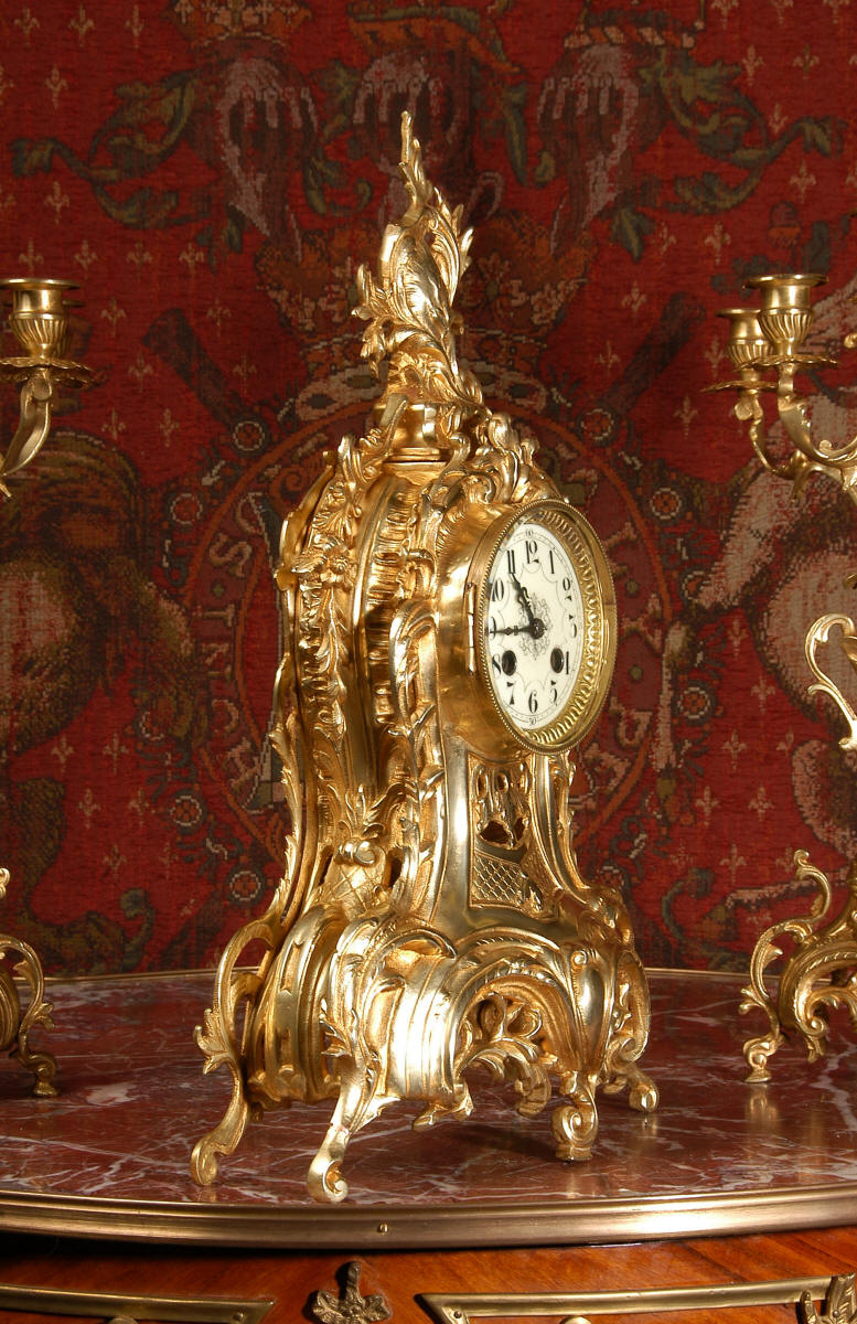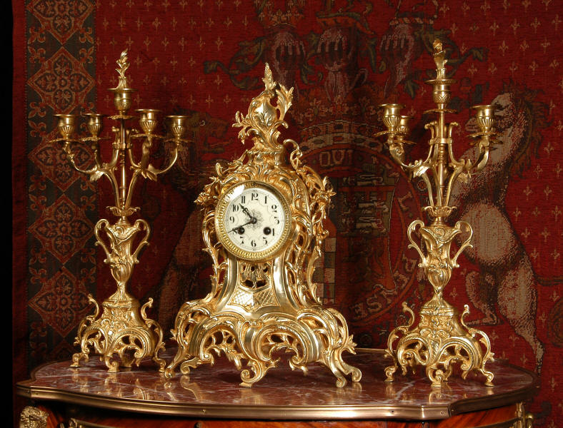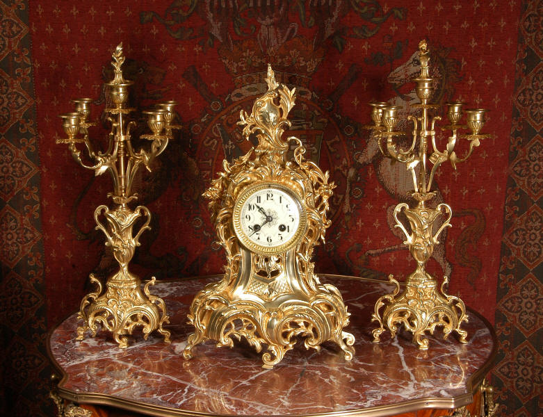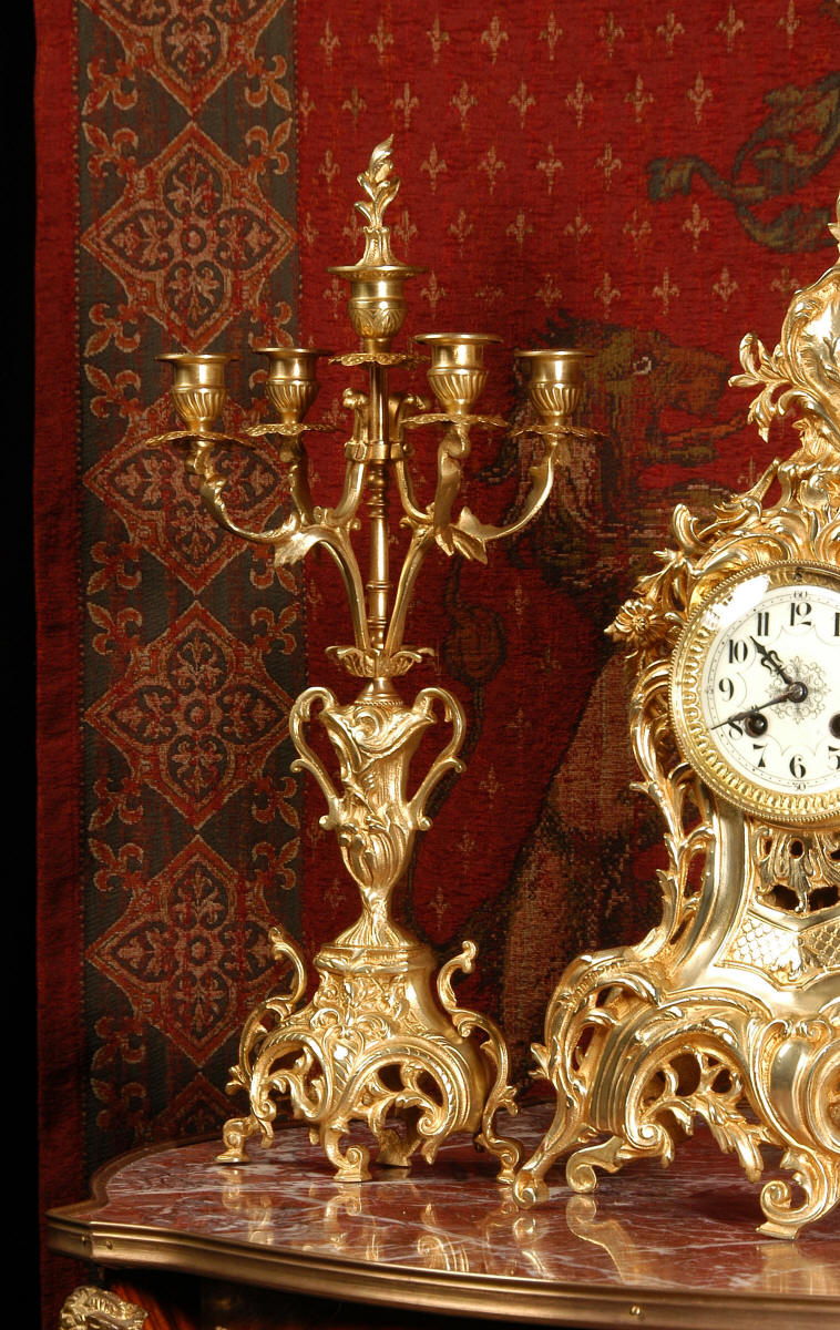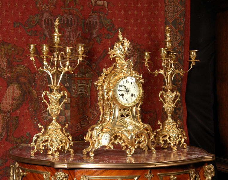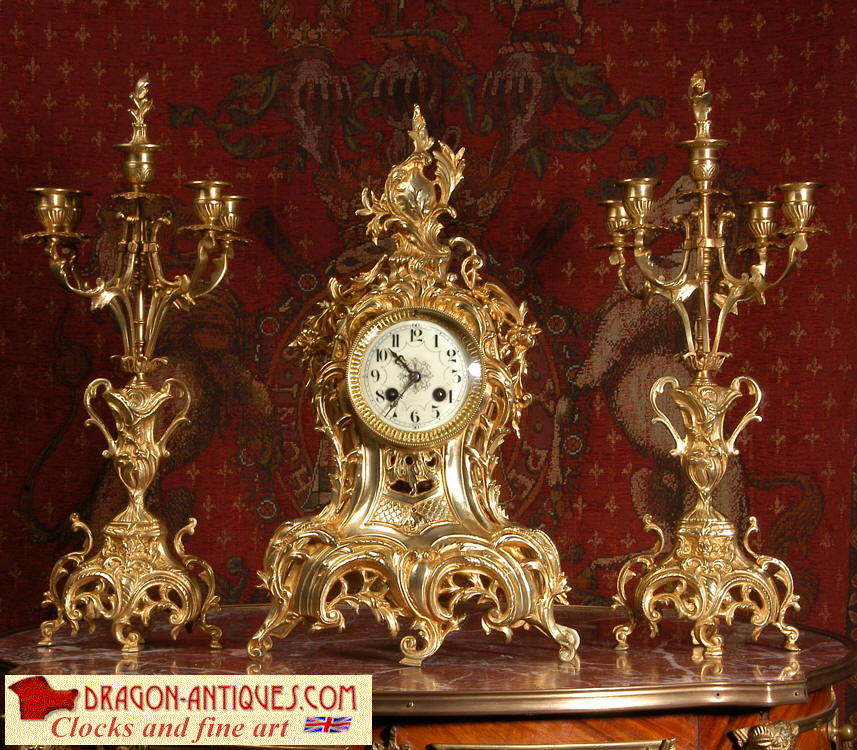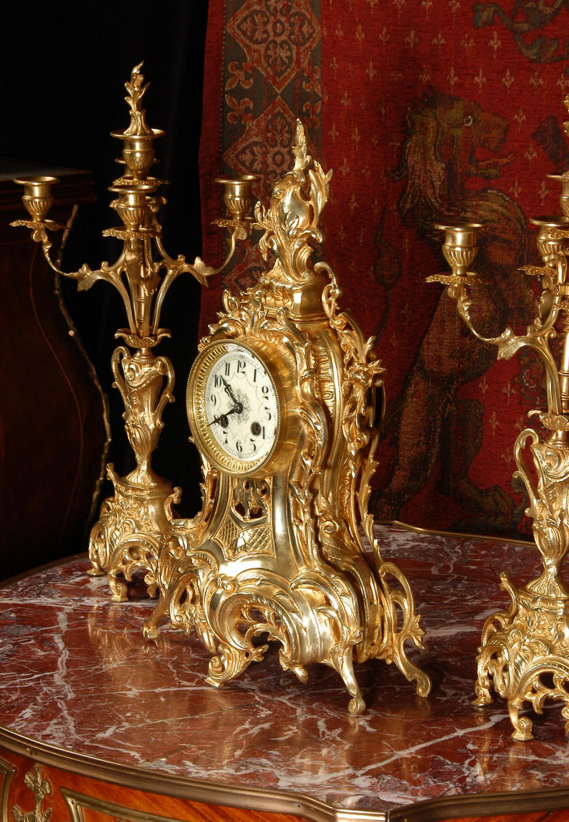 ~ French - Circa 1880 ~ ~~ Excellent condition, fully overhauled ~~ This is a superb, decorative antique French clock and candelabra set. Beautiful Rococo waisted shape with "C" scrolls, shells and floral swags. The front of the clock has a fretted panel allowing the pendulum to be glimpsed swinging within the case. The set is very well modelled in gilt brass which has a lovely clean and bright finish.