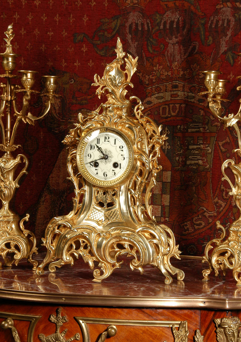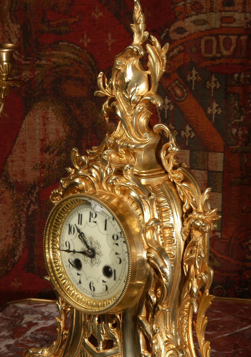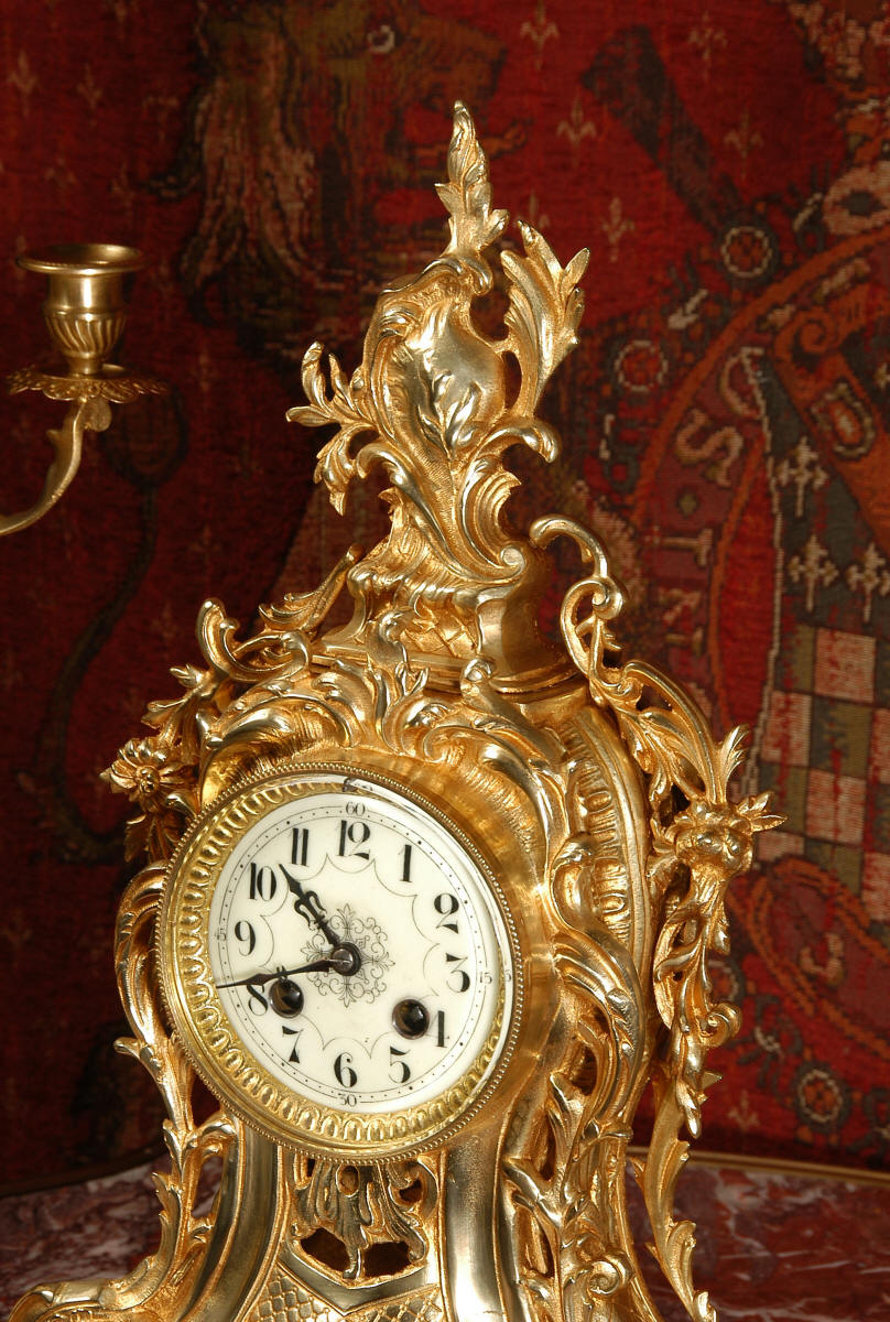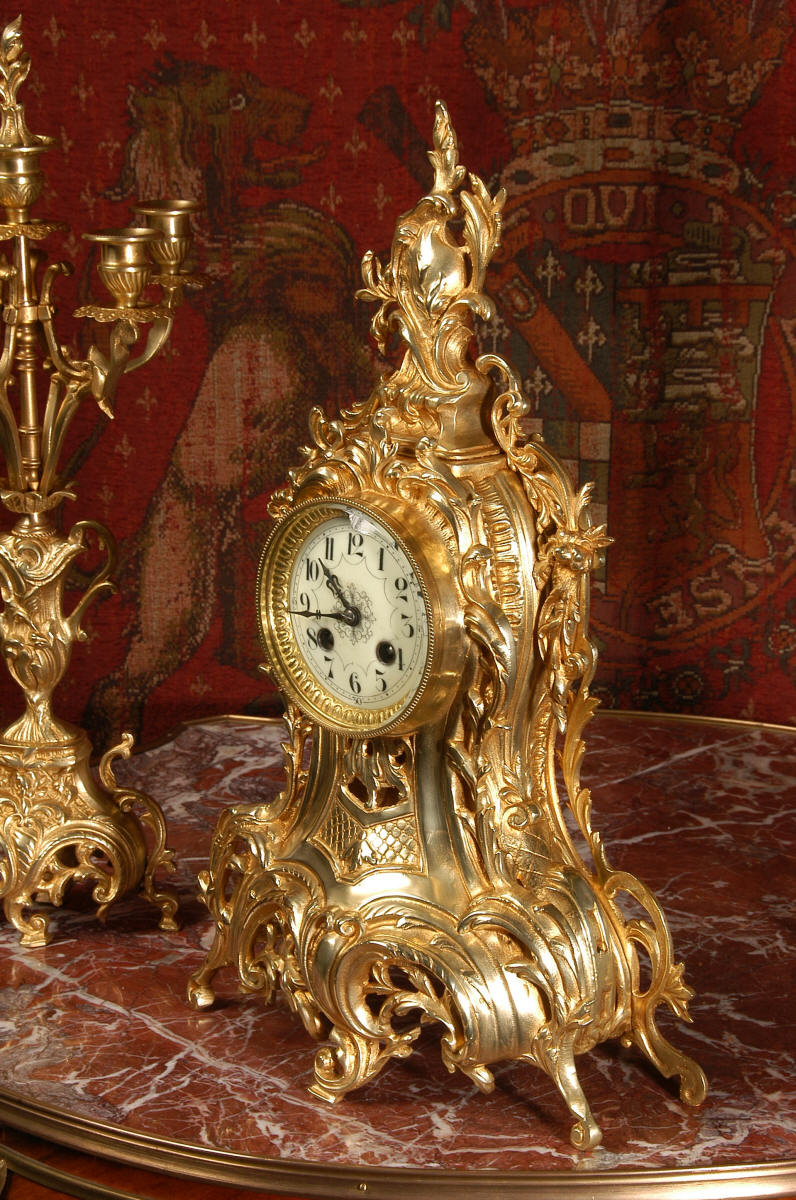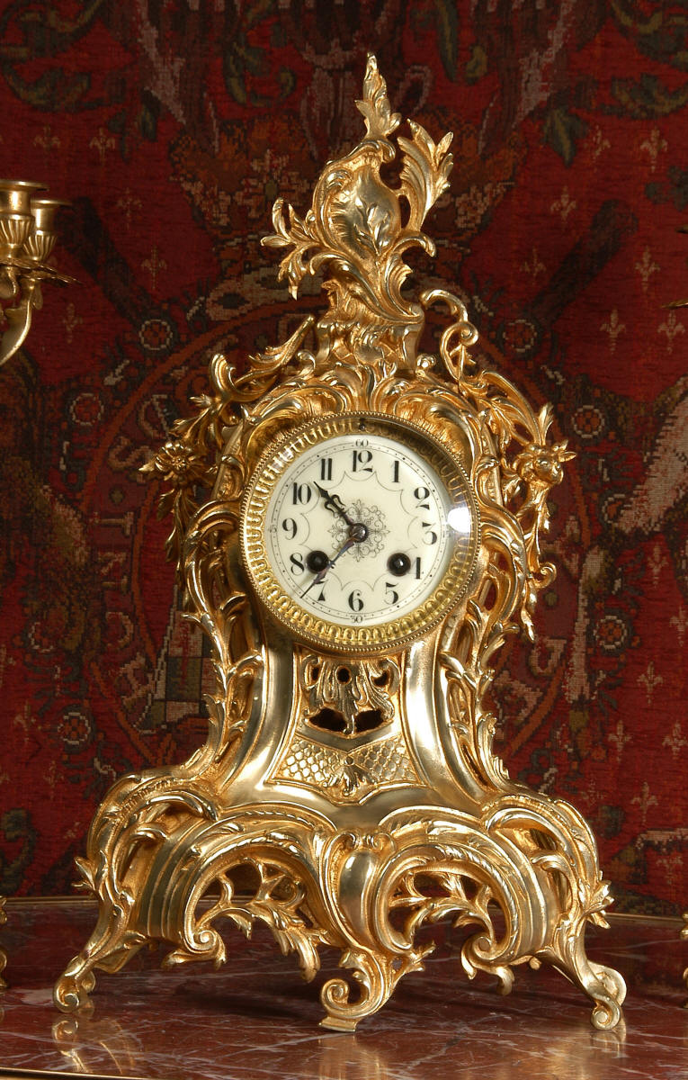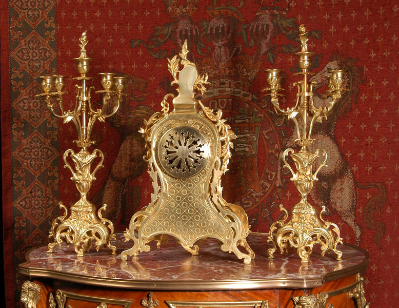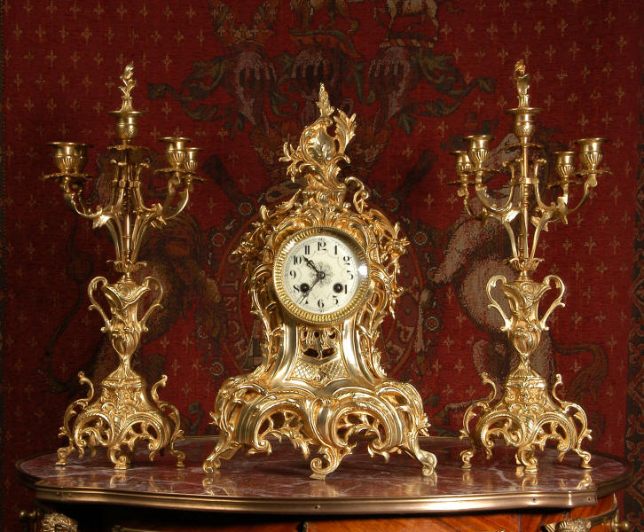 ~ French - Circa 1880 ~ ~~ Excellent condition, fully overhauled ~~ This is a superb, decorative antique French clock and candelabra set. Beautiful Rococo waisted shape with "C" scrolls, shells and floral swags. The front of the clock has a fretted panel allowing the pendulum to be glimpsed swinging within the case. The set is very well modelled in gilt brass which has a lovely clean and bright finish.