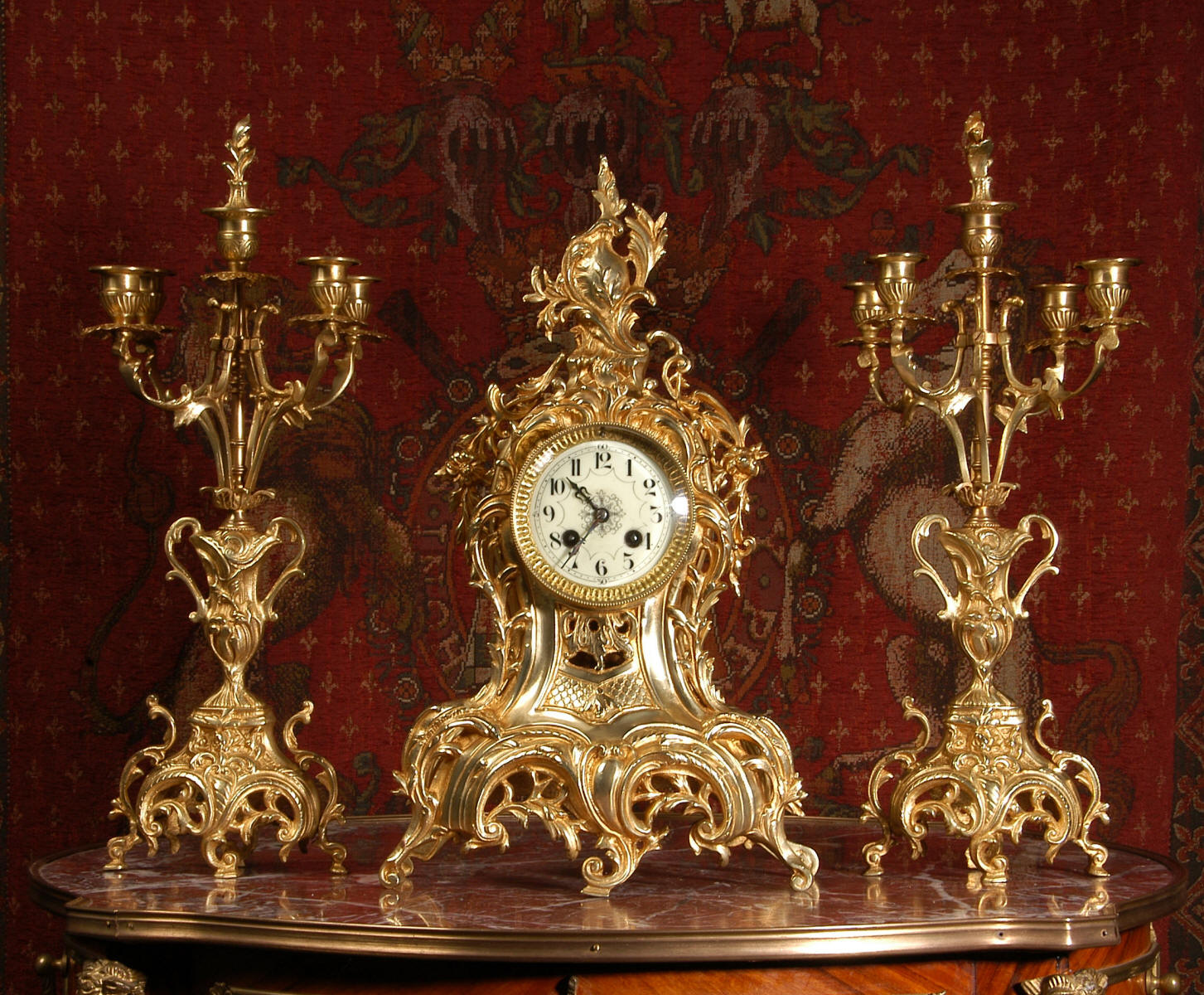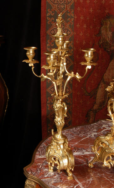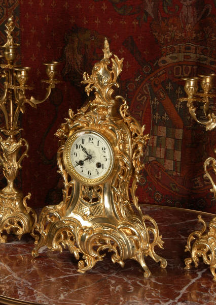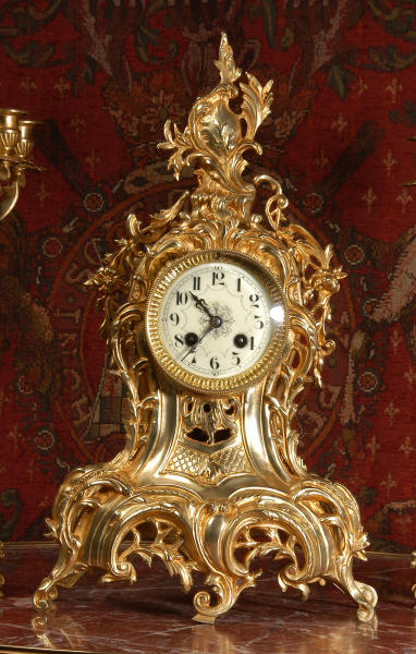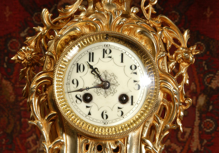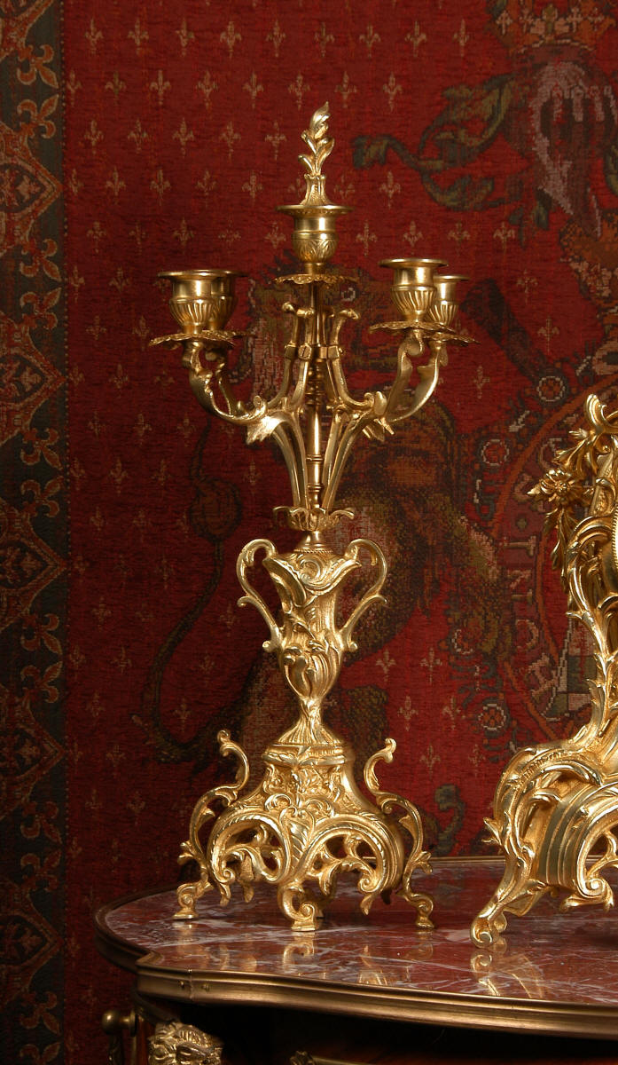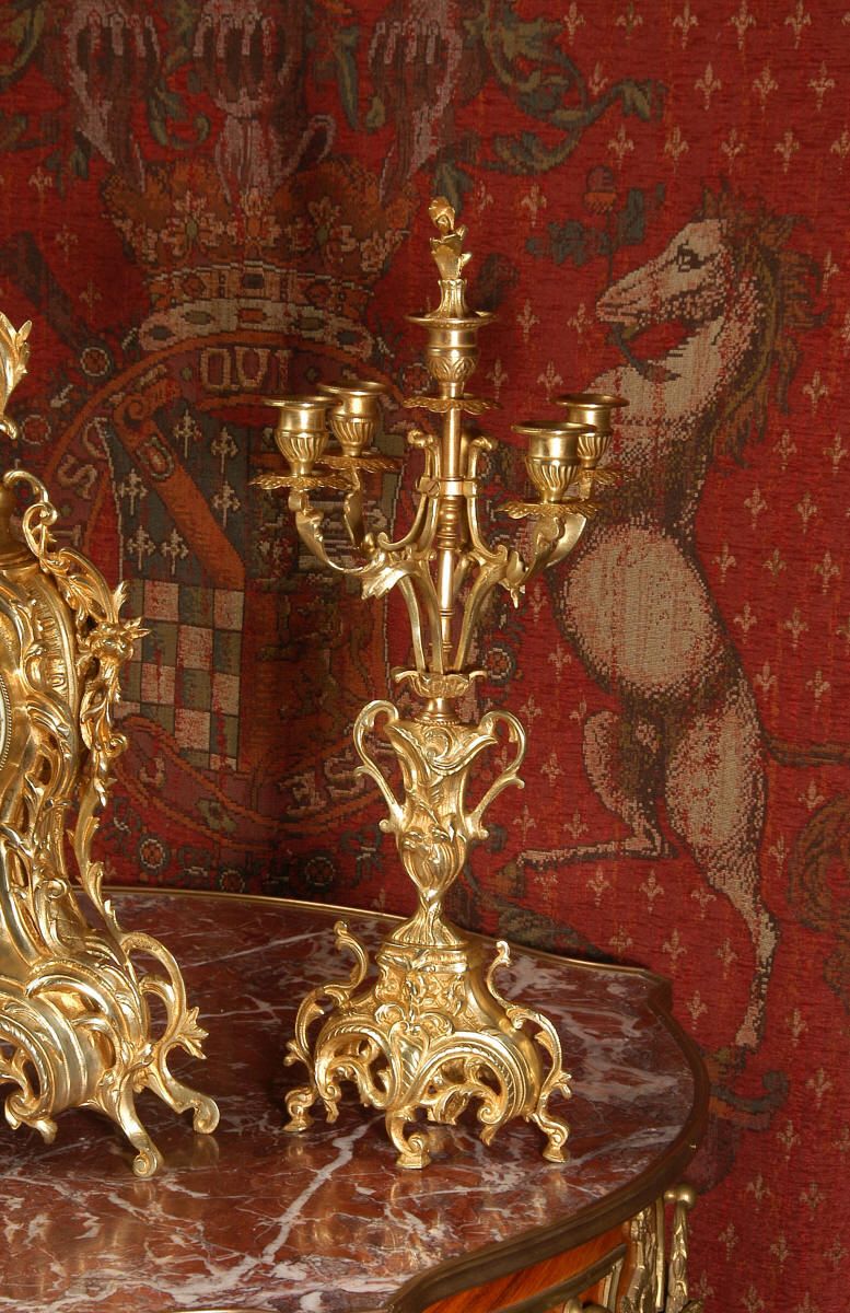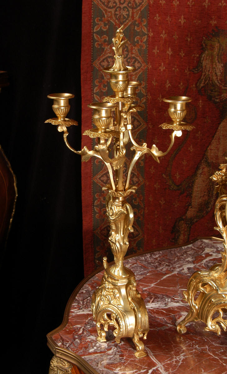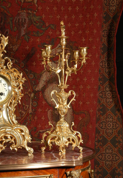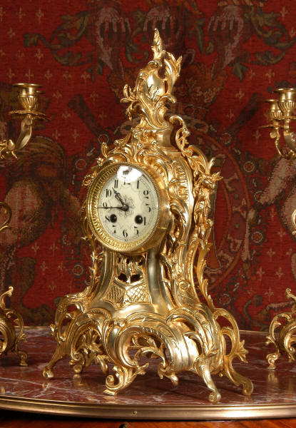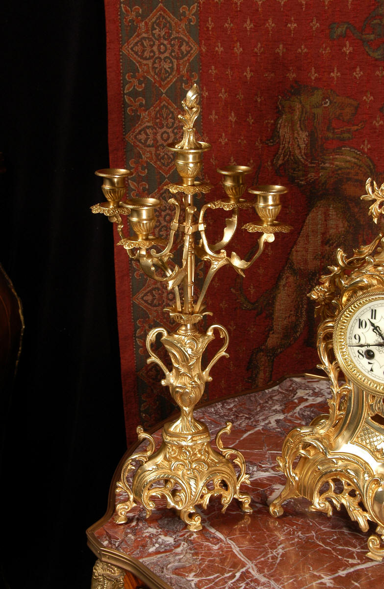 ~ French - Circa 1880 ~ ~~ Excellent condition, fully overhauled ~~ This is a superb, decorative antique French clock and candelabra set. Beautiful Rococo waisted shape with "C" scrolls, shells and floral swags. The front of the clock has a fretted panel allowing the pendulum to be glimpsed swinging within the case. The set is very well modelled in gilt brass which has a lovely clean and bright finish.