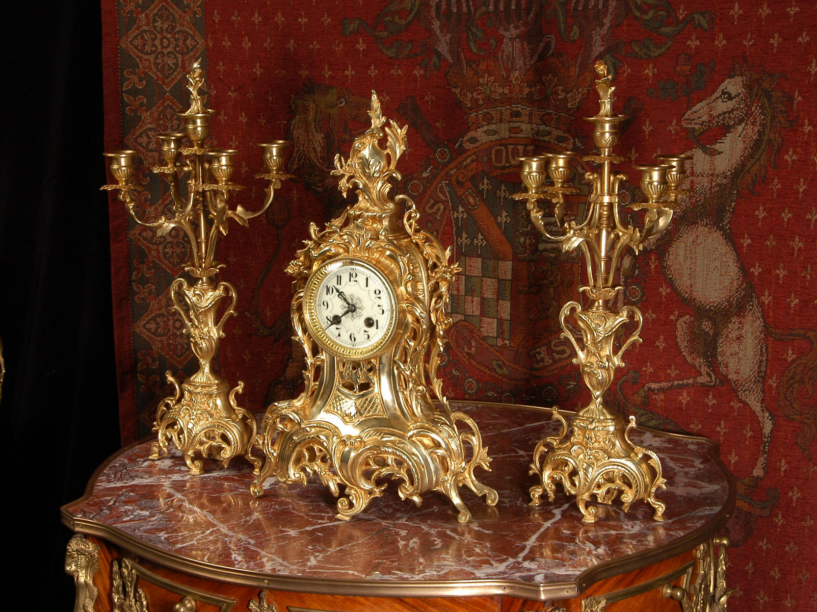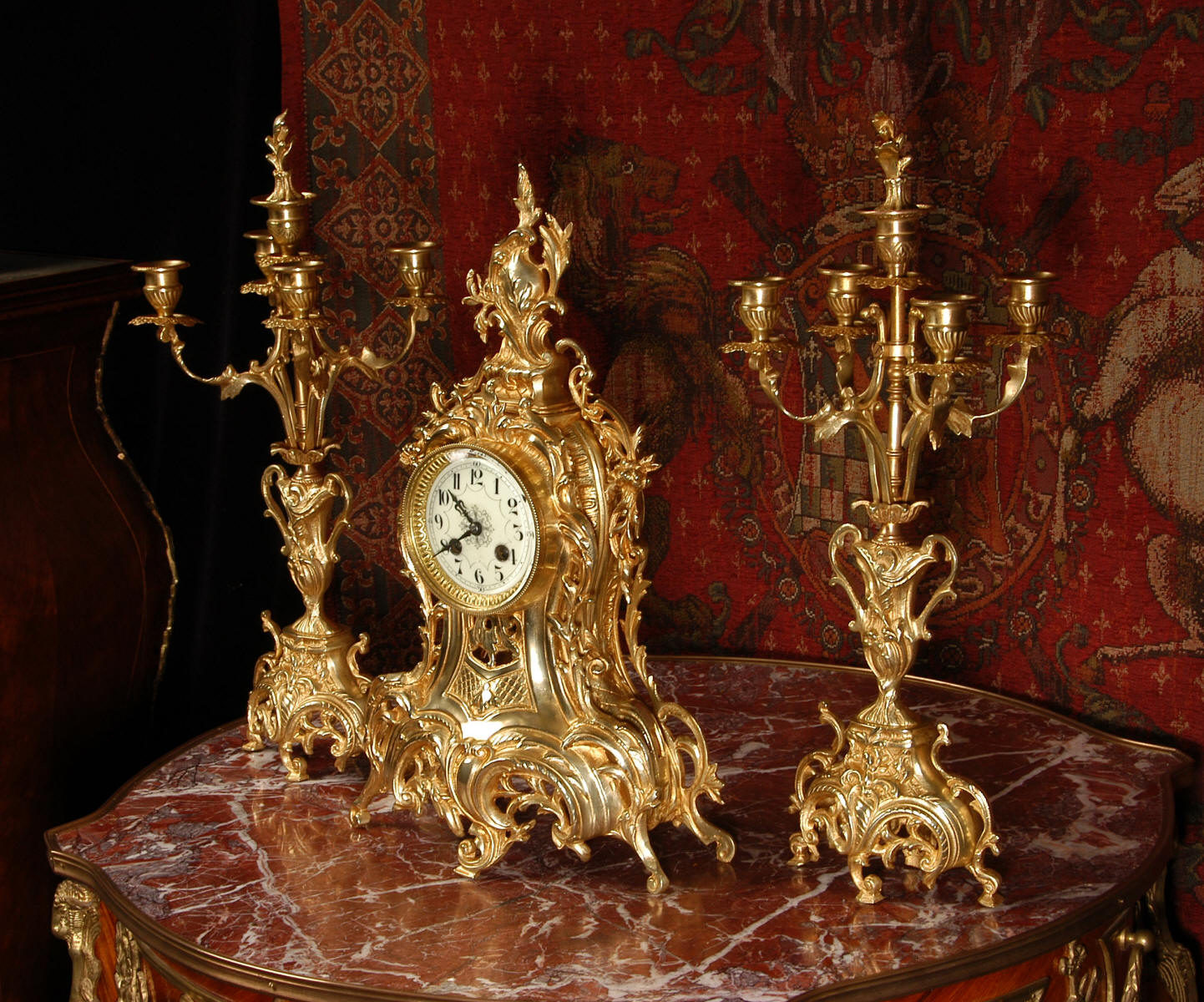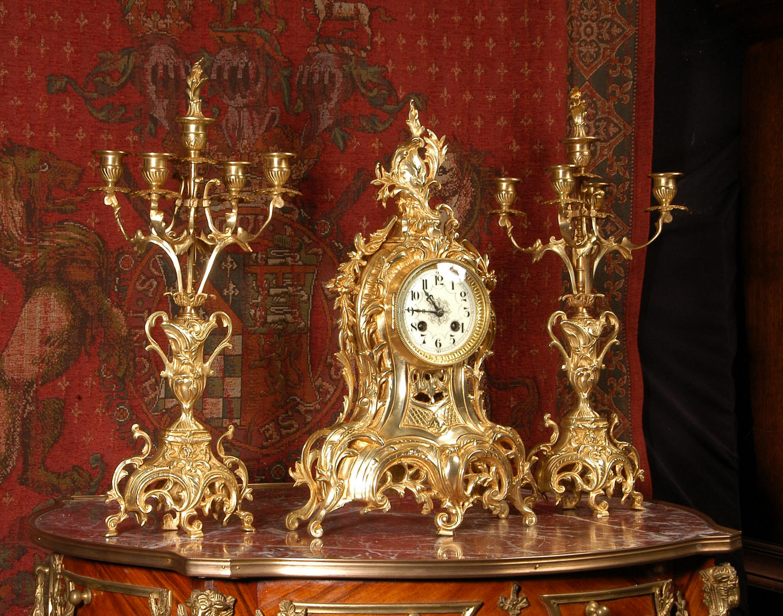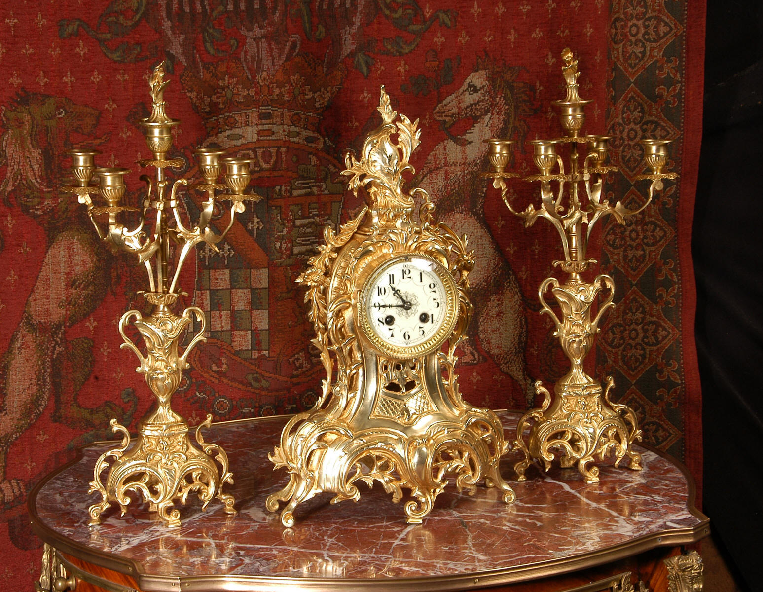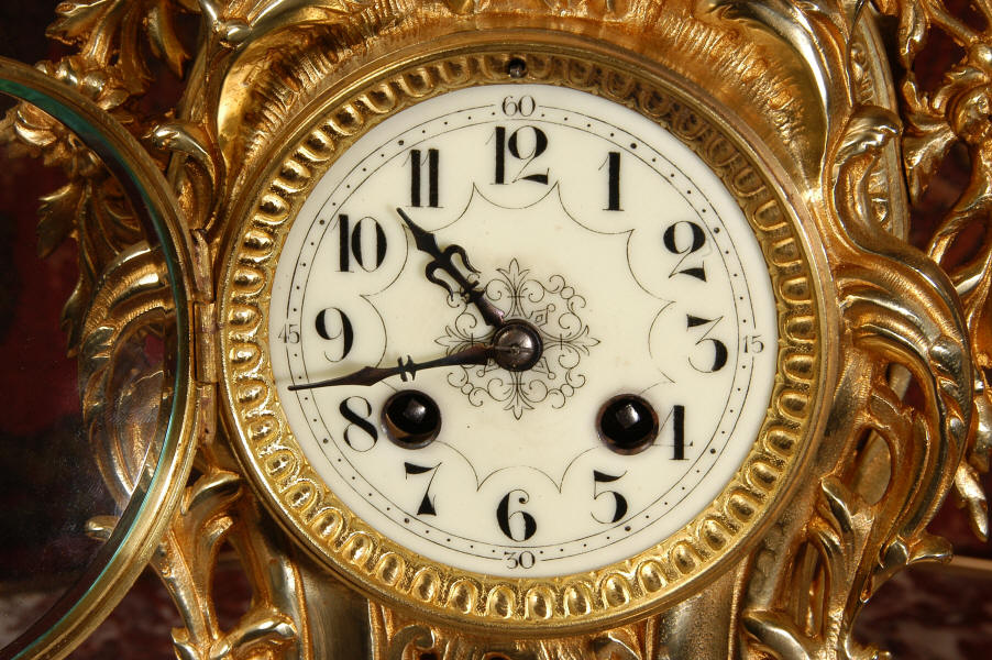 ~ French - Circa 1880 ~ ~~ Excellent condition, fully overhauled ~~ This is a superb, decorative antique French clock and candelabra set. Beautiful Rococo waisted shape with "C" scrolls, shells and floral swags. The front of the clock has a fretted panel allowing the pendulum to be glimpsed swinging within the case. The set is very well modelled in gilt brass which has a lovely clean and bright finish.