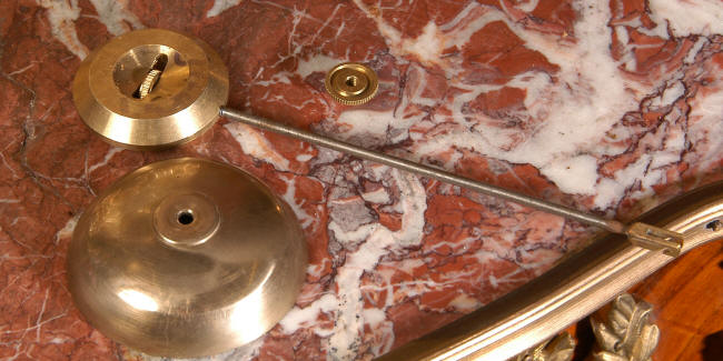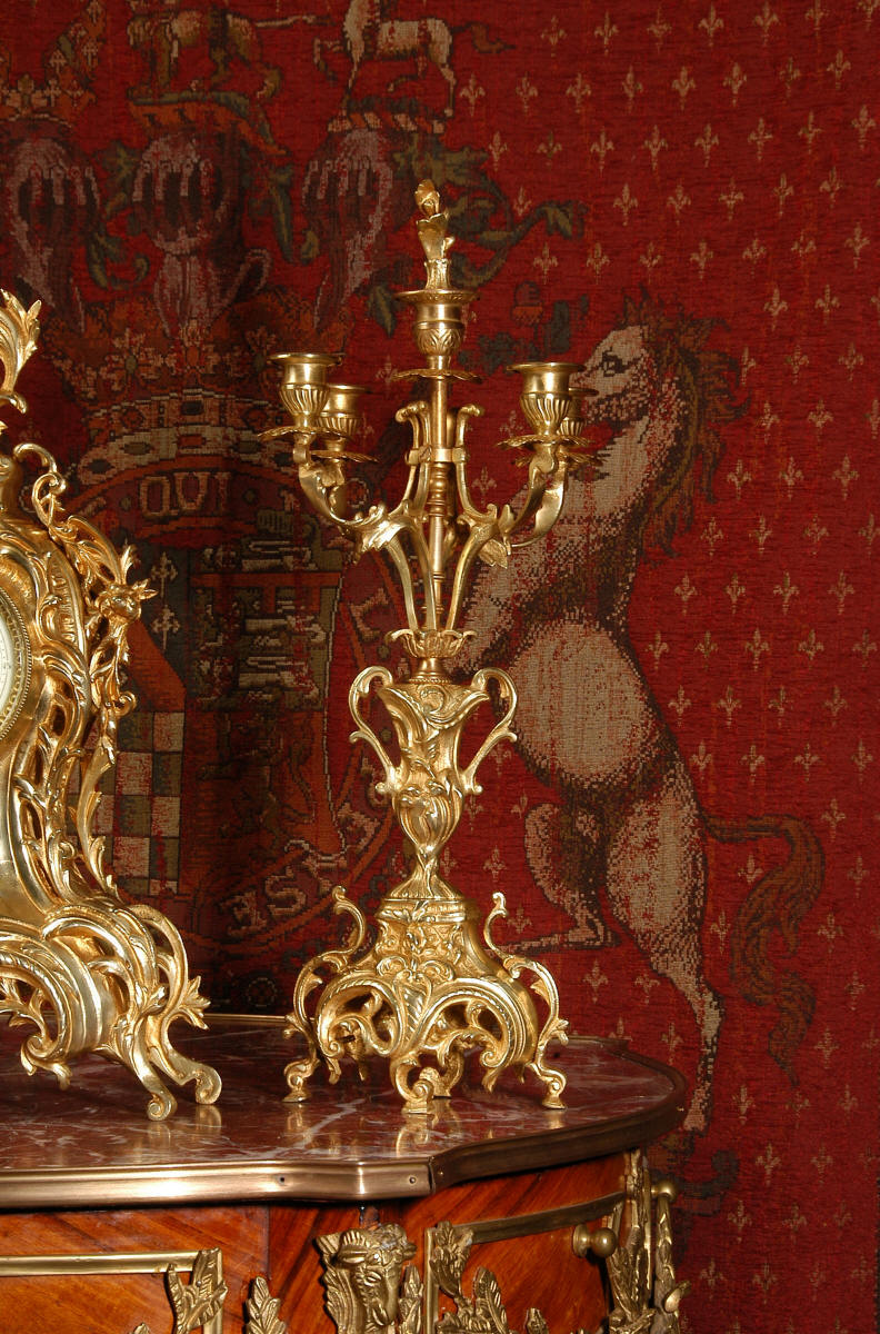 Dial is particularly pretty, enamel on copper and is complete with the original blued steel hands. Candelabra are complete with Rococo finial snuffers. The four arms are delicately modelled as entwining foliage, standing above urns with 'c' scroll handles. The set is of very good quality with crisp, sharp and finely detailed modelling and the gilding has a lovely clean and bright finish. French movement is by Louis Japy and is of very good quality. It runs for 8 days on one wind and strikes half-hourly on a bell. It is in excellent clean and running condition having been fully overhauled by our clockmaker who has also replaced the pendulum. Click the video clip below to see and hear the movement working! Condition of the case is excellent with a bright and clean finish, some minor wear on the high spots. Dial is also in excellent condition with just a faint hairline near the 3 o'clock. The candelabra arms are very slightly distorted. The central nozzles have holes to allow wax to drain. The set looks great as you can see in the pictures below! Complete with pendulum, bell and a suitable key. Full setting up instructions supplied if required.