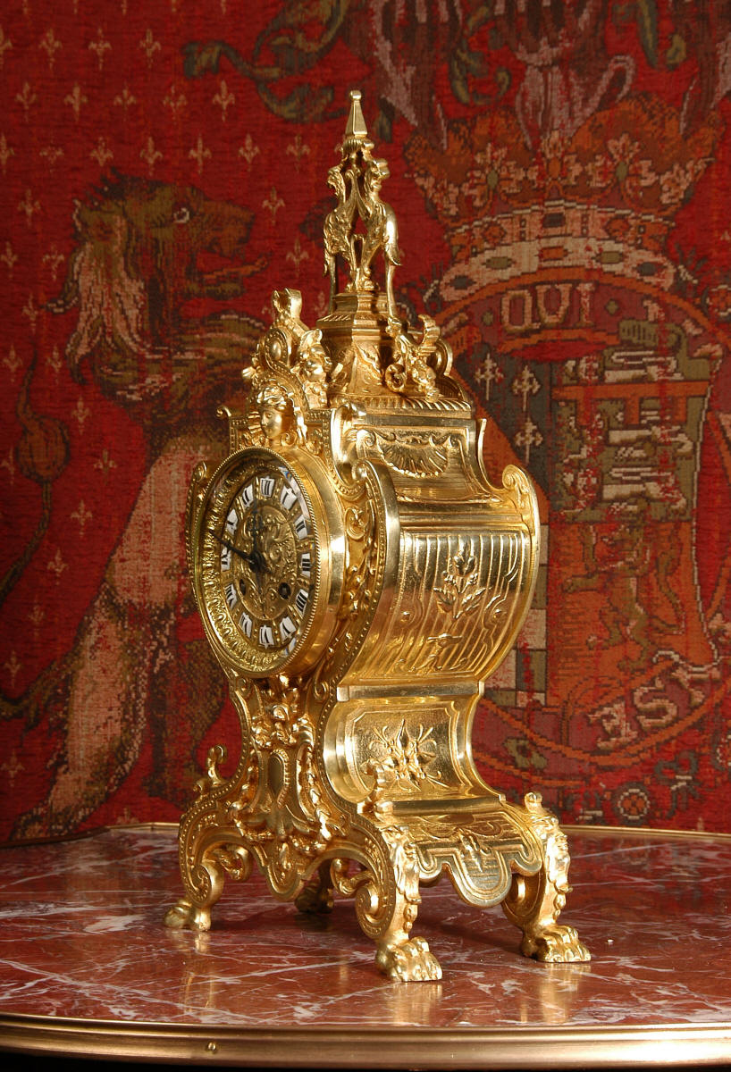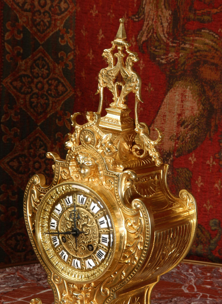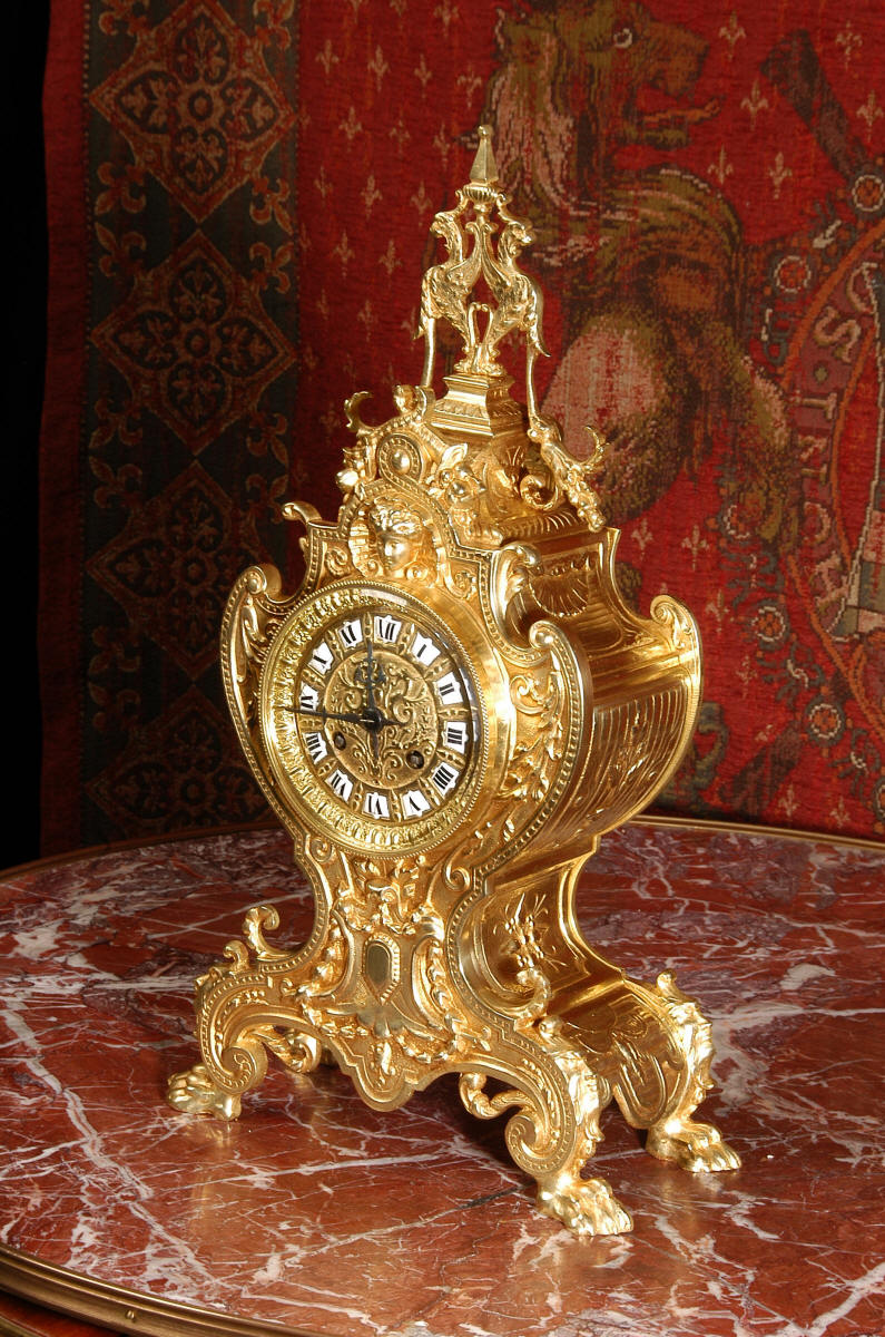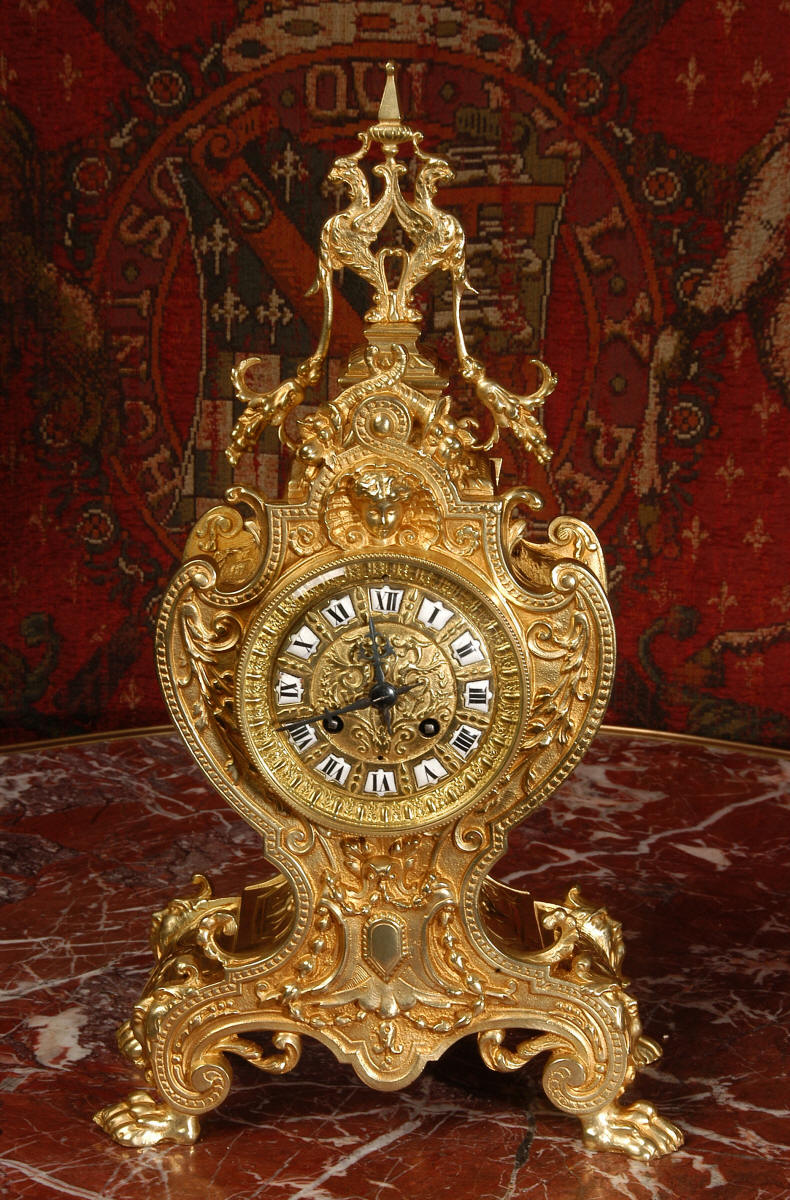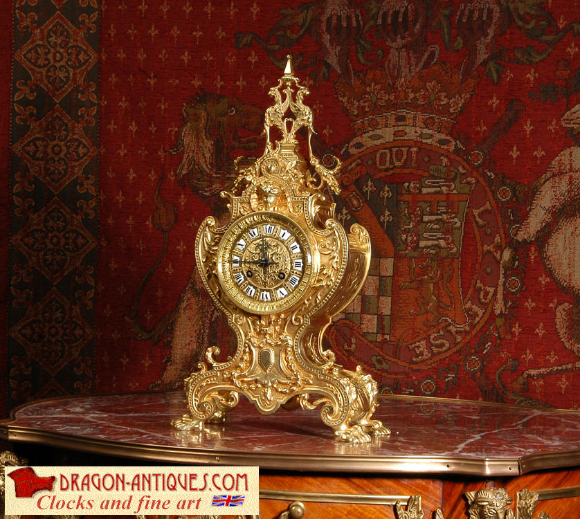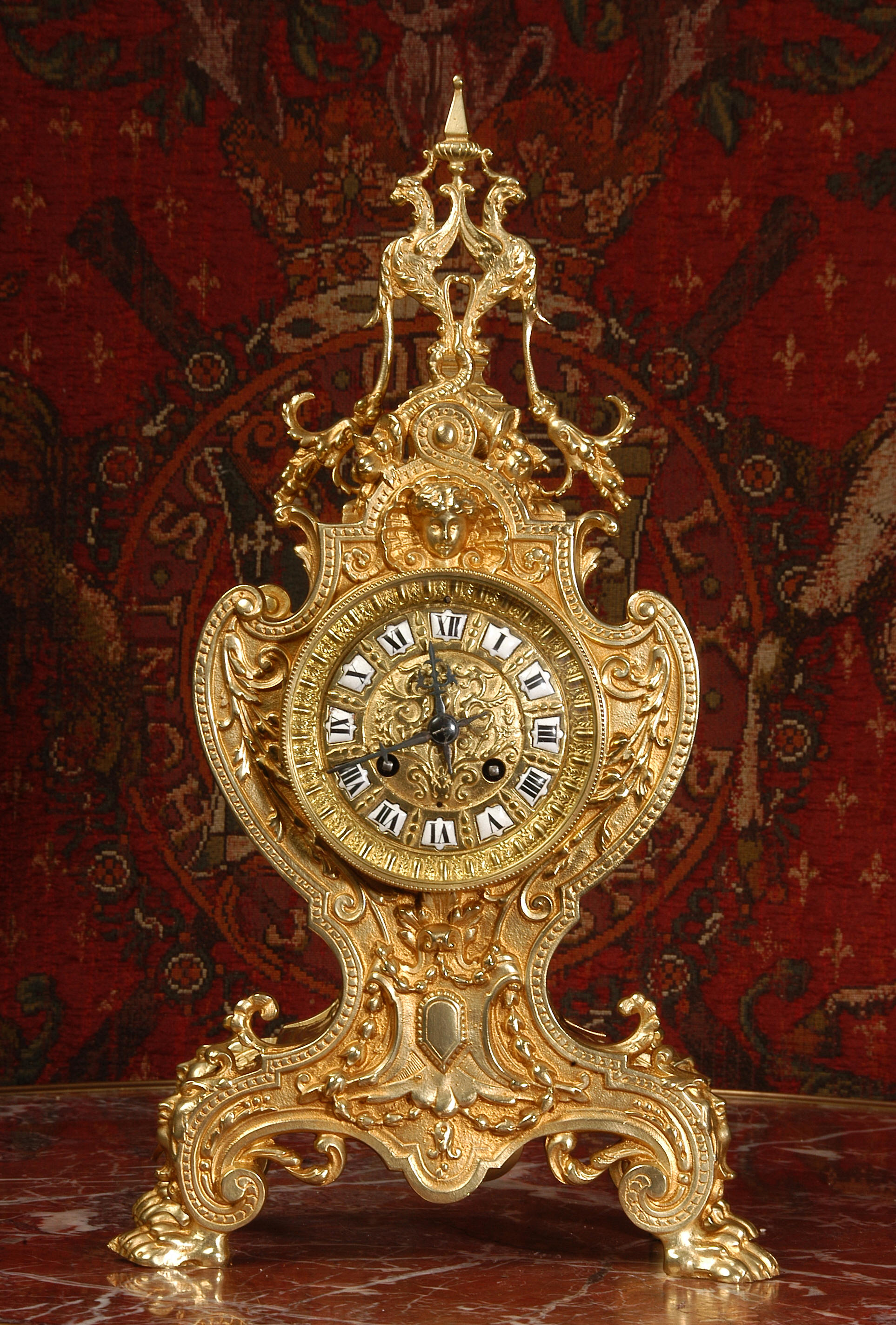 ~ French - Circa 1880 ~ ~~ Excellent condition, fully overhauled ~~ A stunning antique French boudoir clock. It is Baroque in style, beautifully modelled in brass with a waisted case with elaborate scrolled shoulders. It is decorated with mythical creatures, hairy paw feet and a coat of arms. Above the dial is a cherub mask with a pair of cornucopia above. To the top of the case is an elegant finial of mythical creatures and foliage. Scroll down for more pictures!