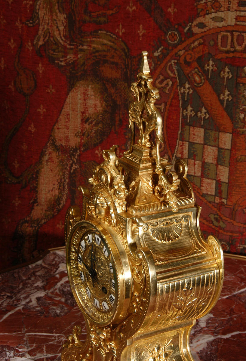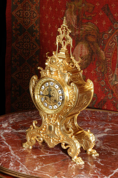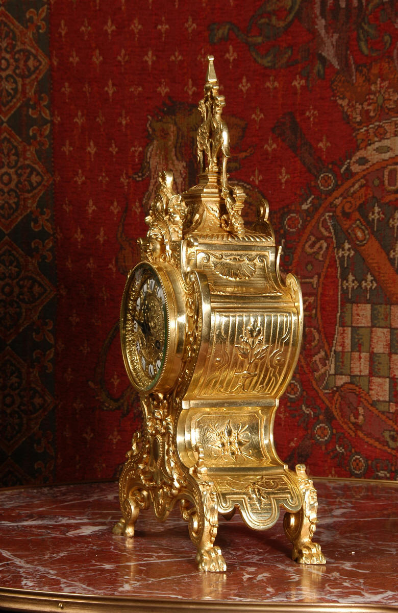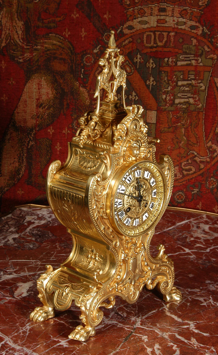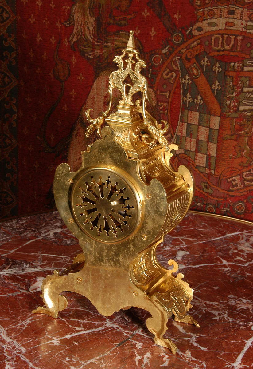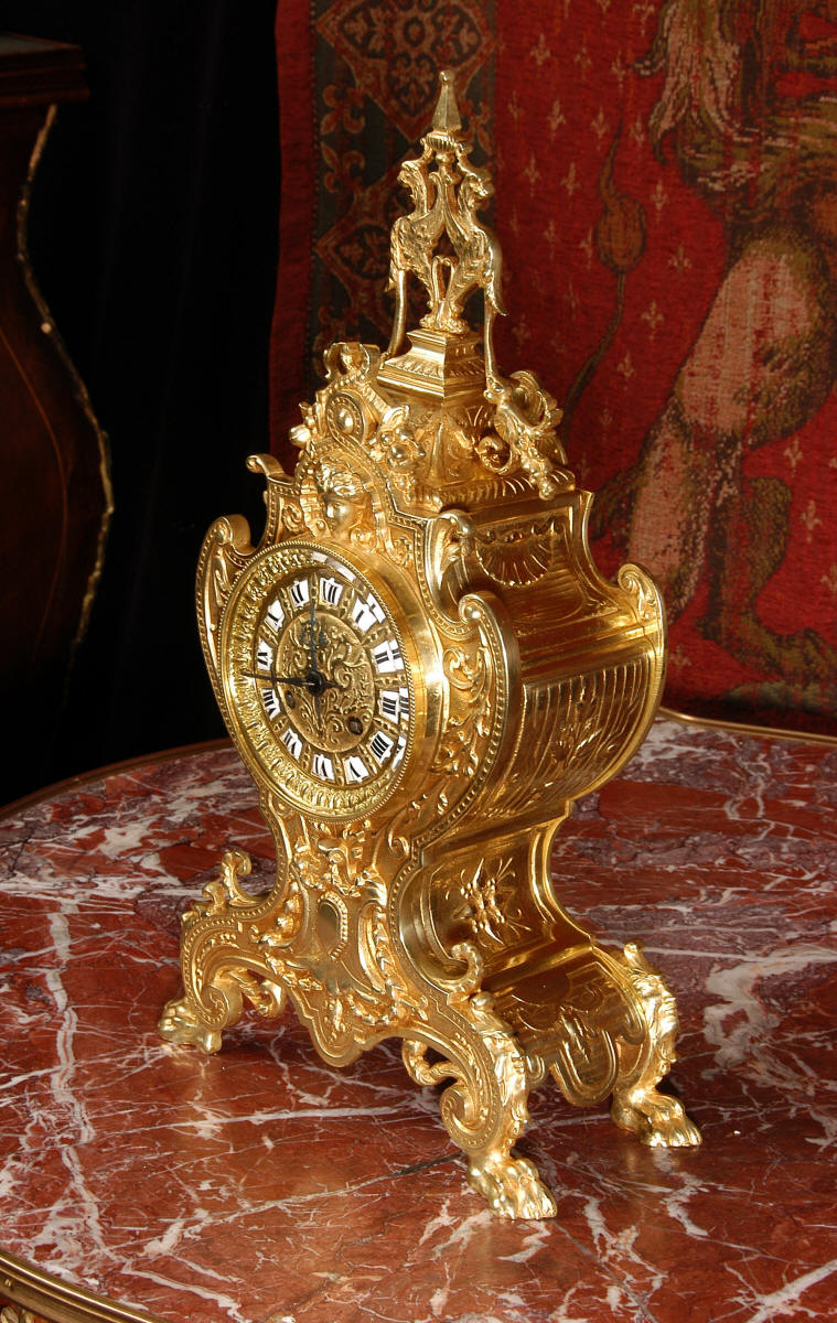 ~ French - Circa 1880 ~ ~~ Excellent condition, fully overhauled ~~ A stunning antique French boudoir clock. It is Baroque in style, beautifully modelled in brass with a waisted case with elaborate scrolled shoulders. It is decorated with mythical creatures, hairy paw feet and a coat of arms. Above the dial is a cherub mask with a pair of cornucopia above. To the top of the case is an elegant finial of mythical creatures and foliage. Scroll down for more pictures!