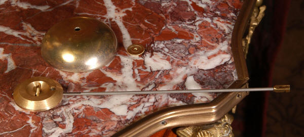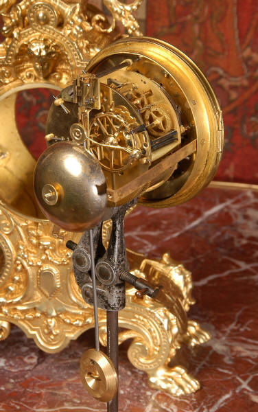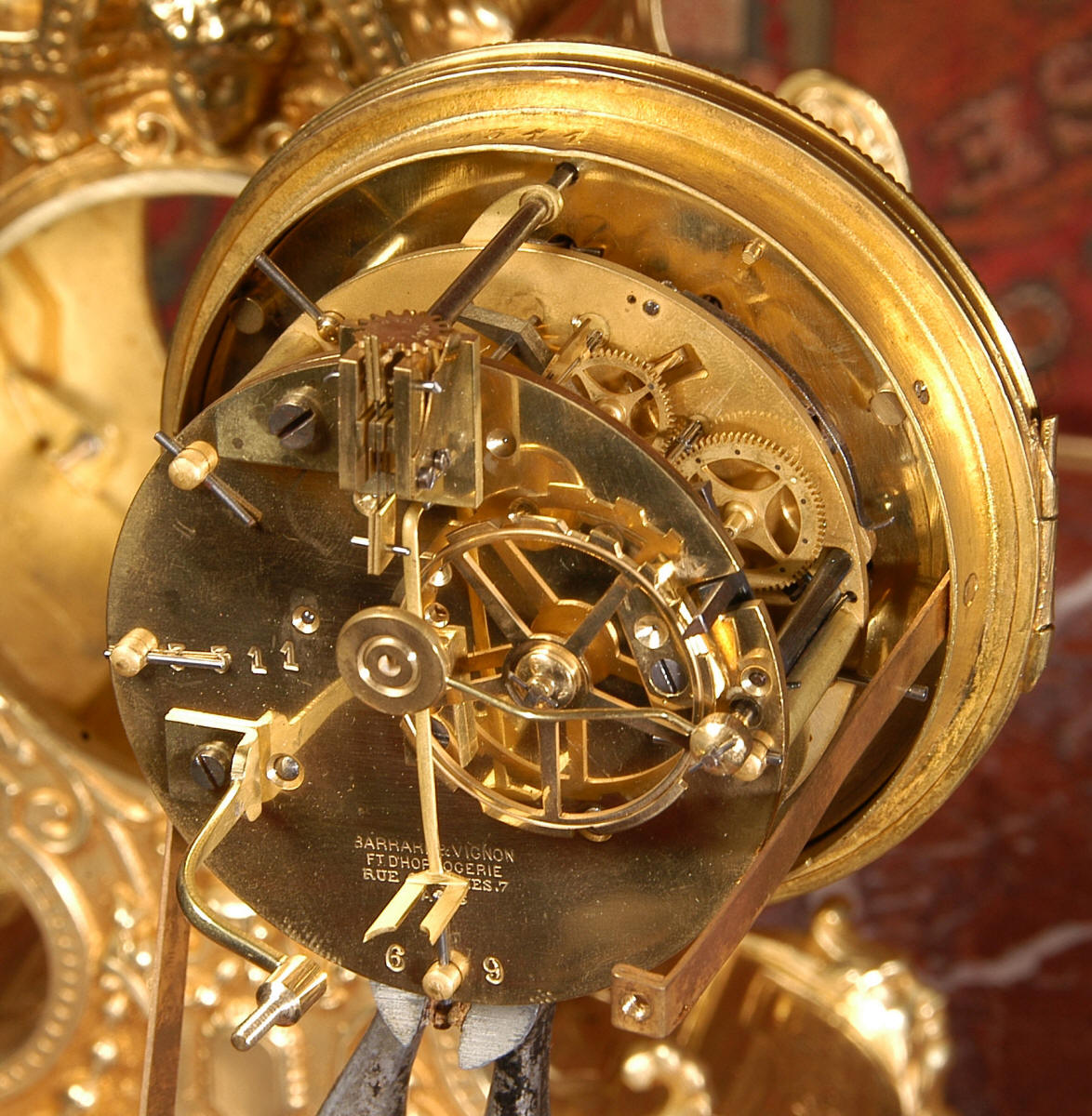 The dial is also brass, mounted with 12 individual enamel cartouches and the original blued steel hands. The glass is convex bevelled. The French movement is of high quality and has the Barrard and Vignon mark on the movement backplate. It is in excellent clean and running condition having been fully overhauled by our clockmaker. Pendulum is a replacement. It runs for 8 days and strikes the hours and halves on a bell. Click the video clip below to hear the bell and watch the clock running!