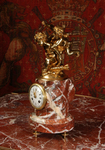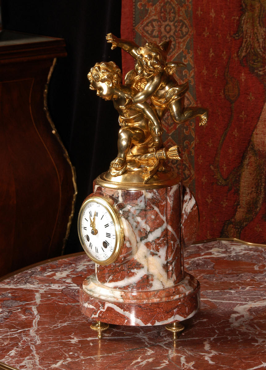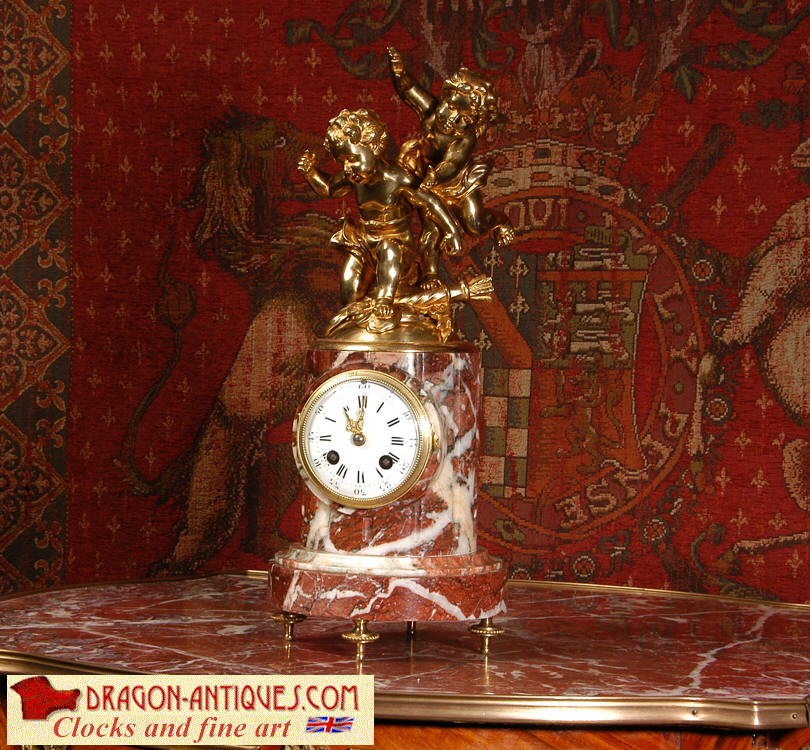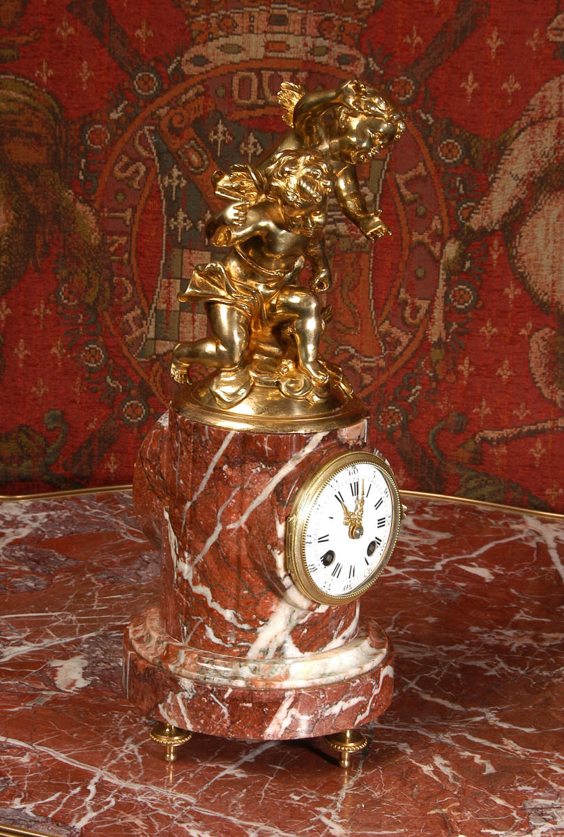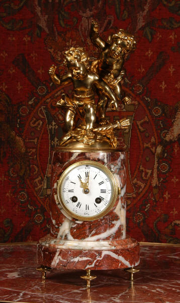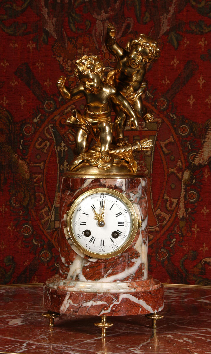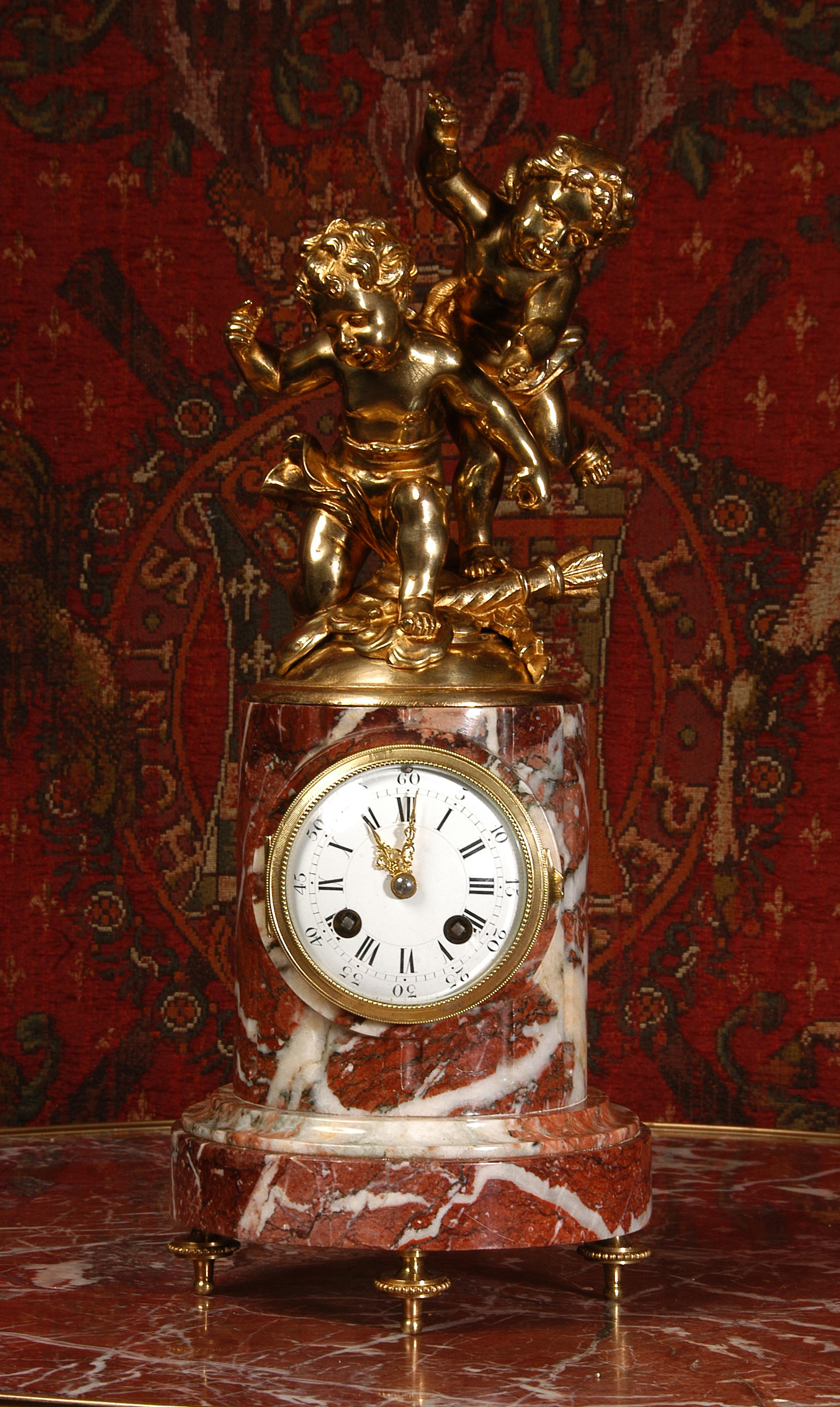 ~ French - Circa 1880 ~ ~~ Excellent condition, fully overhauled ~~ A beautiful original antique French table clock featuring a pair of winged cherubs, playfully tussling. The reeded column base is made of the most stunning variegated specimen marble, a lovely deep red with white crystalline veining. The figures are finely modelled in good quality gilded metal, full of movement and life. A quiver of arrows lies at their feet, symbolising love. The dial is enamel on copper and has a separate minute ring and finely fretted gilt brass hands. The bezel is fitted with convex glass.