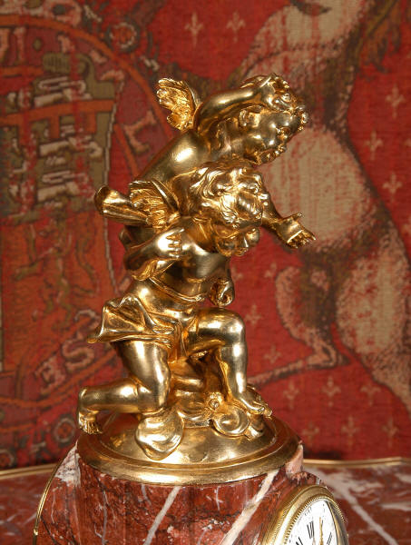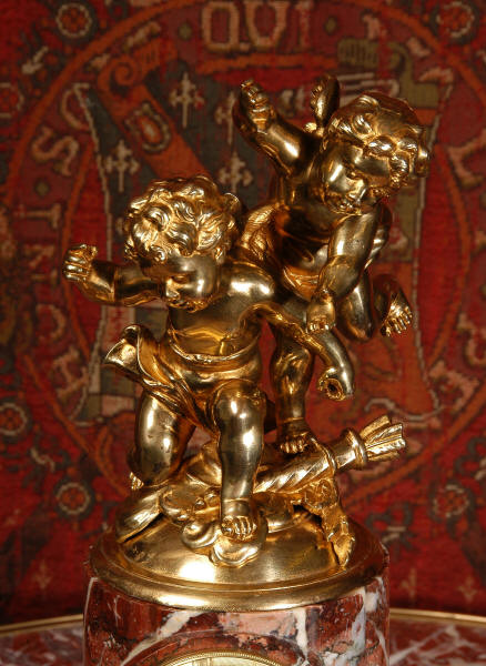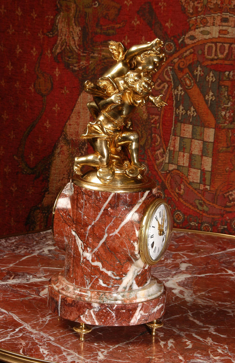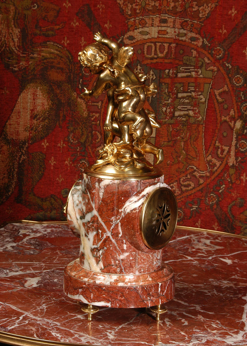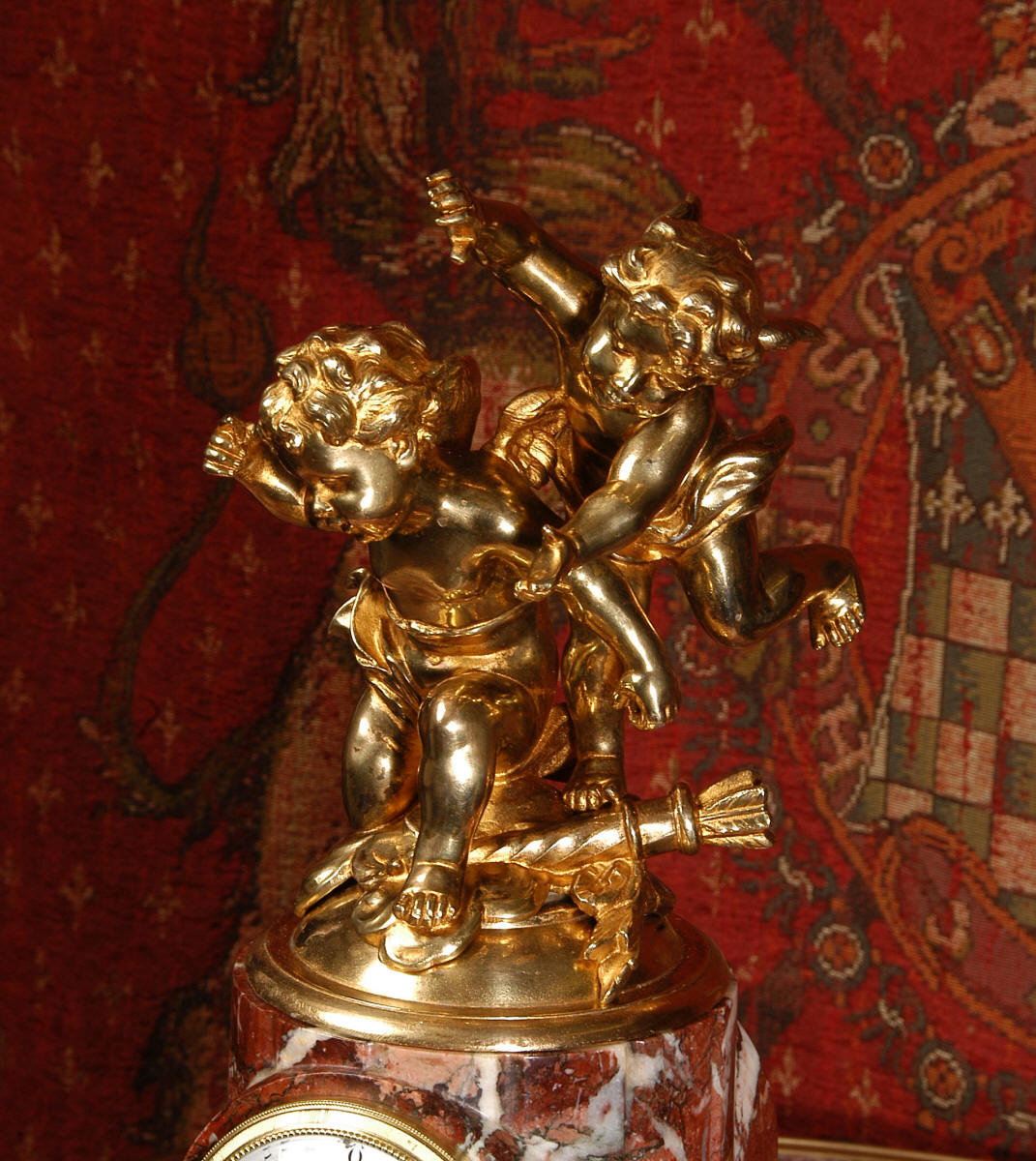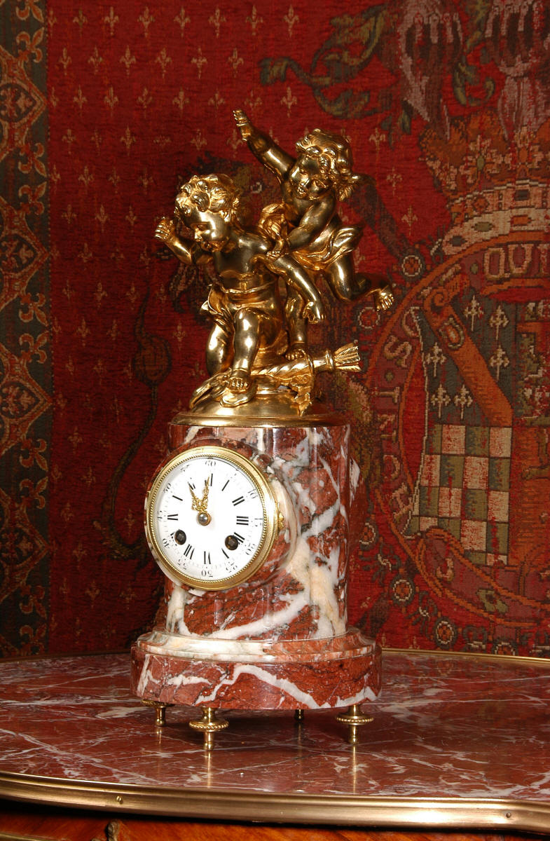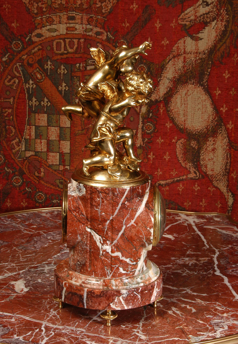 ~ French - Circa 1880 ~ ~~ Excellent condition, fully overhauled ~~ A beautiful original antique French table clock featuring a pair of winged cherubs, playfully tussling. The reeded column base is made of the most stunning variegated specimen marble, a lovely deep red with white crystalline veining. The figures are finely modelled in good quality gilded metal, full of movement and life. A quiver of arrows lies at their feet, symbolising love. The dial is enamel on copper and has a separate minute ring and finely fretted gilt brass hands. The bezel is fitted with convex glass.