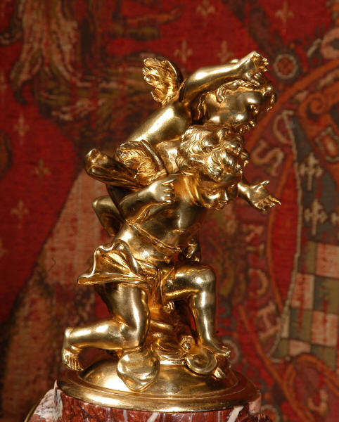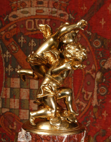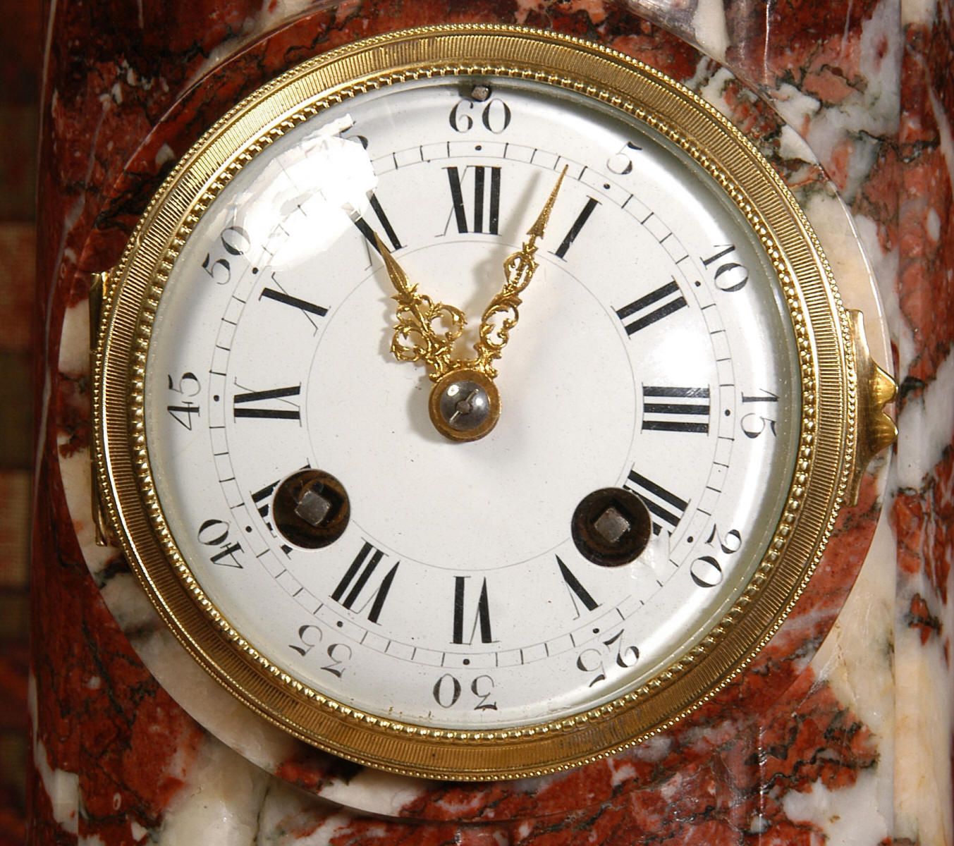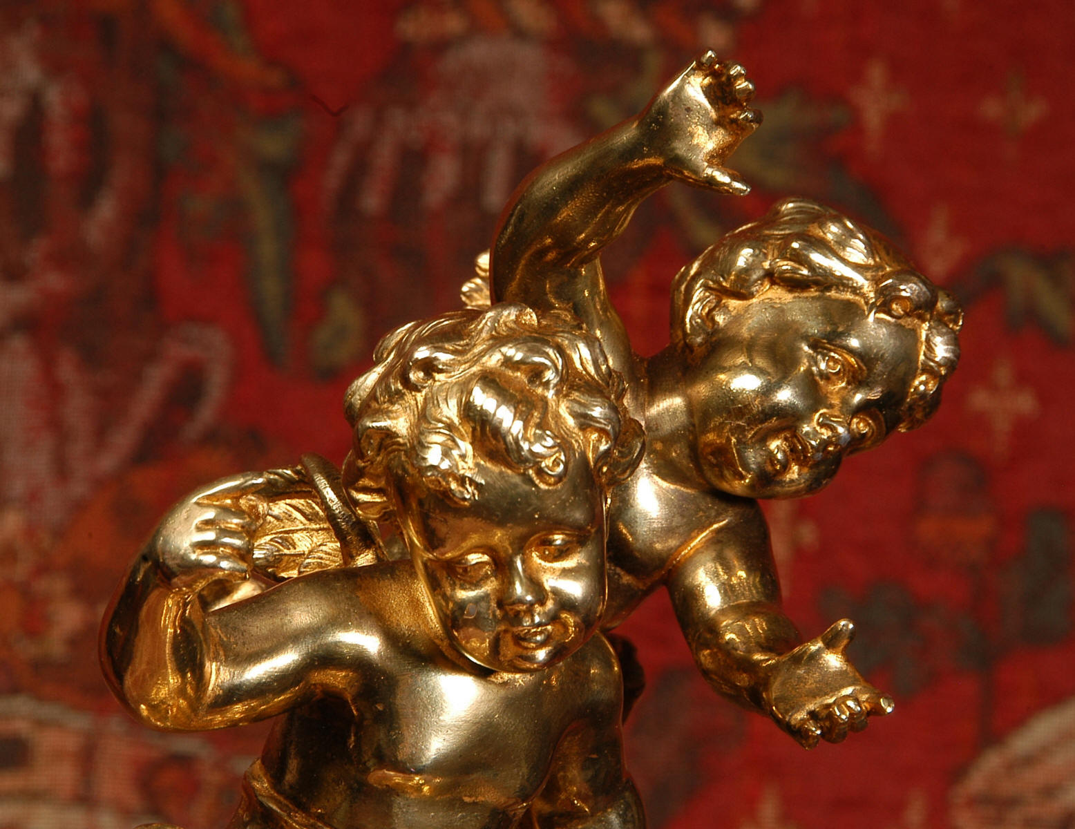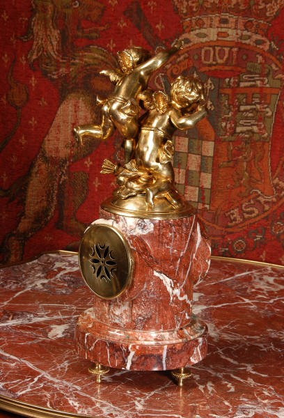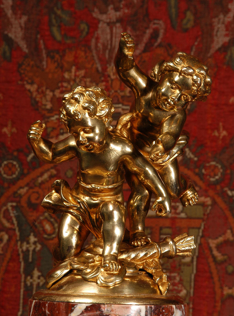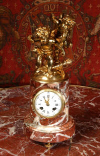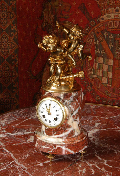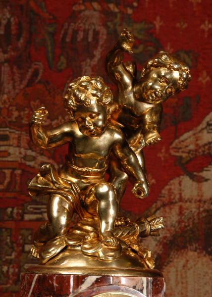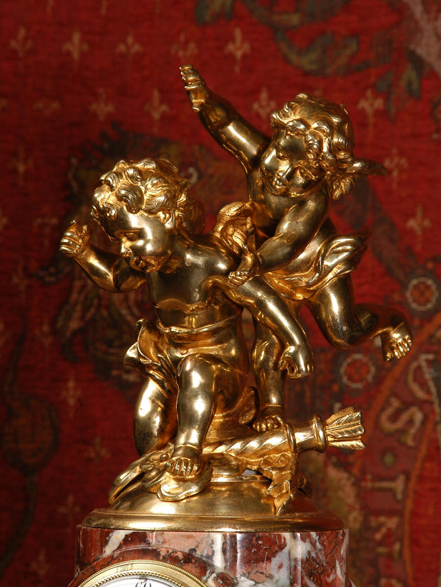 ~ French - Circa 1880 ~ ~~ Excellent condition, fully overhauled ~~ A beautiful original antique French table clock featuring a pair of winged cherubs, playfully tussling. The reeded column base is made of the most stunning variegated specimen marble, a lovely deep red with white crystalline veining. The figures are finely modelled in good quality gilded metal, full of movement and life. A quiver of arrows lies at their feet, symbolising love. The dial is enamel on copper and has a separate minute ring and finely fretted gilt brass hands. The bezel is fitted with convex glass.