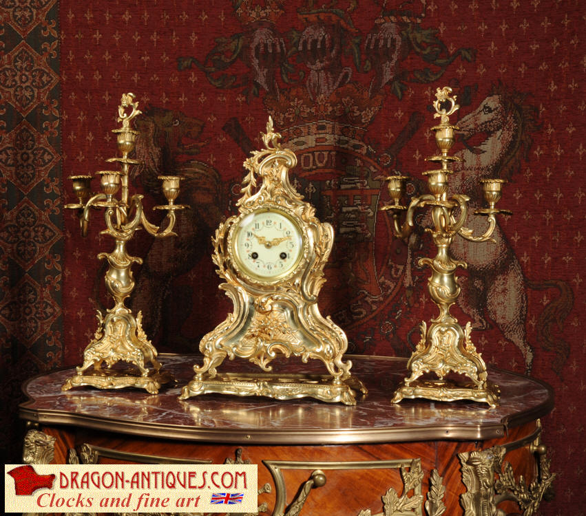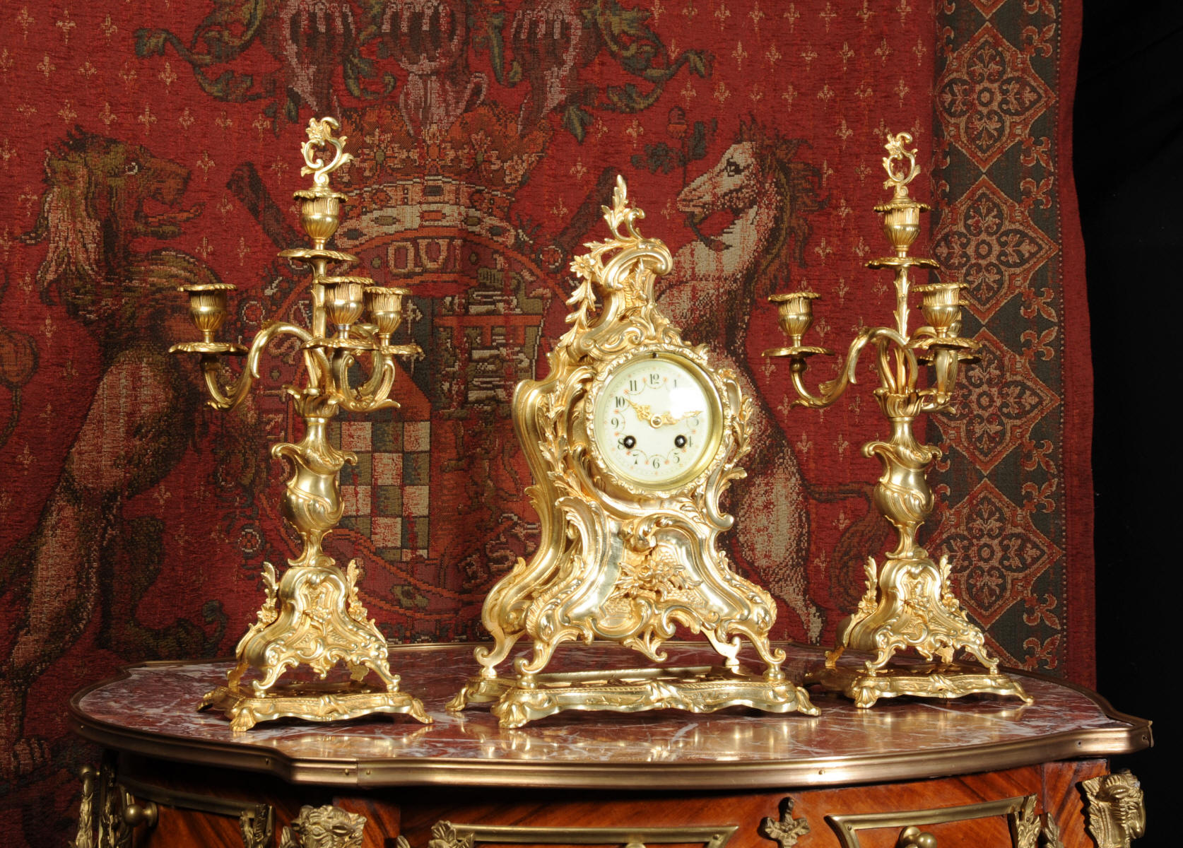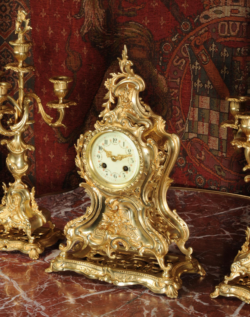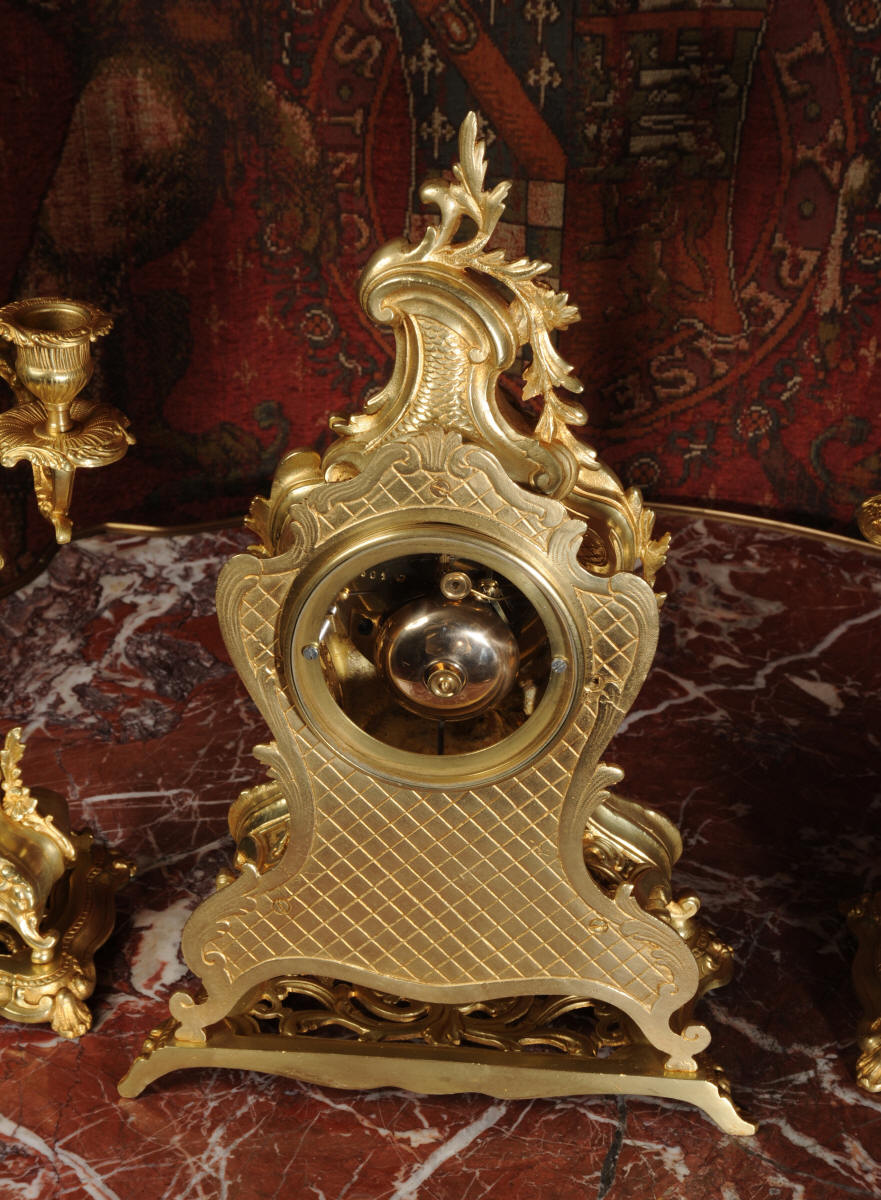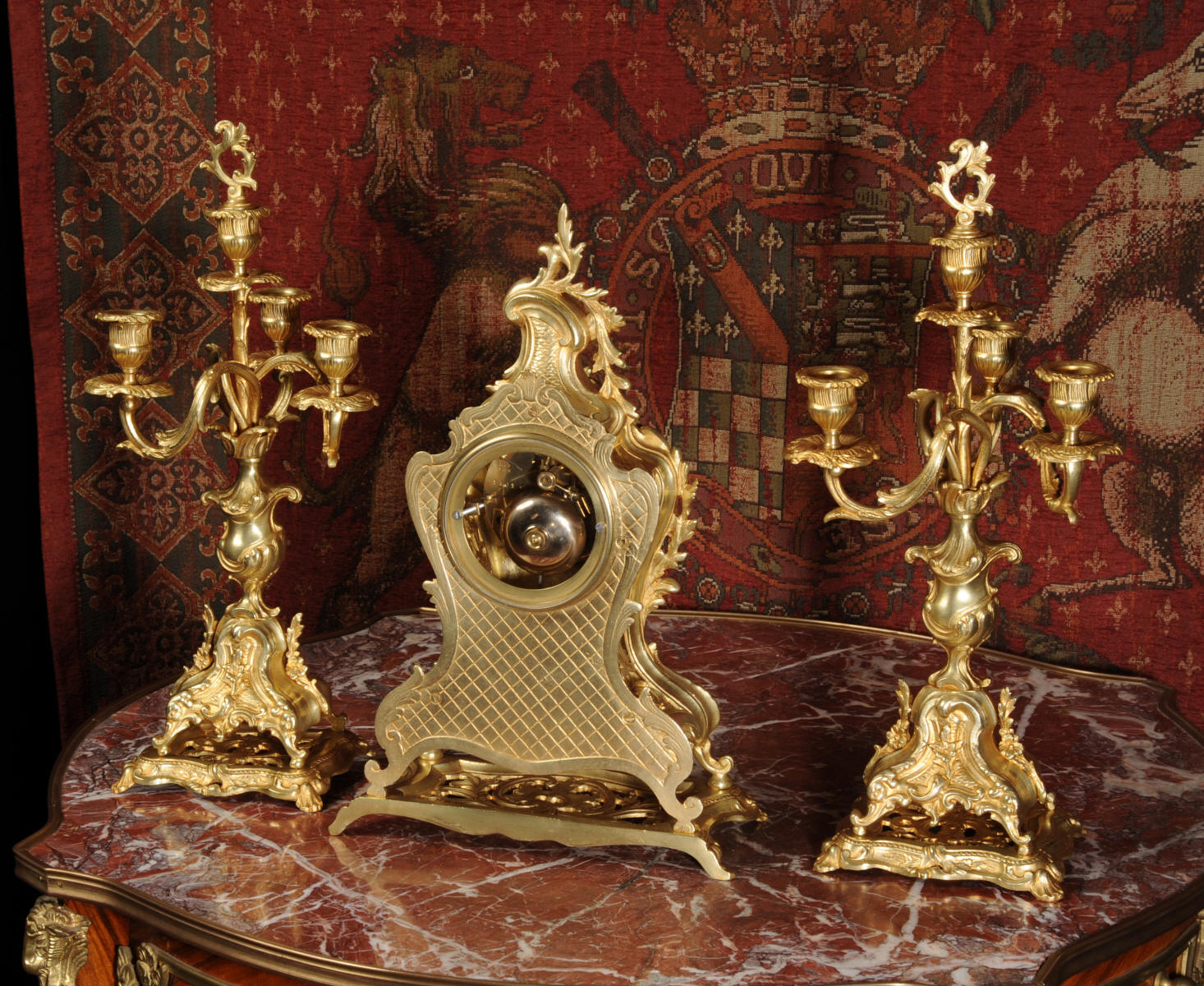 ~ French - Circa 1880 ~ ~~ Excellent condition, fully overhauled ~~ A beautiful original antique French Rococo gilt brass clock set. It is of classic Rococo style, waisted keyhole shape with asymmetric flowing acanthus, 'C' scrolls and floral swags. Both the clock and candelabrum sit on their original integral bases which are elaborately fretted. The sides of the clock are also fretted to allow a glimpse of the pendulum swinging within and the rear door is glazed to allow the movement to be seen. Candelabra are similarly styled and feature 3 arms modelled as entwined foliage. The original snuffers sit in the central nozzles.