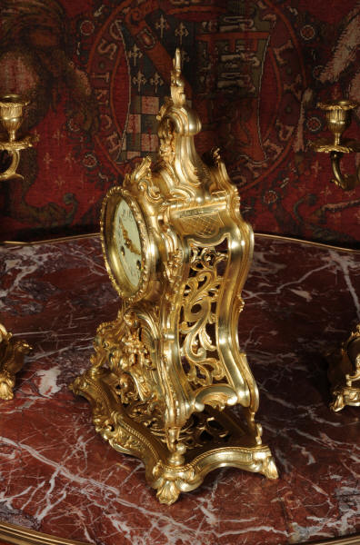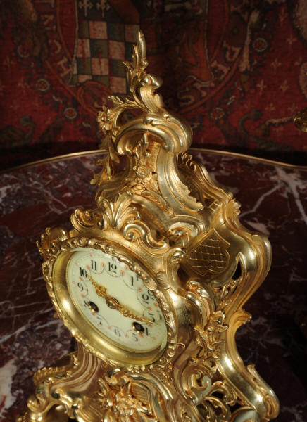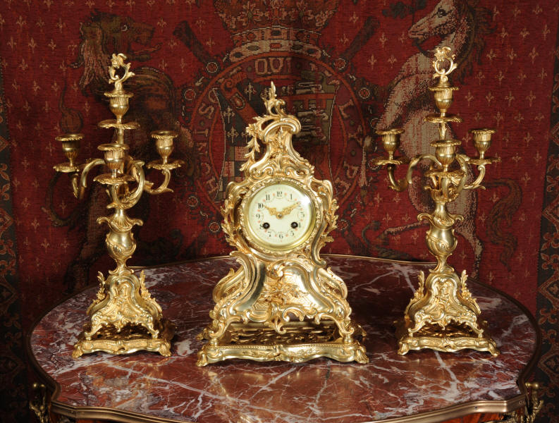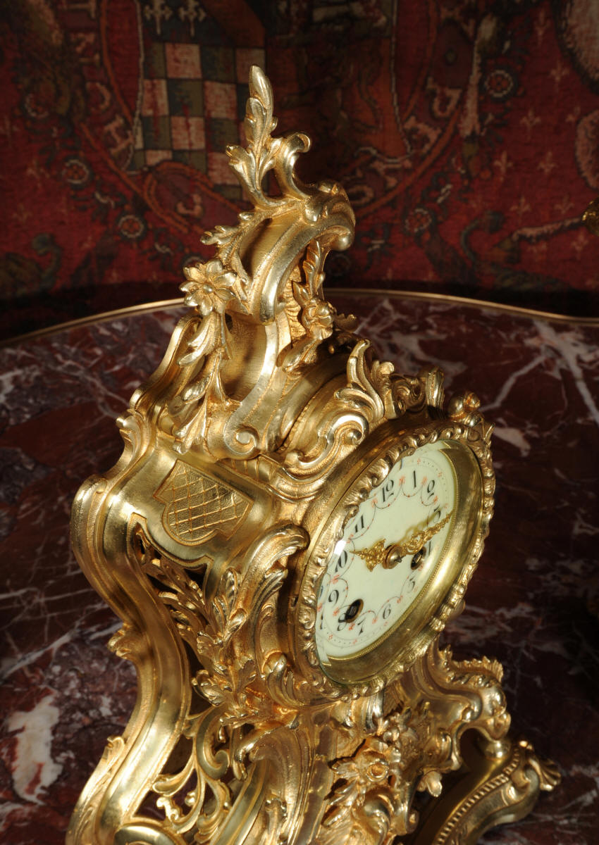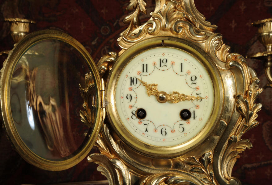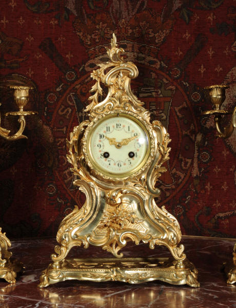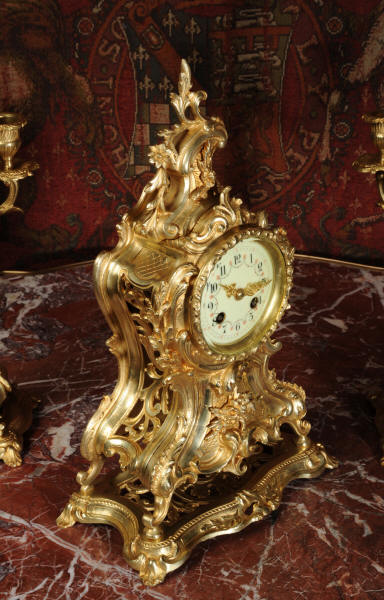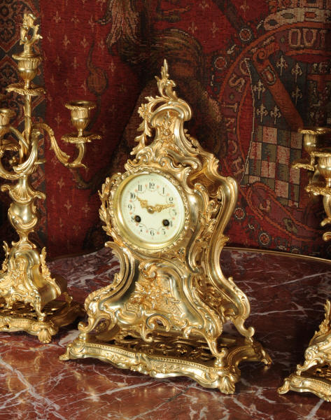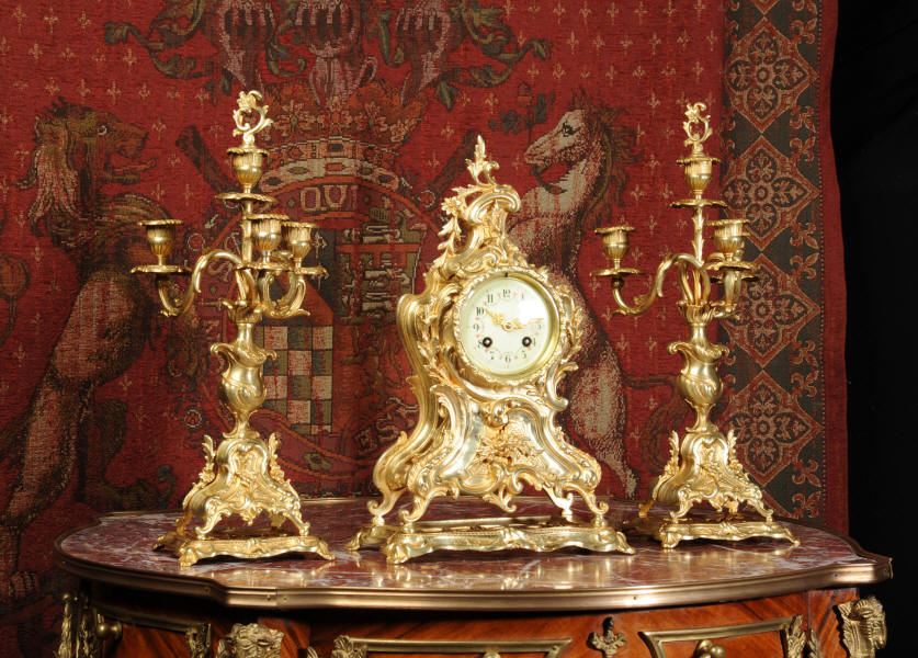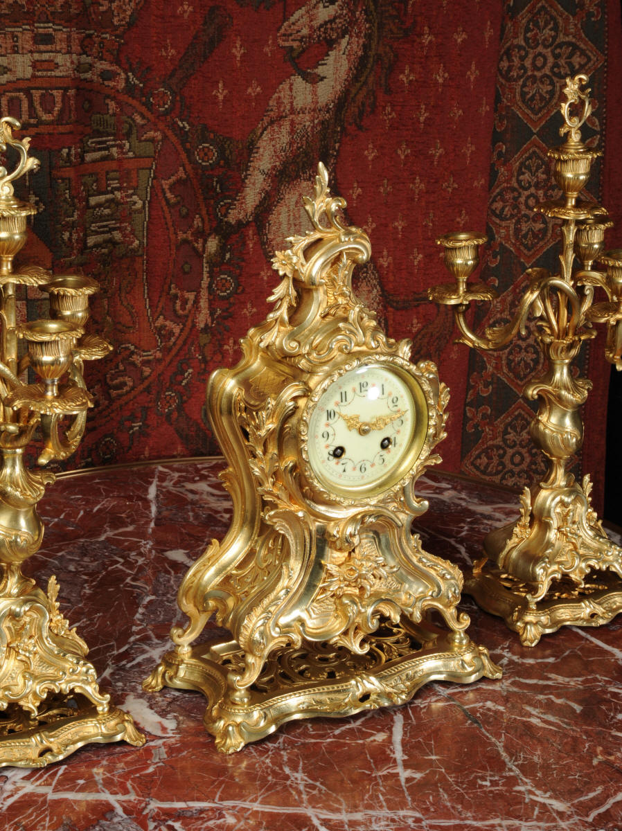 ~ French - Circa 1880 ~ ~~ Excellent condition, fully overhauled ~~ A beautiful original antique French Rococo gilt brass clock set. It is of classic Rococo style, waisted keyhole shape with asymmetric flowing acanthus, 'C' scrolls and floral swags. Both the clock and candelabrum sit on their original integral bases which are elaborately fretted. The sides of the clock are also fretted to allow a glimpse of the pendulum swinging within and the rear door is glazed to allow the movement to be seen. Candelabra are similarly styled and feature 3 arms modelled as entwined foliage. The original snuffers sit in the central nozzles.