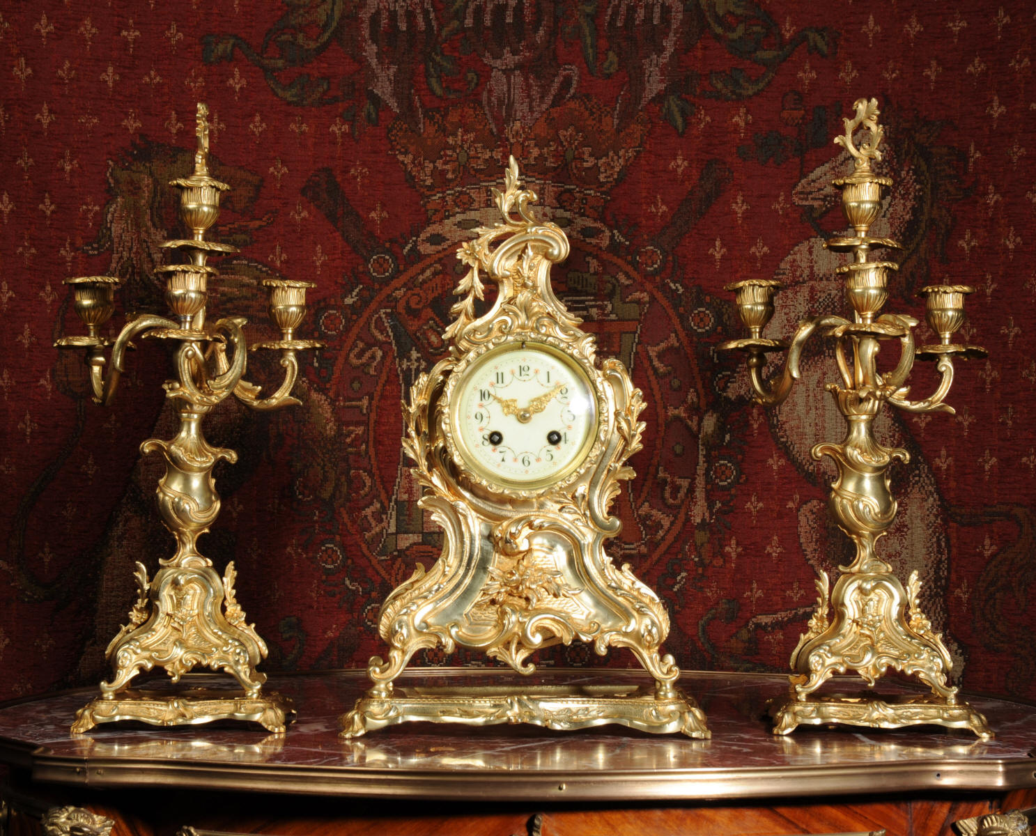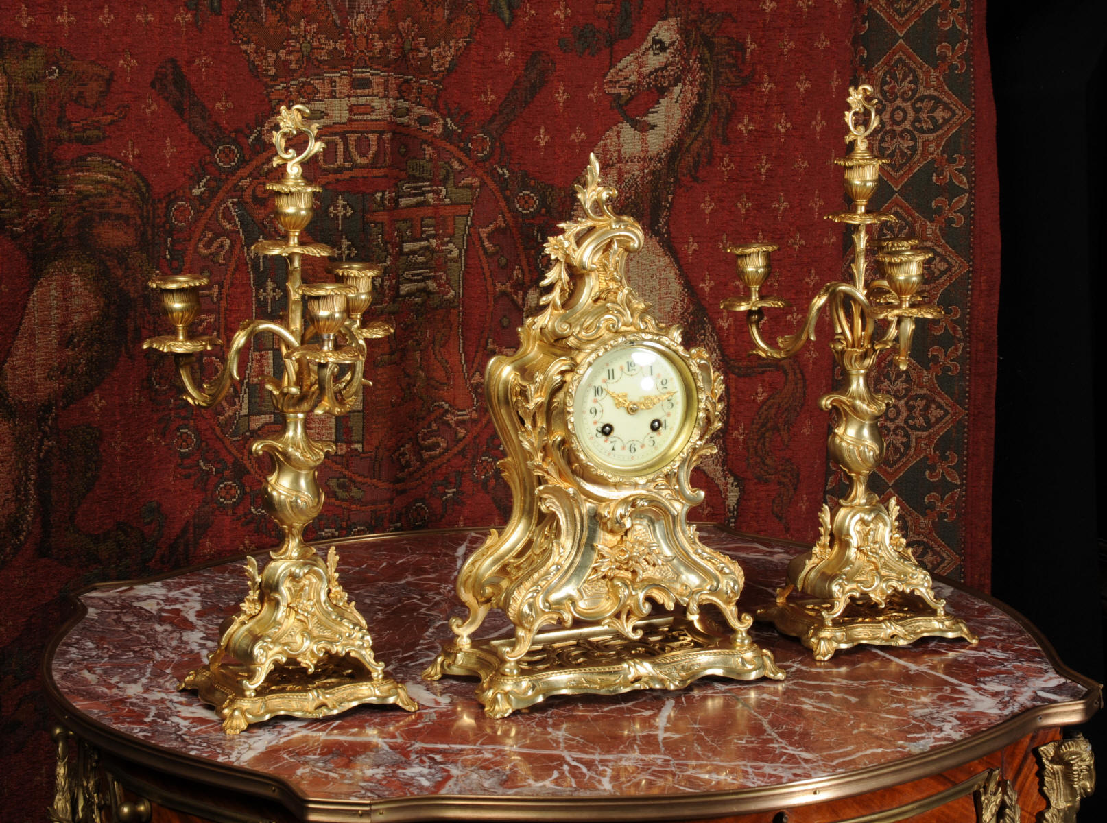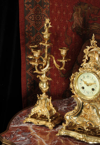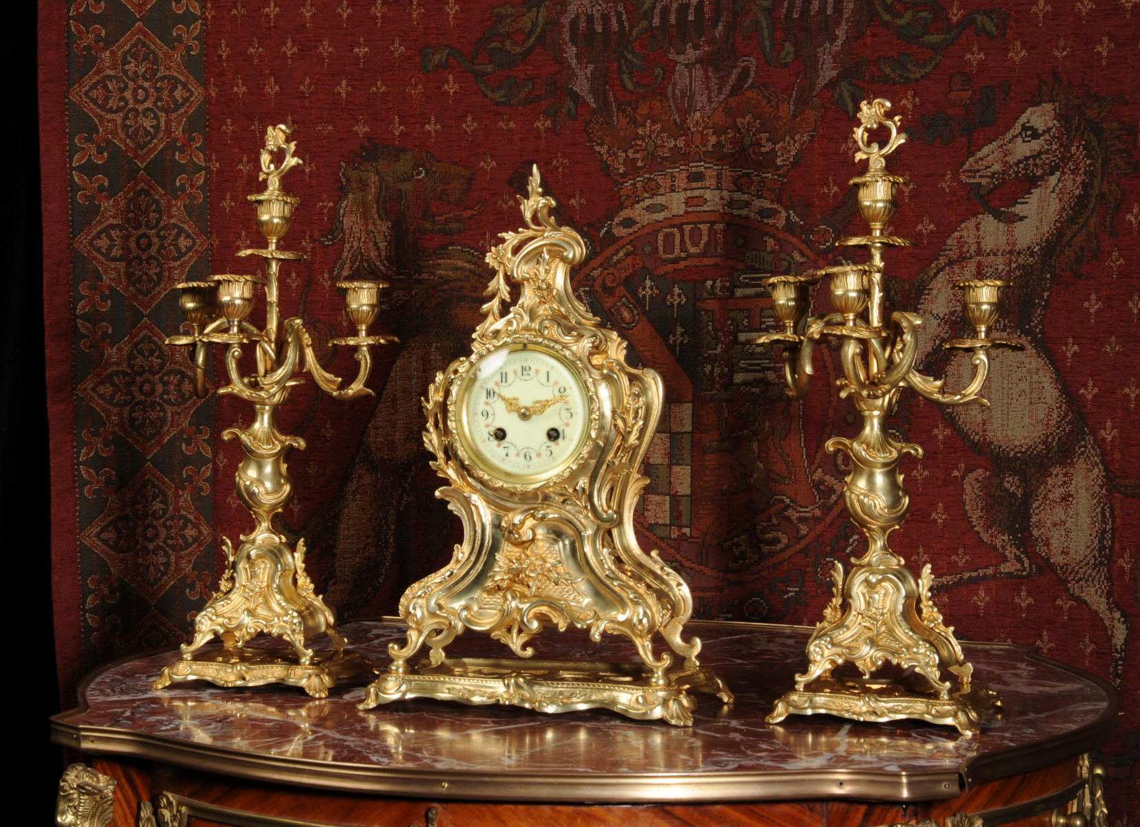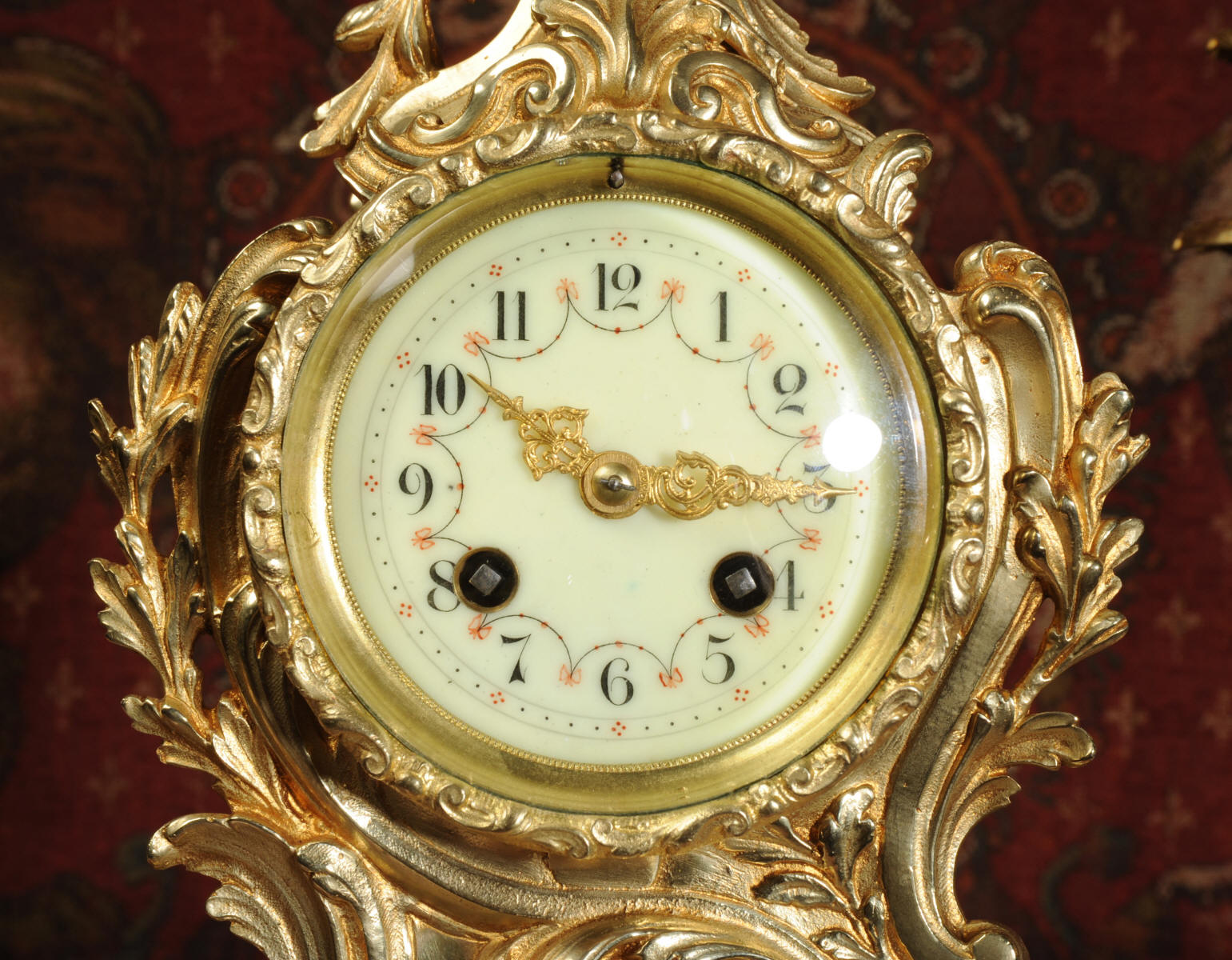 The dial very pretty, it is cream enamel on copper, lettered in black and highlighted in red. It is complete with the original finely cut gilt brass hands. The French movement is by A. D. Mougin and has the clockmakers mark on the movement backplate. It is of high quality and is in excellent clean and running condition having been fully overhauled by our clockmaker. Pendulum is a replacement. It runs for 8 days and strikes the hours and halves on a bell. Click the video clip below to hear the bell and watch the clock running! Condition of the case is excellent, the original gilding is beautifully clean and bright with hardly any wear or discolouration and there are no losses. The dial is also in excellent condition, no chips or scratches. Candelabra are slightly distorted. The set makes a stunning display as you can see below.