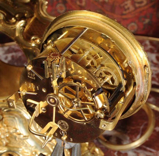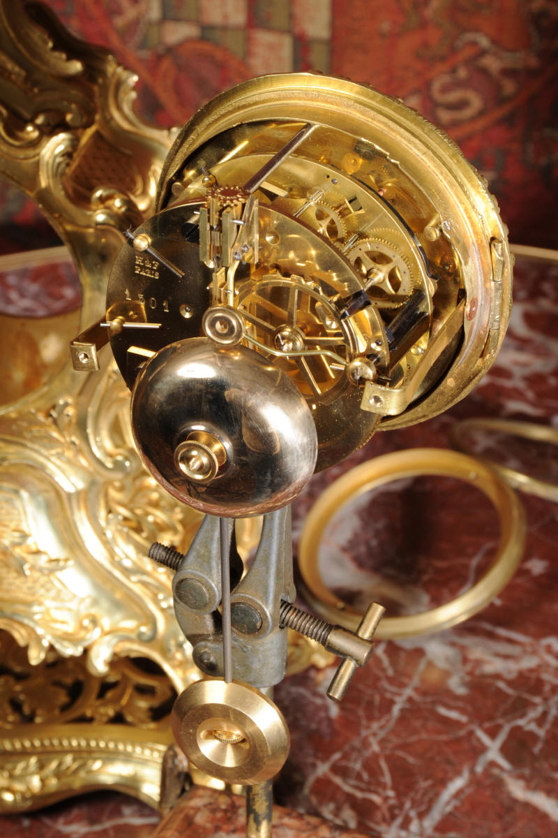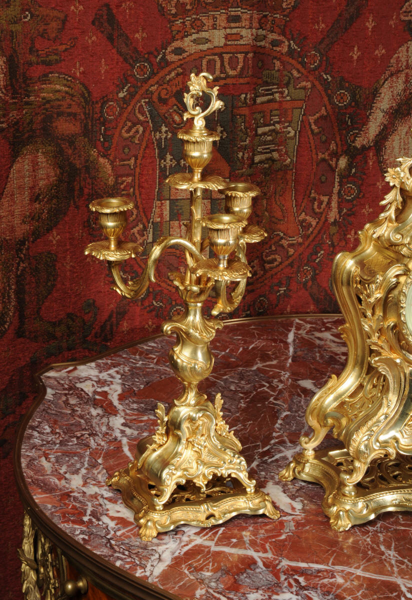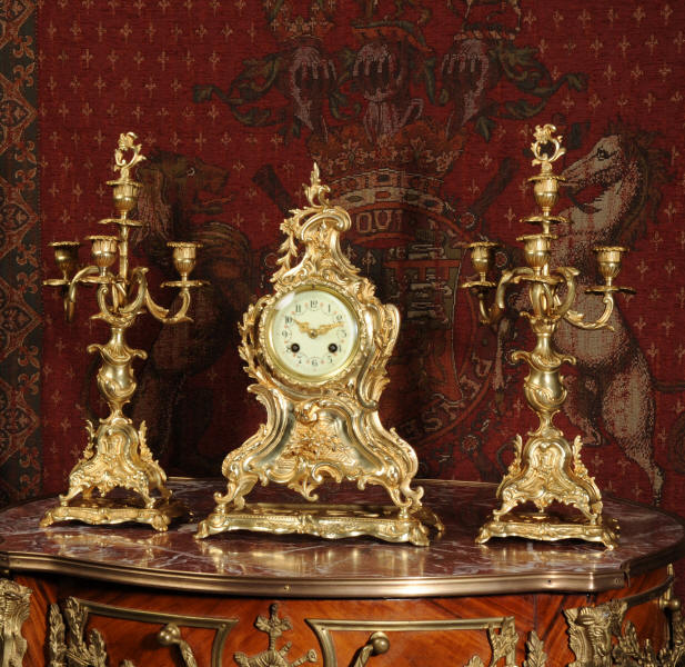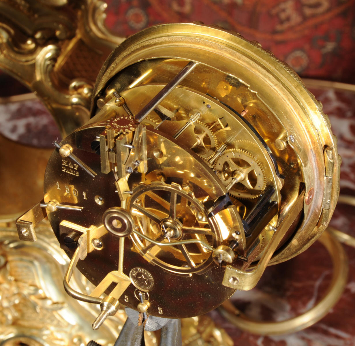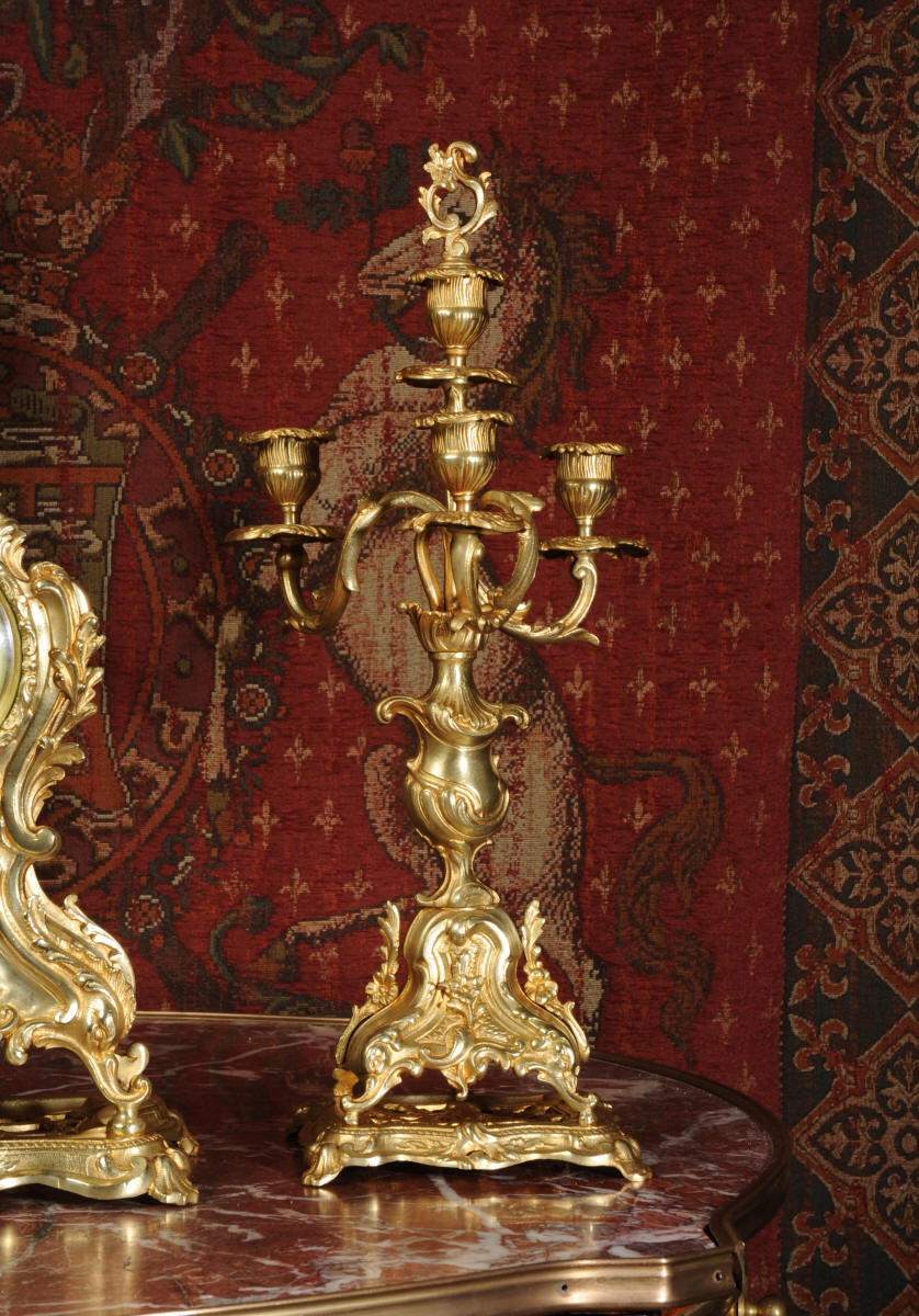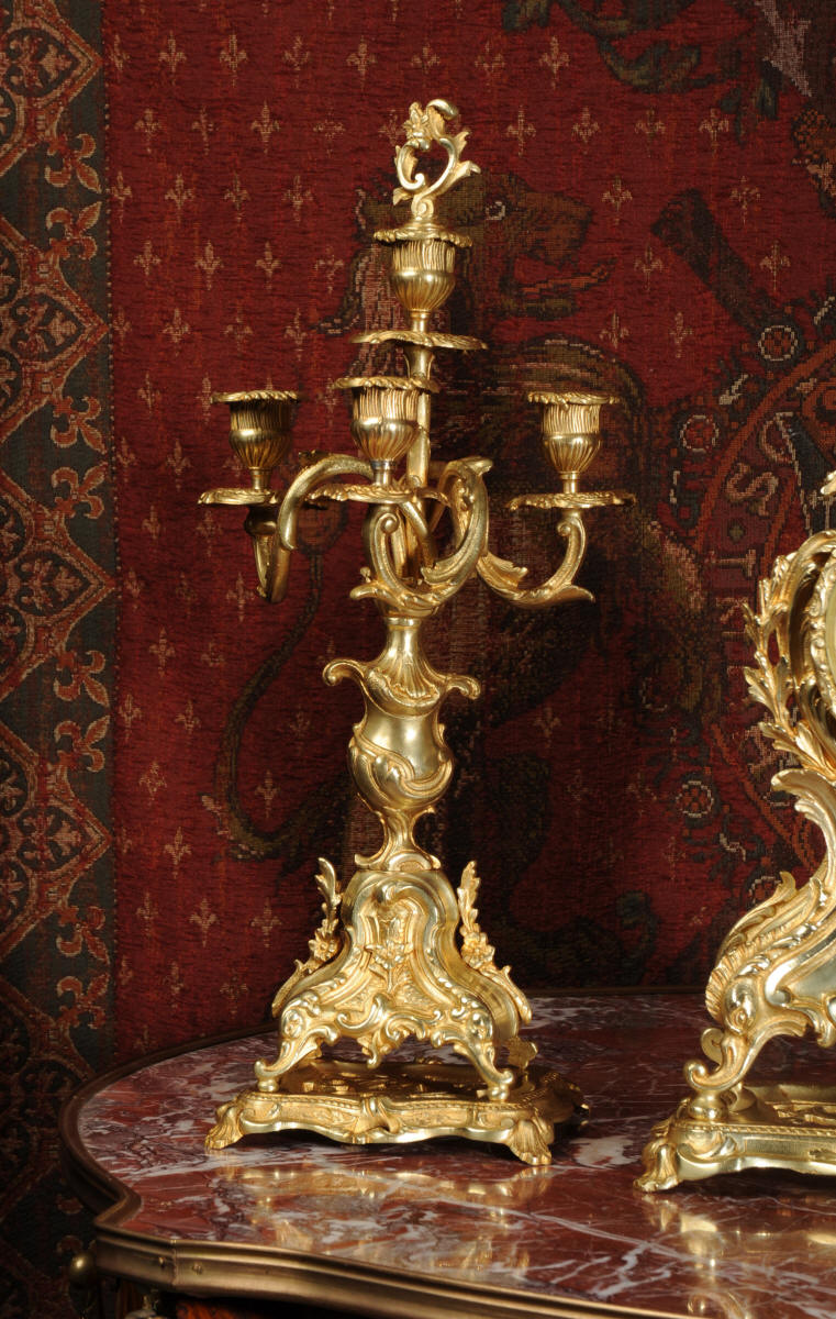 The dial very pretty, it is cream enamel on copper, lettered in black and highlighted in red. It is complete with the original finely cut gilt brass hands. The French movement is by A. D. Mougin and has the clockmakers mark on the movement backplate. It is of high quality and is in excellent clean and running condition having been fully overhauled by our clockmaker. Pendulum is a replacement. It runs for 8 days and strikes the hours and halves on a bell. Click the video clip below to hear the bell and watch the clock running! Condition of the case is excellent, the original gilding is beautifully clean and bright with hardly any wear or discolouration and there are no losses. The dial is also in excellent condition, no chips or scratches. Candelabra are slightly distorted. The set makes a stunning display as you can see below.