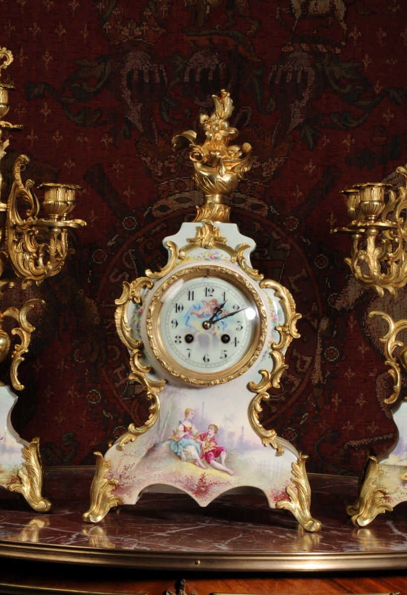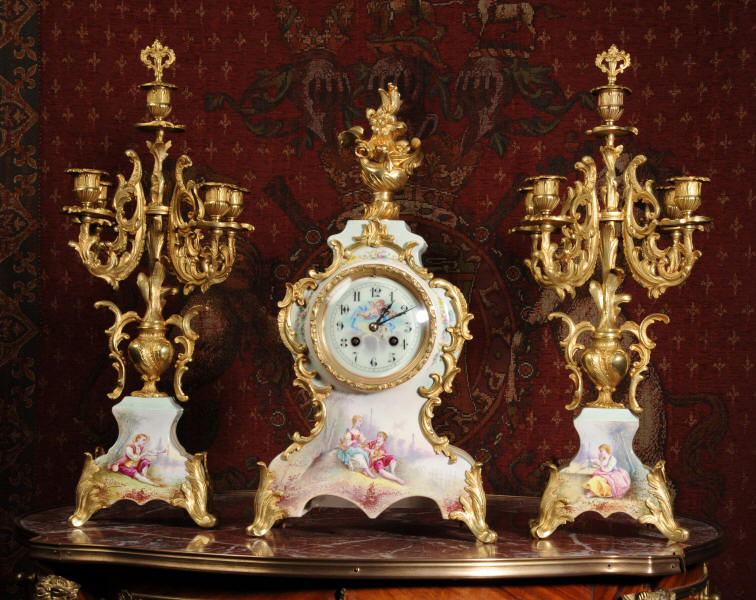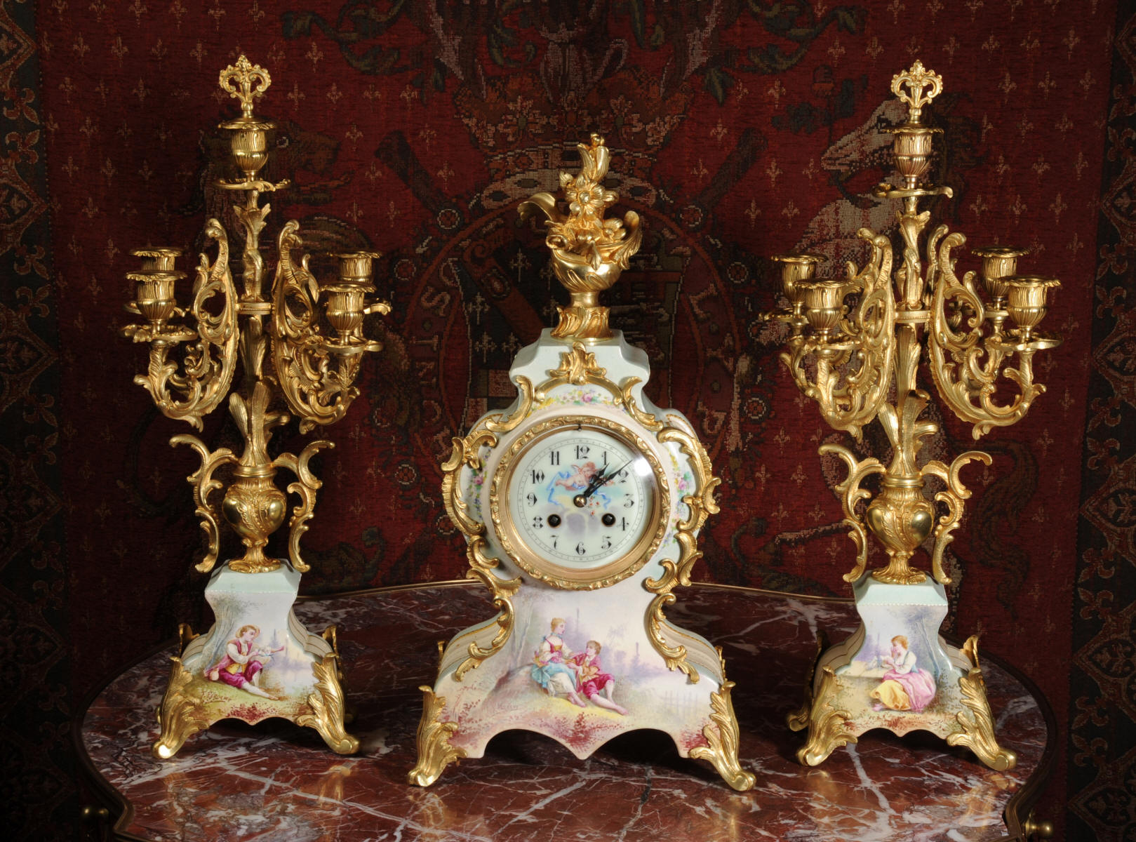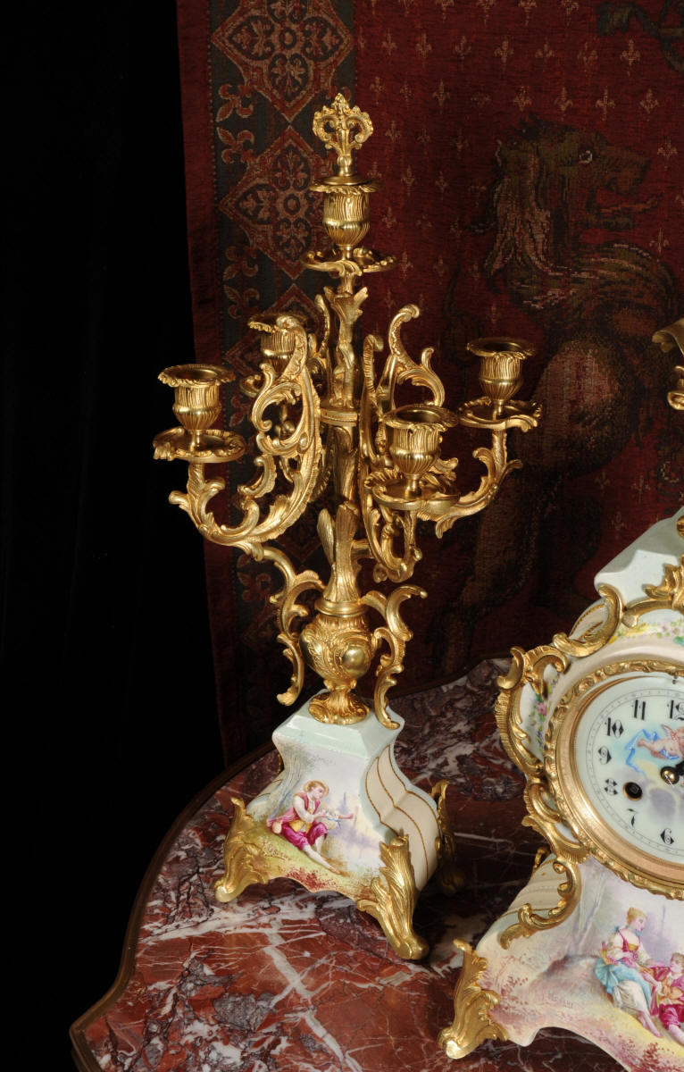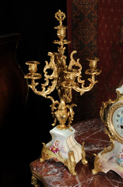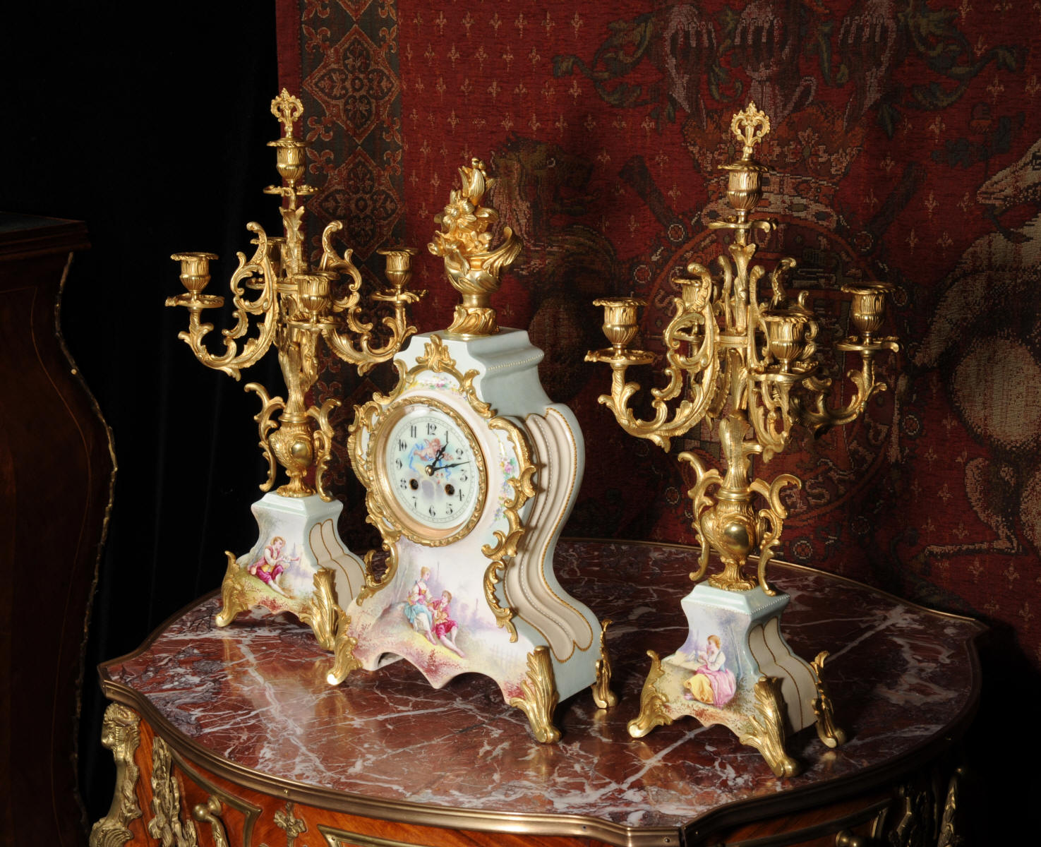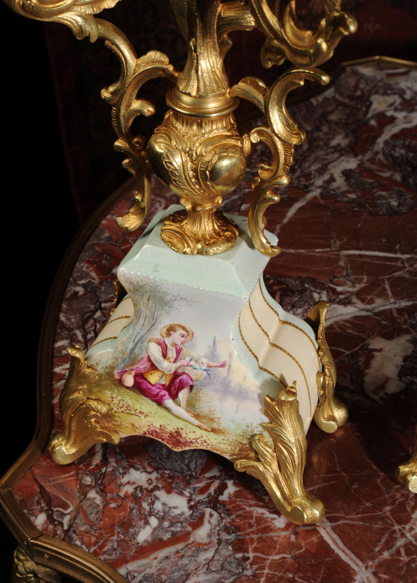 The bodies are mounted with ormolu (gilt bronze) in the Rococo style. The clock stands on acanthus bracket feet with a large and elaborate Rococo boat shaped urn to the top. Candelabra are conforming in style with four branches and the original snuffers. The dial is stunning, enamel on copper, delicately painted with a cherub on a pale blue ground. It is complete with original blued steel hands. The French movement is by Japy Freres and is of this makers usual high quality. The Japy Freres mark is on the movement backplate. It is in excellent clean and running condition having been fully overhauled by our clockmaker. Pendulum is original. It runs for 8 days and strikes the hours and halves on a bell. Click the video clip below to hear the bell and watch the clock running! Condition of the case is excellent, the original gilding is beautifully clean and bright with hardly any wear or discolouration and there are no losses. The Faience is in excellent condition, there are just a couple of original firing marks and some very slight wear to the glaze on the top. The glaze has lightly crazed which only adds to its antiques appearance. The dial is also in excellent condition, no chips or scratches. Candelabra are slightly distorted. The set makes a stunning display as you can see below.