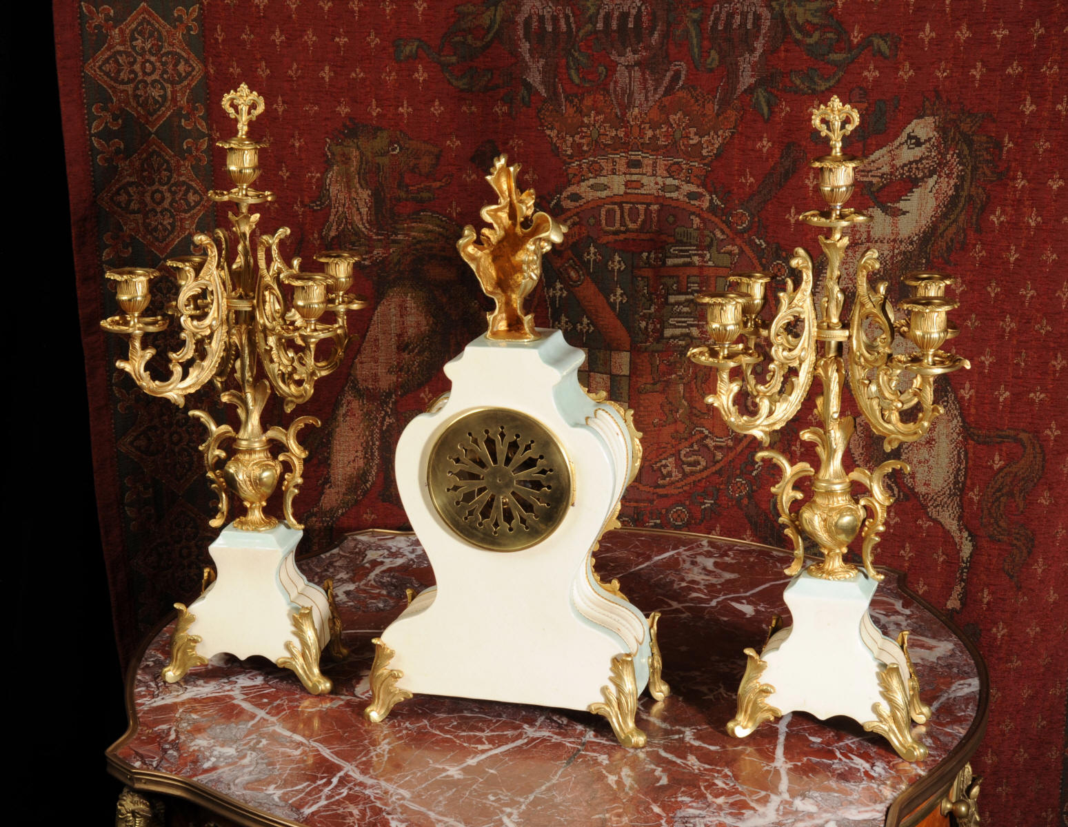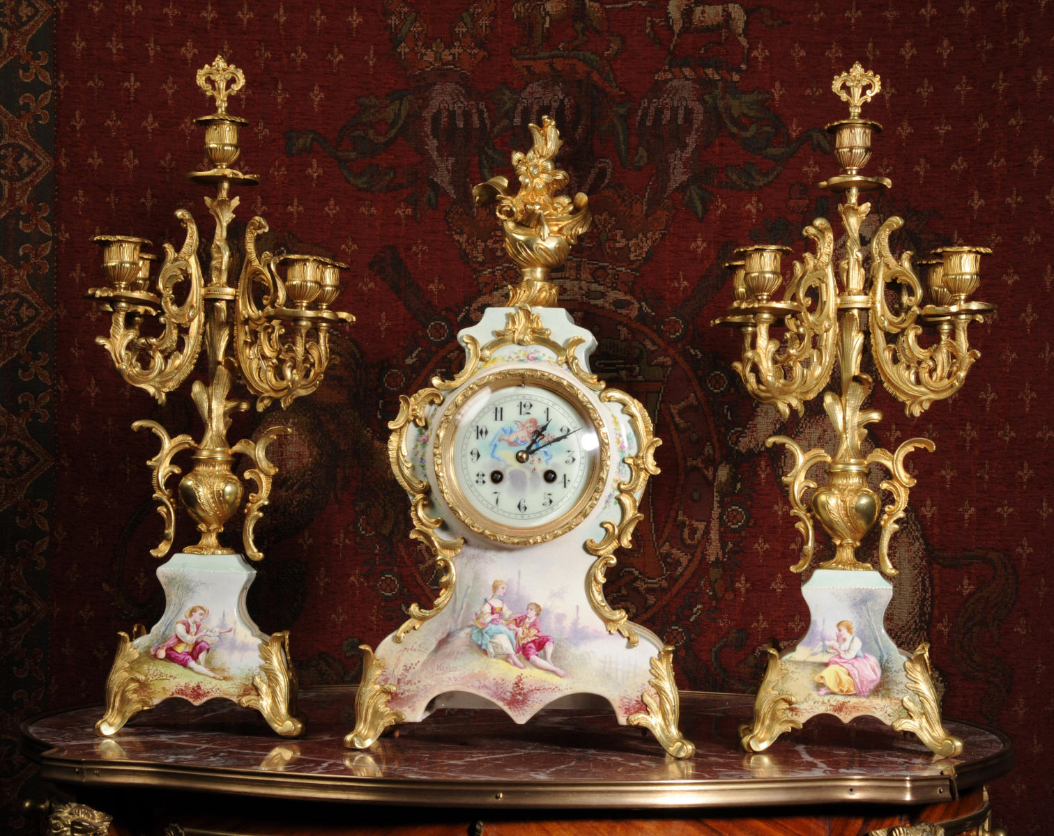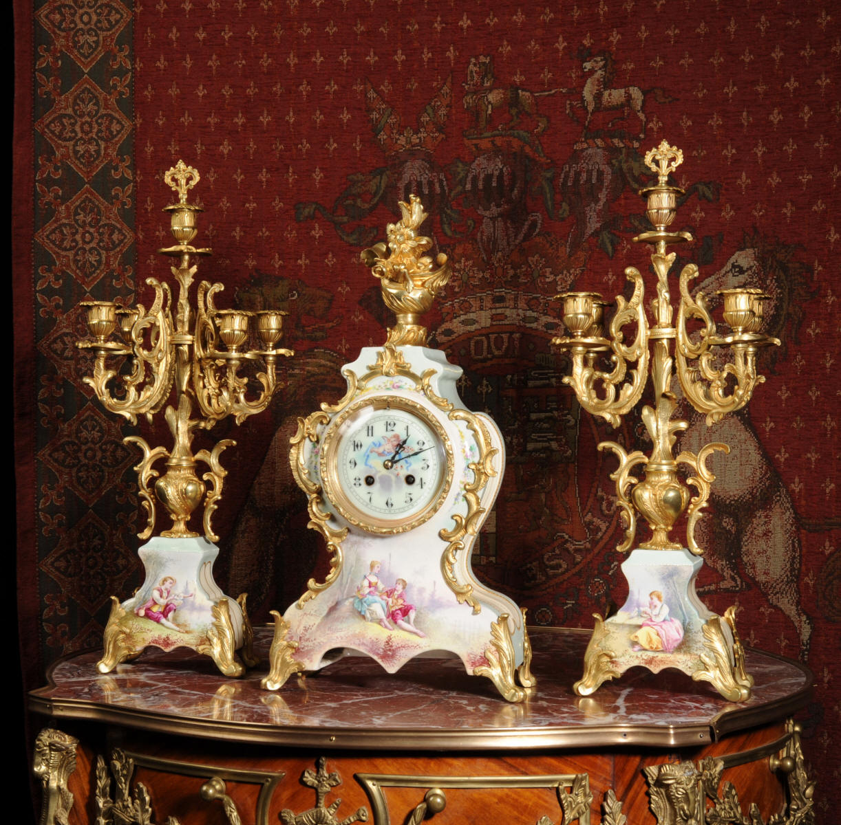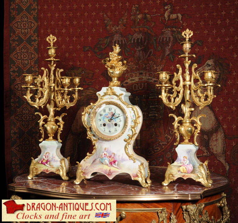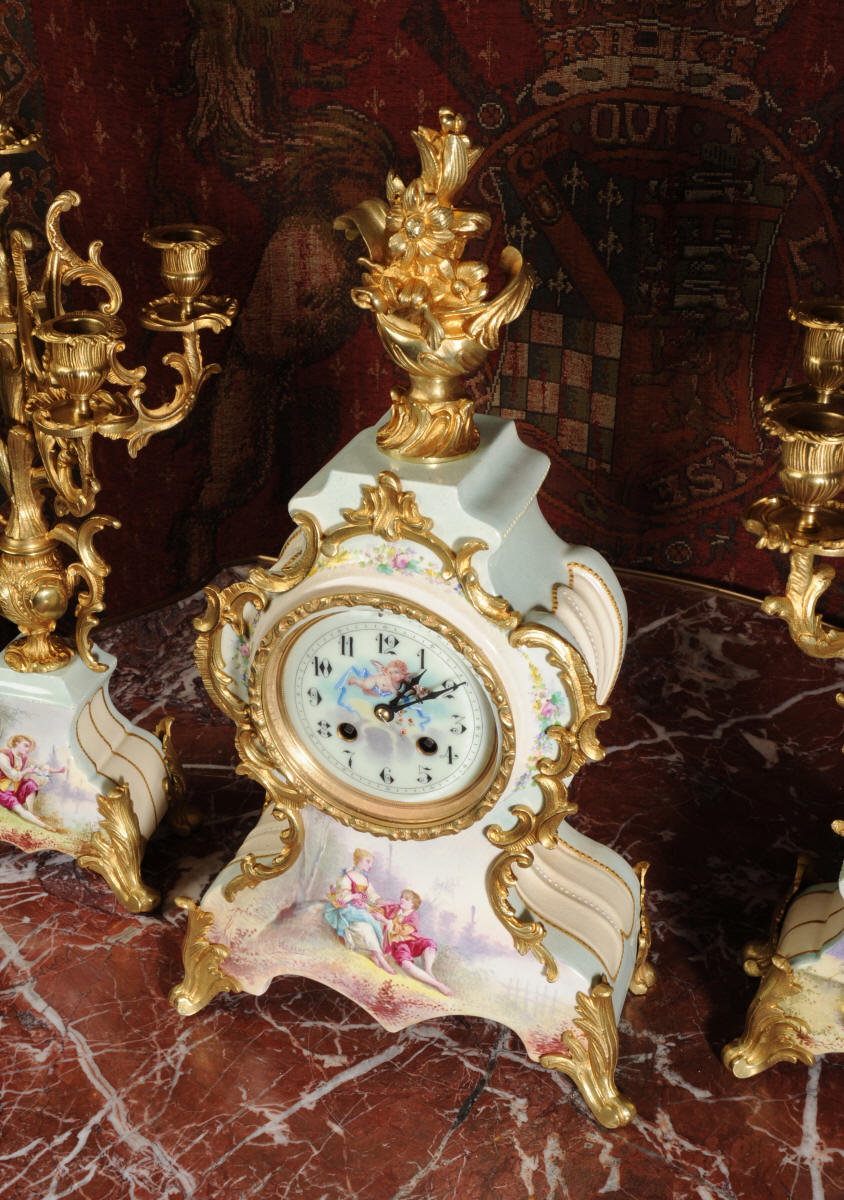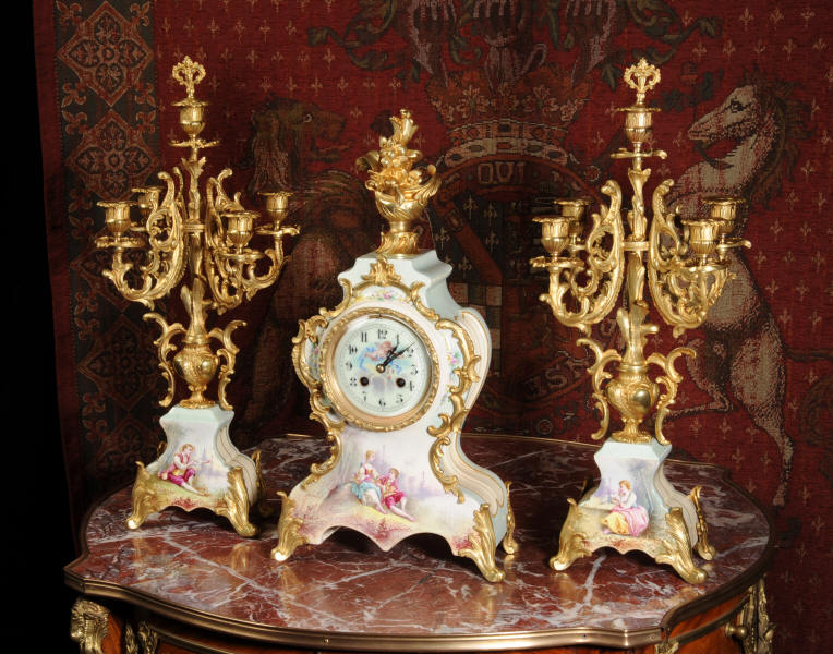 The bodies are mounted with ormolu (gilt bronze) in the Rococo style. The clock stands on acanthus bracket feet with a large and elaborate Rococo boat shaped urn to the top. Candelabra are conforming in style with four branches and the original snuffers. The dial is stunning, enamel on copper, delicately painted with a cherub on a pale blue ground. It is complete with original blued steel hands. The French movement is by Japy Freres and is of this makers usual high quality. The Japy Freres mark is on the movement backplate. It is in excellent clean and running condition having been fully overhauled by our clockmaker. Pendulum is original. It runs for 8 days and strikes the hours and halves on a bell. Click the video clip below to hear the bell and watch the clock running! Condition of the case is excellent, the original gilding is beautifully clean and bright with hardly any wear or discolouration and there are no losses. The Faience is in excellent condition, there are just a couple of original firing marks and some very slight wear to the glaze on the top. The glaze has lightly crazed which only adds to its antiques appearance. The dial is also in excellent condition, no chips or scratches. Candelabra are slightly distorted. The set makes a stunning display as you can see below.