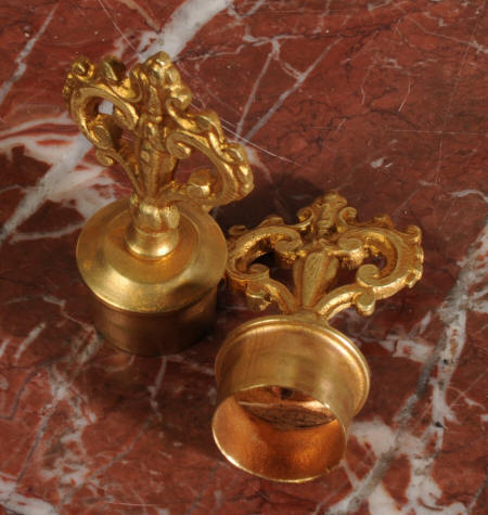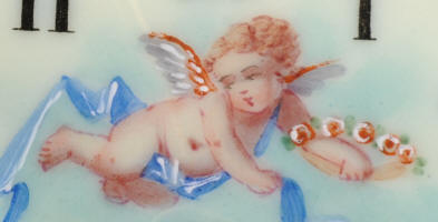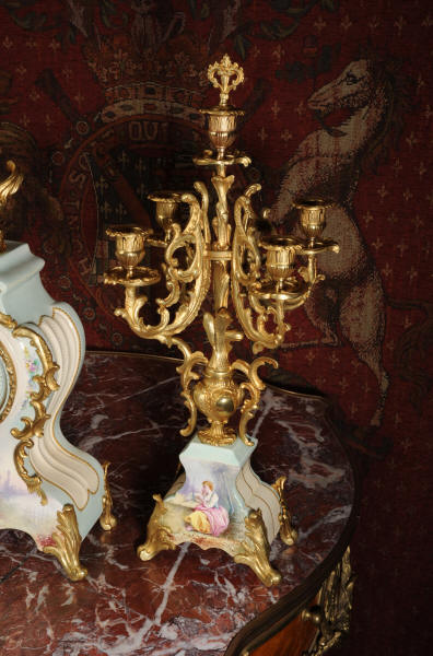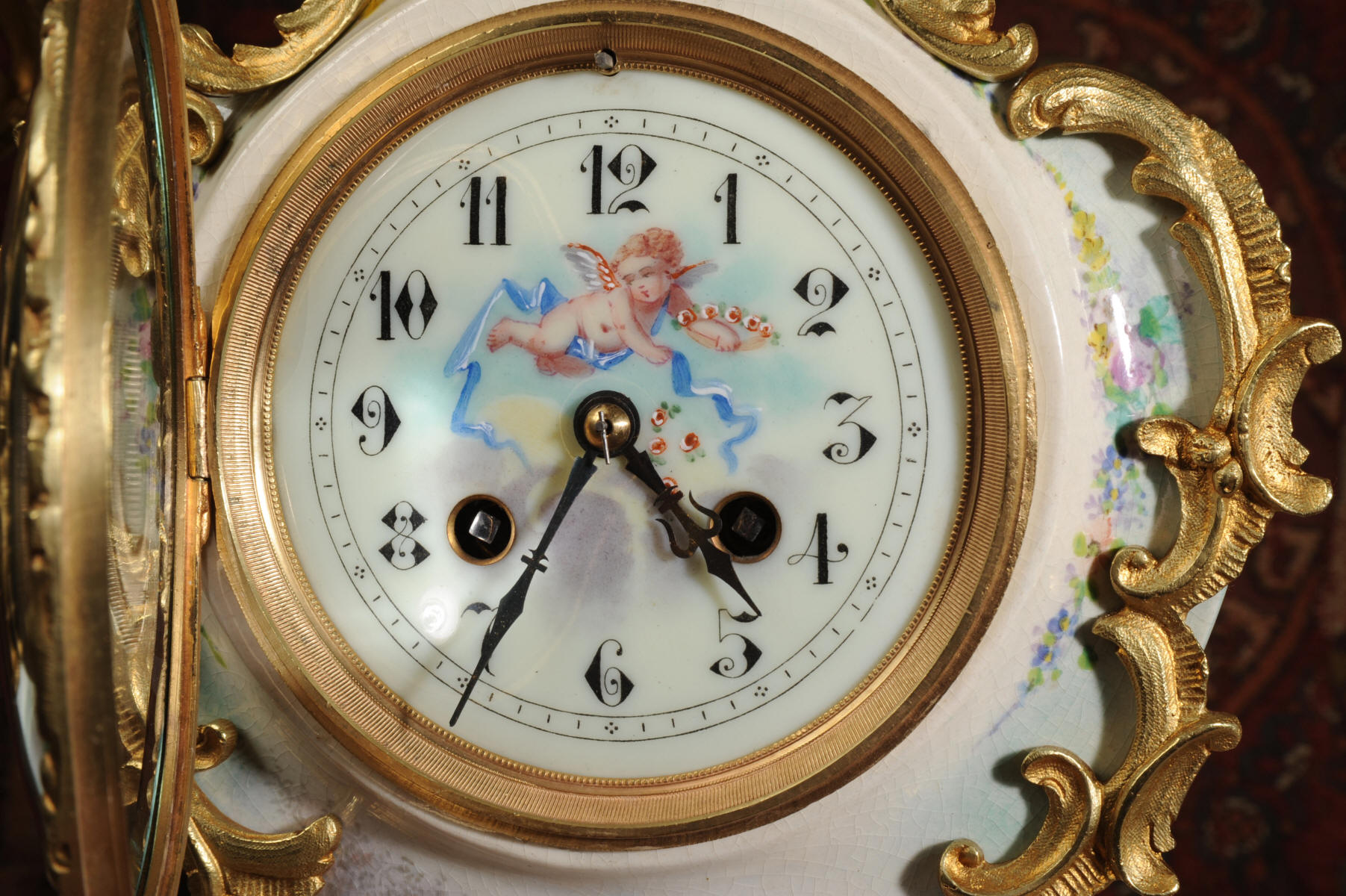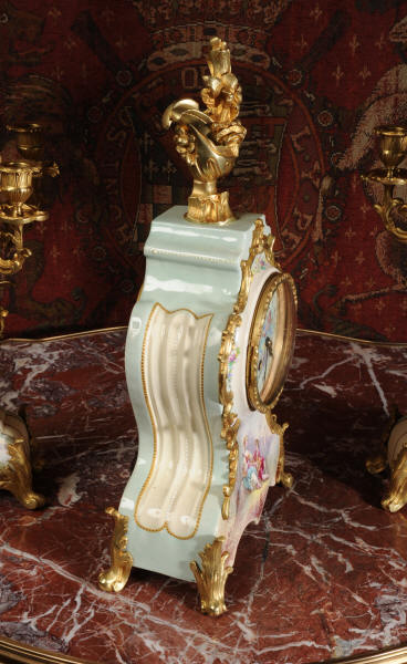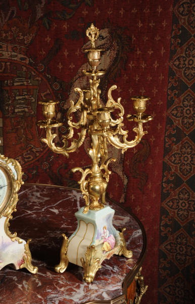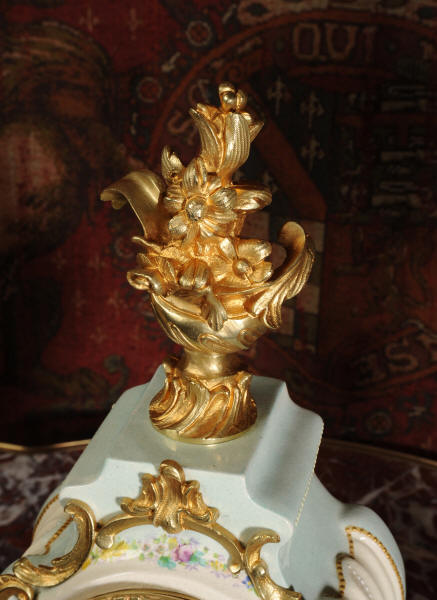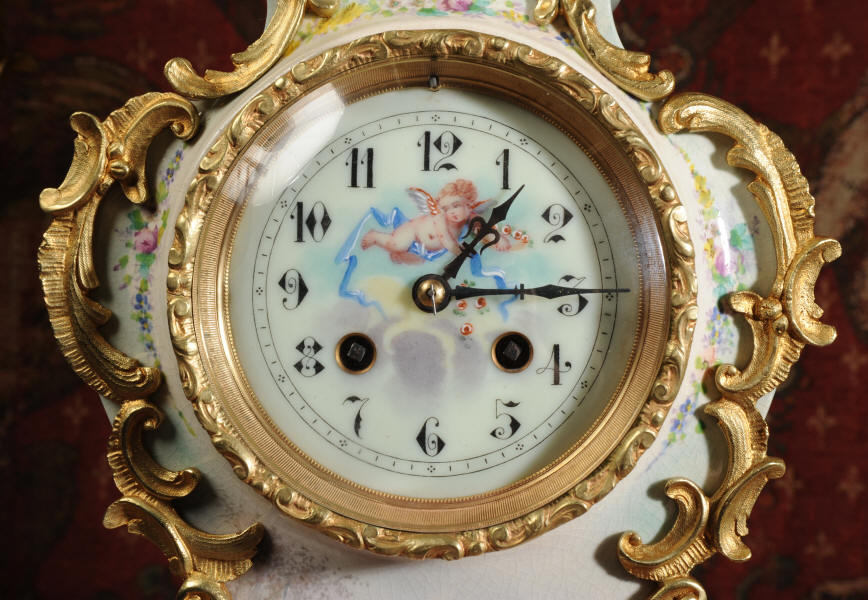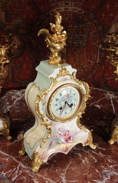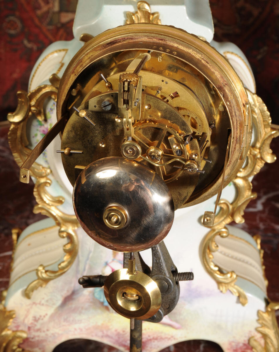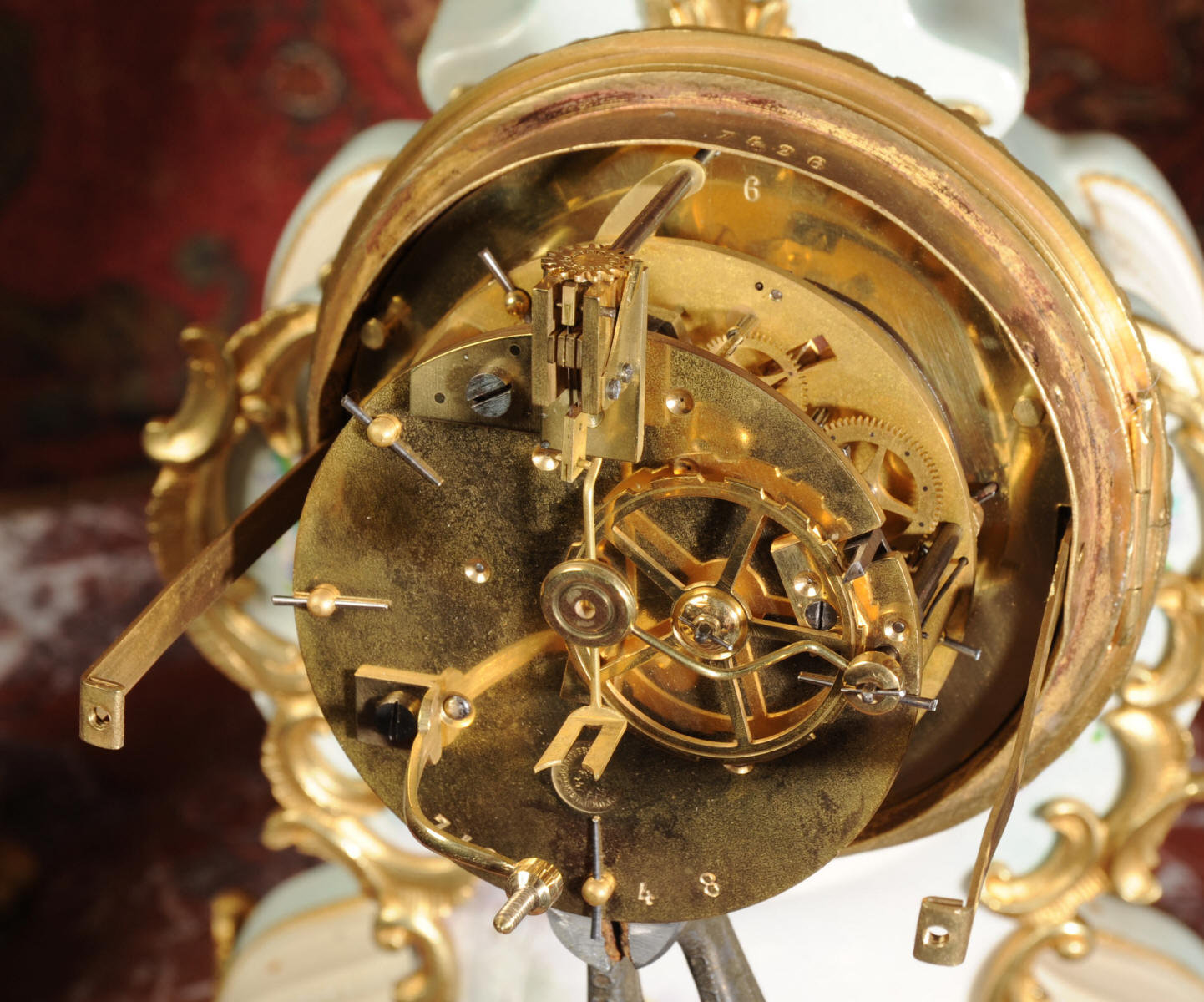 The bodies are mounted with ormolu (gilt bronze) in the Rococo style. The clock stands on acanthus bracket feet with a large and elaborate Rococo boat shaped urn to the top. Candelabra are conforming in style with four branches and the original snuffers. The dial is stunning, enamel on copper, delicately painted with a cherub on a pale blue ground. It is complete with original blued steel hands. The French movement is by Japy Freres and is of this makers usual high quality. The Japy Freres mark is on the movement backplate. It is in excellent clean and running condition having been fully overhauled by our clockmaker. Pendulum is original. It runs for 8 days and strikes the hours and halves on a bell. Click the video clip below to hear the bell and watch the clock running! Condition of the case is excellent, the original gilding is beautifully clean and bright with hardly any wear or discolouration and there are no losses. The Faience is in excellent condition, there are just a couple of original firing marks and some very slight wear to the glaze on the top. The glaze has lightly crazed which only adds to its antiques appearance. The dial is also in excellent condition, no chips or scratches. Candelabra are slightly distorted. The set makes a stunning display as you can see below.