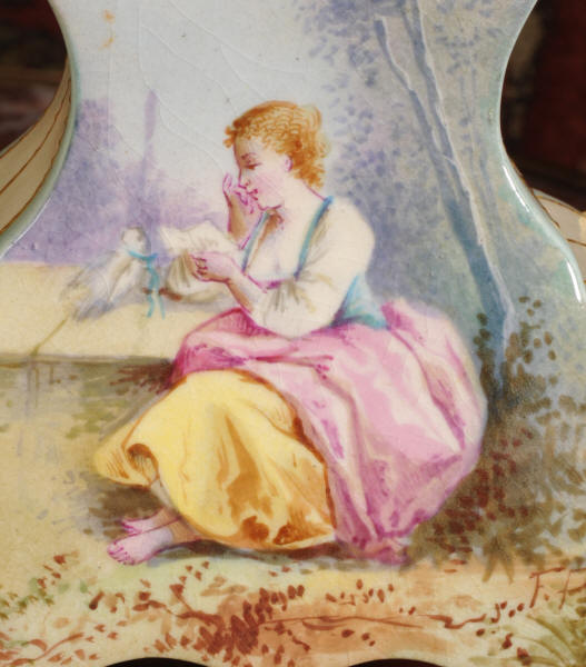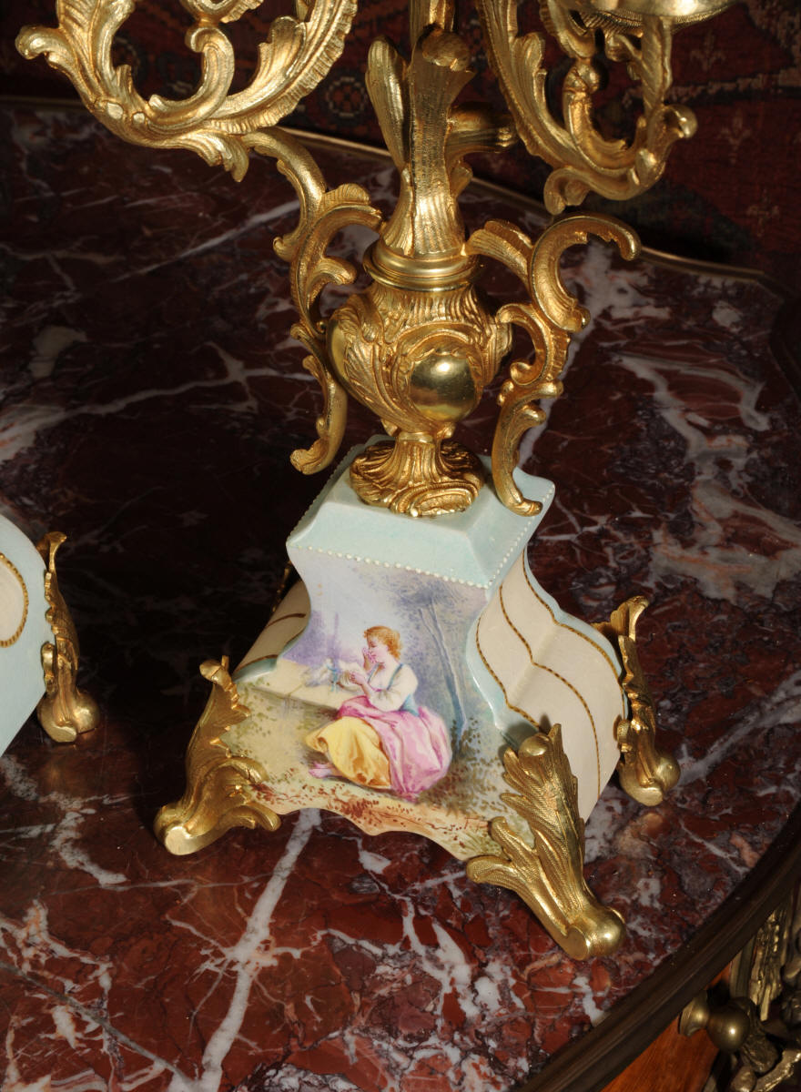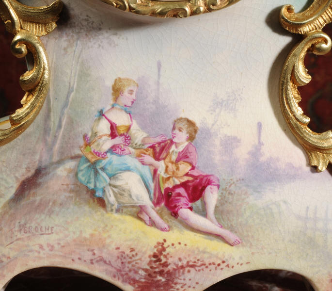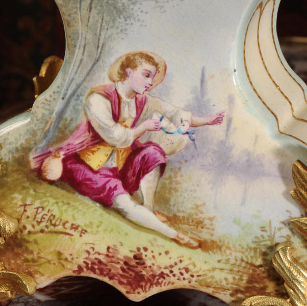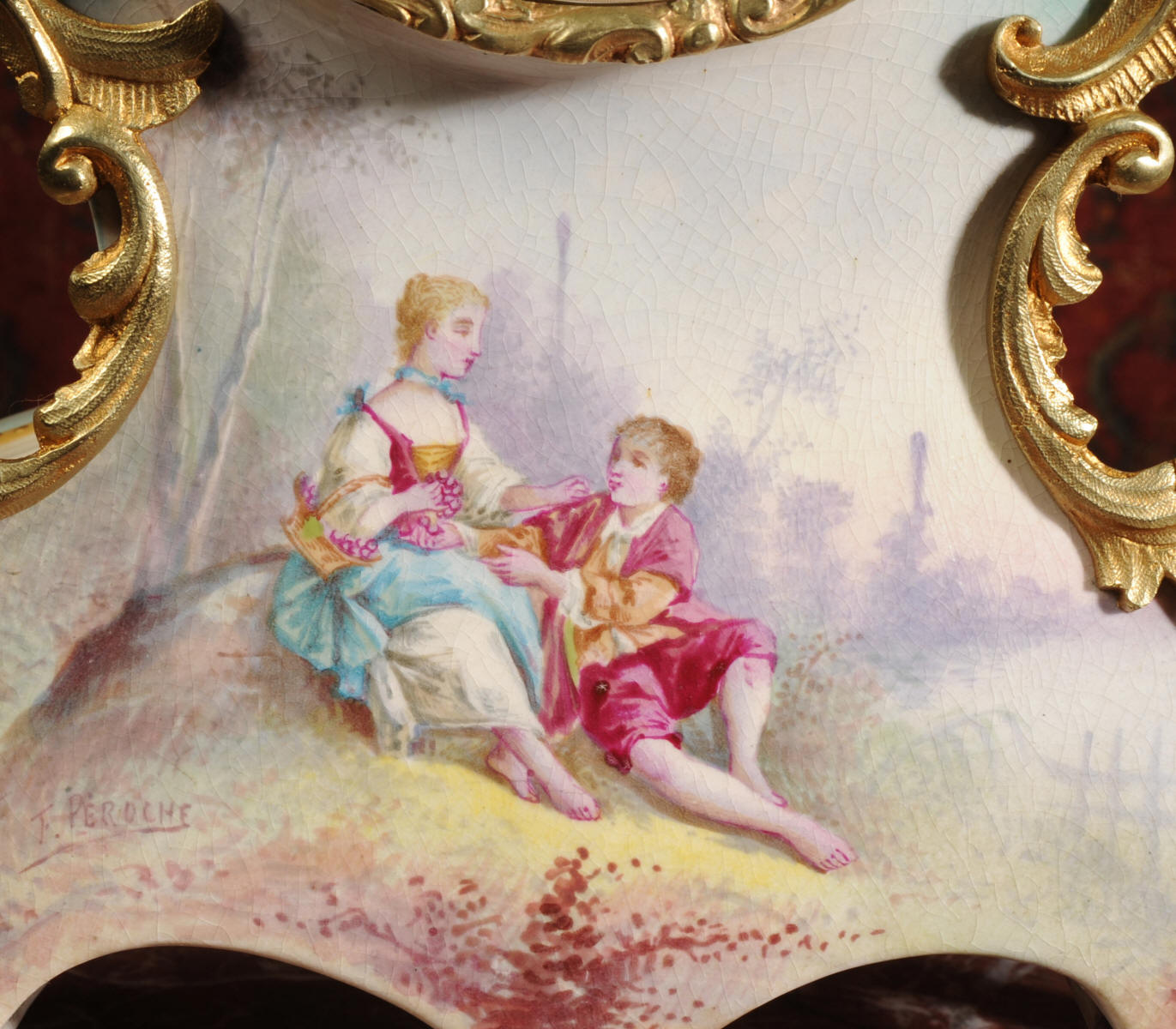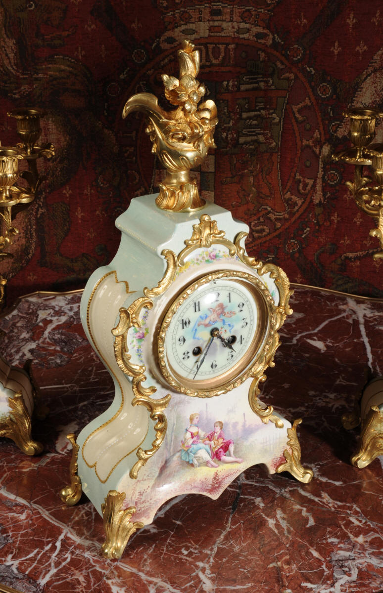 ~ French - Circa 1880 ~ ~~ Excellent condition, fully overhauled ~~ A beautiful and very decorative original antique French three piece candelabra clock set. The bodies are made of faience (pottery), very delicately decorated with scenes of a young couple in a country setting with a pale blue ground. Each piece is signed by the artist, F Perouche. One candelabrum has the gentleman reading a love letter delivered by a dove. On the other candelabrum she also reads a love letter and on the front of the clock they meet in a country park.