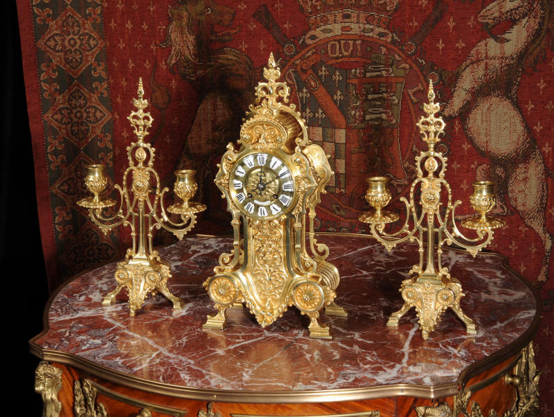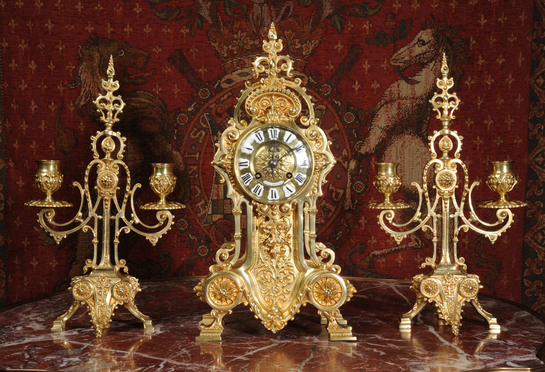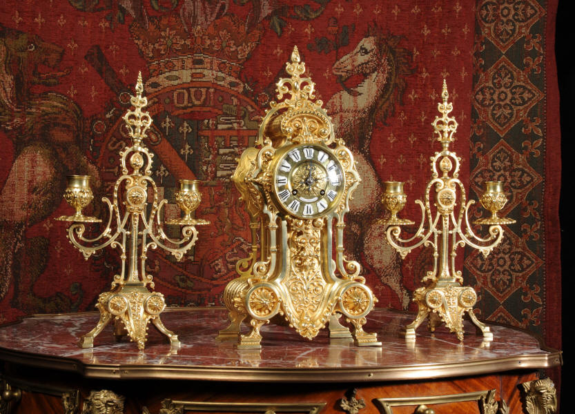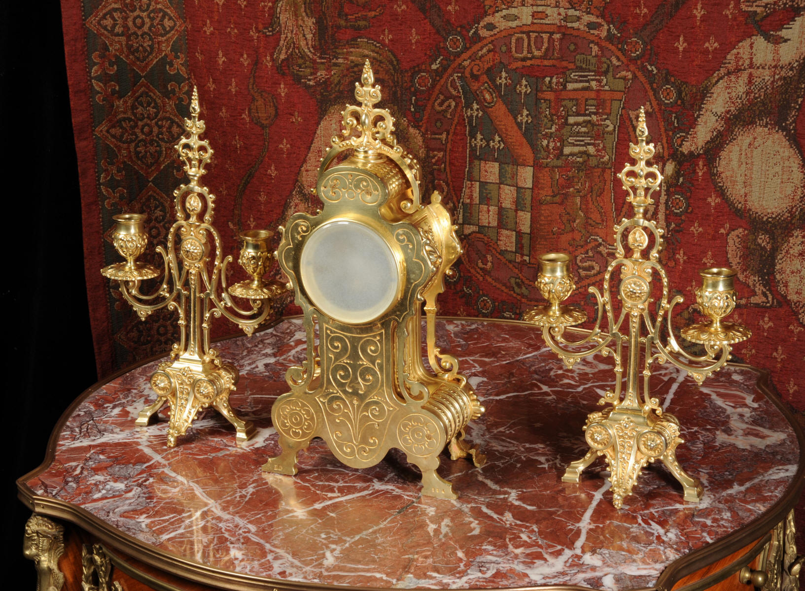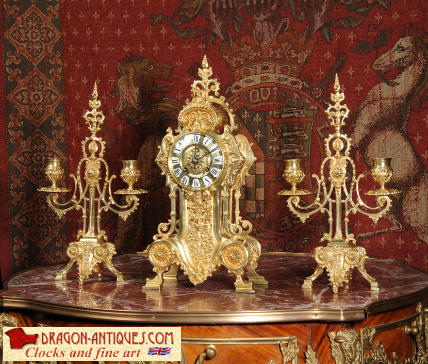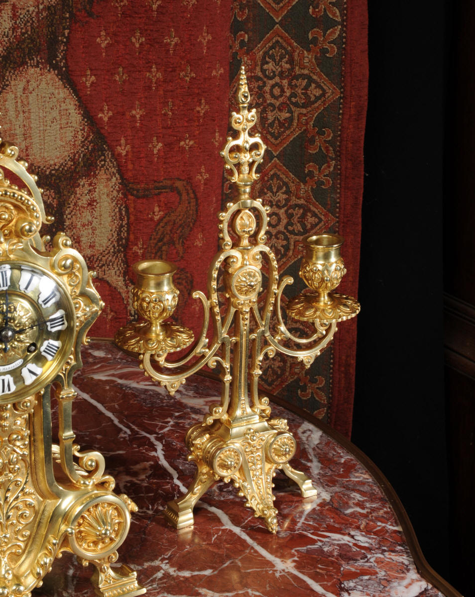 ~ French - Circa 1870 ~ ~~ Excellent condition, fully overhauled ~~ A stunning original antique French boudoir clock set. It is beautifully modelled in gilt brass, top quality and finely finished. It is in the Louis XVI style, key hole shaped and profusely decorated with scrolling foliage and roundels. Candelabra are conforming in style with two branches, the design of both the clock and the set is such that it will stand easily on a narrow mantle. The clock set is unusual in having each individual component marked with the case makers mark B. D. along with the movement serial number on the rear foot.