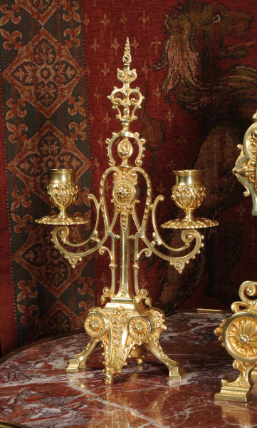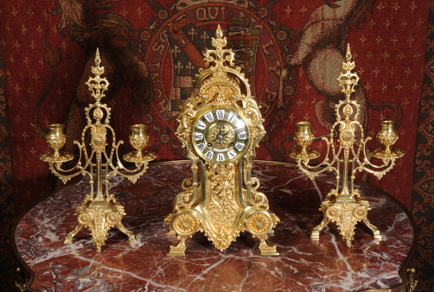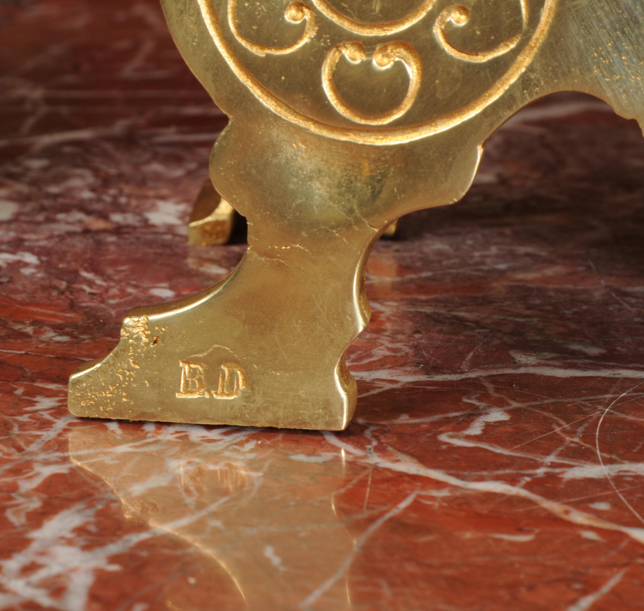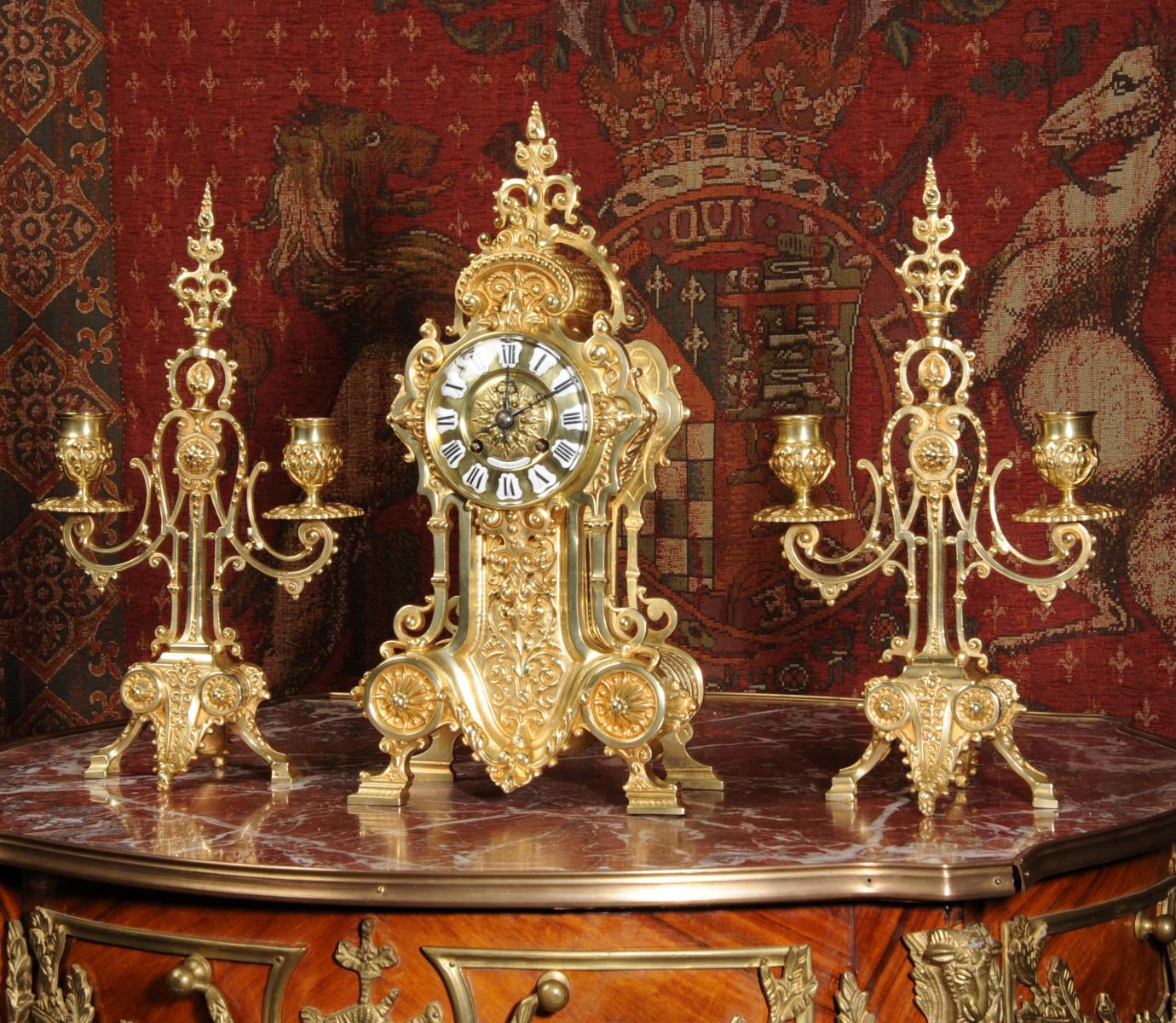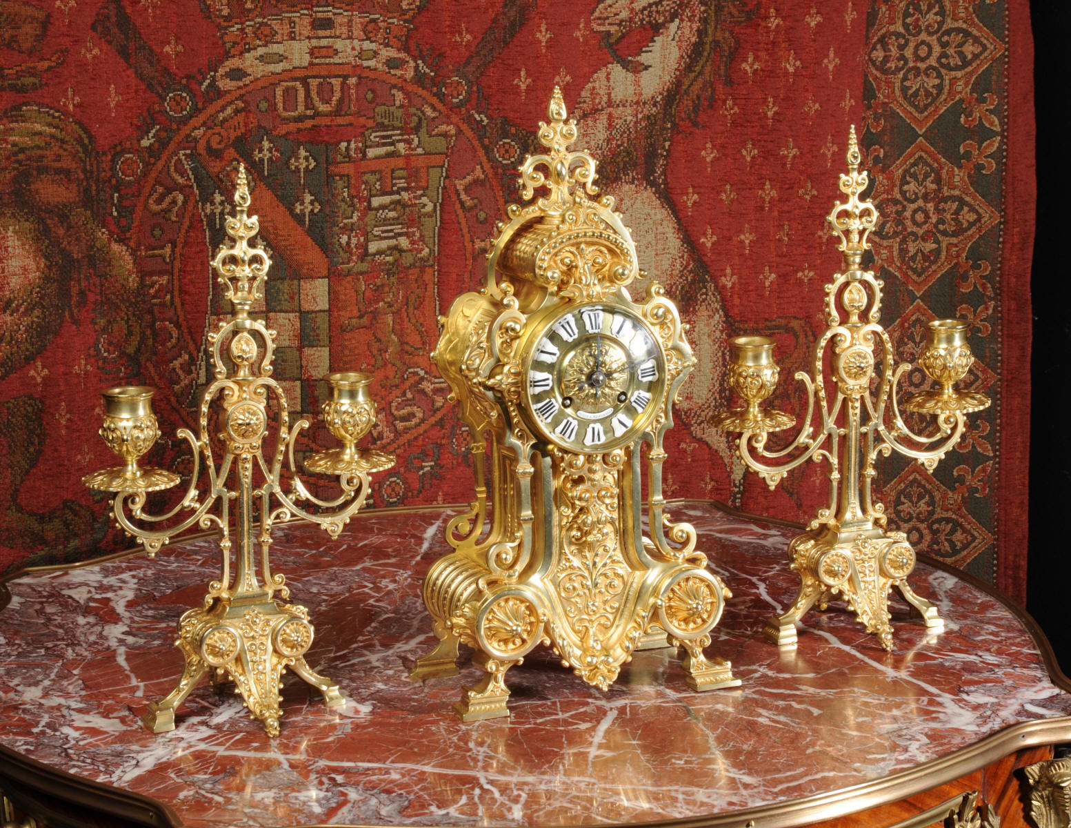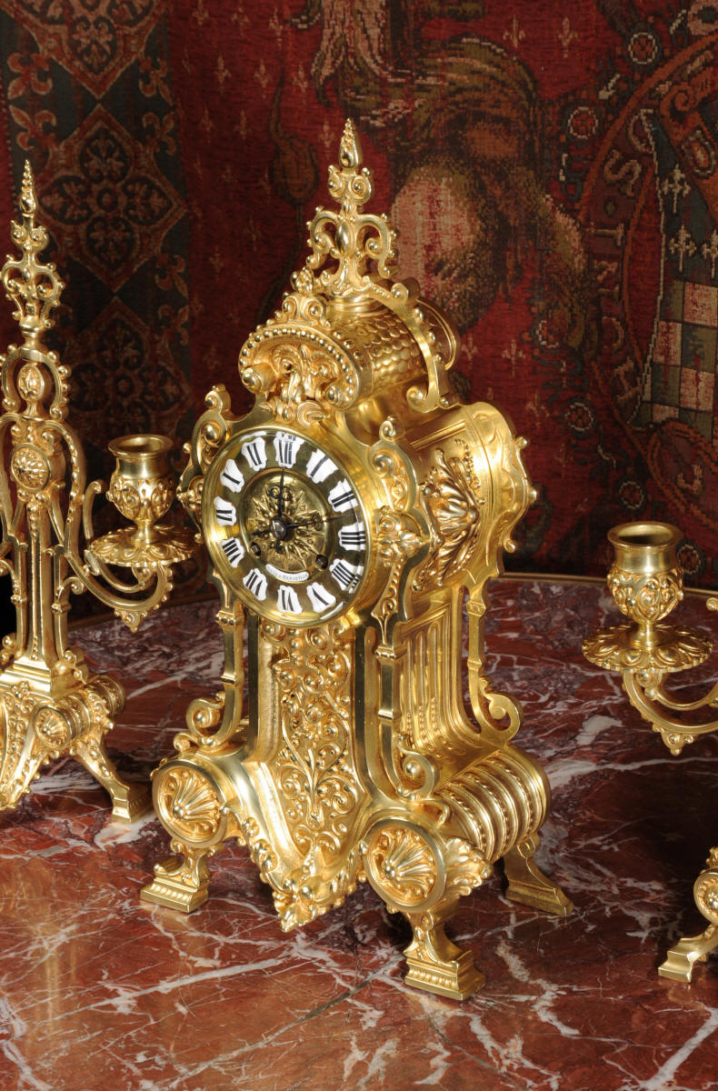 ~ French - Circa 1870 ~ ~~ Excellent condition, fully overhauled ~~ A stunning original antique French boudoir clock set. It is beautifully modelled in gilt brass, top quality and finely finished. It is in the Louis XVI style, key hole shaped and profusely decorated with scrolling foliage and roundels. Candelabra are conforming in style with two branches, the design of both the clock and the set is such that it will stand easily on a narrow mantle. The clock set is unusual in having each individual component marked with the case makers mark B. D. along with the movement serial number on the rear foot.