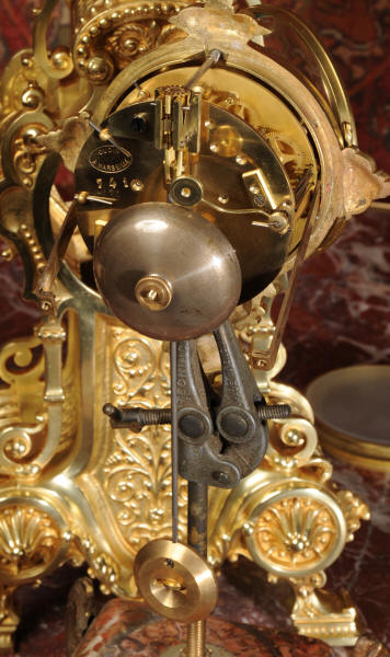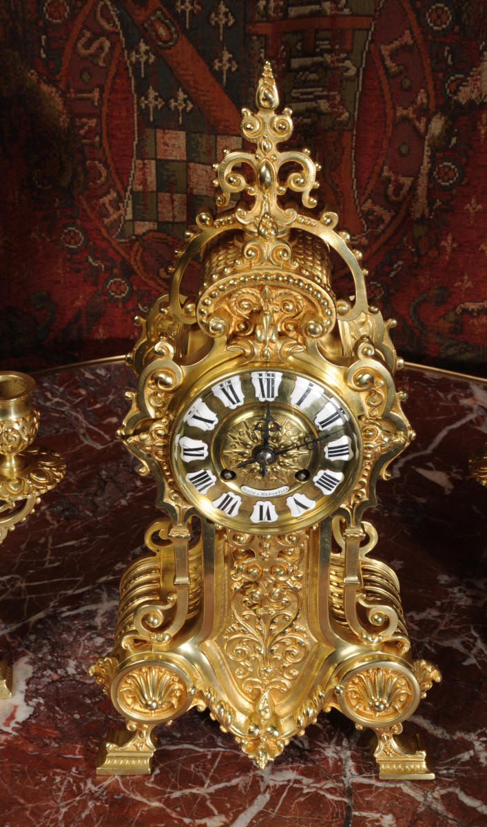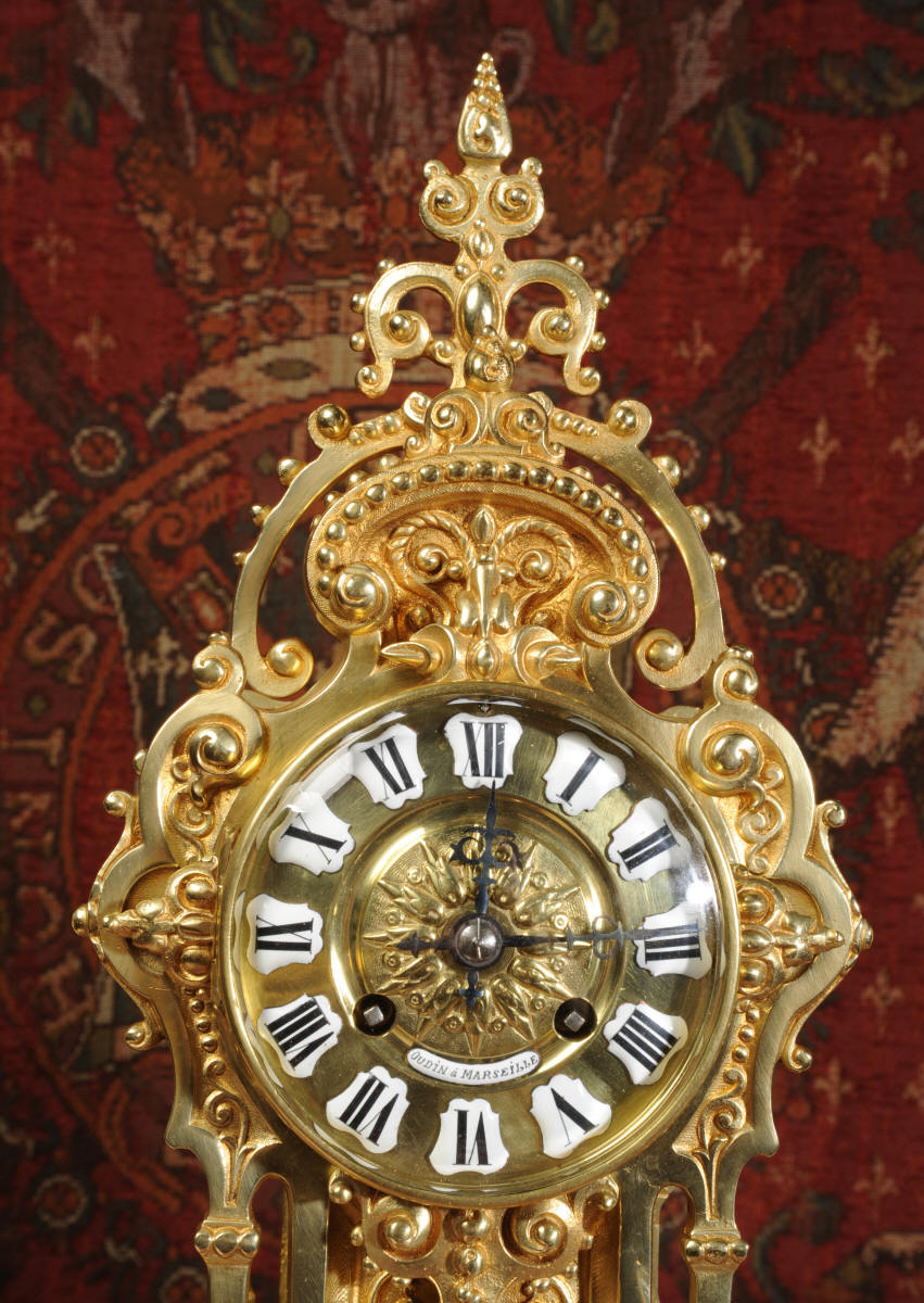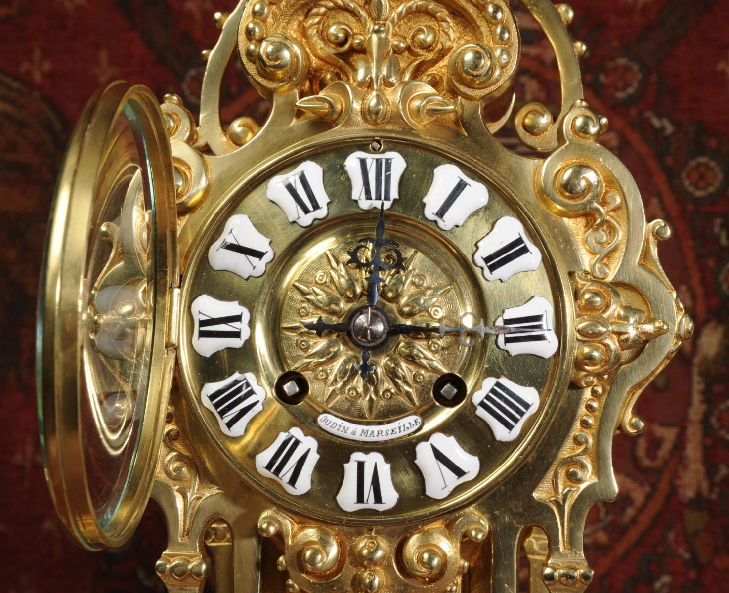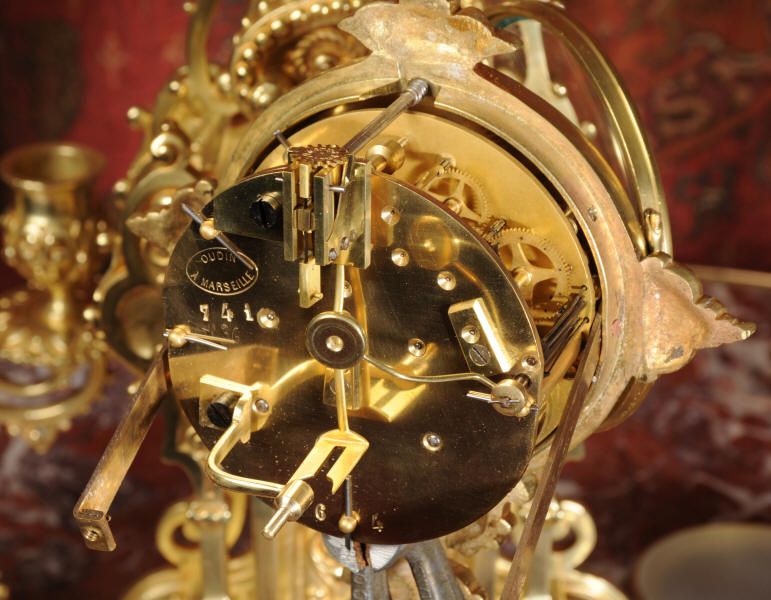 The dial is also of superb quality, heavily cast in brass and mounted with 12 individual enamel cartouches. There is also a cartouche with the retailers signature Oudin À Marseille. the original hands are finely fretted and blued steel. The rear door is glazed with frosted glass. The French movement is by Japy Freres and has the makers 'Grande Medaille D'Honneur' mark on the backplate along with the retailers mark Oudin À Marseille. It is of high quality and benefits from the superior rack striking and dead-beat pin-pallet escapement. It is in excellent clean and running condition having been fully overhauled by our clockmaker. Pendulum is a replacement. It runs for 8 days and strikes the hours and halves on a bell. Click the video clip below to hear the bell and watch the clock running! Condition of the case is excellent, the original gilding is beautifully clean and bright with hardly any wear or discolouration and there are no losses. The dial is also in excellent condition, just a very light scratch on the number 12 cartouche. Candelabra are slightly distorted.
