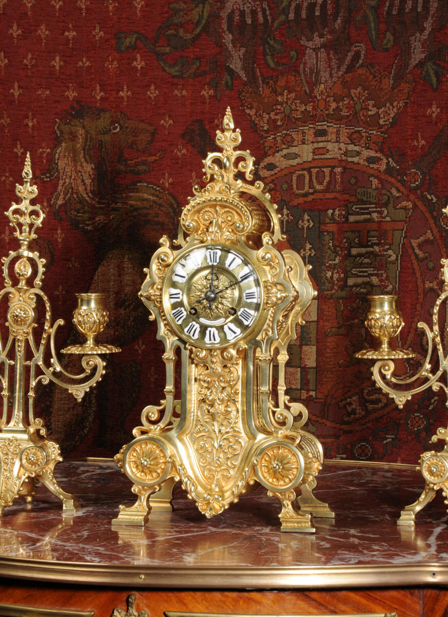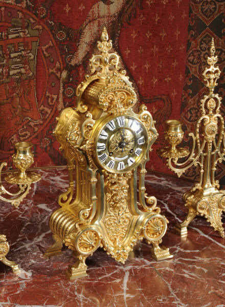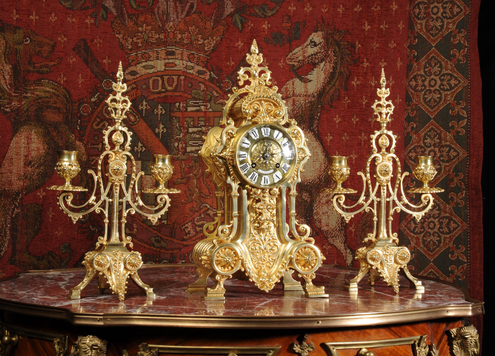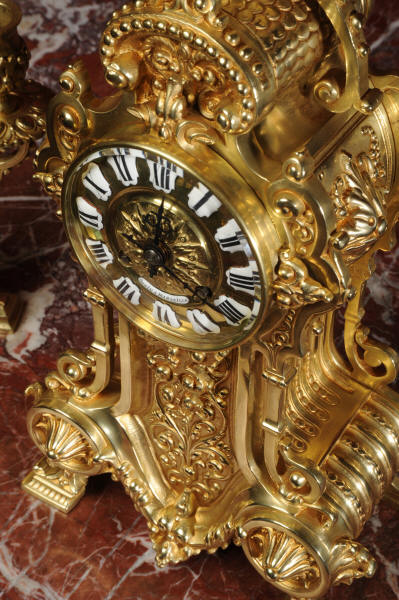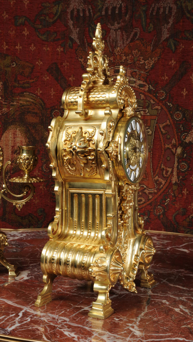 The dial is also of superb quality, heavily cast in brass and mounted with 12 individual enamel cartouches. There is also a cartouche with the retailers signature Oudin À Marseille. the original hands are finely fretted and blued steel. The rear door is glazed with frosted glass. The French movement is by Japy Freres and has the makers 'Grande Medaille D'Honneur' mark on the backplate along with the retailers mark Oudin À Marseille. It is of high quality and benefits from the superior rack striking and dead-beat pin-pallet escapement. It is in excellent clean and running condition having been fully overhauled by our clockmaker. Pendulum is a replacement. It runs for 8 days and strikes the hours and halves on a bell. Click the video clip below to hear the bell and watch the clock running! Condition of the case is excellent, the original gilding is beautifully clean and bright with hardly any wear or discolouration and there are no losses. The dial is also in excellent condition, just a very light scratch on the number 12 cartouche. Candelabra are slightly distorted.