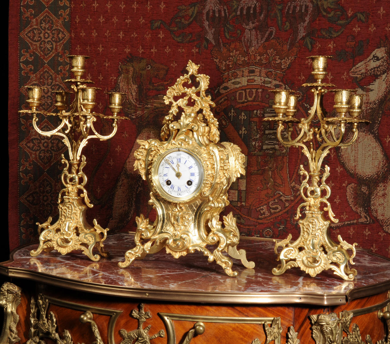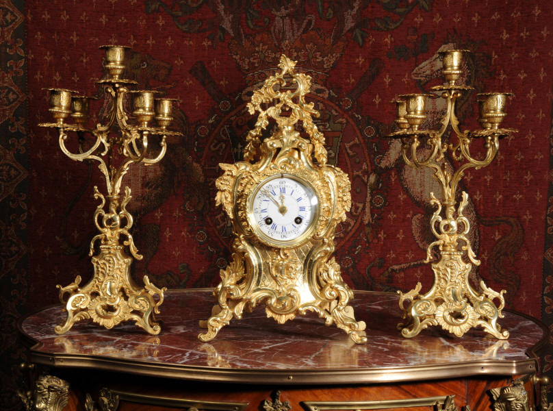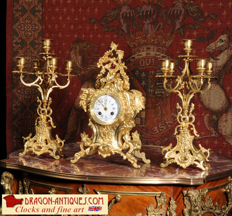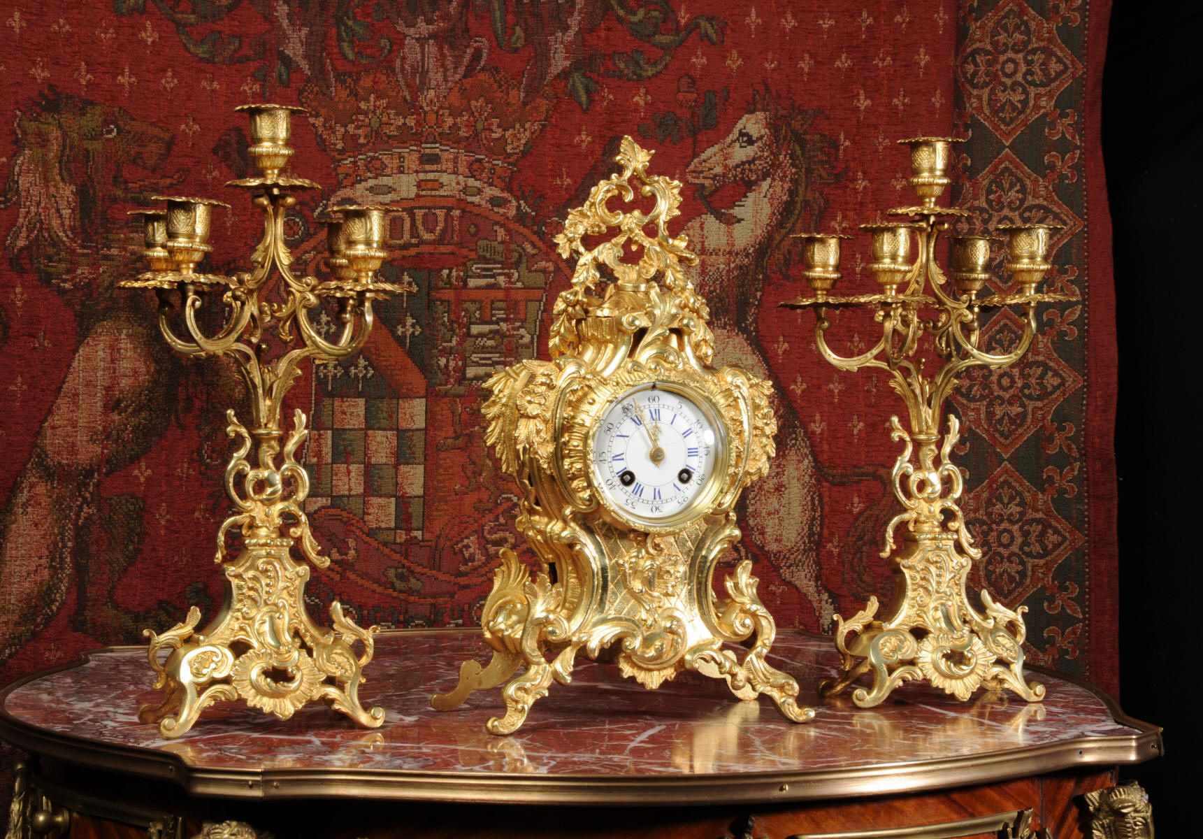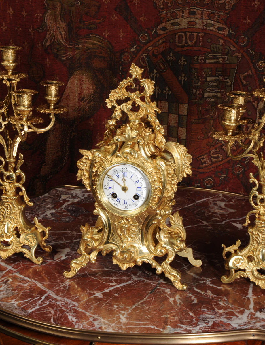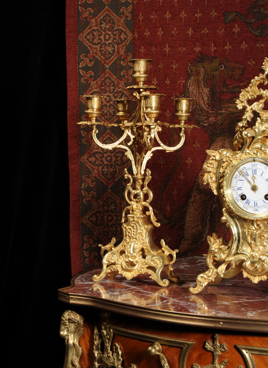 ~ French - Circa 1890 ~ ~~ Excellent condition, fully overhauled ~~ A beautiful original antique French boudoir candelabra clock set. It is very nicely modelled in the Rococo style in gilded brass and is profusely decorated with floral swags, 'C' scrolls and acanthus leaves. To the top is a large and elaborate foliate finial and the sides are fretted to allow a glimpse of the pendulum swinging within. Candelabra are conforming in style with 4 dainty braches.