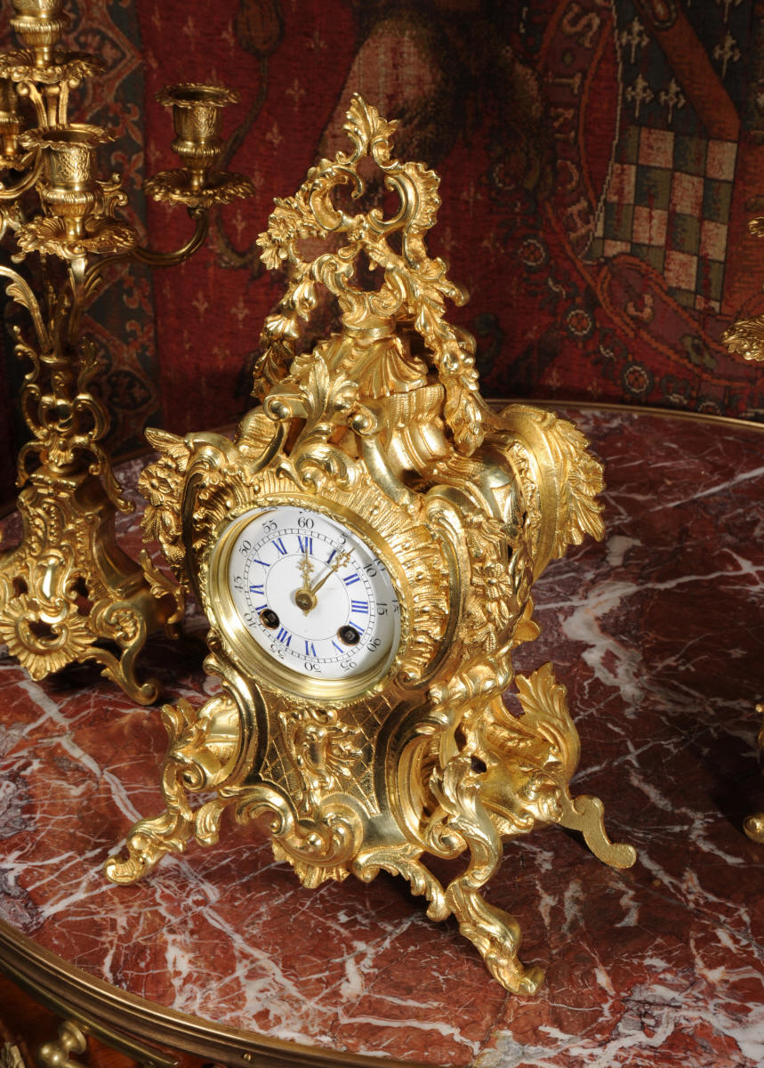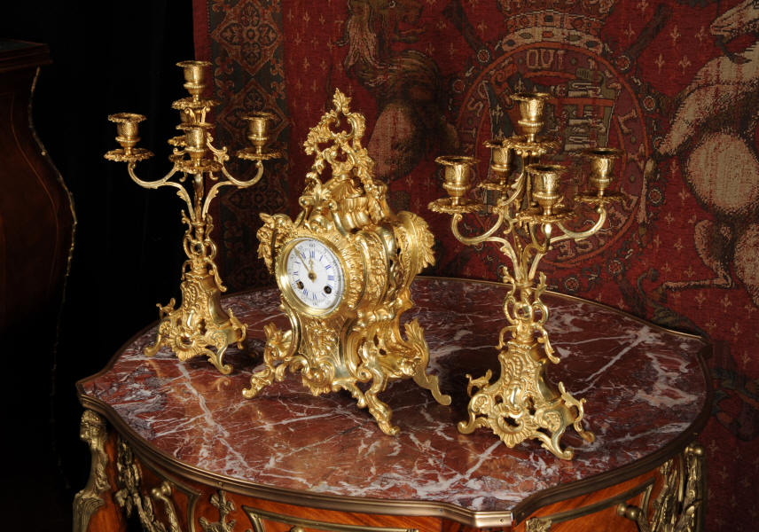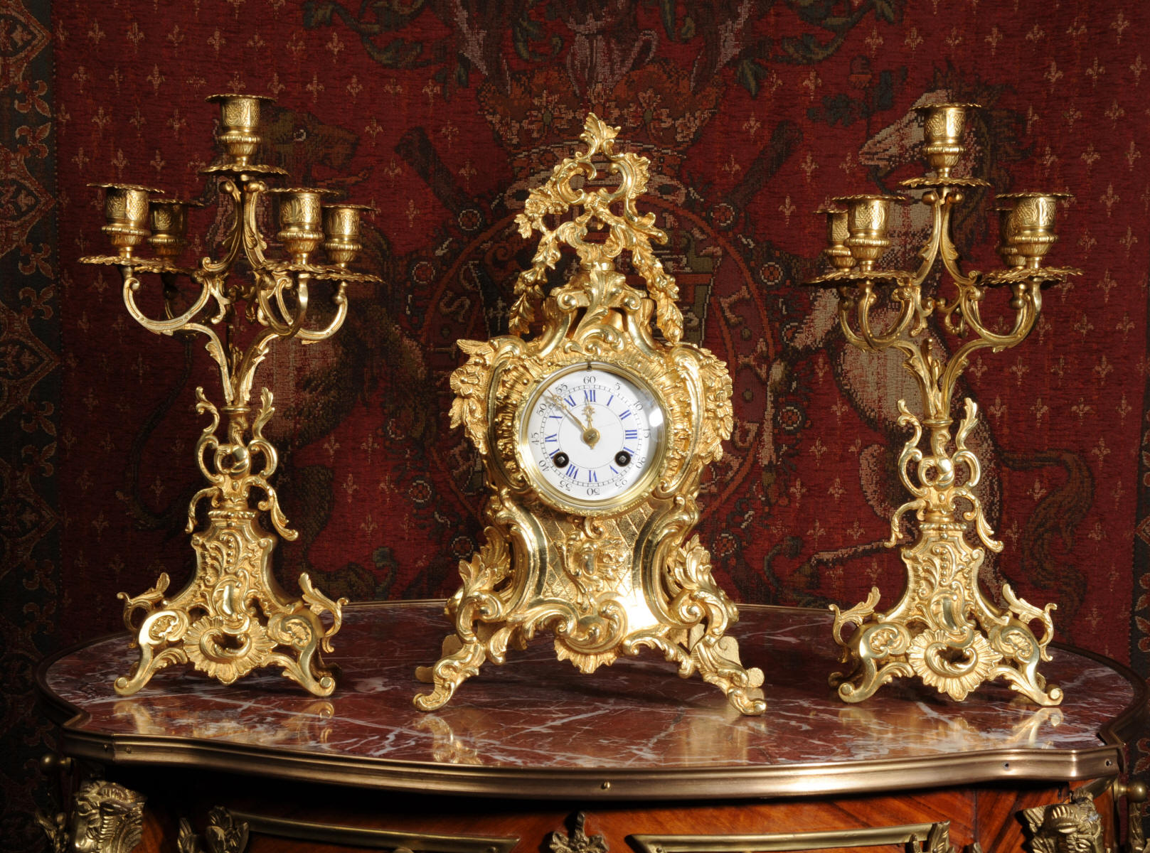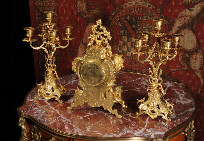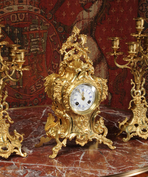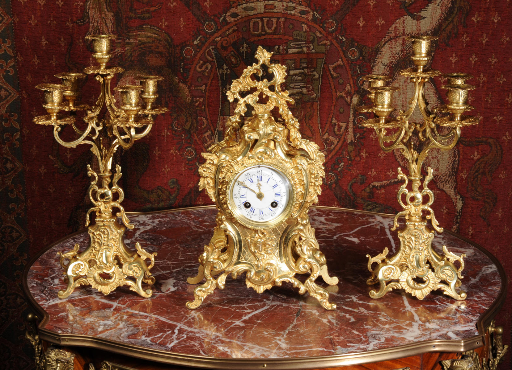 ~ French - Circa 1890 ~ ~~ Excellent condition, fully overhauled ~~ A beautiful original antique French boudoir candelabra clock set. It is very nicely modelled in the Rococo style in gilded brass and is profusely decorated with floral swags, 'C' scrolls and acanthus leaves. To the top is a large and elaborate foliate finial and the sides are fretted to allow a glimpse of the pendulum swinging within. Candelabra are conforming in style with 4 dainty braches.
