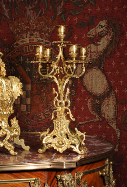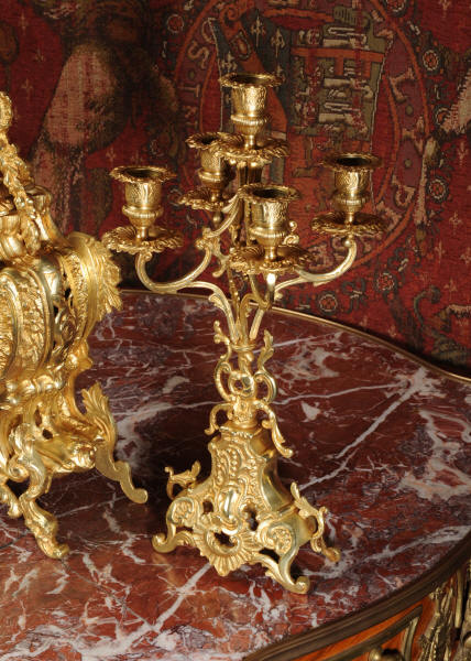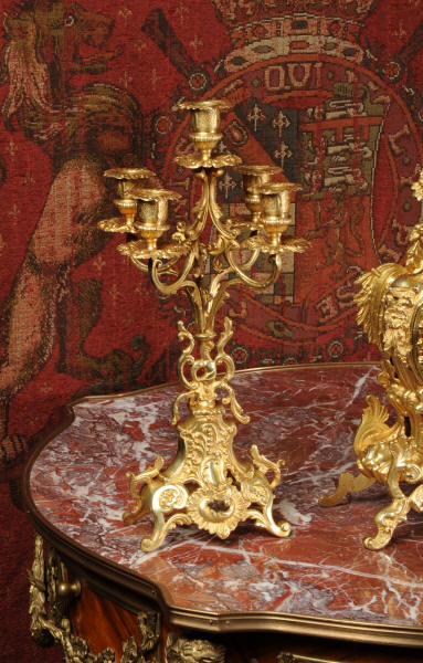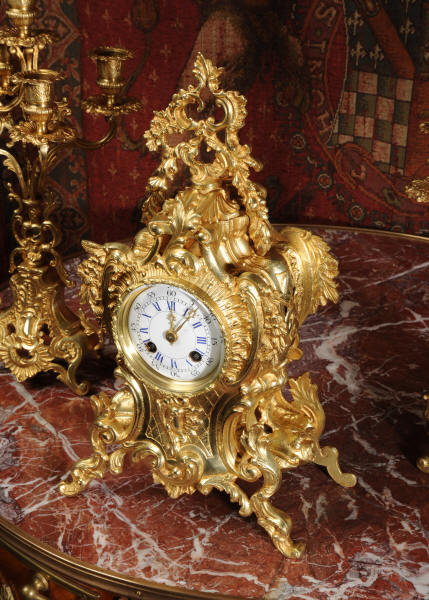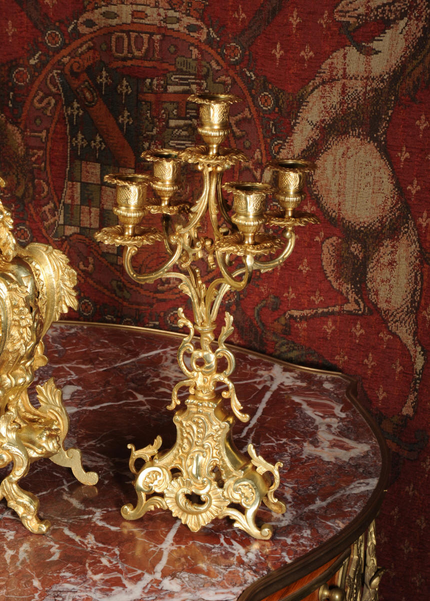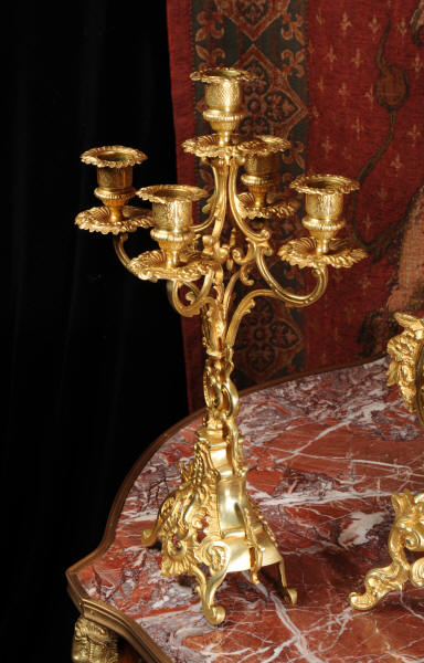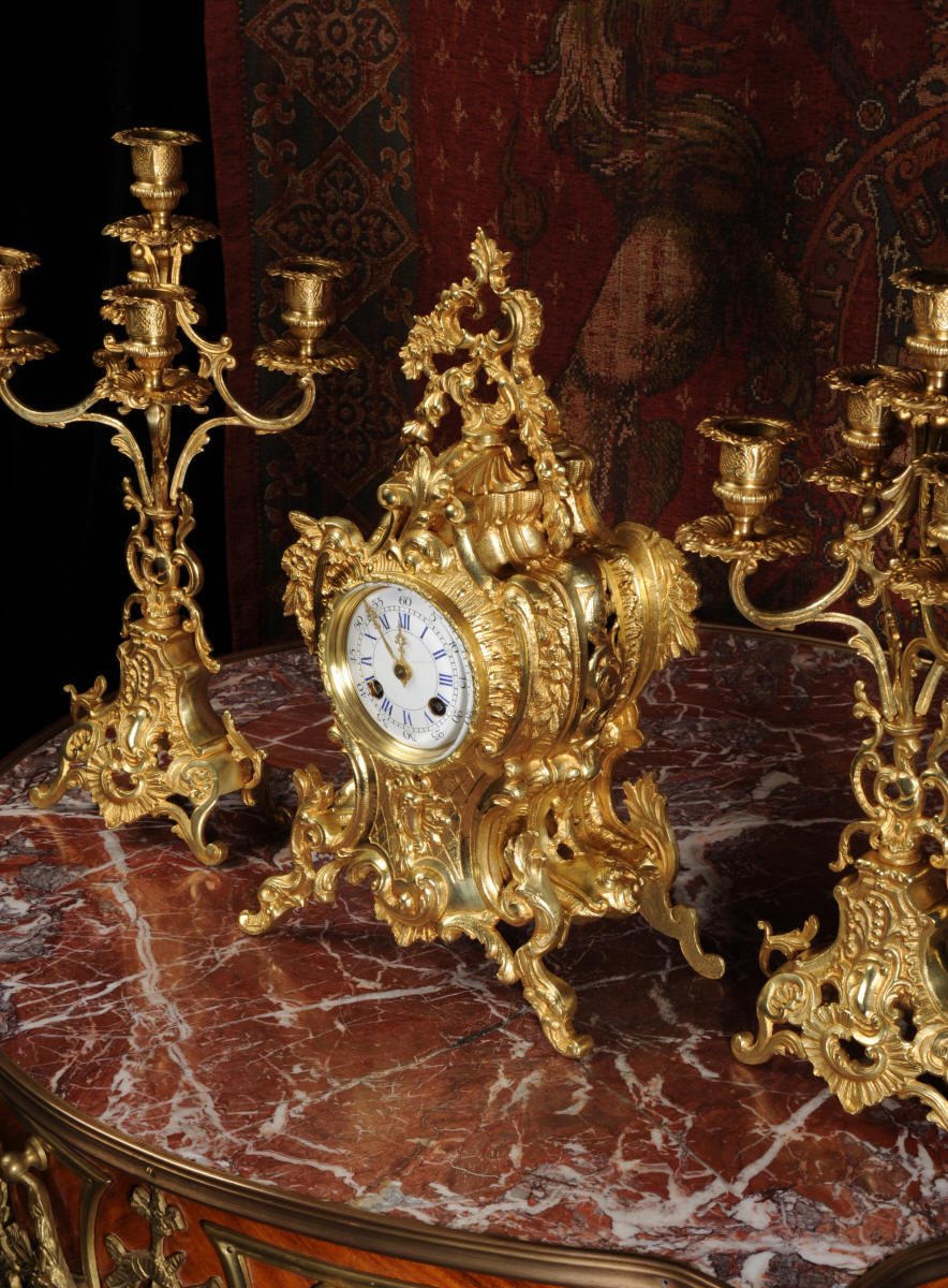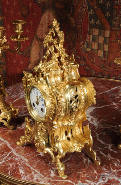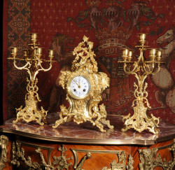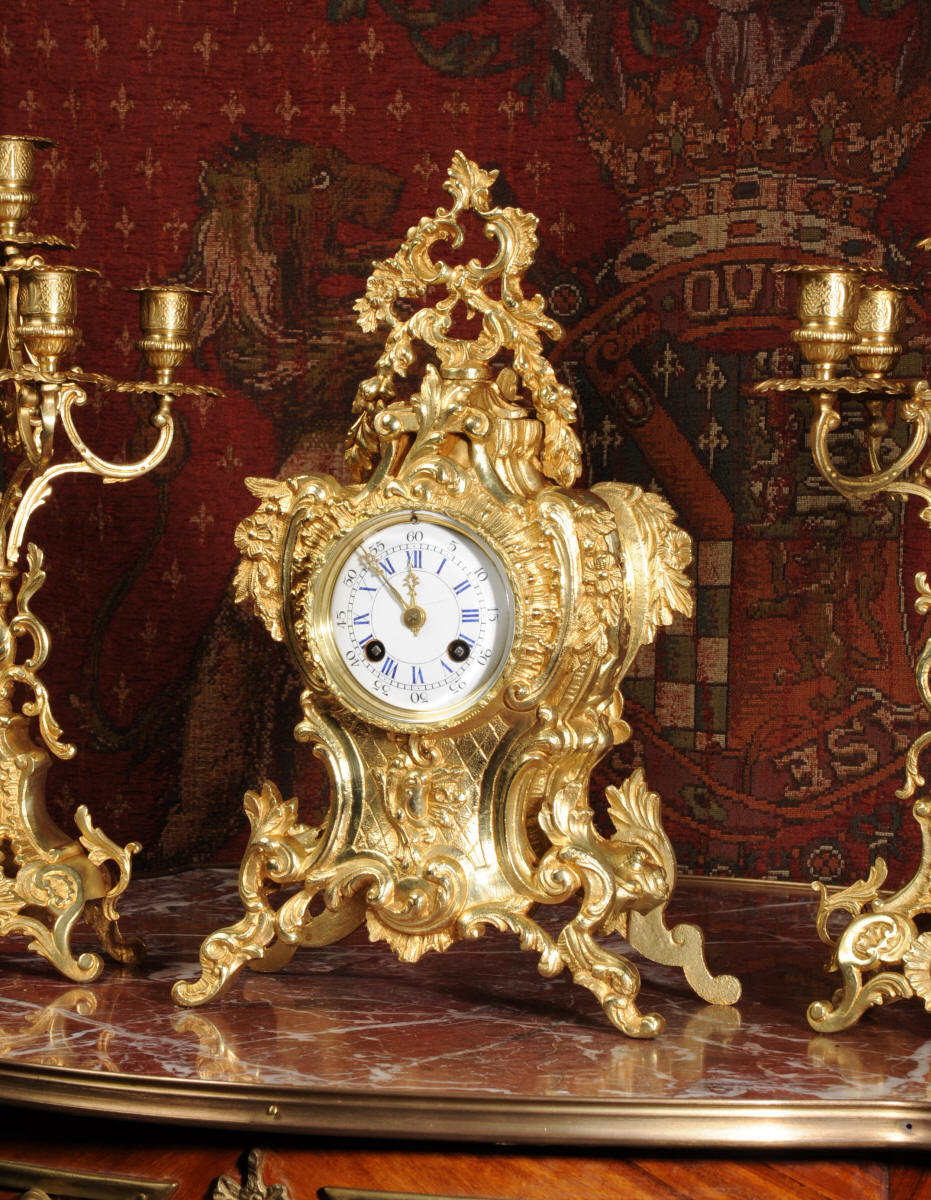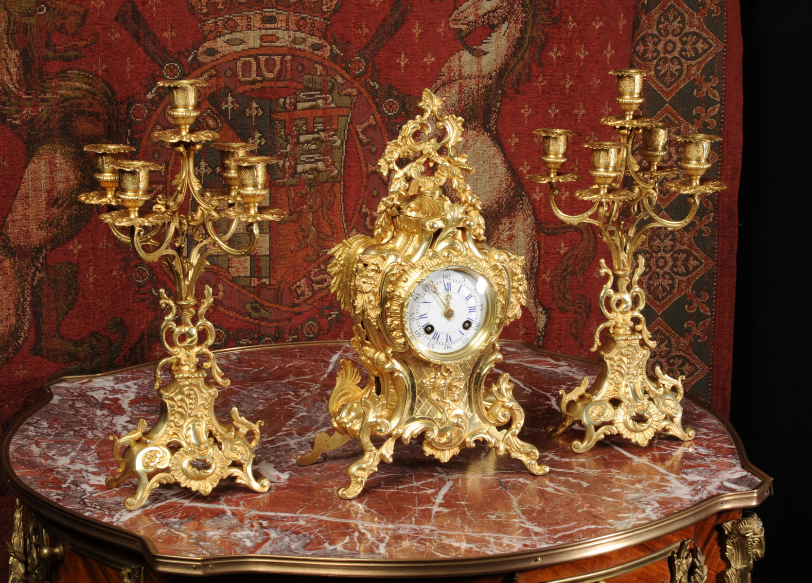 ~ French - Circa 1890 ~ ~~ Excellent condition, fully overhauled ~~ A beautiful original antique French boudoir candelabra clock set. It is very nicely modelled in the Rococo style in gilded brass and is profusely decorated with floral swags, 'C' scrolls and acanthus leaves. To the top is a large and elaborate foliate finial and the sides are fretted to allow a glimpse of the pendulum swinging within. Candelabra are conforming in style with 4 dainty braches.