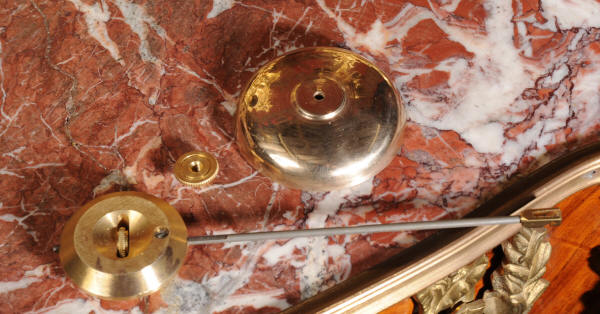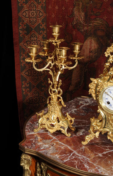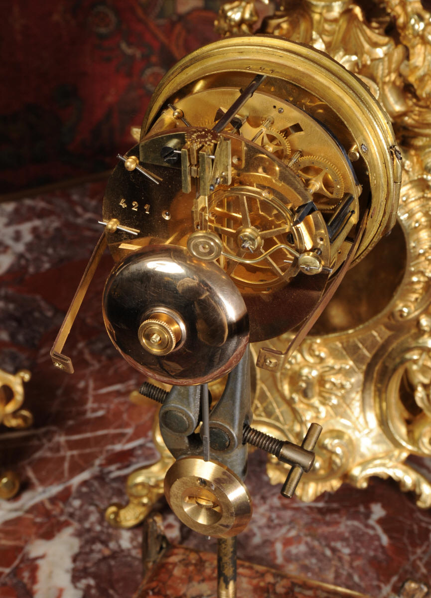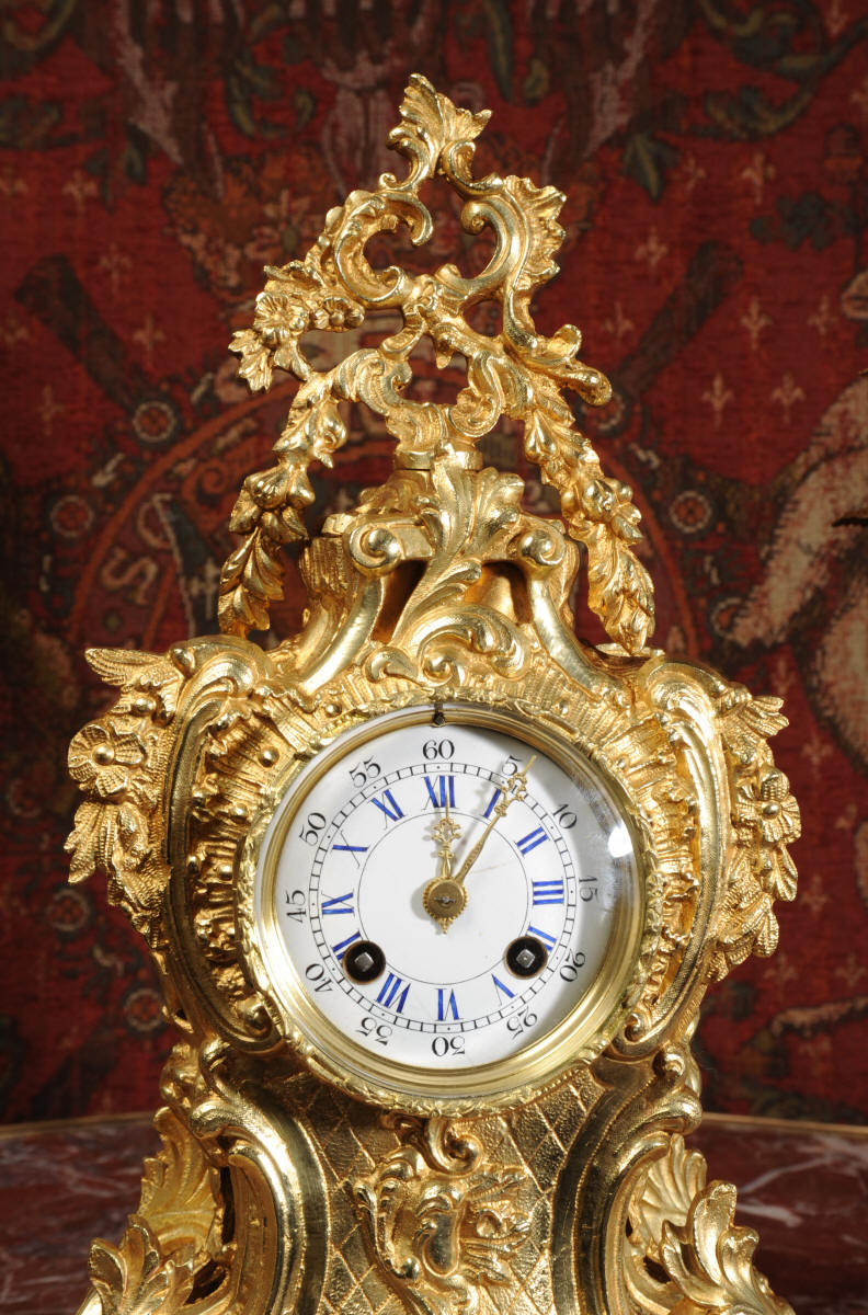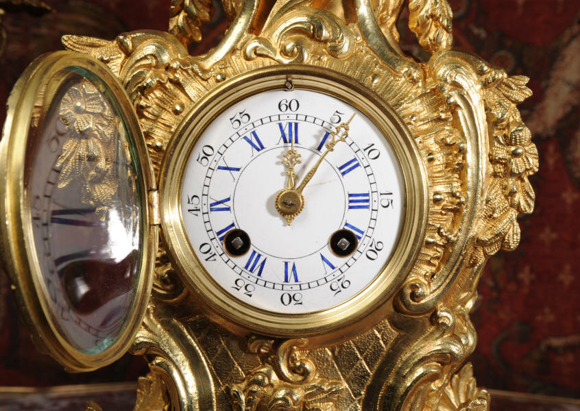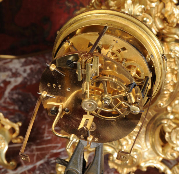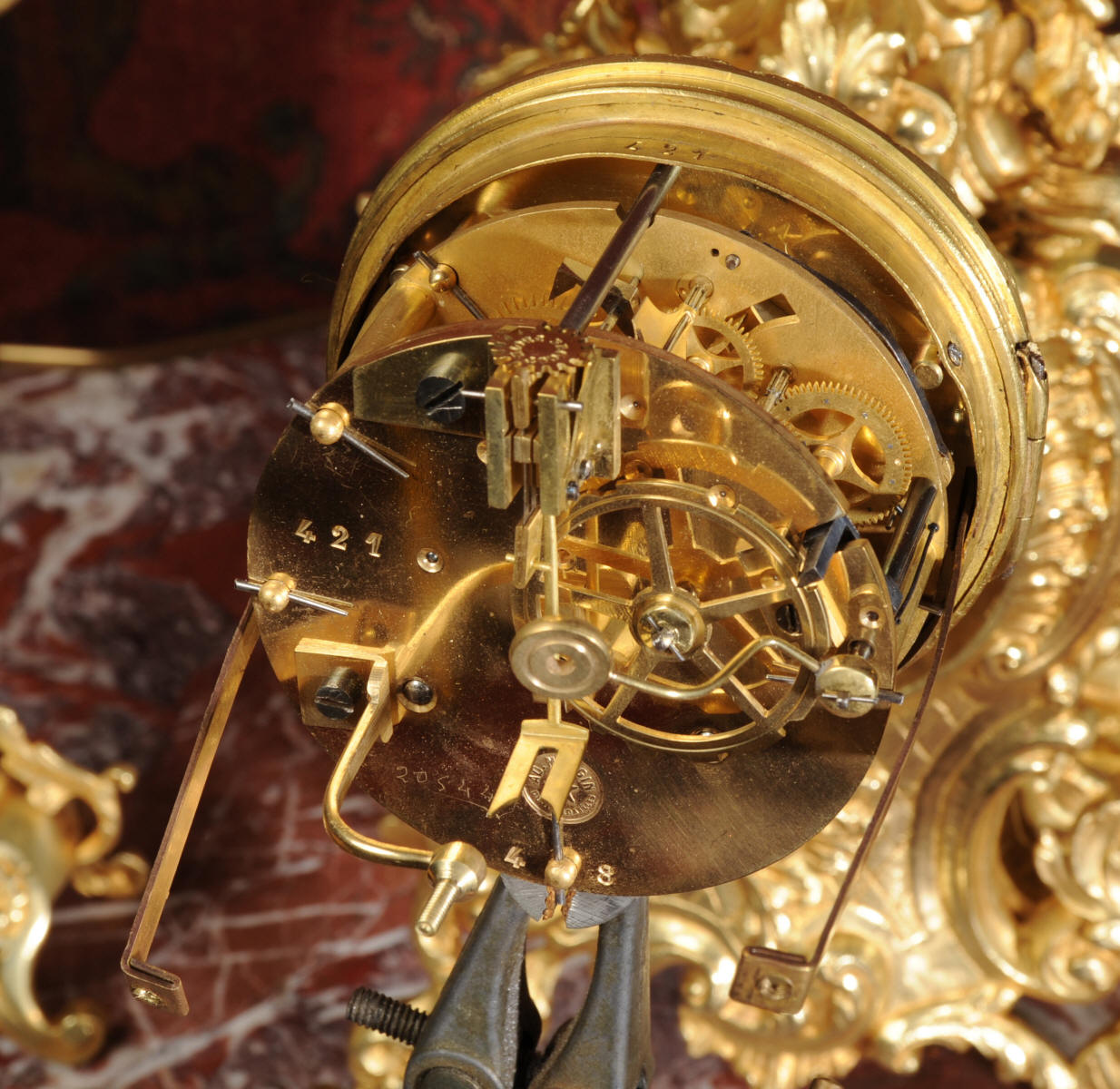 The dial is enamel on copper with blue hour ring and black minute ring. It is complete with its original delicately fretted brass hands and acanthus bezel. The French movement is by A. D. Mougin and is the makers usual high quality. It is in excellent clean and running condition having been fully overhauled by our clockmaker. Pendulum is a replacement. It runs for 8 days and strikes the hours and halves on a bell. Click the video clip below to hear the bell and watch the clock running! Condition of the case is excellent, the original gilding is beautifully clean and bright with hardly any wear or discolouration and there are no losses. The dial is also in very good condition, there is a light scratch from the centre of the dial towards the 2 o'clock. Candelabra are slightly distorted.
