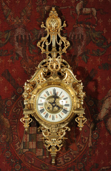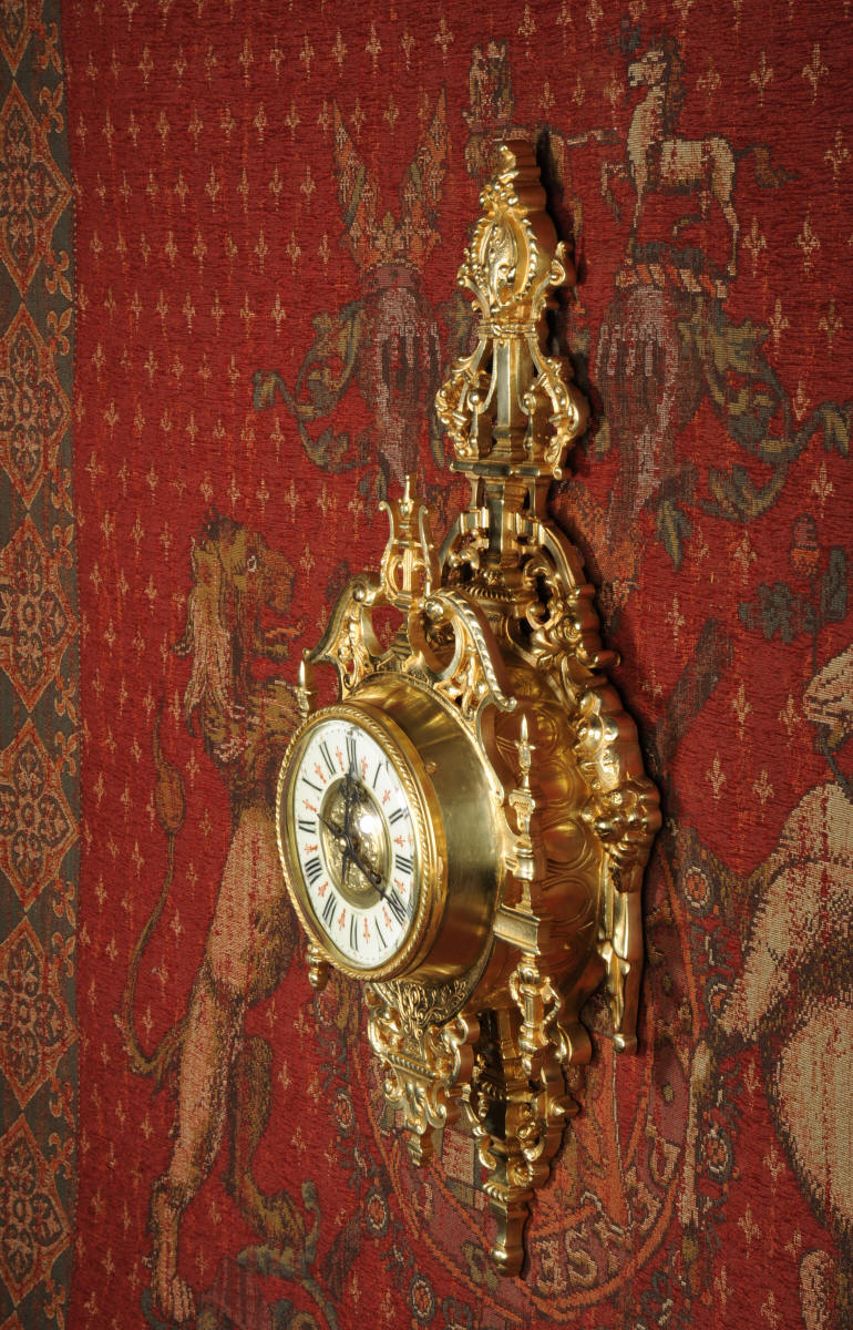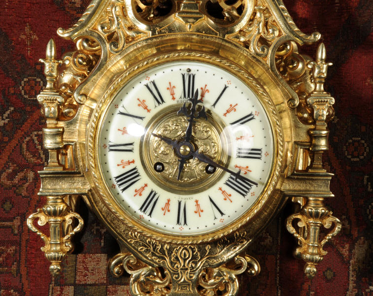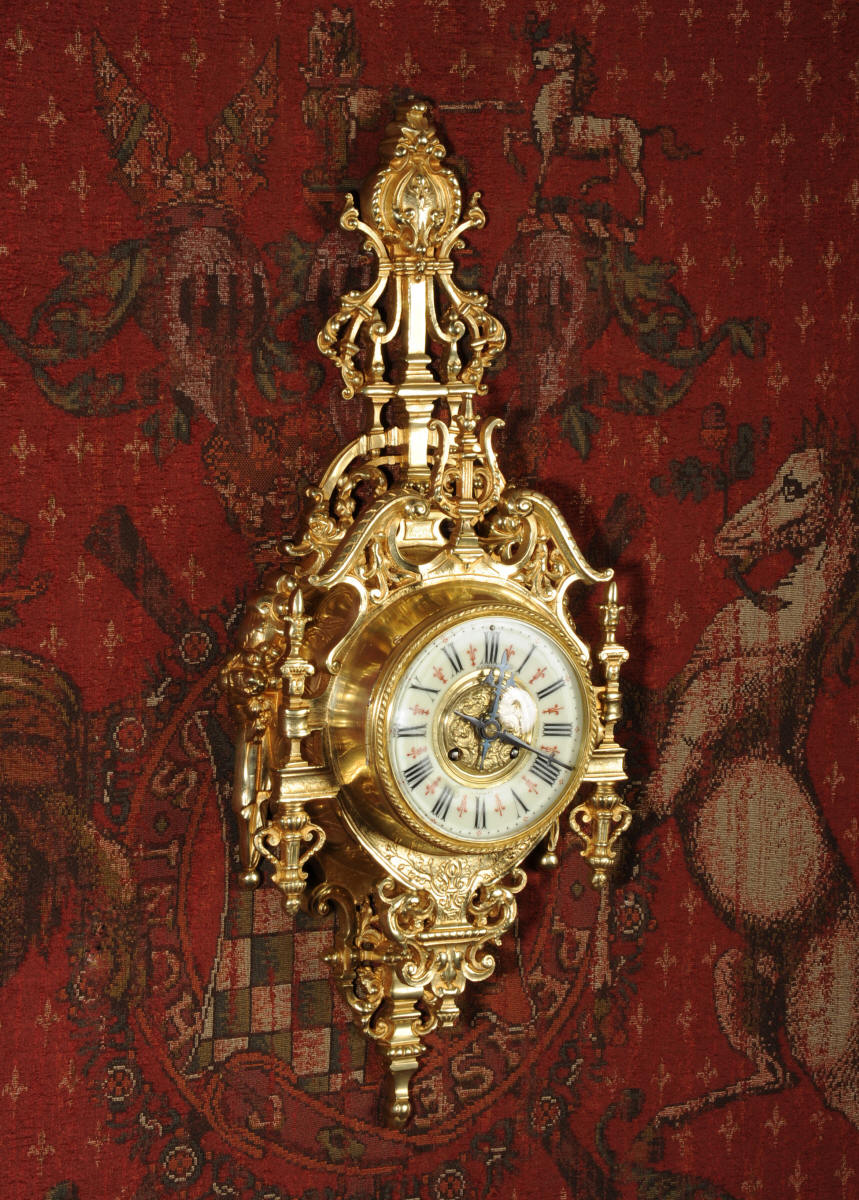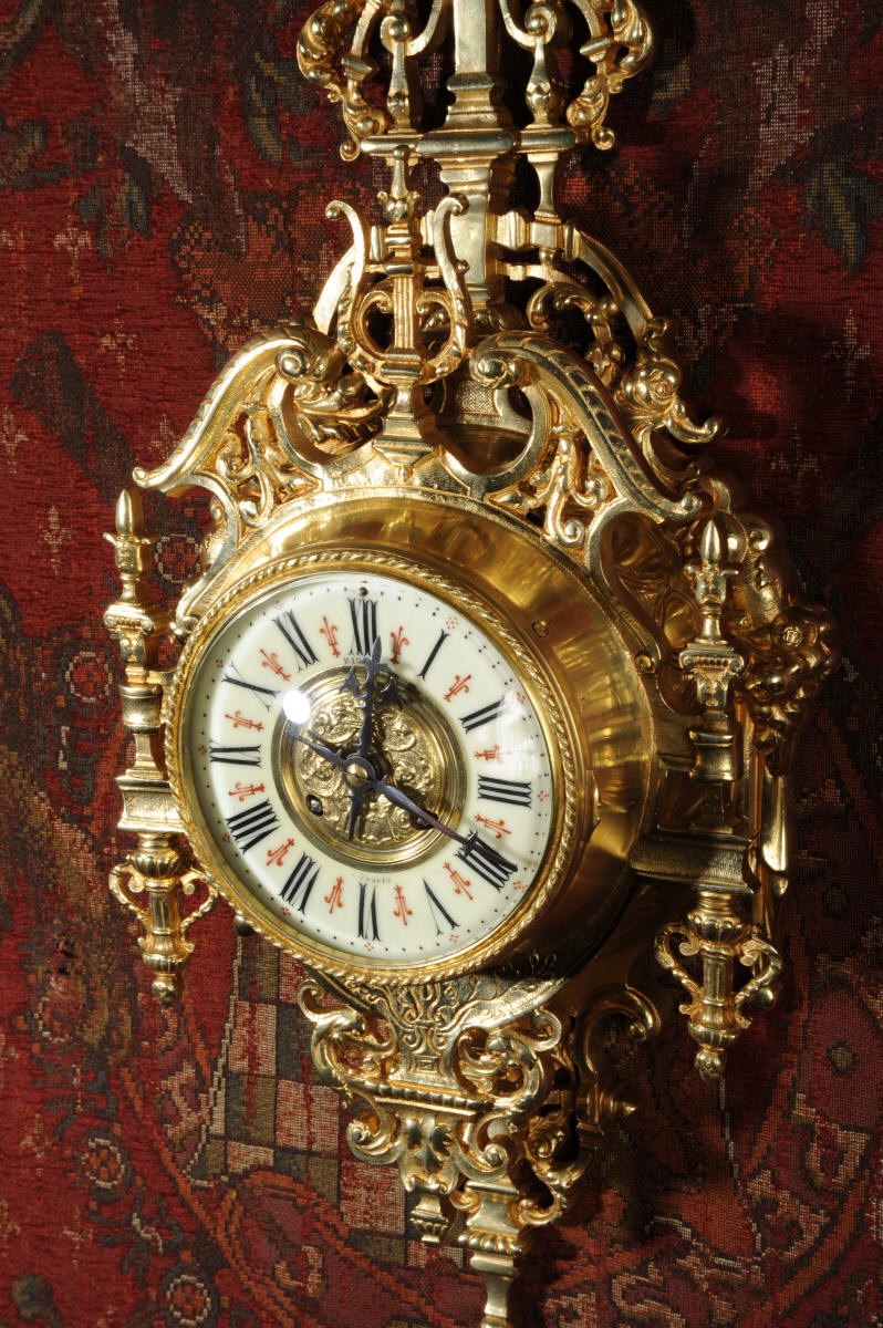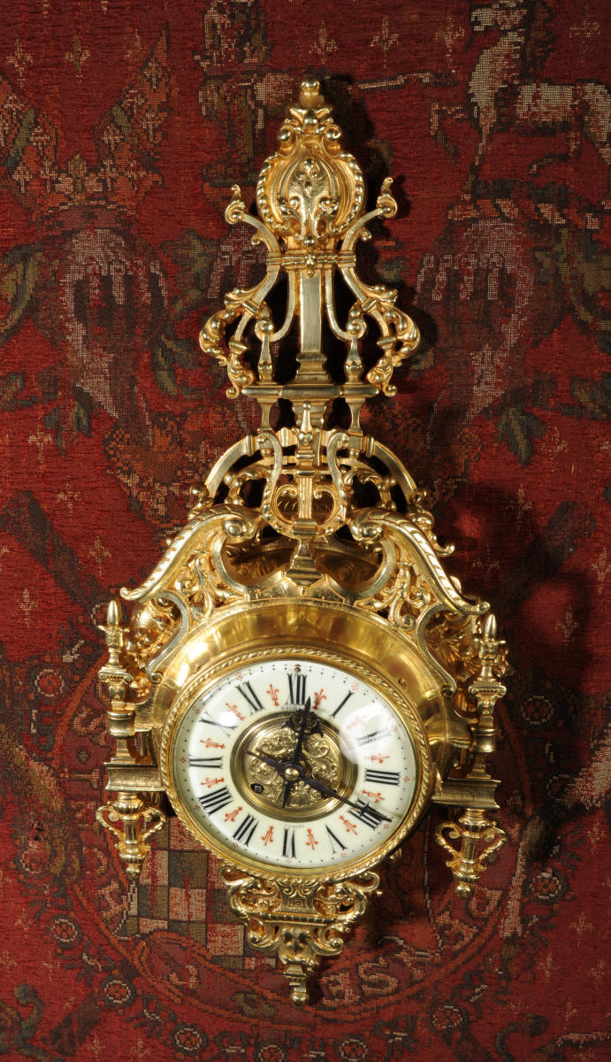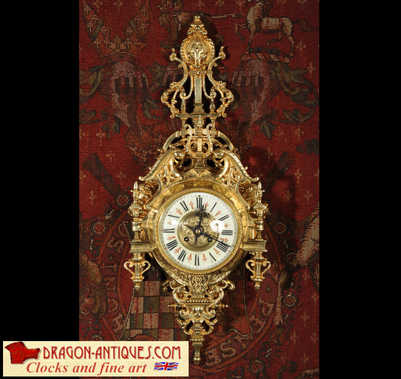 ~ French - Circa 1880 ~ ~~ Excellent condition, fully overhauled ~~ A beautiful original antique French cartel wall clock by the famous maker Japy Freres. It is well made of gilded brass in a bold Baroque style. The superb, large enamel dial has a brass centre, original fretted blued steel hands and convex glass. It is signed for the retailer on the the dial. Above the dial is a Baroque broken arch pediment and to the sides are stylised columns. The clock is decorated with mythical creatures, stylised foliage and a lyre above the dial.