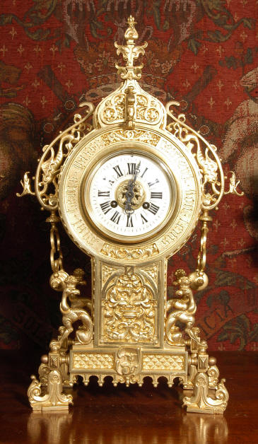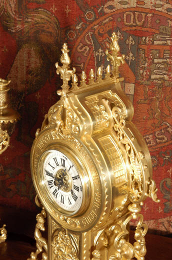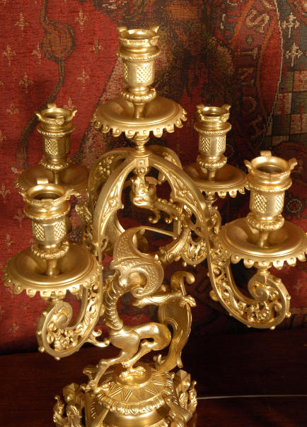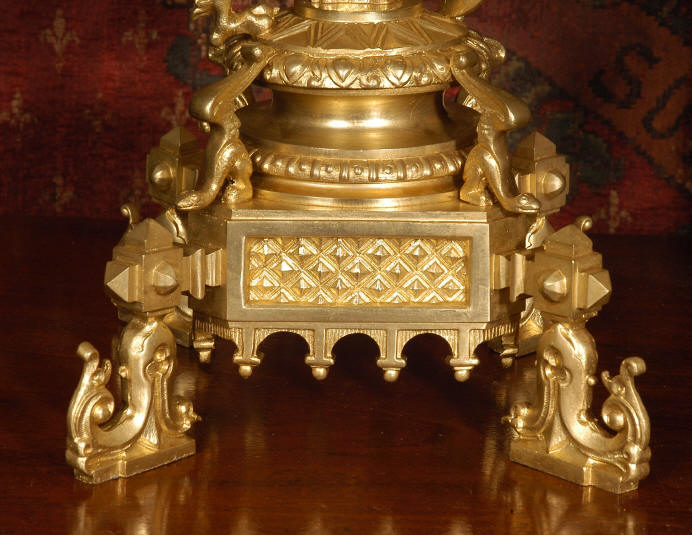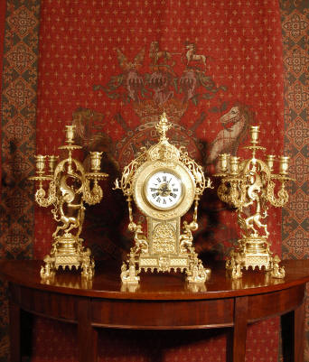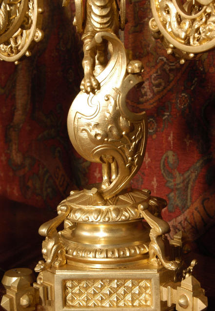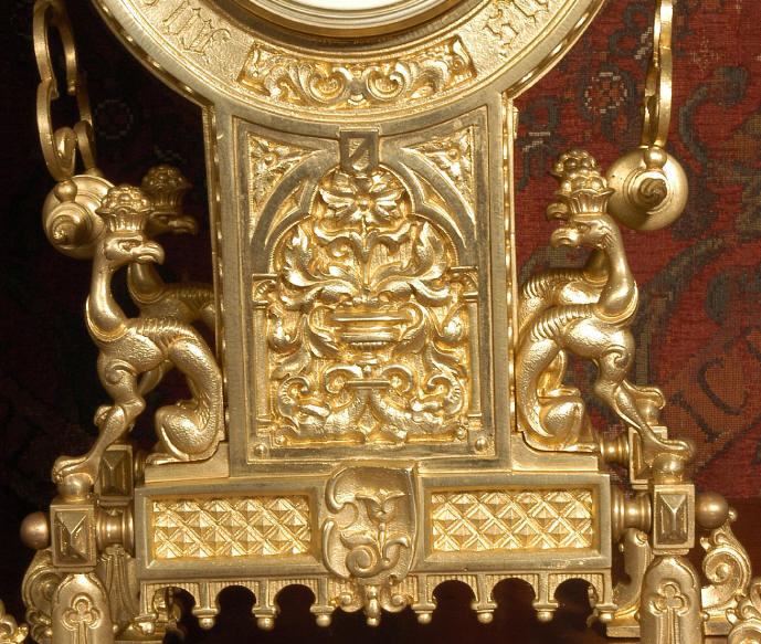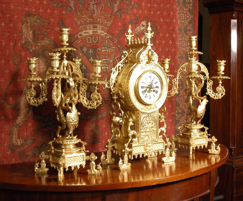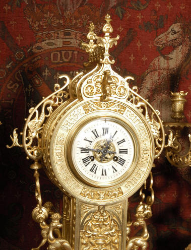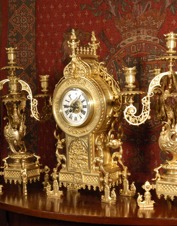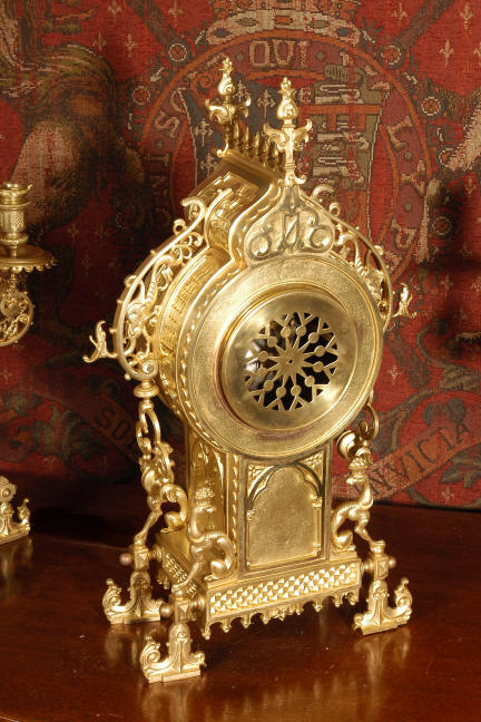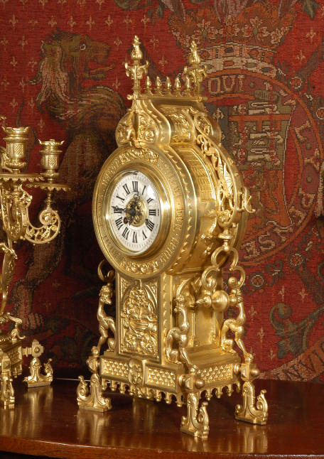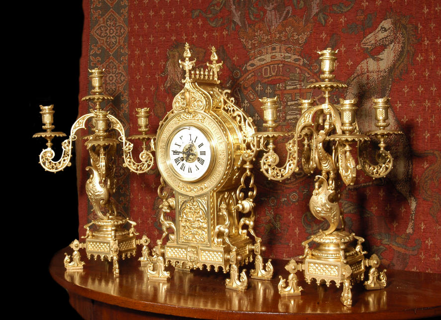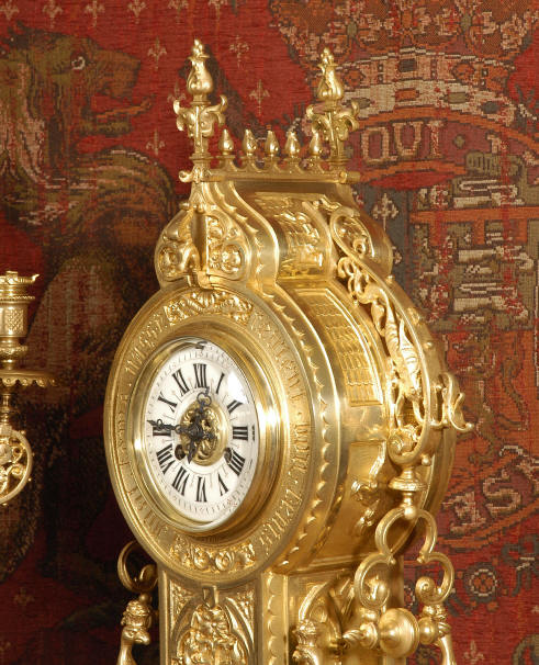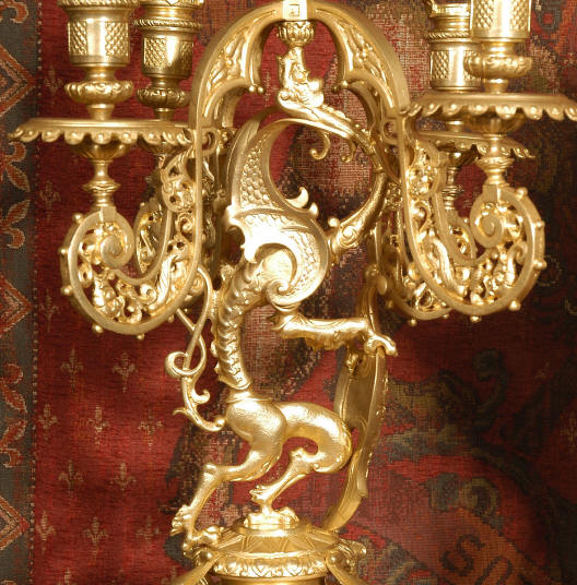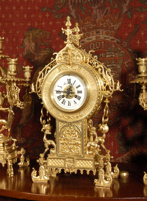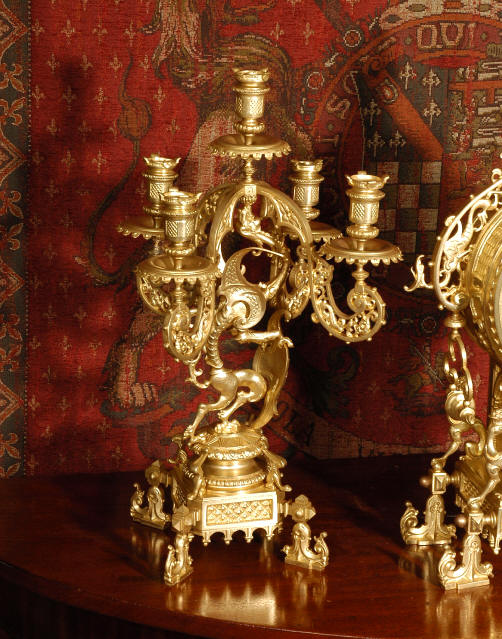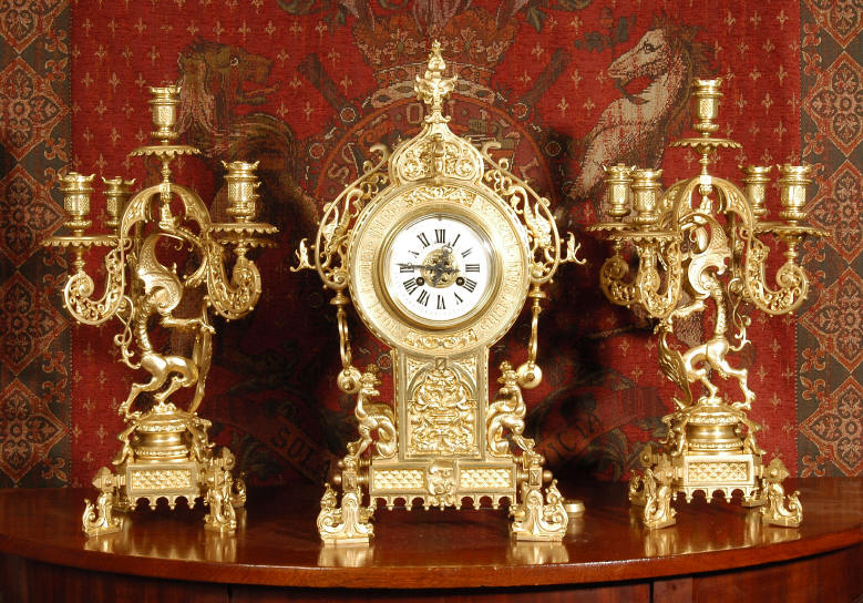 ~ French - Circa 1890 ~ ~~ Excellent condition ~~ A large and impressive clock set of very unusual shape and superb quality, profusely decorated in French Gothic style with a chinoiserie accent. Fire breathing Chinese dragons holding shields, form the stem of the candelabra, holding the four branches in their mouths. The clock case is equally spectacular, decorated in conforming chinoiserie style with dragons and crested heraldic birds. The front panel decorated with lotus. Engraved in gothic script around the dial is the Latin motto ' Mei Tems Vasse Reulent Hon Tems' The dial is enamel on copper and has a pair blued steel hands which follow the chinoiserie theme of the clock. The superb movement is by Vincenti et Cie and is in fully working, clean and running condition. It is complete with the original pendulum and bell. The movement features a Brocot pin-palette dead-beat escapement and rack striking. It runs for 8 days and strikes the hours and halves on a large sonorous bell - click the movie below to hear the bell. Condition is excellent - the finish of the brass is very good - bright and clean. There are some very small areas of wear or discoloration but in general both the case and the candelabra are excellent. The candelabra arms are slightly distorted and there is an old repair to one of the sconces which is not visible except on close inspection. The dial is in very good condition - just some minor chipping around the winding holes and a faint hairline through the 8 and 4 o'clock positions. A spectacular and unusual clock in excellent condition! Dimensions of clock: Height 21", Width